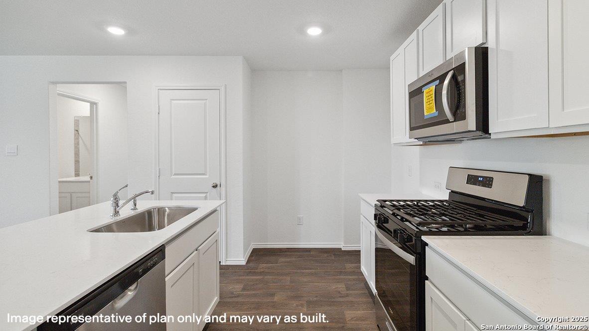 The Caprock is a charming one-story home featured at Laurel Vistas in San Antonio, TX. Featuring 2 classic front exteriors, this 3 bedroom, 2 bathroom home also offers 1435 square feet of living space and a 2-car garage. A front porch (per plan) welcomes you into the home and opens to the gourmet kitchen which includes quartz counter tops, quality cabinets, stainless steel appliances and an open concept floorplan with the kitchen flowing seamlessly into the dining room and living room. The main bedroom has an attractive ensuite bathroom that features a quartz vanity countertop and quality cabinetry. Enjoy additional storage with a spacious walk-in closet located off of the primary bathroom. Your secondary bedrooms all feature quality carpet flooring and a closet, and can be used as bedrooms, offices, work out spaces or other bonus rooms. The possibilities are endless with The Caprock floor plan. Additional features include sheet vinyl flooring in entry, living room, and all wet areas, quartz counter tops in all bathrooms and HOME IS CONNECTED base package. Using one central hub that talks to all the devices in your home, you can control the lights, thermostat and locks, all from your cellular device.