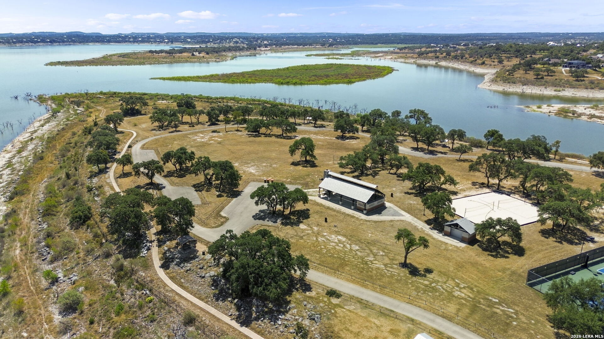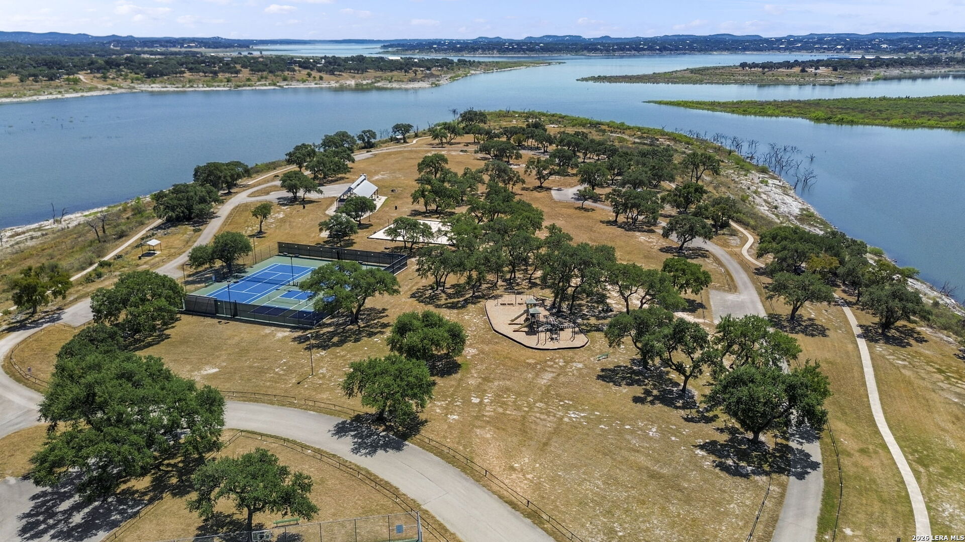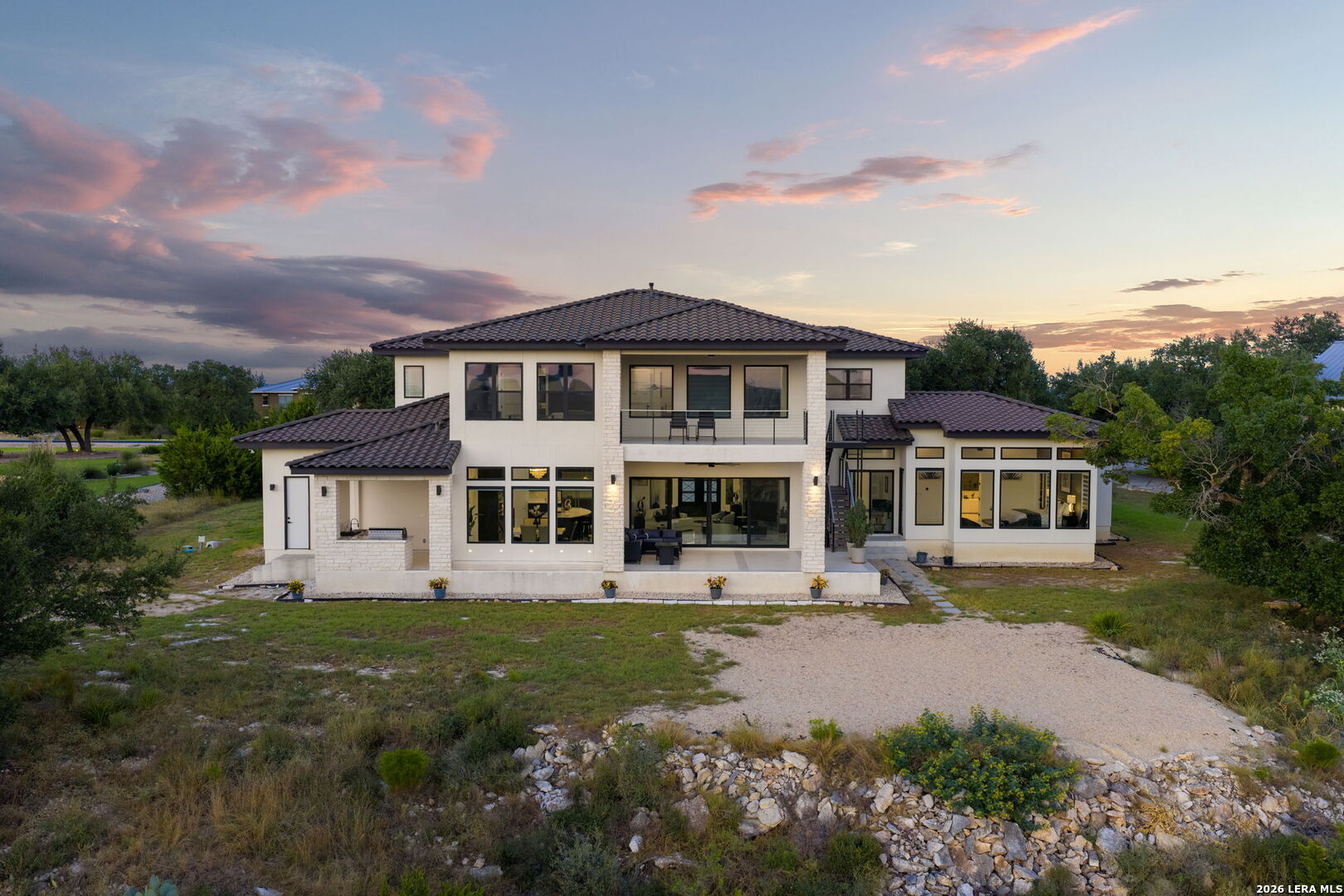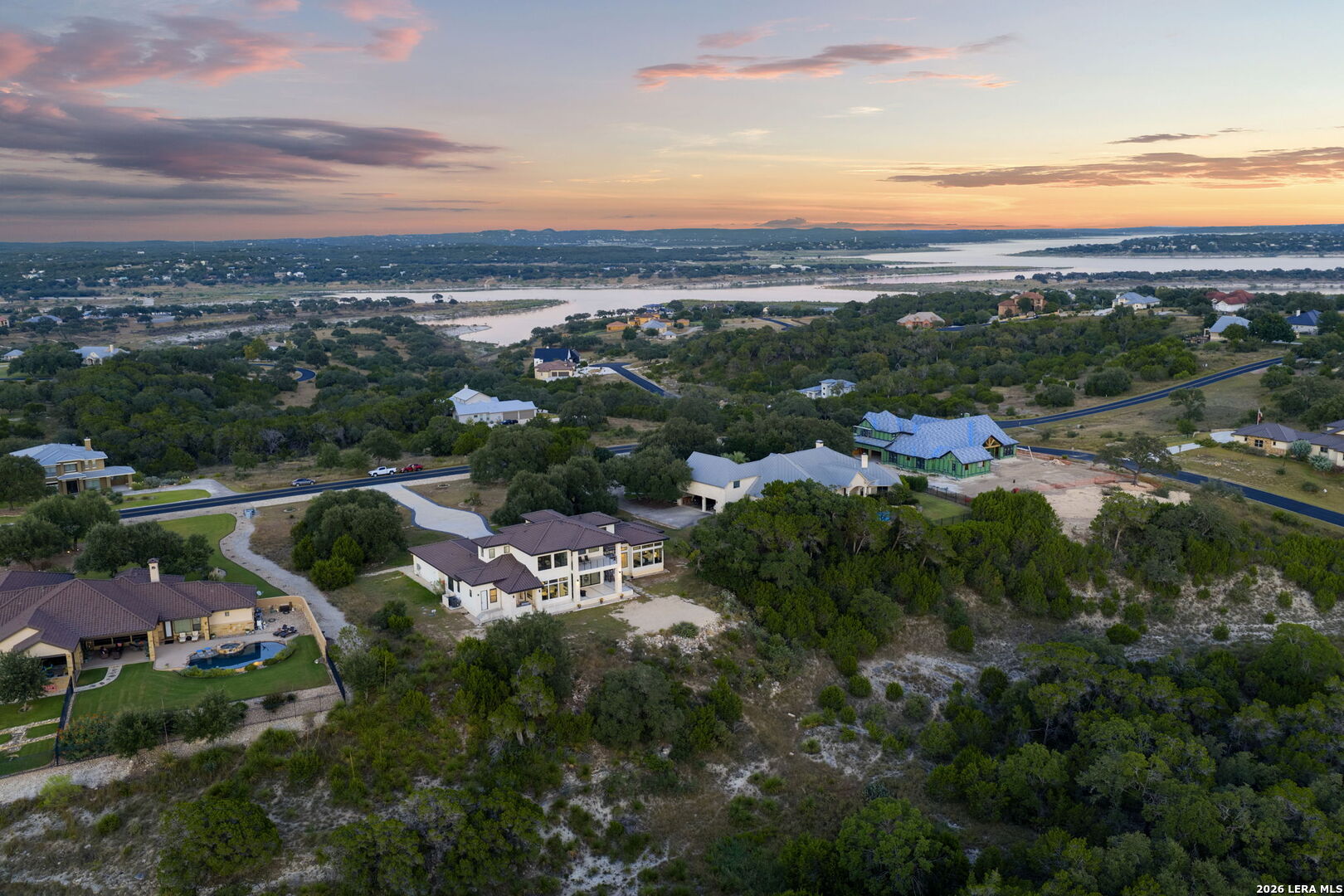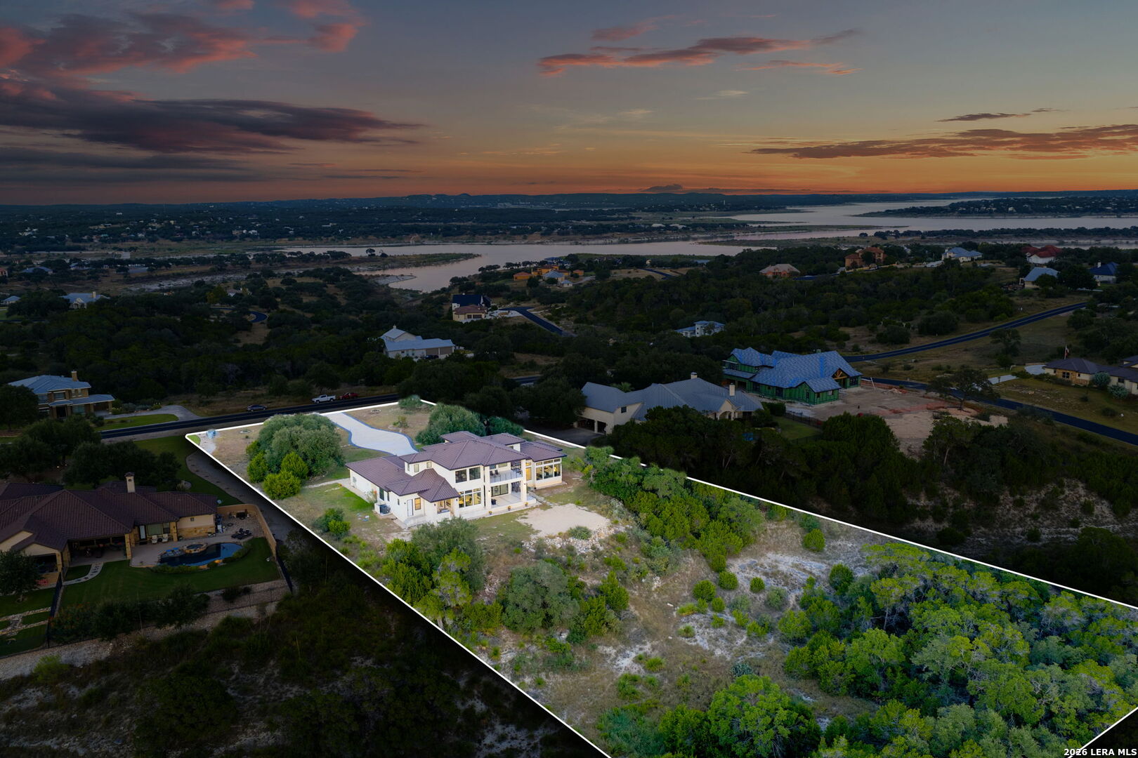 Experience the pinnacle of Hill Country luxury in this breathtaking custom residence, located in the prestigious gated community of The Peninsula at Mystic Shores. Set atop a private 3.62-acre hilltop lot, this immaculate two-story home blends modern elegance with comfort and functionality, offering stunning panoramic views of the Hill Country and Guadalupe River. Step through a grand 9-foot double iron door into an open-concept floor plan designed to impress. Soaring 22-foot ceilings and a massive sliding glass door flood the living space with natural light while showcasing the tranquil scenery outside. The living room features a striking floor-to-ceiling porcelain tile fireplace, adding a sleek and sophisticated focal point to the heart of the home. Custom ceiling designs throughout the home further elevate the architectural detail and aesthetic appeal. Perfect for entertaining, the gourmet kitchen boasts a massive center island, high-end Thermador stainless steel appliances-including a professional gas cooktop and vent hood-custom cabinetry with ample storage, quartz countertops, a large pantry, and an undermount sink. The luxurious primary suite offers oversized picture windows that frame daily sunsets and breathtaking views. The spa-inspired en-suite bathroom features an expansive walk-in shower with dual rain showerheads, 12 body jets, floor-to-ceiling porcelain tile, and a stand-alone soaking tub separated by a tiled pony wall. Dual vanities, a dedicated makeup station, and a generous walk-in closet complete this elegant retreat. Four additional bedrooms each include walk-in closets and private en-suite bathrooms. A dedicated office space opens to the patio via a sleek sliding glass door, while the upstairs loft and media room provide additional room for relaxation or entertainment. Enjoy outdoor living at its finest with both a covered patio and upper balcony offering uninterrupted Hill Country views. The full outdoor kitchen is ideal for al fresco dining and entertaining. Additional features include a spacious 3-car garage, high-end water softener system, a WiFi-controlled irrigation system, and tankless water heater providing endless hot water. Mystic Shores residents enjoy exclusive amenities including a lakeside pool, sports courts, playground, pavilion, and private access to Canyon Lake. With close proximity to Hwy 281, San Antonio, New Braunfels, and Wimberley, this home offers an unmatched combination of luxury, privacy, and convenience.