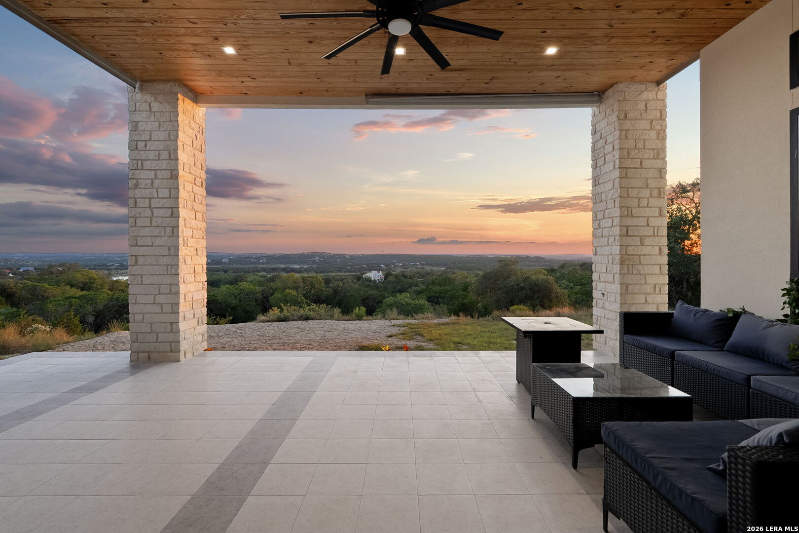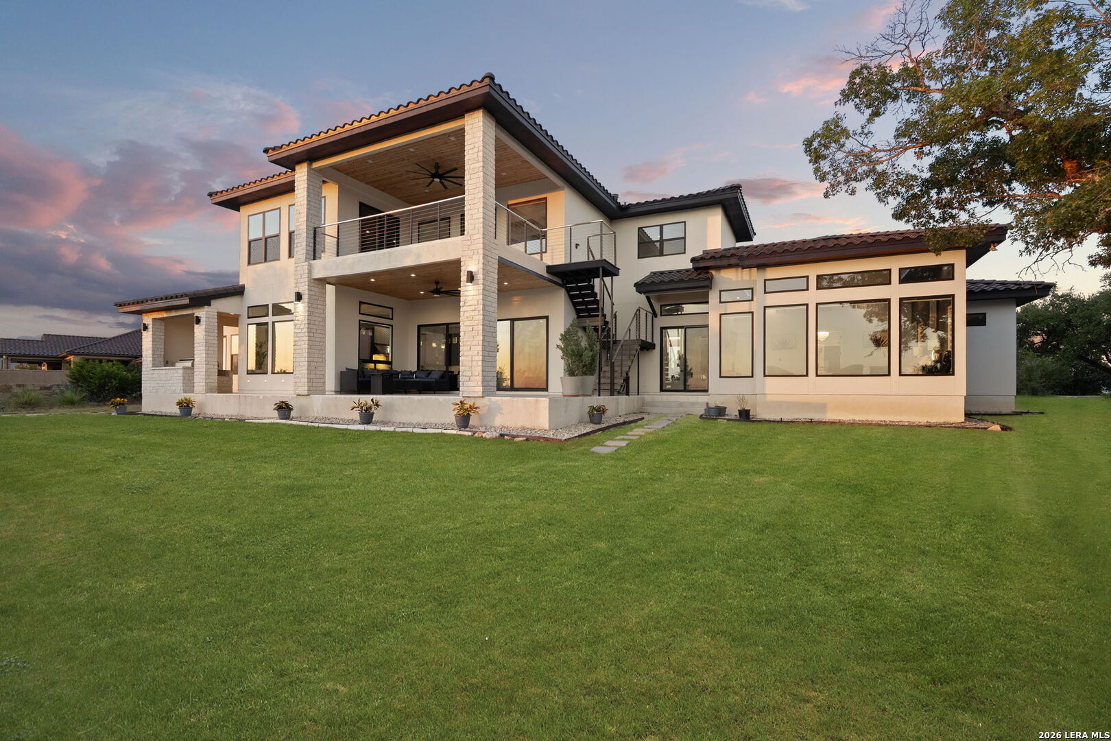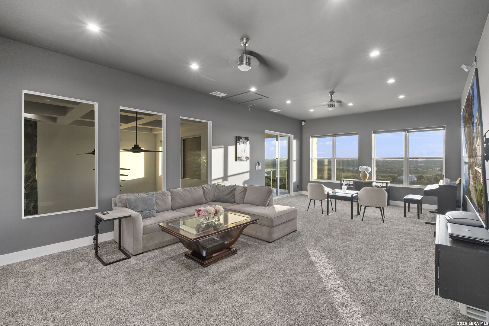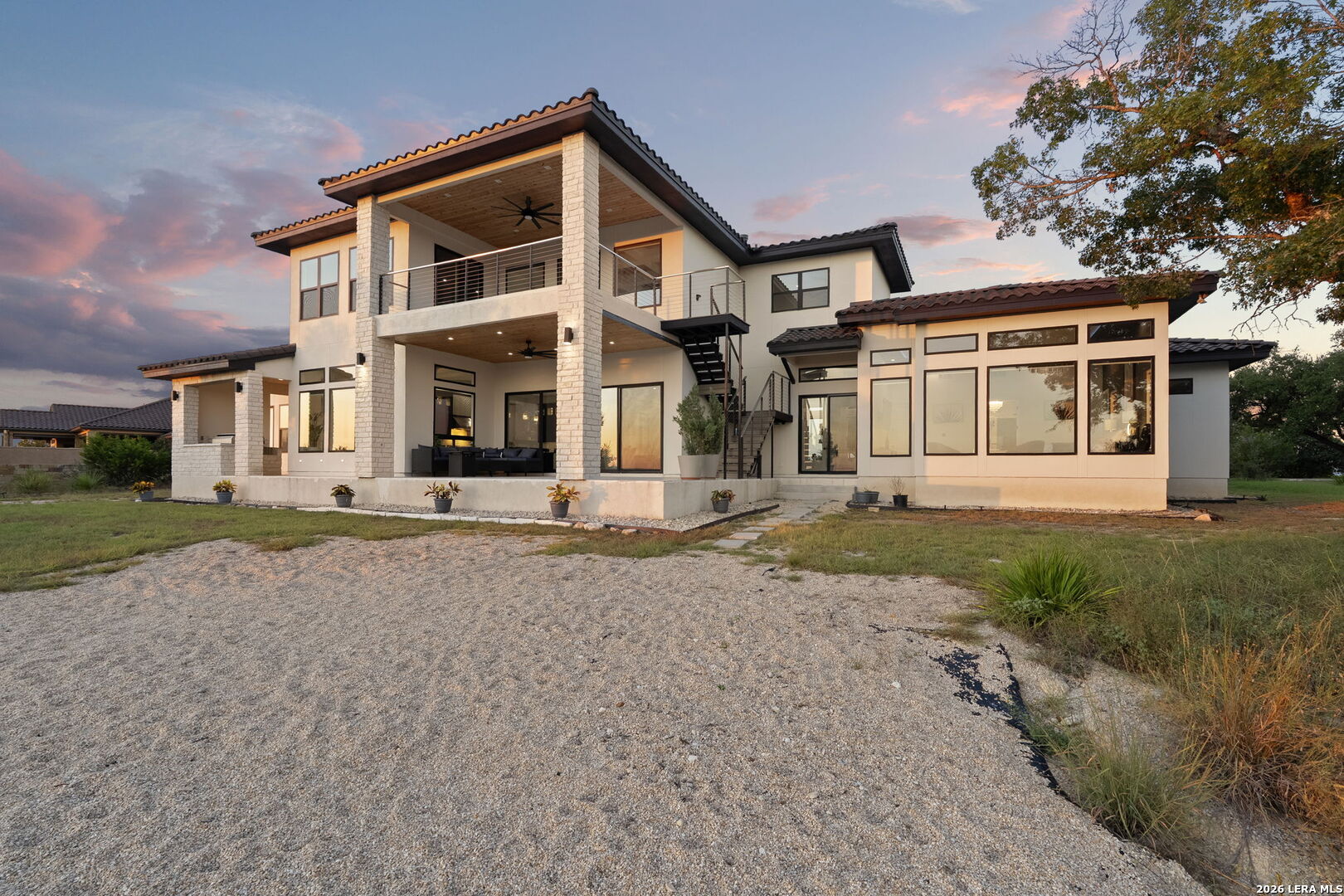 Experience the pinnacle of Hill Country luxury in this breathtaking custom residence, located in the prestigious gated community of The Peninsula at Mystic Shores. Set atop a private 3.62-acre hilltop lot, this immaculate two-story home blends modern elegance with comfort and functionality, offering stunning panoramic views of the Hill Country and Guadalupe River. Step through a grand 9-foot double iron door into an open-concept floor plan designed to impress. Soaring 22-foot ceilings and a massive sliding glass door flood the living space with natural light while showcasing the tranquil scenery outside. The living room features a striking floor-to-ceiling porcelain tile fireplace, adding a sleek and sophisticated focal point to the heart of the home. Custom ceiling designs throughout the home further elevate the architectural detail and aesthetic appeal. Perfect for entertaining, the gourmet kitchen boasts a massive center island, high-end Thermador stainless steel appliances-including a professional gas cooktop and vent hood-custom cabinetry with ample storage, quartz countertops, a large pantry, and an undermount sink. The luxurious primary suite offers oversized picture windows that frame daily sunsets and breathtaking views. The spa-inspired en-suite bathroom features an expansive walk-in shower with dual rain showerheads, 12 body jets, floor-to-ceiling porcelain tile, and a stand-alone soaking tub separated by a tiled pony wall. Dual vanities, a dedicated makeup station, and a generous walk-in closet complete this elegant retreat. Four additional bedrooms each include walk-in closets and private en-suite bathrooms. A dedicated office space opens to the patio via a sleek sliding glass door, while the upstairs loft and media room provide additional room for relaxation or entertainment. Enjoy outdoor living at its finest with both a covered patio and upper balcony offering uninterrupted Hill Country views. The full outdoor kitchen is ideal for al fresco dining and entertaining. Additional features include a spacious 3-car garage, high-end water softener system, a WiFi-controlled irrigation system, and tankless water heater providing endless hot water. Mystic Shores residents enjoy exclusive amenities including a lakeside pool, sports courts, playground, pavilion, and private access to Canyon Lake. With close proximity to Hwy 281, San Antonio, New Braunfels, and Wimberley, this home offers an unmatched combination of luxury, privacy, and convenience.