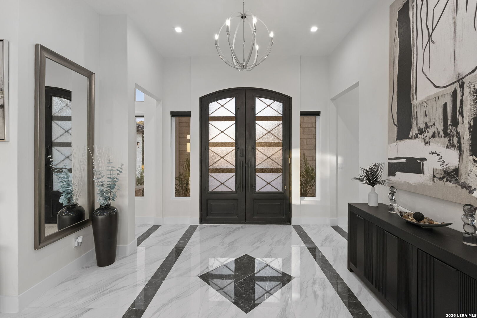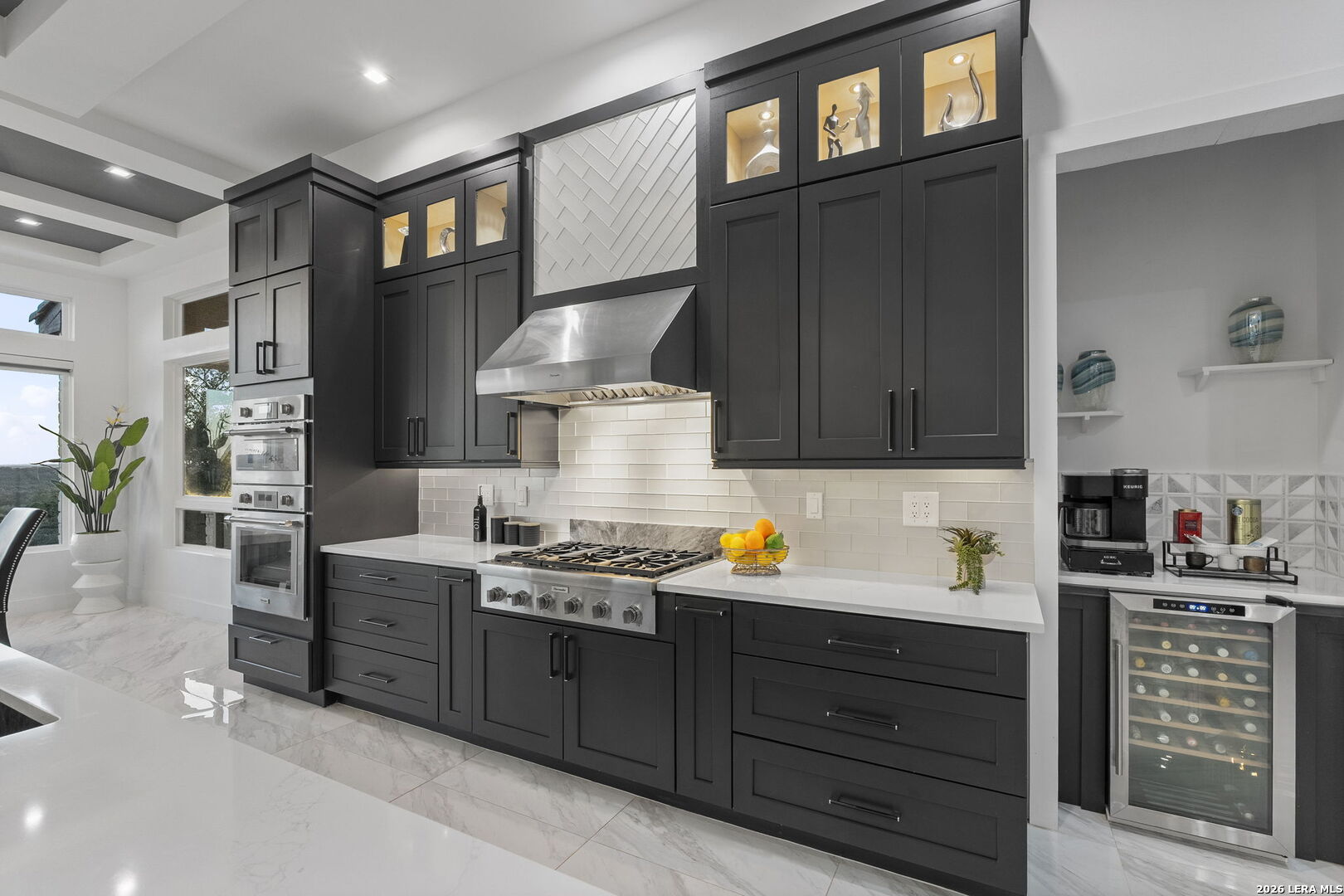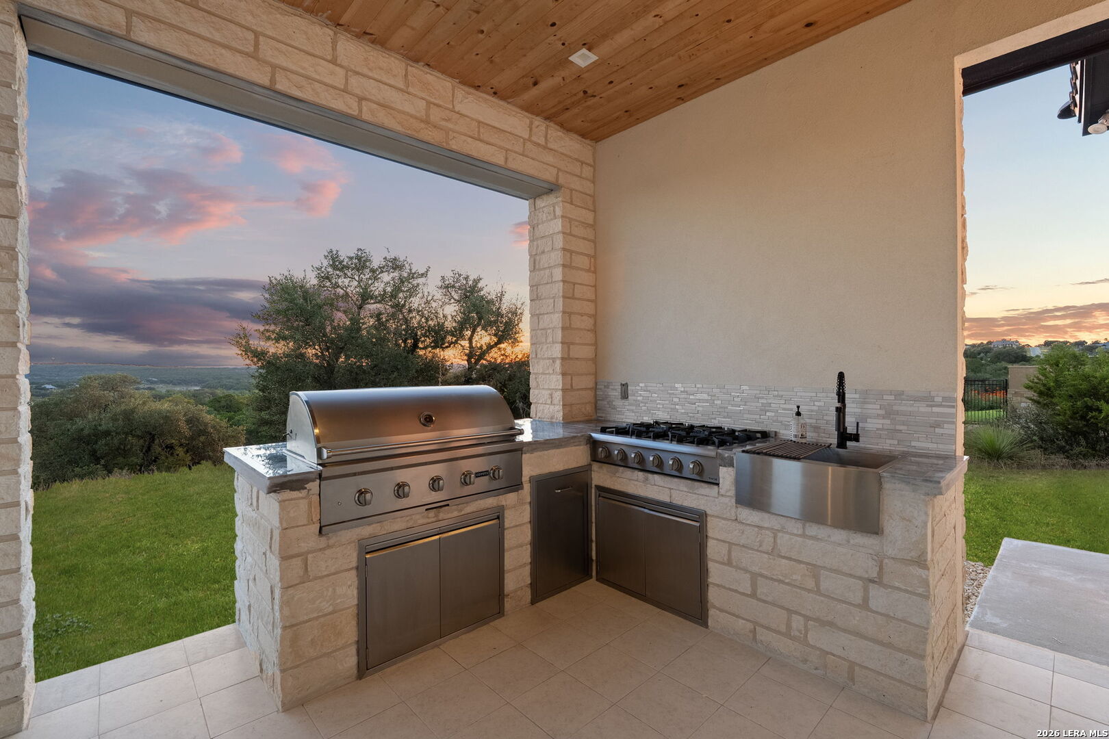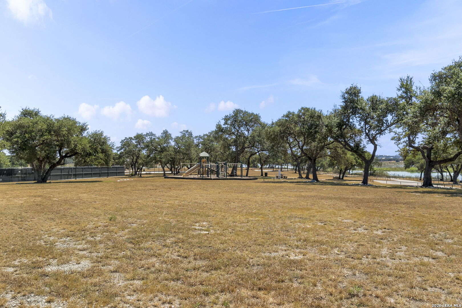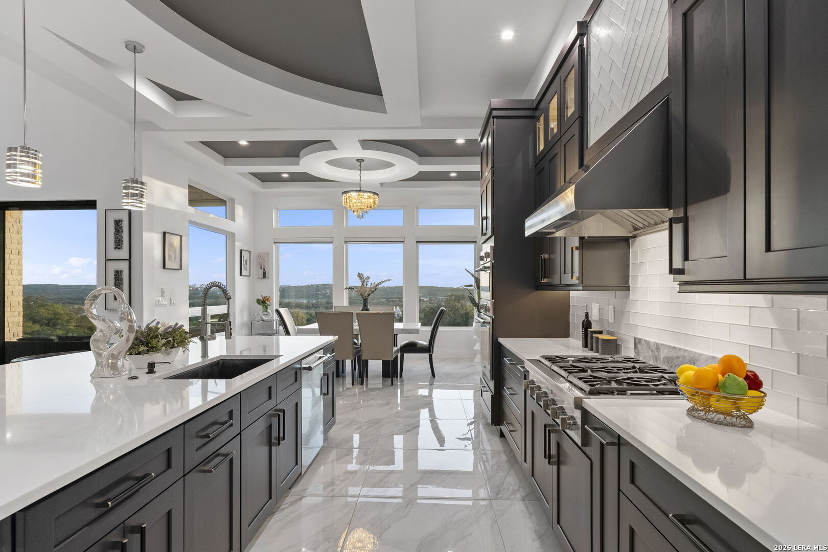Experience the pinnacle of Hill Country luxury in this breathtaking custom residence, located in the prestigious gated community of The Peninsula at Mystic Shores. Set atop a private 3.62-acre hilltop lot, this immaculate two-story home blends modern elegance with comfort and functionality, offering stunning panoramic views of the Hill Country and Guadalupe River. Step through a grand 9-foot double iron door into an open-concept floor plan designed to impress. Soaring 22-foot ceilings and a massive sliding glass door flood the living space with natural light while showcasing the tranquil scenery outside. The living room features a striking floor-to-ceiling porcelain tile fireplace, adding a sleek and sophisticated focal point to the heart of the home. Custom ceiling designs throughout the home further elevate the architectural detail and aesthetic appeal. Perfect for entertaining, the gourmet kitchen boasts a massive center island, high-end Thermador stainless steel appliances-including a professional gas cooktop and vent hood-custom cabinetry with ample storage, quartz countertops, a large pantry, and an undermount sink. The luxurious primary suite offers oversized picture windows that frame daily sunsets and breathtaking views. The spa-inspired en-suite bathroom features an expansive walk-in shower with dual rain showerheads, 12 body jets, floor-to-ceiling porcelain tile, and a stand-alone soaking tub separated by a tiled pony wall. Dual vanities, a dedicated makeup station, and a generous walk-in closet complete this elegant retreat. Four additional bedrooms each include walk-in closets and private en-suite bathrooms. A dedicated office space opens to the patio via a sleek sliding glass door, while the upstairs loft and media room provide additional room for relaxation or entertainment. Enjoy outdoor living at its finest with both a covered patio and upper balcony offering uninterrupted Hill Country views. The full outdoor kitchen is ideal for al fresco dining and entertaining. Additional features include a spacious 3-car garage, high-end water softener system, a WiFi-controlled irrigation system, and tankless water heater providing endless hot water. Mystic Shores residents enjoy exclusive amenities including a lakeside pool, sports courts, playground, pavilion, and private access to Canyon Lake. With close proximity to Hwy 281, San Antonio, New Braunfels, and Wimberley, this home offers an unmatched combination of luxury, privacy, and convenience.