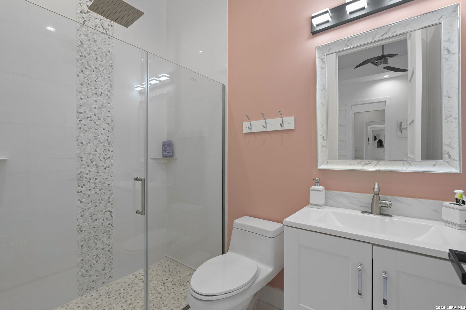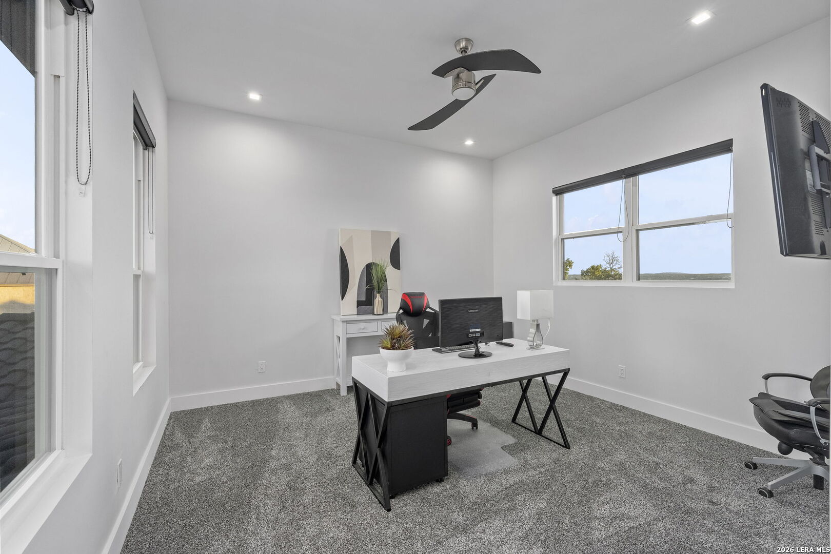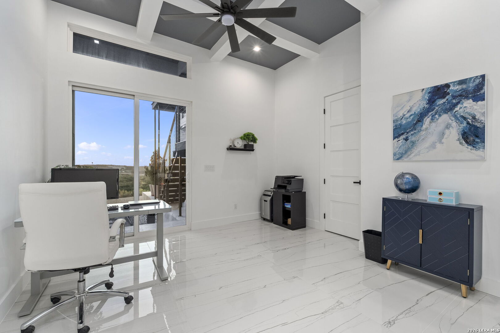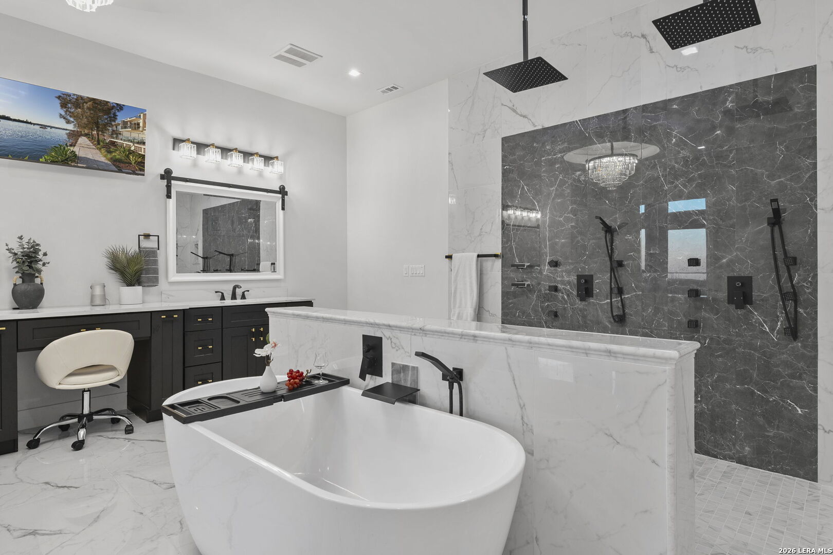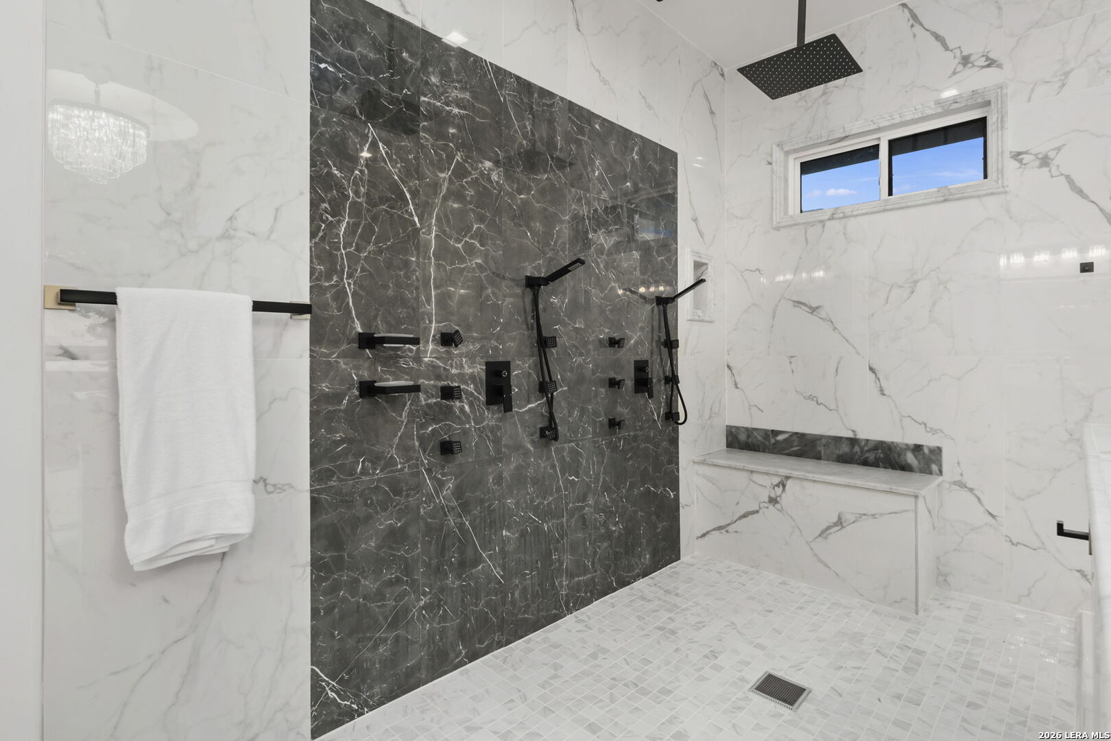 Experience the pinnacle of Hill Country luxury in this breathtaking custom residence, located in the prestigious gated community of The Peninsula at Mystic Shores. Set atop a private 3.62-acre hilltop lot, this immaculate two-story home blends modern elegance with comfort and functionality, offering stunning panoramic views of the Hill Country and Guadalupe River. Step through a grand 9-foot double iron door into an open-concept floor plan designed to impress. Soaring 22-foot ceilings and a massive sliding glass door flood the living space with natural light while showcasing the tranquil scenery outside. The living room features a striking floor-to-ceiling porcelain tile fireplace, adding a sleek and sophisticated focal point to the heart of the home. Custom ceiling designs throughout the home further elevate the architectural detail and aesthetic appeal. Perfect for entertaining, the gourmet kitchen boasts a massive center island, high-end Thermador stainless steel appliances-including a professional gas cooktop and vent hood-custom cabinetry with ample storage, quartz countertops, a large pantry, and an undermount sink. The luxurious primary suite offers oversized picture windows that frame daily sunsets and breathtaking views. The spa-inspired en-suite bathroom features an expansive walk-in shower with dual rain showerheads, 12 body jets, floor-to-ceiling porcelain tile, and a stand-alone soaking tub separated by a tiled pony wall. Dual vanities, a dedicated makeup station, and a generous walk-in closet complete this elegant retreat. Four additional bedrooms each include walk-in closets and private en-suite bathrooms. A dedicated office space opens to the patio via a sleek sliding glass door, while the upstairs loft and media room provide additional room for relaxation or entertainment. Enjoy outdoor living at its finest with both a covered patio and upper balcony offering uninterrupted Hill Country views. The full outdoor kitchen is ideal for al fresco dining and entertaining. Additional features include a spacious 3-car garage, high-end water softener system, a WiFi-controlled irrigation system, and tankless water heater providing endless hot water. Mystic Shores residents enjoy exclusive amenities including a lakeside pool, sports courts, playground, pavilion, and private access to Canyon Lake. With close proximity to Hwy 281, San Antonio, New Braunfels, and Wimberley, this home offers an unmatched combination of luxury, privacy, and convenience.