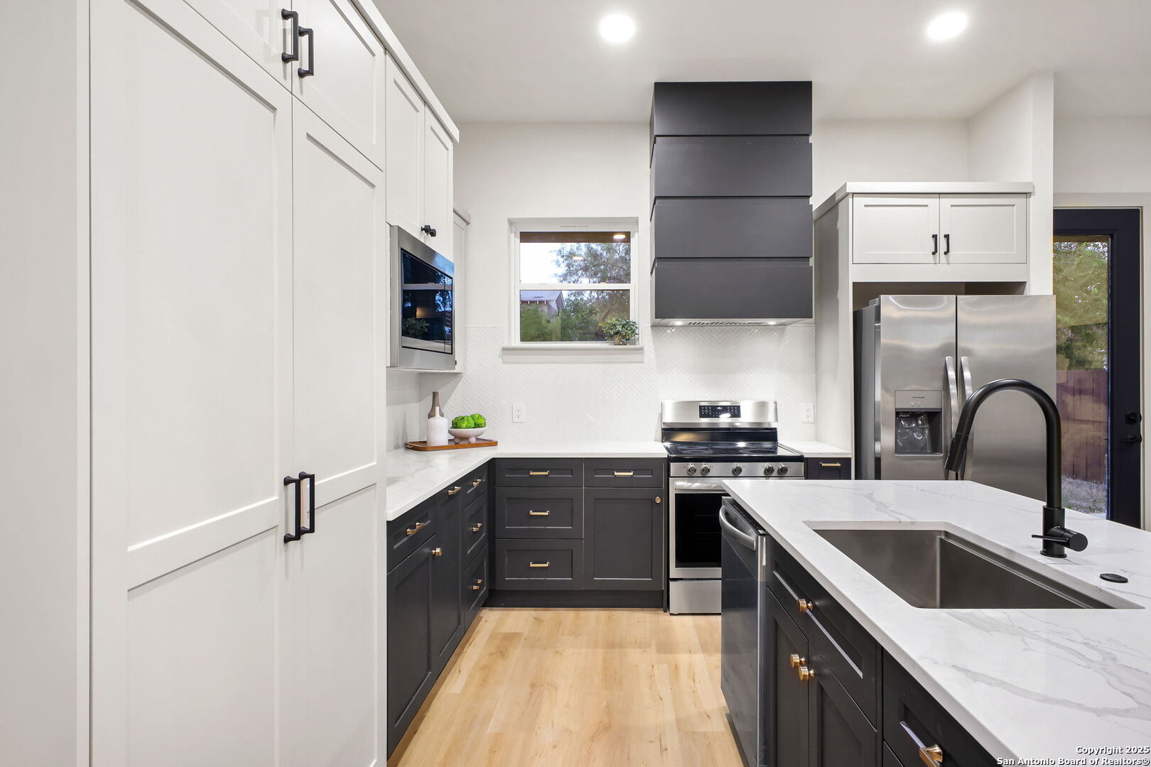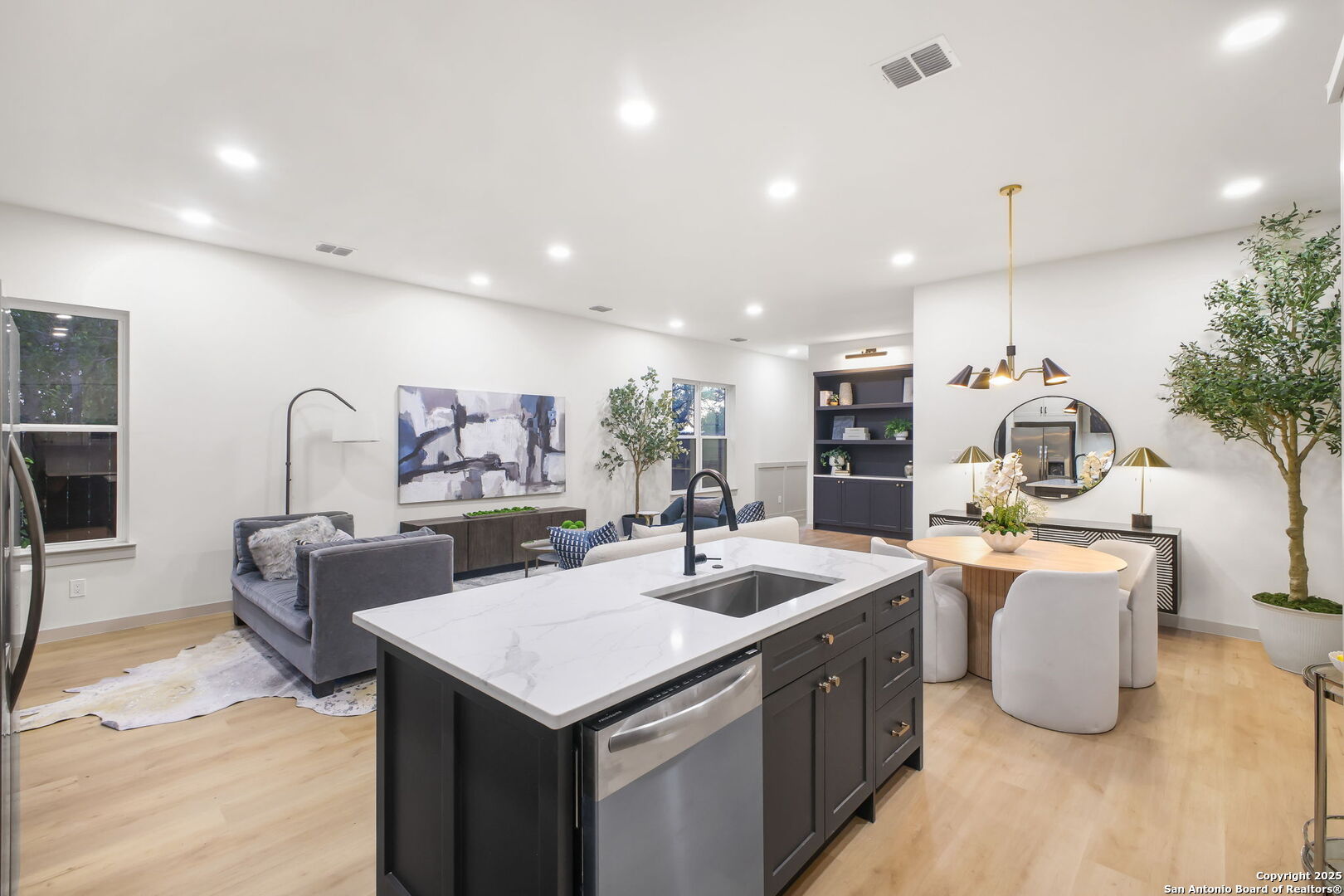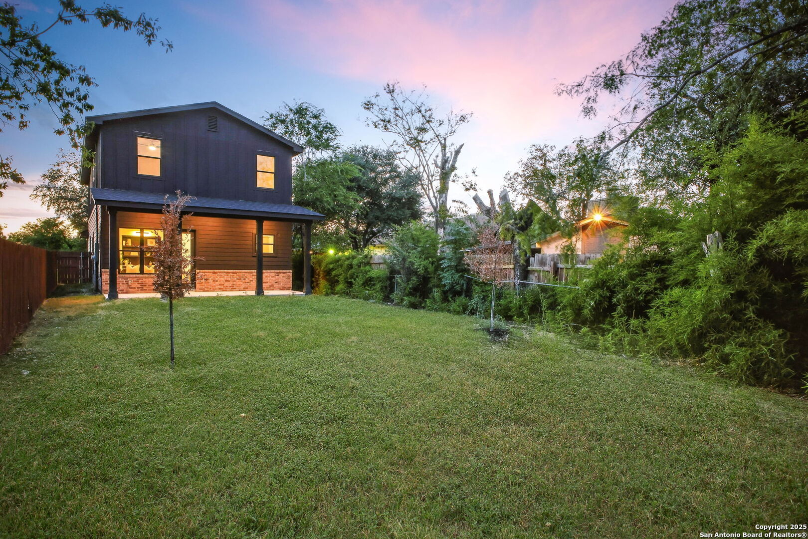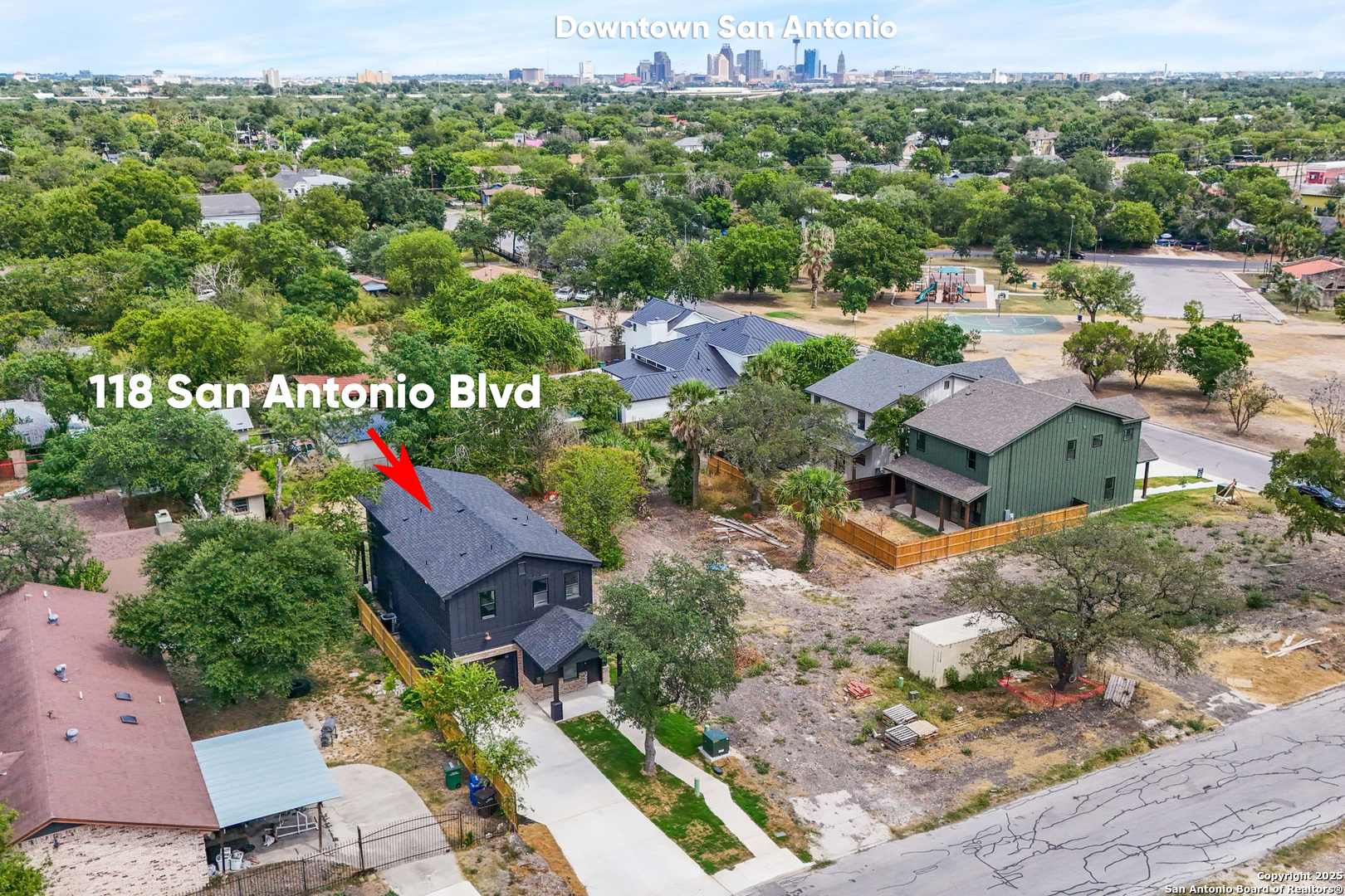 Welcome to this stunning two-story new construction home in the heart of San Antonio, just steps from scenic Woodlawn Park and its many amenities. This thoughtfully designed residence offers an open floor plan with modern finishes throughout. Highlights include luxury vinyl plank flooring, soaring 10-foot ceilings, and 8-foot doors that create a spacious and elegant feel. On the main level, a dedicated home office provides the perfect space for remote work or a guest room. The gourmet kitchen showcases custom wood cabinetry, quartz countertops, a large center island, stainless steel appliances, and a combination of pendant and recessed lighting, ideal for cooking and entertaining. Beautiful built-in cabinetry off the dining area adds a refined touch. Upstairs, each bedroom is complete with ceiling fans, including the primary suite featuring a walk-in closet and spa-like en-suite bath with double vanities and a sleek walk-in shower. The laundry room offers added convenience with built-in cabinetry and a folding station. Additional features include a drop zone off the garage, EV charging station ready, plumbing for a water softener, and a front yard sprinkler system for easy maintenance. With close proximity to parks, downtown, and major highways, this modern, move-in-ready home is perfectly situated in a vibrant and growing neighborhood.