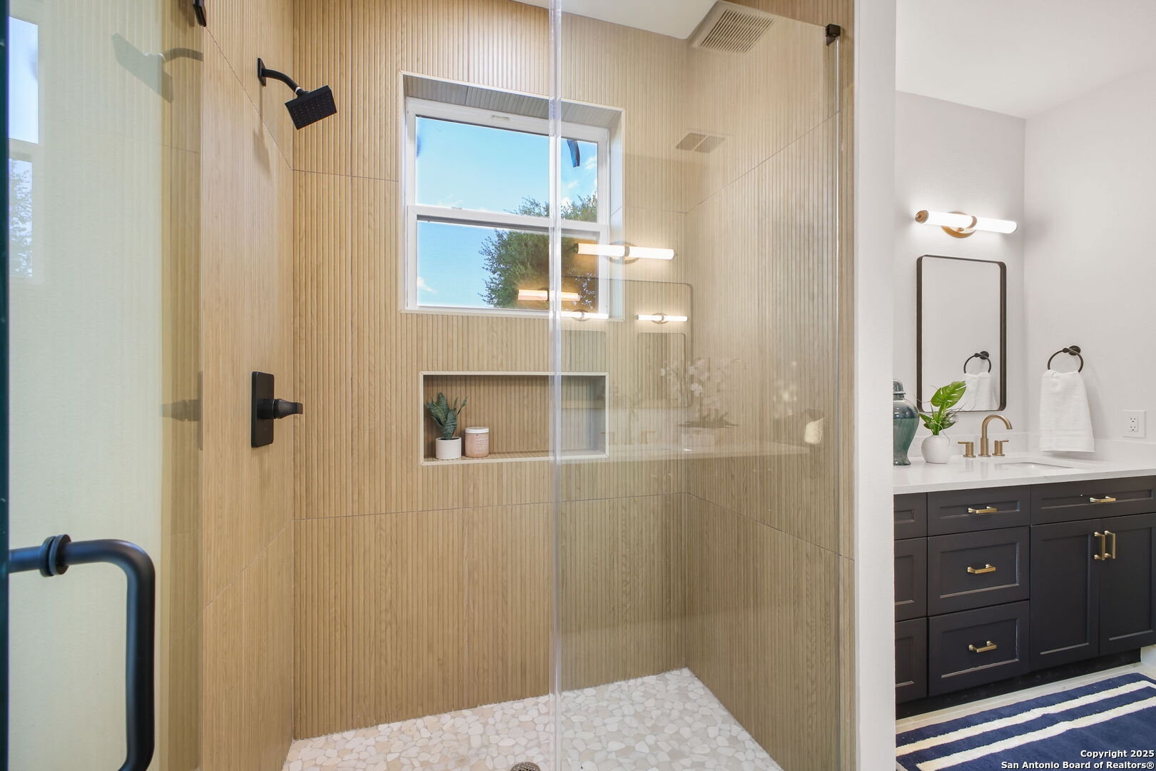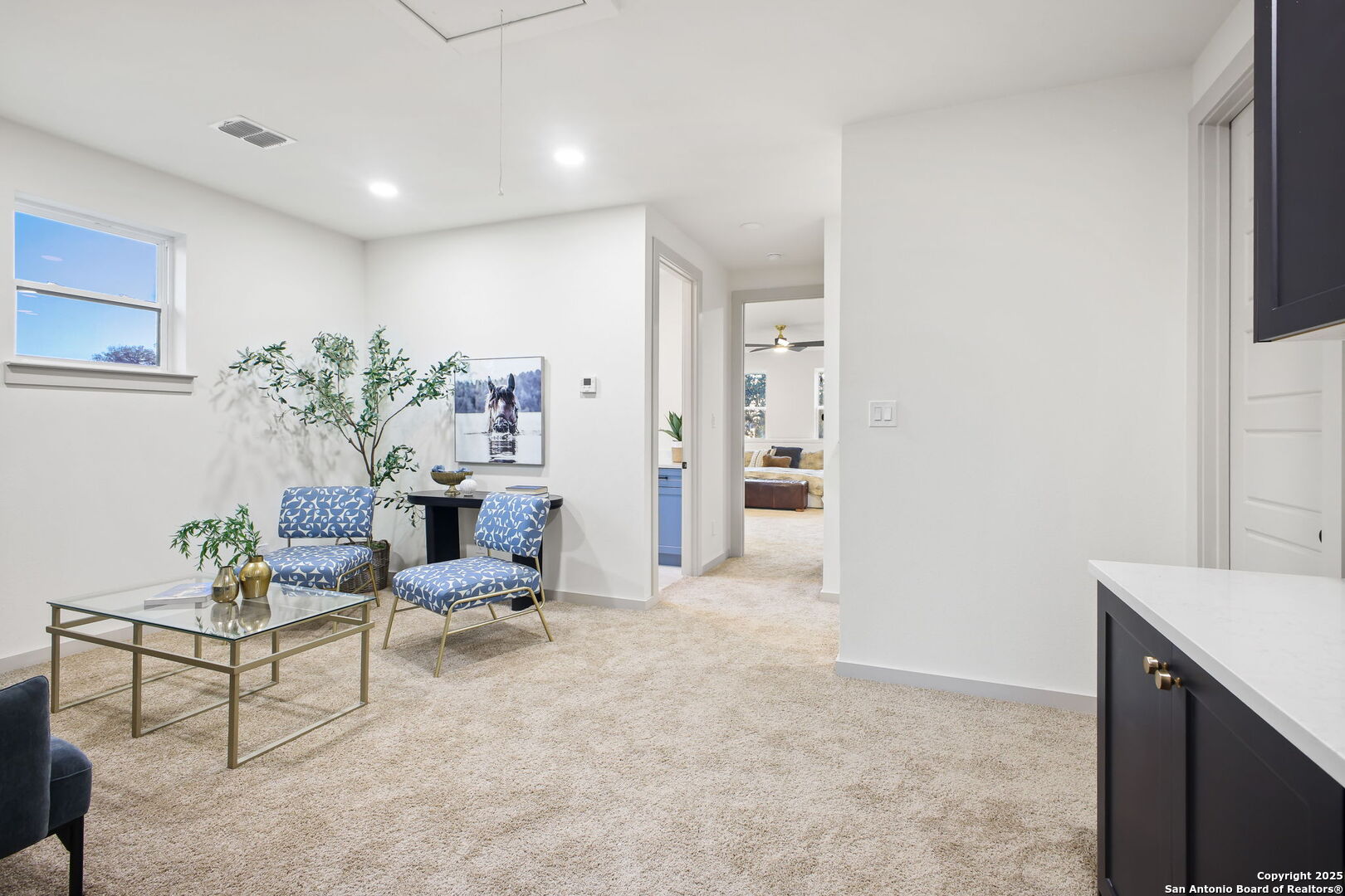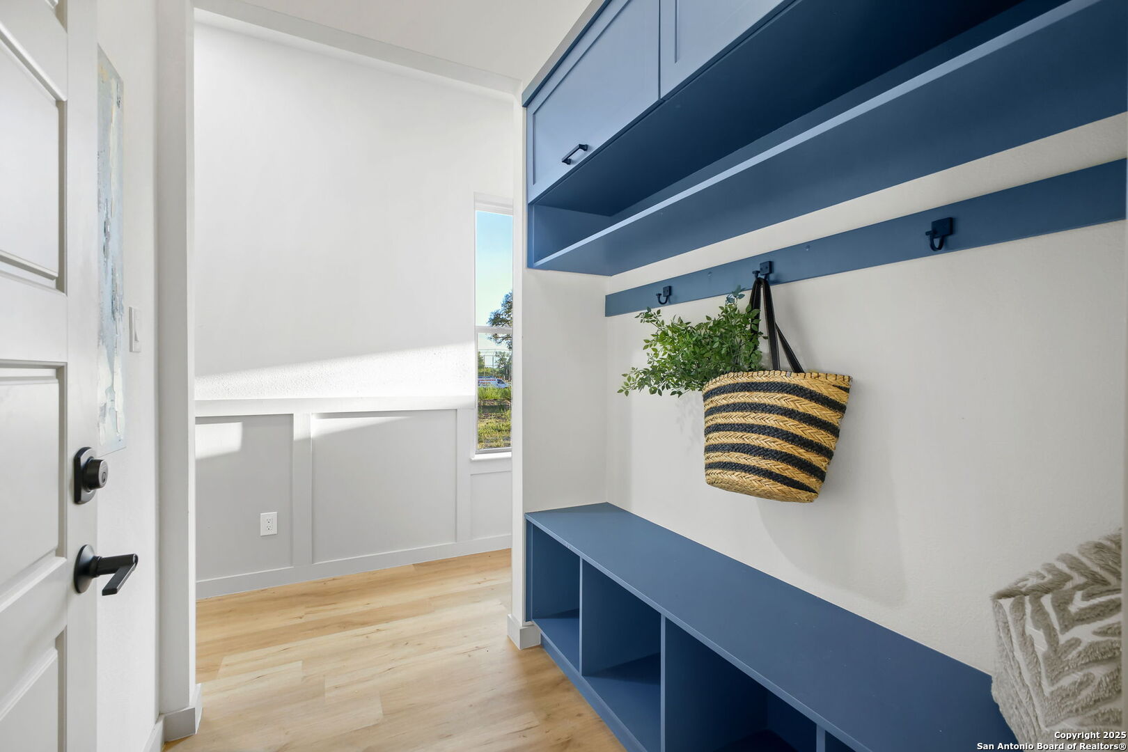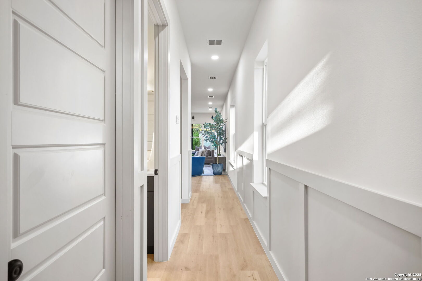Welcome to this stunning two-story new construction home in the heart of San Antonio, just steps from scenic Woodlawn Park and its many amenities. This thoughtfully designed residence offers an open floor plan with modern finishes throughout. Highlights include luxury vinyl plank flooring, soaring 10-foot ceilings, and 8-foot doors that create a spacious and elegant feel. On the main level, a dedicated home office provides the perfect space for remote work or a guest room. The gourmet kitchen showcases custom wood cabinetry, quartz countertops, a large center island, stainless steel appliances, and a combination of pendant and recessed lighting, ideal for cooking and entertaining. Beautiful built-in cabinetry off the dining area adds a refined touch. Upstairs, each bedroom is complete with ceiling fans, including the primary suite featuring a walk-in closet and spa-like en-suite bath with double vanities and a sleek walk-in shower. The laundry room offers added convenience with built-in cabinetry and a folding station. Additional features include a drop zone off the garage, EV charging station ready, plumbing for a water softener, and a front yard sprinkler system for easy maintenance. With close proximity to parks, downtown, and major highways, this modern, move-in-ready home is perfectly situated in a vibrant and growing neighborhood.