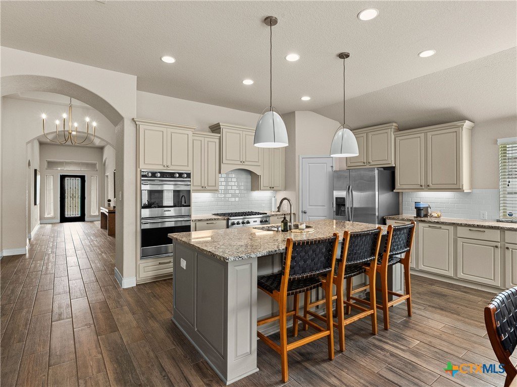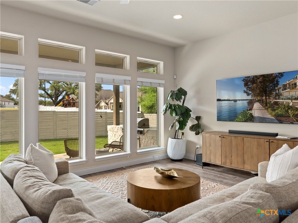 Completely reimagined inside and out, this Perry Home in coveted Vintage Oaks at the Vineyard has been thoughtfully upgraded at every turn. Set on a beautifully landscaped lot, this home delivers the feel of new construction. The spa-caliber primary bath features designer fixtures, dual LED mirrors, an electronic bidet toilet, a custom makeup vanity, double vanities, and a soaking tub; creating a true private retreat. Throughout the home,updated tile flooring flows seamlessly with no carpet, complemented by designer lighting, Viking appliances and refined hardware. Closets have been enhanced with custom built-in storage systems for added functionality. A whole-home water filtration system, water softener, and upgraded water heater ensure quality water throughout. The garage goes beyond storage with a dedicated dog washing station. Outside, an enclosed dog yard complements a covered patio anchored by a built-in grill; perfect for effortless Hill Country entertaining. Additional upgrades include full gutters, propane, and gas appliances. The home is wired for security with hardwired cameras and a smart video doorbell, offering modern convenience and peace of mind. Located in Vintage Oaks, residents enjoy resort-style pools, tennis courts, a clubhouse, trails, sports courts, and top-rated Smithson Valley schools. Move-in ready and truly better than new.