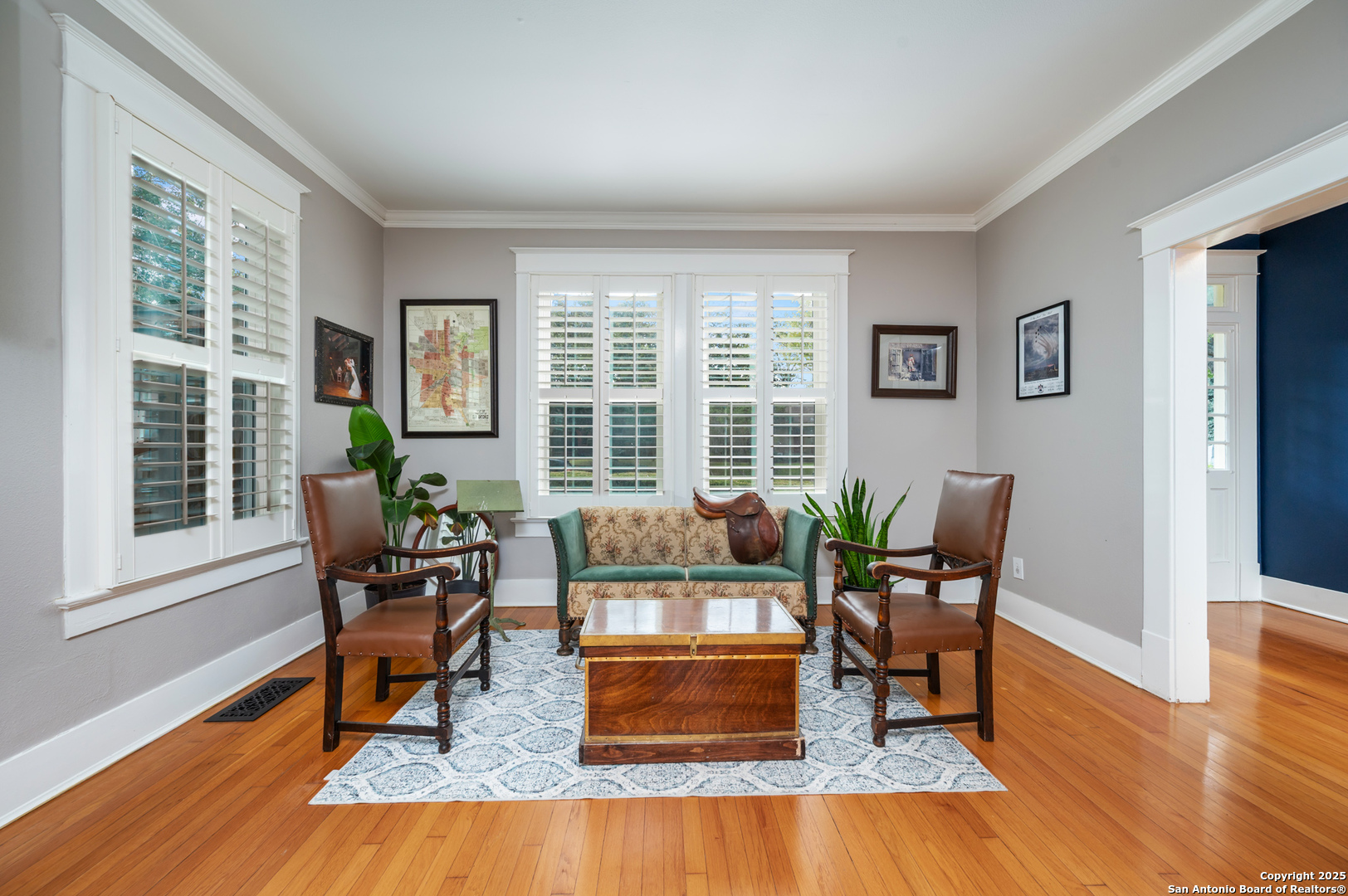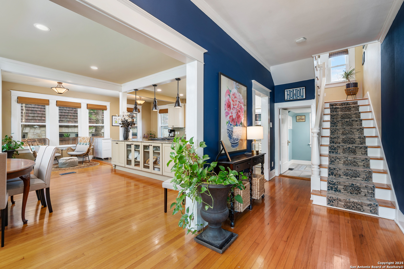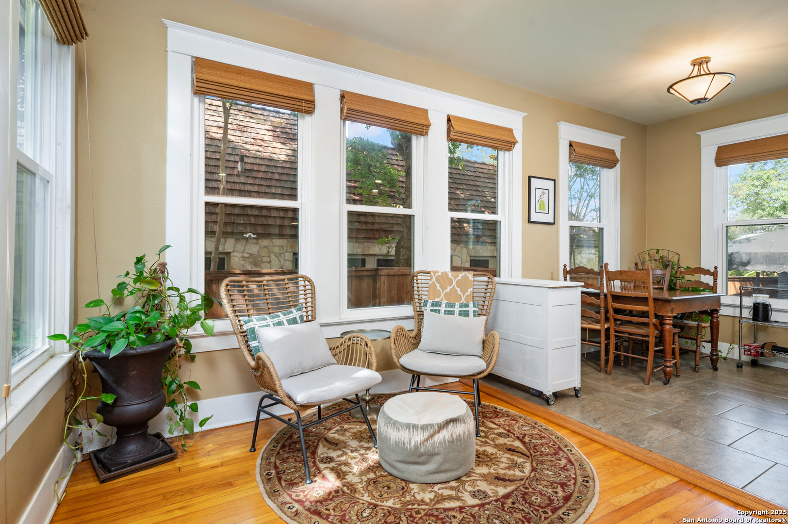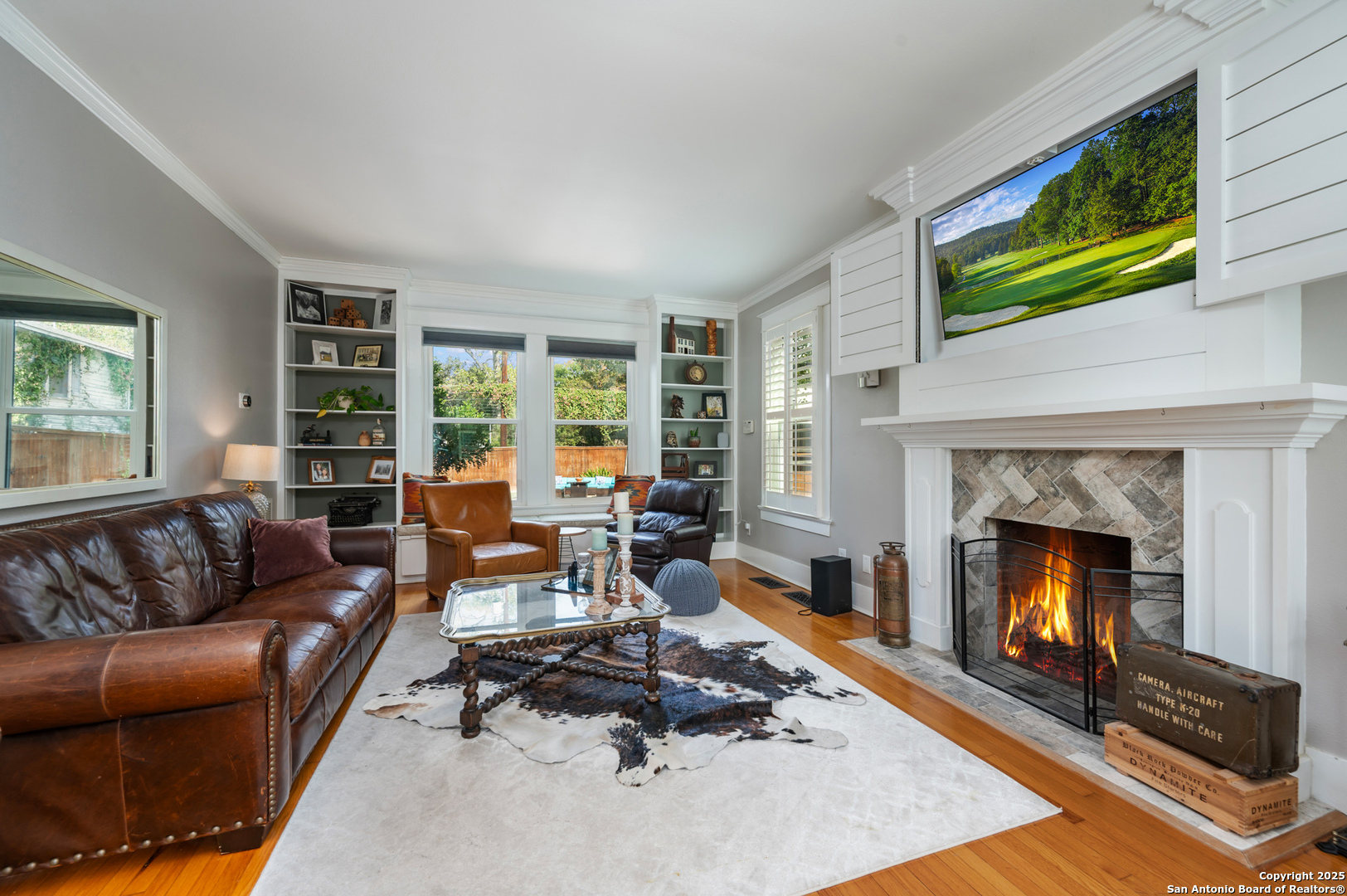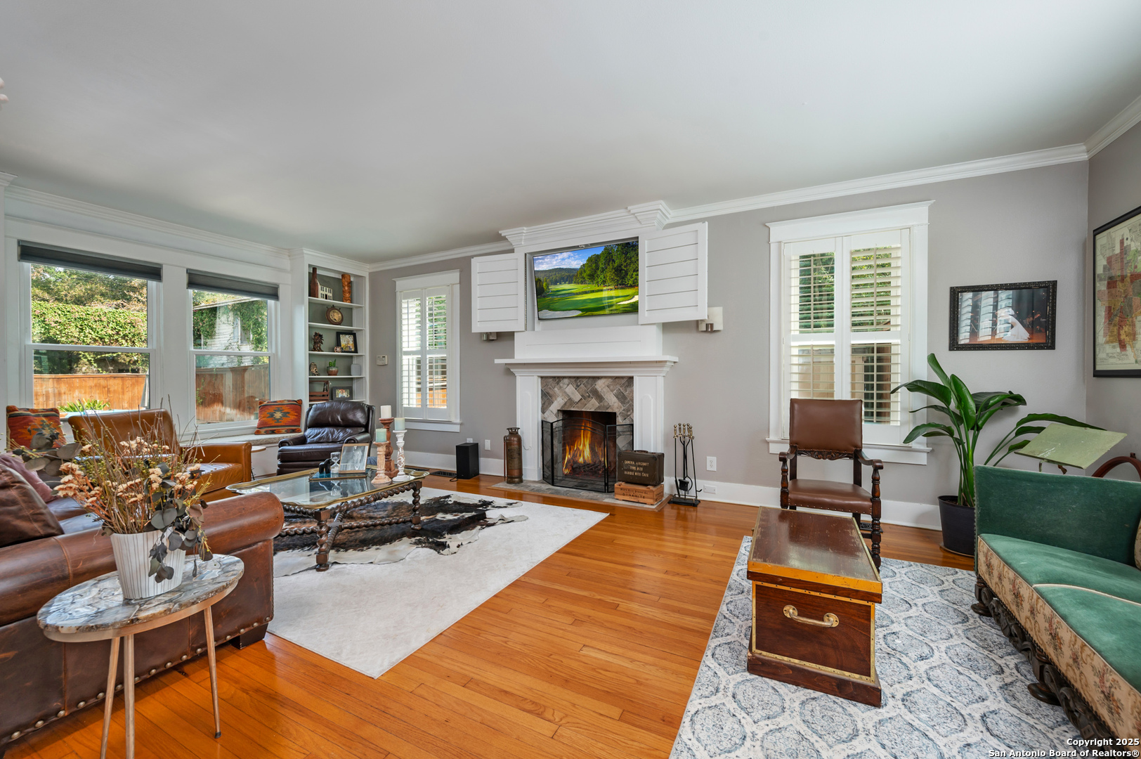 Fall in love with this 1926 Monte Vista treasure, where historic character and modern luxury come together on one of the district's most beautiful tree-lined streets. Proudly listed on the National Register of Historic Places, this elegant three-story home showcases original hardwood floors, rich millwork, stained-glass accents, a dramatic floor-to-ceiling fireplace, and a stunning double wood staircase. The renovated kitchen features an expansive island, copper farmhouse sink, wine fridge, stainless appliances, soft-close storage, and sun-filled windows that elevate everyday living. A screened porch overlooks the sparkling pool, spa, and waterfall, creating a private backyard escape. The main home offers 4 bedrooms, 2.5 baths, and a third-floor flex suite with a full bath, ideal for guests or a creative retreat. A detached 580sqft guest house with full bath provides exceptional flexibility for an office, studio, multigenerational living, or income potential. Additional highlights include a 2020 roof, recent energy-efficient windows, beautifully landscaped grounds, and an assumable 2.75 VA loan (approx. $565,900 balance) available to any qualified buyer-a rare opportunity to secure a below-market rate. Enjoy walkable charm, timeless craftsmanship, and the warmth of Monte Vista living-just 1.5 miles from Downtown San Antonio.