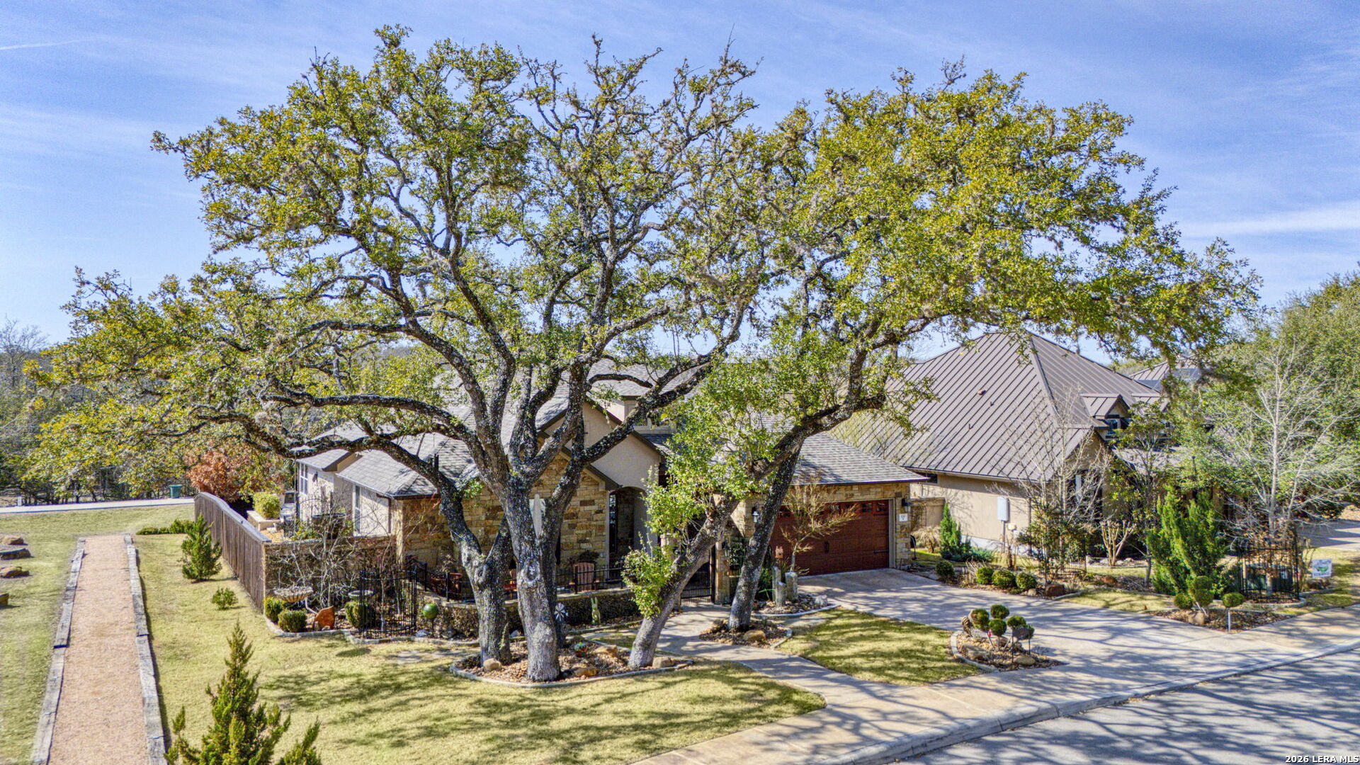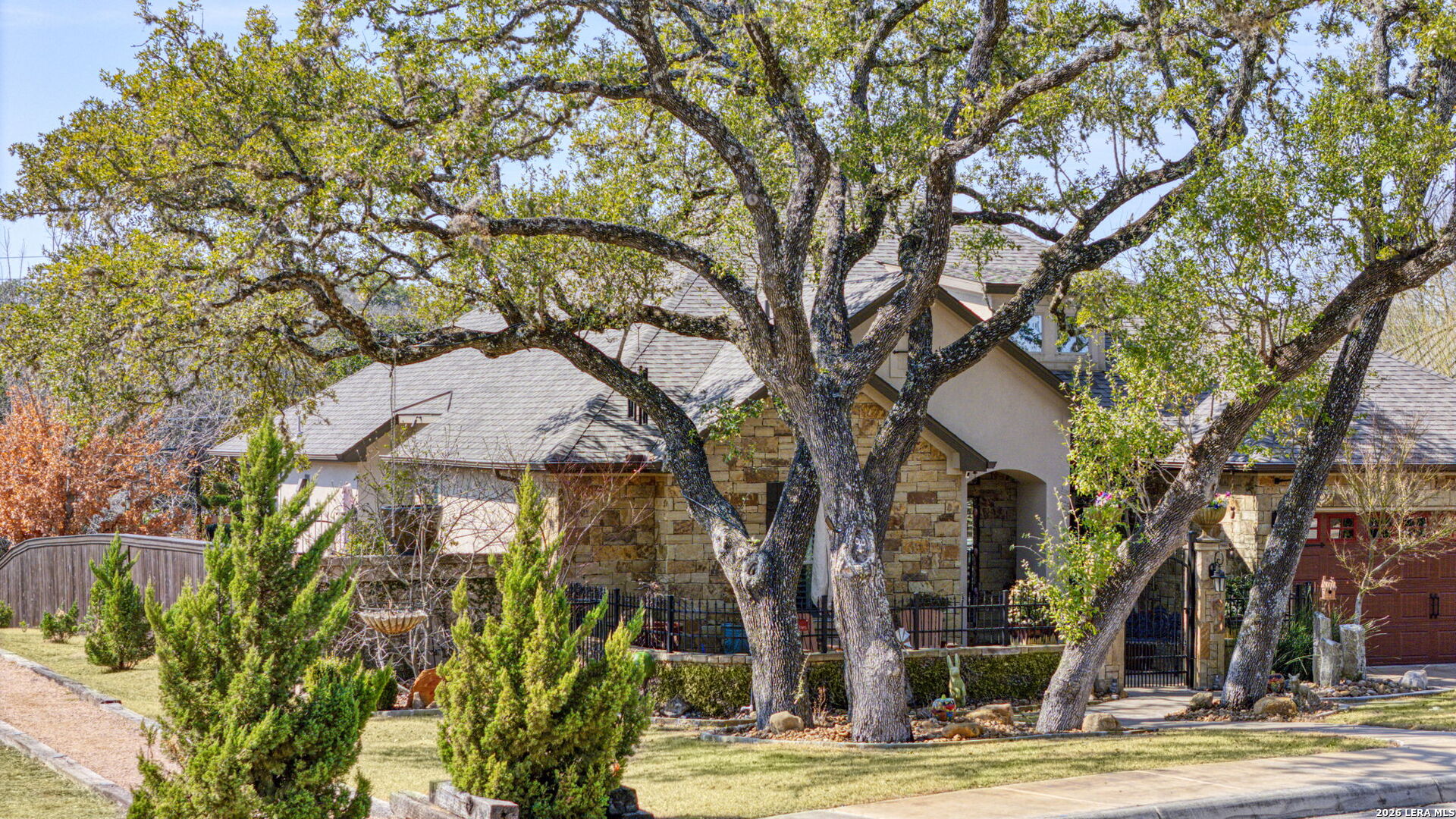 **OPEN HOUSE, SUNDAY 2/15, 1-3PM** Luxury and location meet in this exceptional in-town Boerne residence, offering rare walkability to Main Street's restaurants, boutiques, and year-round events while backing directly to the scenic Old No. 9 Walking Trail. Meticulously upgraded and lovingly maintained, this 3-bedroom 2.5-bath home is where craftsmanship, comfort, and privacy live in perfect balance-offering a level of finish and design more often found in much larger residences. A welcoming courtyard and meandering front walk create a charming arrival, leading to a craftsman entry door beneath a transom window. Inside, rich woodwork, crown molding, and a Tiffany-inspired stained-glass pendant set an elegant tone. Throughout the home, custom trim, coffered and beamed ceilings, extensive built-ins, plantation shutters, and premium stone surfaces reflect thoughtful design and enduring quality. Walls of well-placed windows invite natural light from multiple directions, keeping the home bright, framing tranquil views of greenery, and preserving a remarkable sense of seclusion. In the evening, layered lighting on dimmers throughout creates a warm, intimate atmosphere. Glass French doors open to a private office with floor-to-ceiling illuminated bookcases, built-ins, and a beautifully crafted ceiling, along with access to a secluded stone patio enclosed by custom low walls and wrought iron-an inspiring setting for work, reading, or quiet reflection. A dramatic two-story skylight window, architectural ceiling detail, custom cabinetry, and refined lighting highlight the dining area. In the family room, an artisan mesquite mantel crowns the gas fireplace, forming a natural gathering place. The kitchen blends beauty and function with soft-close craftsman cabinetry, a stainless-steel sink, platinum-grade granite, subway tile, upgraded appliances, gas cooktop, a wine-and-beverage refrigerator, custom island, and specialty lighting. A sun-filled breakfast area wrapped in windows overlooks the pool and outdoor living spaces. The spacious primary suite offers a custom accent wall and pocket doors opening to a luxurious bath with a dual walk-through shower and rain fixture, along with an expansive walk-in closet featuring extensive built-ins and rich wood-tone flooring that offers beauty with everyday durability. Secondary bedrooms continue the home's craftsmanship with walk-in closets, plantation shutters, and detailed trim. Even transitional spaces shine, including a thoughtfully designed back laundry and hall with built-in bench seating, hooks, and generous storage. Outdoor living is equally intentional. A custom-designed patio retreat with extended cover shelters a dramatic floor-to-ceiling stone fireplace, perfect for relaxing by the pool and spa by renowned pool builder Keith Zars Pools. Thick limestone pavers, cut from quarry stone where fossil impressions remain visible, add natural beauty and permanence. Custom lighting, irrigated landscaping, and upgraded wrought-iron, stone, and wood fencing enhance both privacy and presence. In the front yard, majestic heritage oaks anchor the property with shade and timeless character. Other tree and shrub varieties bring exciting seasonal color changes and blooms. Behind the scenes, practical upgrades provide peace of mind, including a hail-resistant roof (2021), LeafFilter gutter protection, upgraded HVAC, Ring security, water softener, reverse osmosis, enhanced electrical service, and a buried propane tank supporting pool heat, cooking, and fireplaces. Yet what owners cherish most is the extraordinary privacy, peaceful views from nearly every window, and the daily rhythm of sunrise and sunset shared with the surrounding trees and visiting wildlife. It is a home created to be kept forever, which makes the opportunity to own it truly rare.