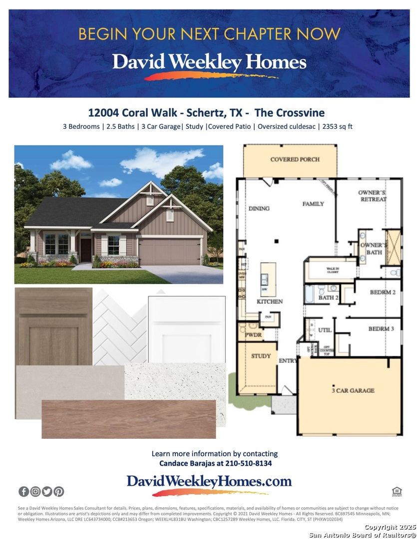 Set on an oversized quarter acre homesite in a quiet cul-de-sac and ready in February 2026, The Ashleigh by David Weekley Homes offers a perfect balance of open gathering spaces and private retreats. Thoughtfully designed for modern living, this home blends comfort, functionality, and timeless style. The spacious kitchen, dining, and family areas create an open-concept layout ideal for everyday living and entertaining. The serene Owner's Retreat features a relaxing en-suite Owner's Bath and a large walk-in closet that combine convenience with luxury. Secondary bedrooms provide generous space to grow, each with sizable closets and room for personal expression. A private study offers the flexibility to serve as a home office, reading room, or welcoming parlor. Extra garage space and a walk-in closet ensure plenty of storage for all your needs. Call or chat with the David Weekley Homes at The Crossvine Team to learn more about this new home for sale in Schertz, TX!