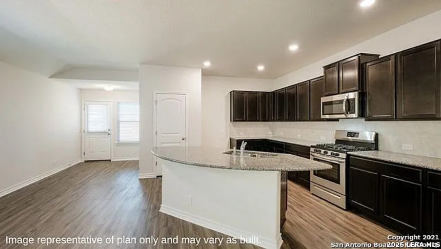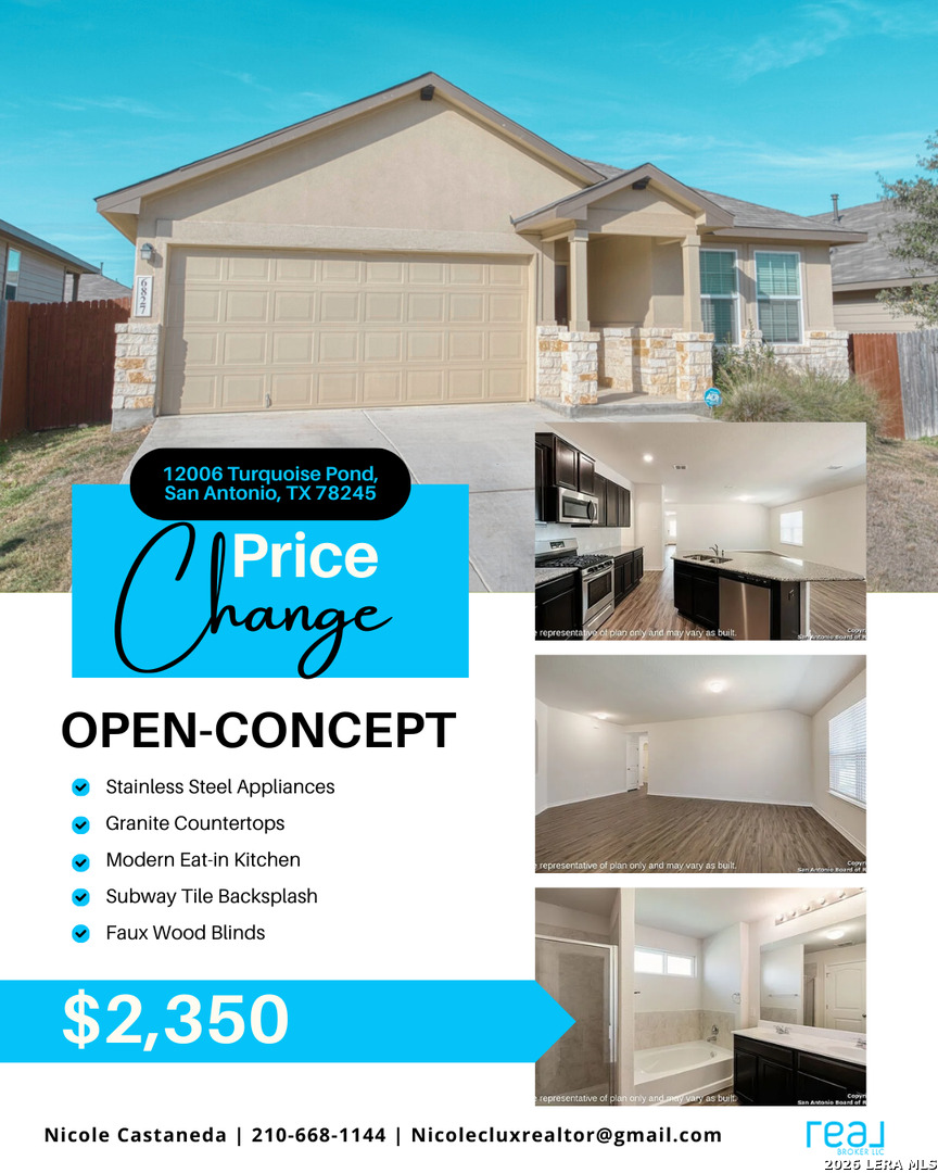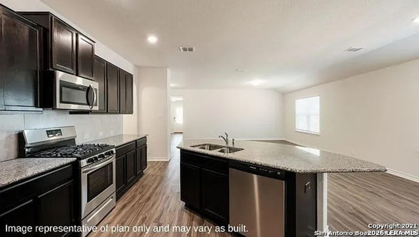 Charming single-story rental home offering 1,901 sq ft with 4 bedrooms and 2 baths. This open-concept layout features a spacious family room that flows into a modern eat-in kitchen with granite countertops, stainless steel appliances, subway tile backsplash, and an oversized island-perfect for entertaining. The private primary suite includes a large ensuite with dual vanities, separate tub and shower, and a walk-in closet. Additional highlights include luxury vinyl plank flooring in main areas, ceramic tile in baths, 9-foot ceilings, faux wood blinds, smart home features, full yard landscaping with irrigation, and washer & dryer included. One month rent free for qualified tenants.