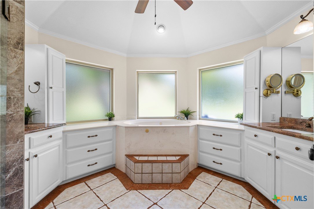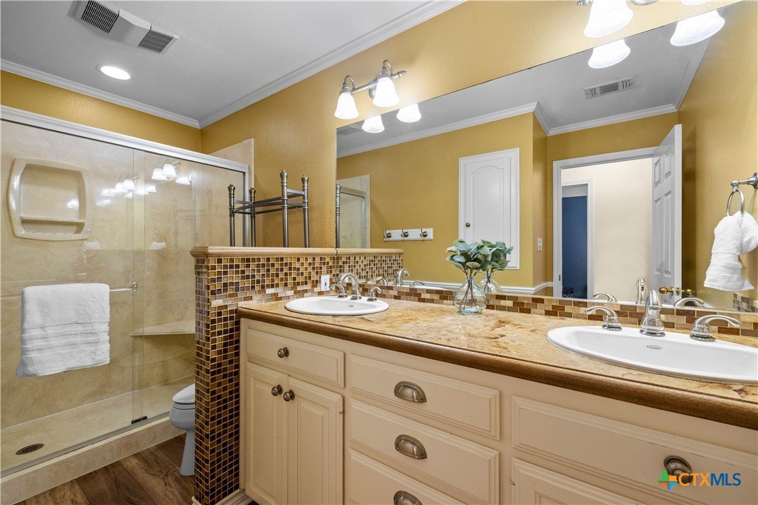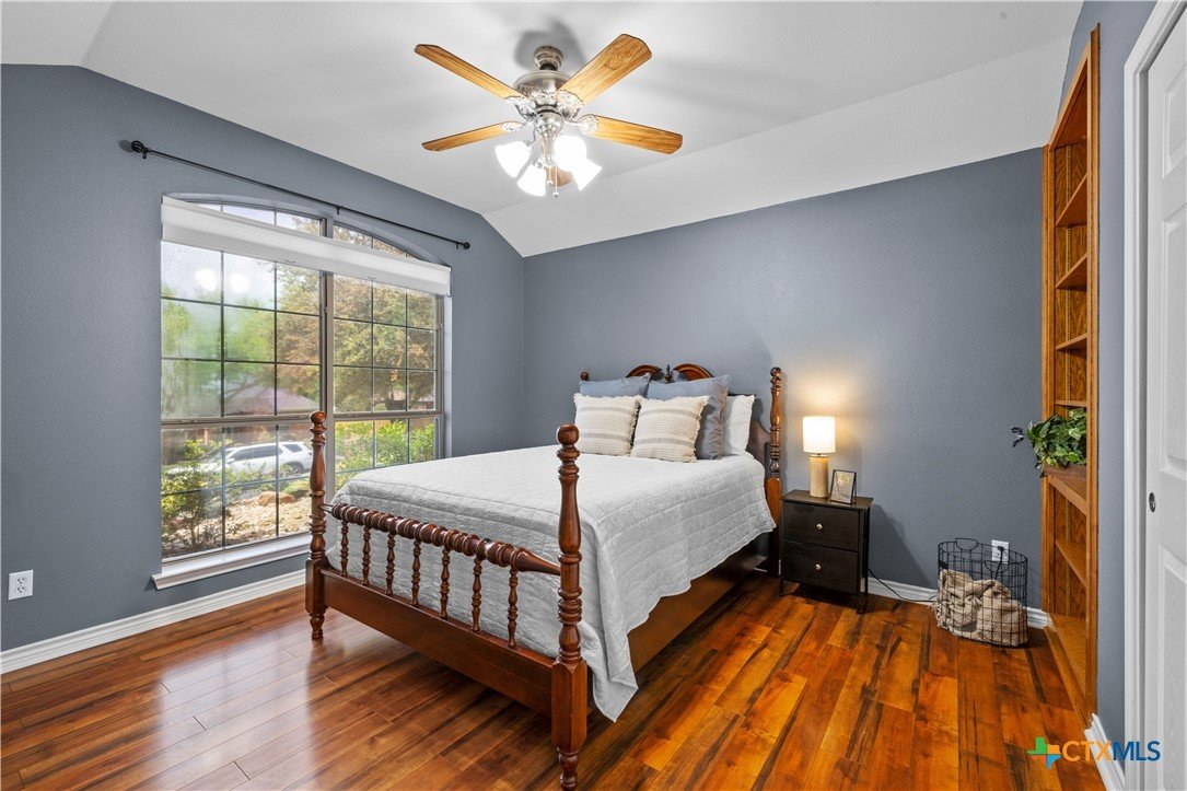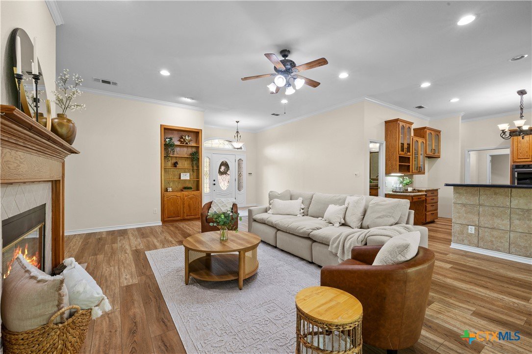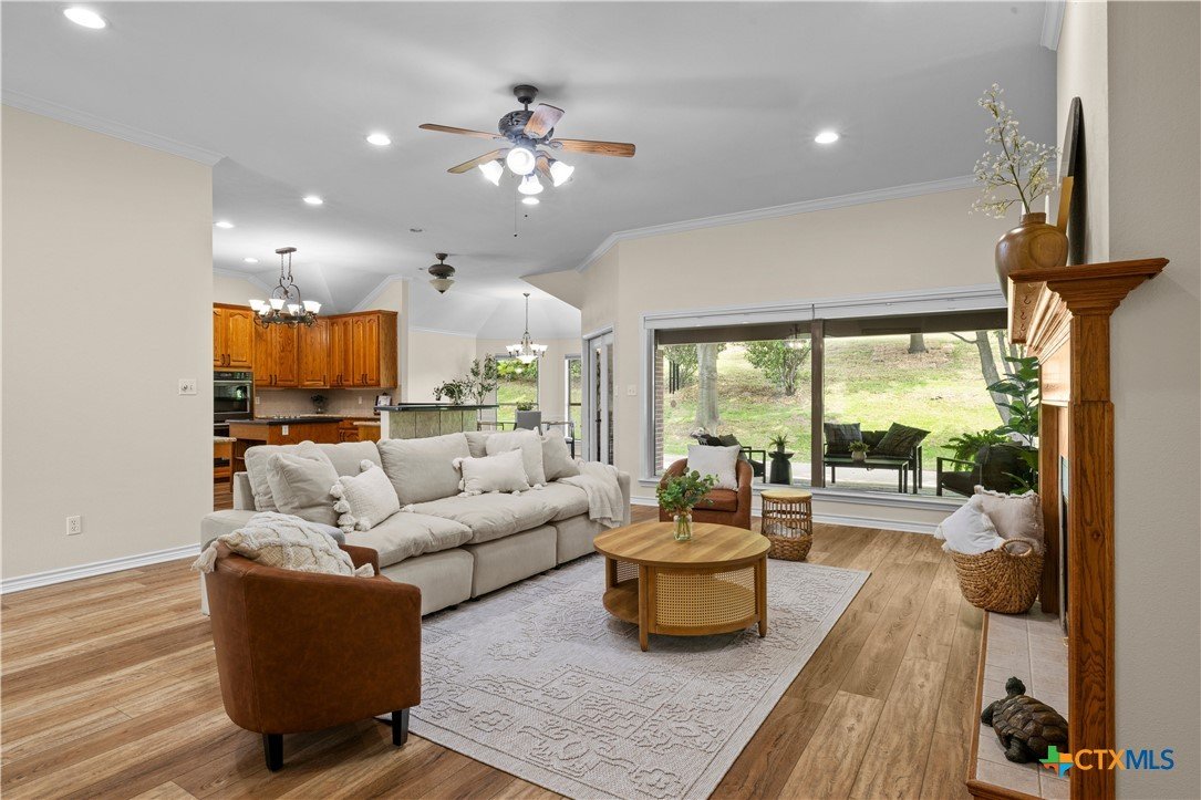 4-bedroom, 2.5-bath home on 2 lots totaling 0.54 acres in Temple, TX. Open floor plan with double-sided fireplace and updated flooring (LVP 2024). Kitchen features granite and quartz countertops, KitchenAid double ovens, downdraft cooktop, dishwasher, and walk-in pantry with additional storage. Spacious primary suite with two walk-in closets, jetted tub, and updated tile shower. Interior and exterior paint recently updated. New roof and gutters (2025). Water heater approx. 5 years old. Outdoor features include epoxy-coated patio, deck, fire pit, mature trees (oak, pecan, pistachio), and sunset views. Extra-large driveway, 2-car garage plus golf cart garage. No neighbors directly beside the home, offering added privacy. Centrally located with a quiet, open feel.