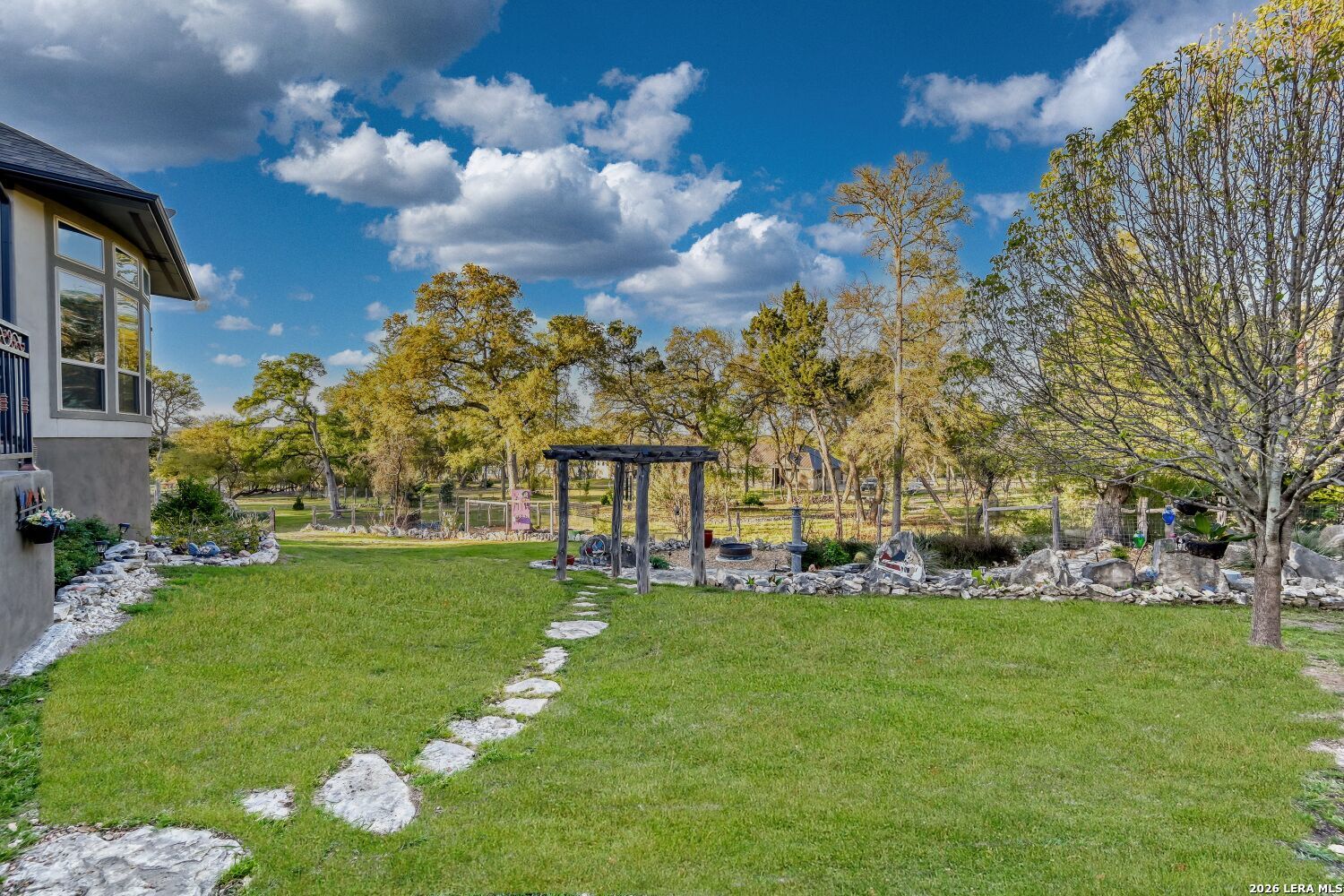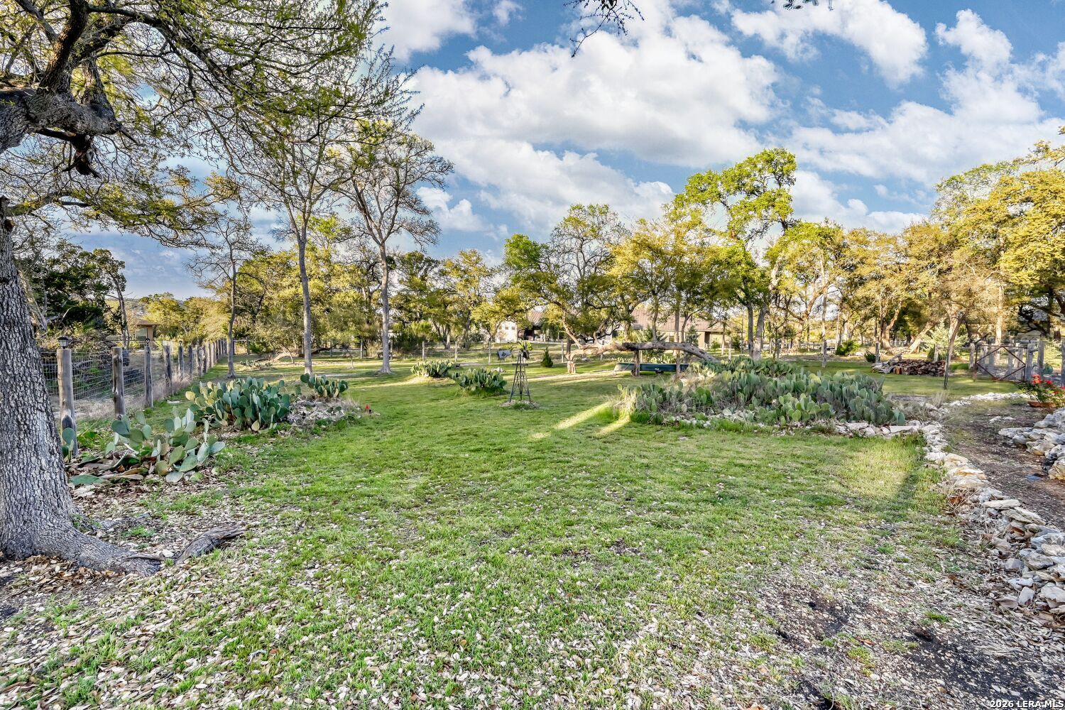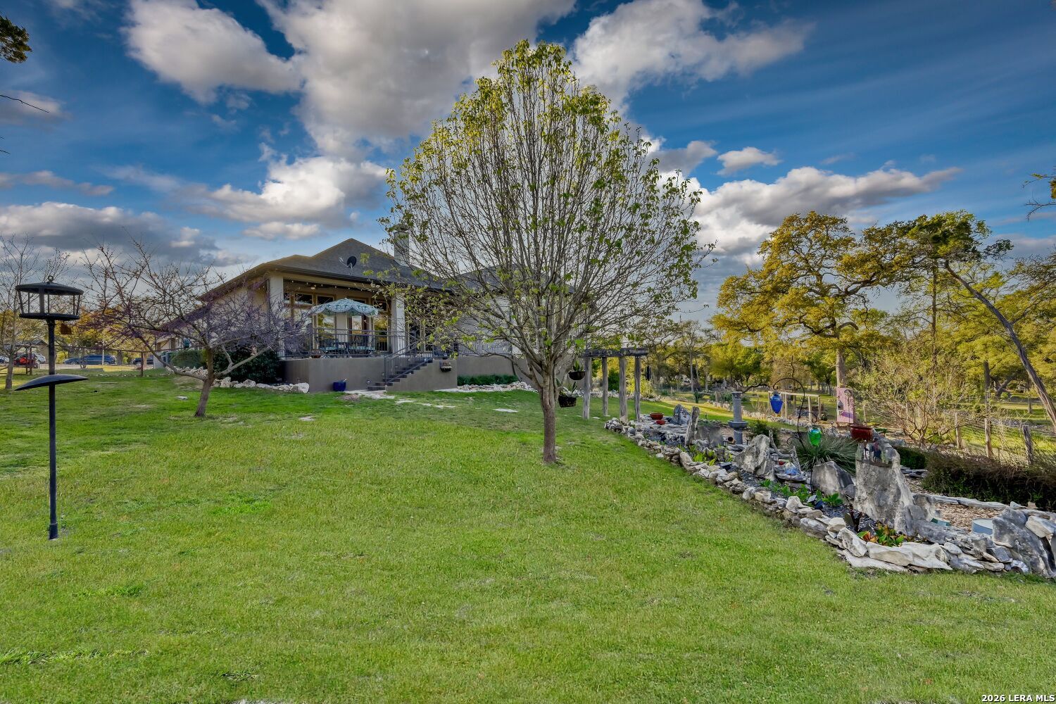 A single story home in Vintage Oaks at The Vineyard rarely checks every box...and this one on a 1.07 acre lot checks them all. Built by Perry Homes and spanning 3,796 square feet, the four bedroom, three and a half bath floor plan manages that particular balance of scale and livability: generous enough so you can spread out, designed well enough that nothing feels wasted. Wood-look tile runs throughout the main living areas, grounding the space with a warmth that holds up to everyday life. Espresso-stained cabinetry anchors the kitchen, where gas cooking takes center stage and an electric option remains available for the buyer who prefers it. A reverse osmosis system and water softener handle what Hill Country water demands, while LED lighting on dimmer switches throughout the home lets you calibrate the mood from bright and functional to something much more relaxed. The dining room is a genuine standout. Its large windows frame a long Hill Country view that earns the room's size - this is a space built for dinner parties and Sunday mornings equally. The adjacent study offers the kind of quiet, dedicated workspace that remote professionals increasingly require without sacrificing it to a converted bedroom. The primary suite sits at the back of the house, where bay windows flood the space with natural light and give it a sense of extension beyond the room itself. Dual walk-in closets handle wardrobe demands without the usual compromise, while the spa-style bathroom features a large walk-in shower with a bench, a garden tub, and custom round mirrors that feel like luxury rather than something standard. This is a primary suite people tend to linger in. The gameroom adds the square footage that makes a home feel flexible - homework and gaming at one end of the house, quiet at the other. The laundry room includes a utility sink, and the three car garage brings its own level of high end finishout: epoxy floors, extra rear storage, and a portable generator that conveys with the home. Outside, the backyard has been designed with privacy and purpose. Ranch-style fencing defines space while xeriscaping in back reduces maintenance without sacrificing character. Mature pecan, peach, and apple trees - along with pomegranate bushes - give the lot an established feel that takes years to grow. A fire pit creates a natural gathering spot when the evenings turn cool. Propane hookup on the patio means the grill is always ready, and the golf cart included with the sale makes exploring the broader Vintage Oaks community that much easier. Front and rear irrigation systems keep the established landscaping looking exactly as intended. This is a home that was set up thoughtfully...security system, water treatment, a generator, fruit trees...by owners who weren't planning to leave things to chance.