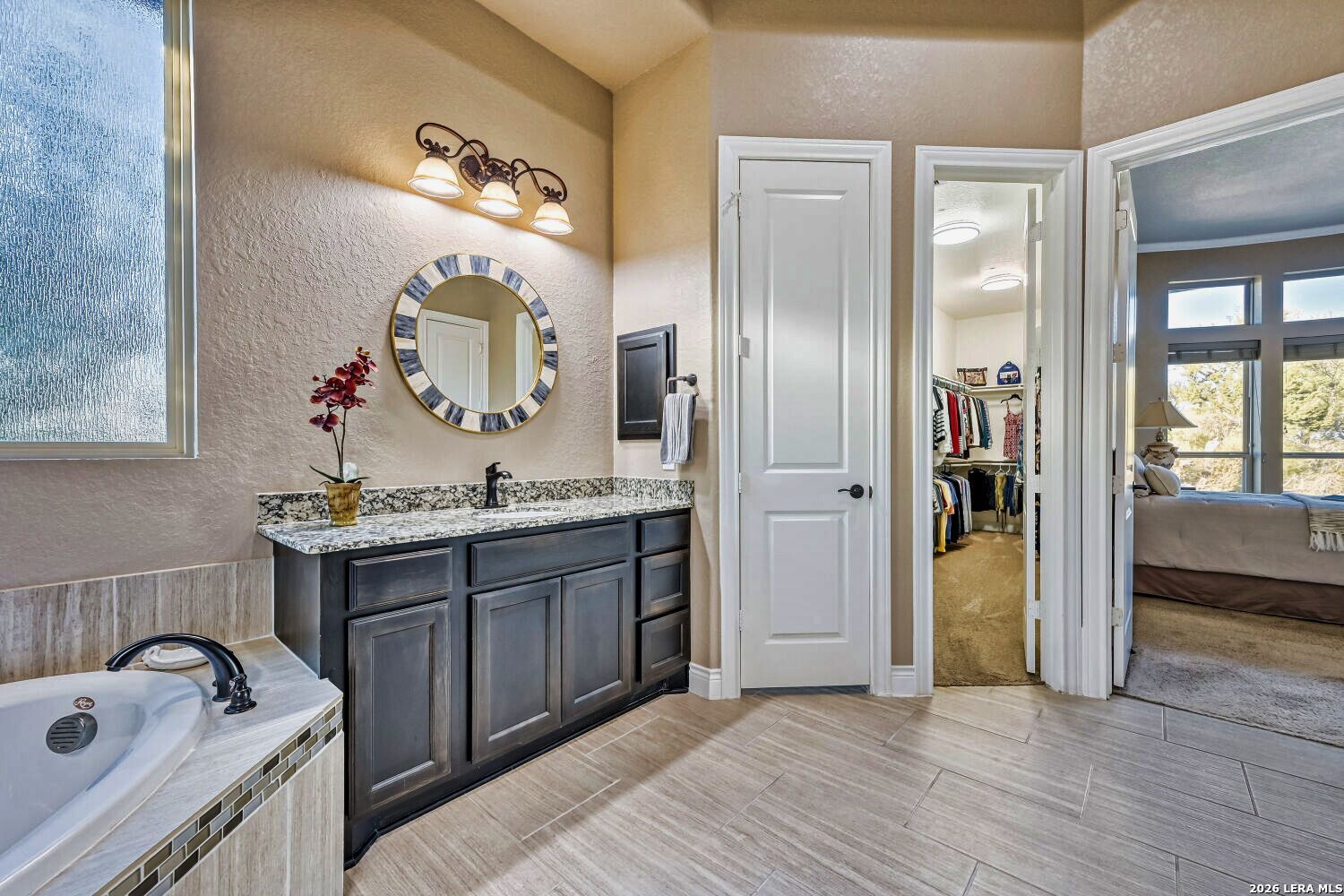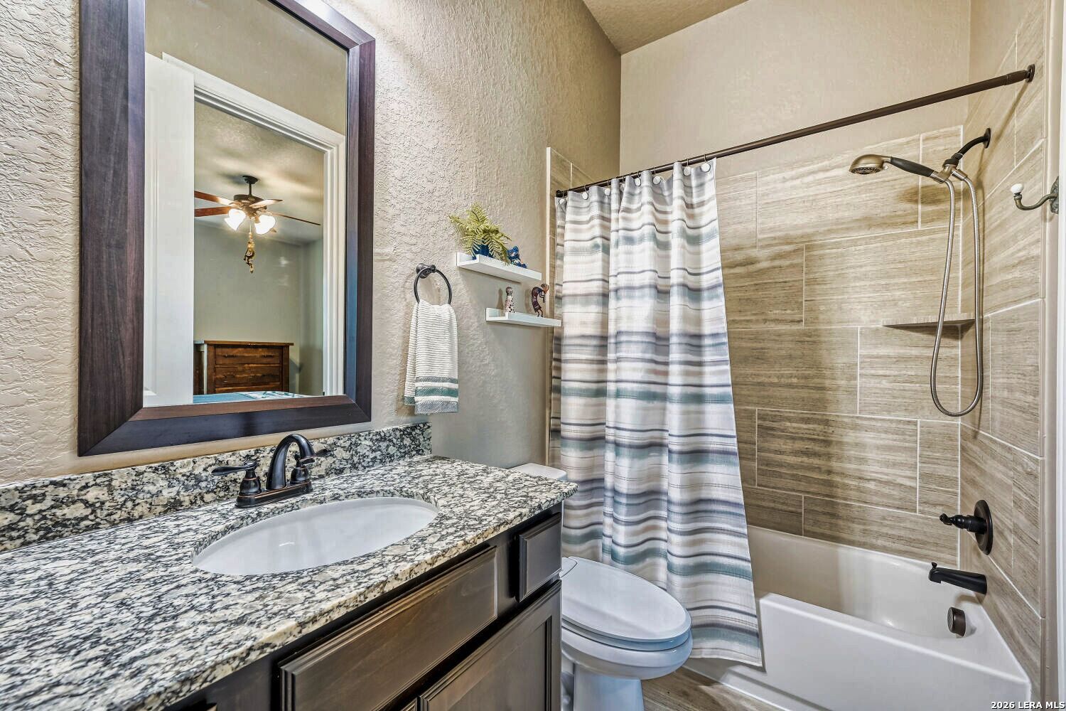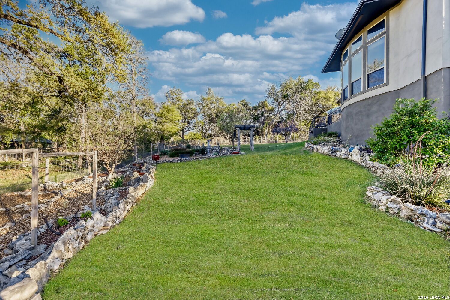 A single story home in Vintage Oaks at The Vineyard rarely checks every box...and this one on a 1.07 acre lot checks them all. Built by Perry Homes and spanning 3,796 square feet, the four bedroom, three and a half bath floor plan manages that particular balance of scale and livability: generous enough so you can spread out, designed well enough that nothing feels wasted. Wood-look tile runs throughout the main living areas, grounding the space with a warmth that holds up to everyday life. Espresso-stained cabinetry anchors the kitchen, where gas cooking takes center stage and an electric option remains available for the buyer who prefers it. A reverse osmosis system and water softener handle what Hill Country water demands, while LED lighting on dimmer switches throughout the home lets you calibrate the mood from bright and functional to something much more relaxed. The dining room is a genuine standout. Its large windows frame a long Hill Country view that earns the room's size - this is a space built for dinner parties and Sunday mornings equally. The adjacent study offers the kind of quiet, dedicated workspace that remote professionals increasingly require without sacrificing it to a converted bedroom. The primary suite sits at the back of the house, where bay windows flood the space with natural light and give it a sense of extension beyond the room itself. Dual walk-in closets handle wardrobe demands without the usual compromise, while the spa-style bathroom features a large walk-in shower with a bench, a garden tub, and custom round mirrors that feel like luxury rather than something standard. This is a primary suite people tend to linger in. The gameroom adds the square footage that makes a home feel flexible - homework and gaming at one end of the house, quiet at the other. The laundry room includes a utility sink, and the three car garage brings its own level of high end finishout: epoxy floors, extra rear storage, and a portable generator that conveys with the home. Outside, the backyard has been designed with privacy and purpose. Ranch-style fencing defines space while xeriscaping in back reduces maintenance without sacrificing character. Mature pecan, peach, and apple trees - along with pomegranate bushes - give the lot an established feel that takes years to grow. A fire pit creates a natural gathering spot when the evenings turn cool. Propane hookup on the patio means the grill is always ready, and the golf cart included with the sale makes exploring the broader Vintage Oaks community that much easier. Front and rear irrigation systems keep the established landscaping looking exactly as intended. This is a home that was set up thoughtfully...security system, water treatment, a generator, fruit trees...by owners who weren't planning to leave things to chance.