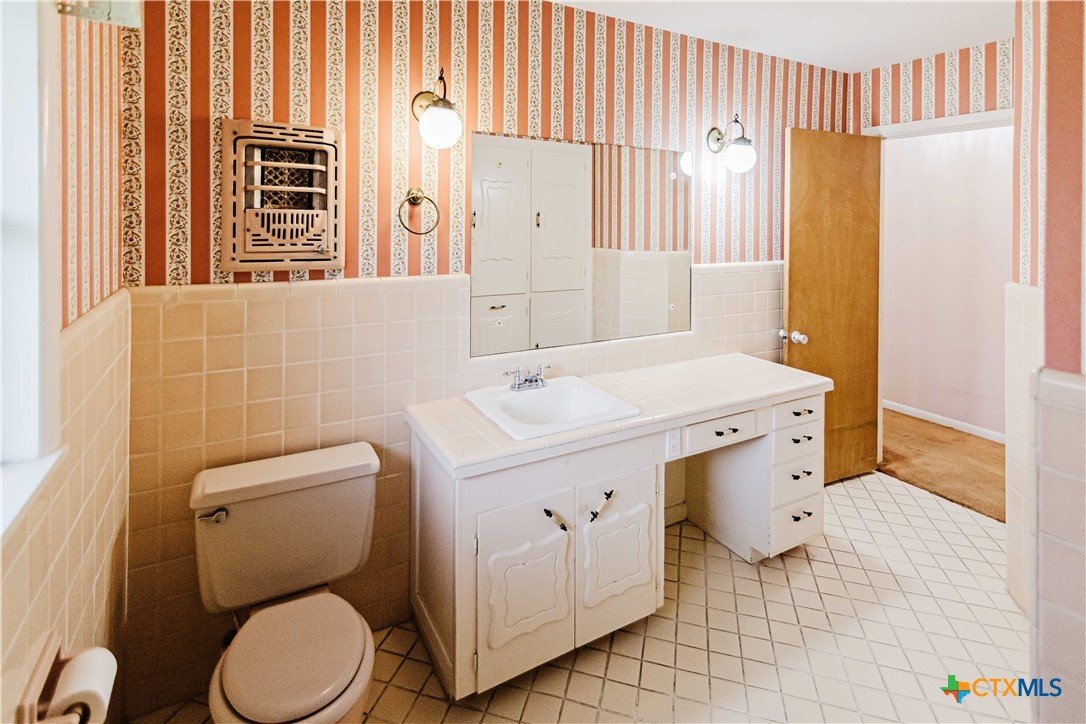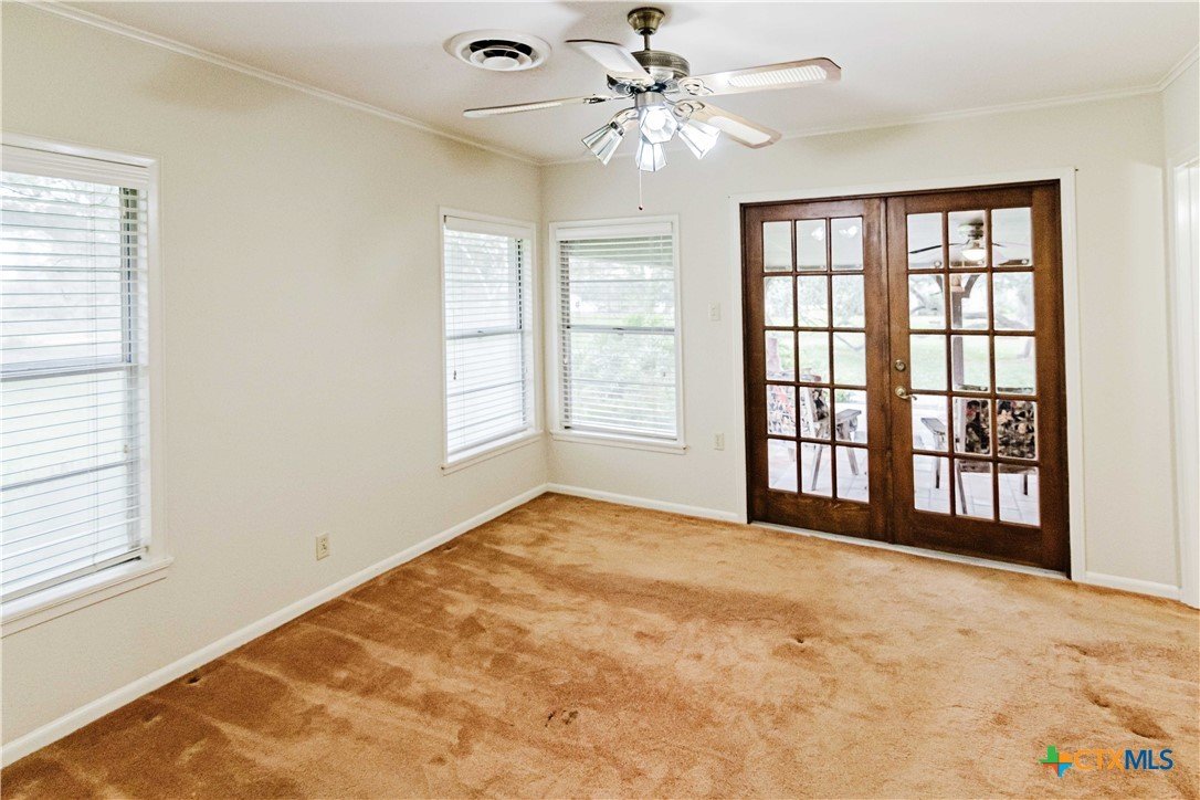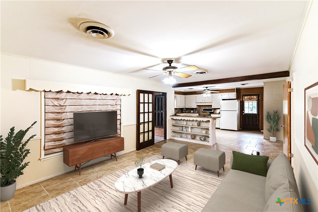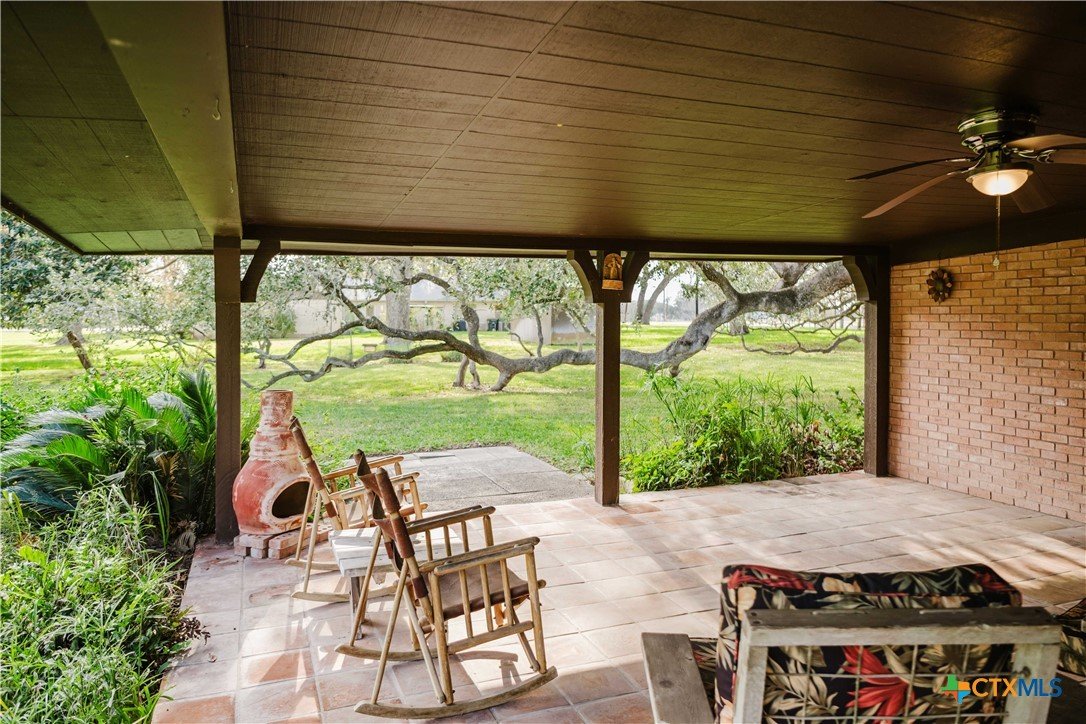 This beautifully maintained brick home sits on a spacious, landscaped lot that includes a variety of mature trees, including stunning heritage oak trees. The front lawn is thoughtfully built up to create a level, manicured appearance, and the front walkway adds exceptional curb appeal. The property is equipped with an irrigation system and a private water well. The backyard features a covered patio with tile flooring, offering a comfortable outdoor retreat with direct access to both the game room and a bedroom. Inside, the kitchen boasts ample granite counter space, tile backsplash and flooring, and abundant cabinetry. The kitchen opens to the main living area for easy, everyday living. Two of the three bedrooms share a Jack-and-Jill bathroom, while both bathrooms showcase original tile that highlights the home’s charming vintage character. A spacious game room provides plenty of area for a pool table and seating, creating an ideal space for entertaining guests. Conveniently located near Cuero Country Club and Cuero Municipal Golf Course, this home offers classic charm, generous living space, and a highly desirable location.