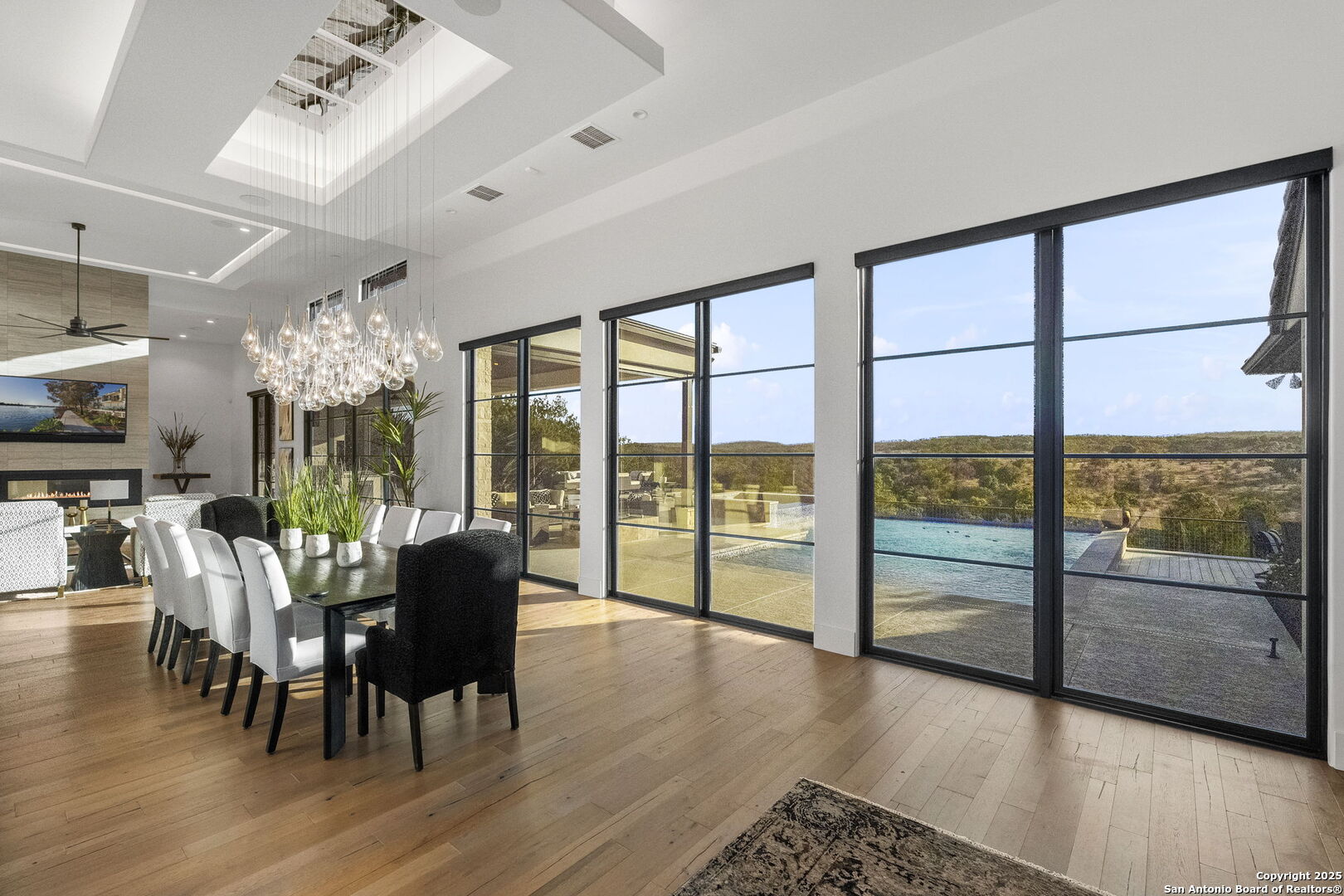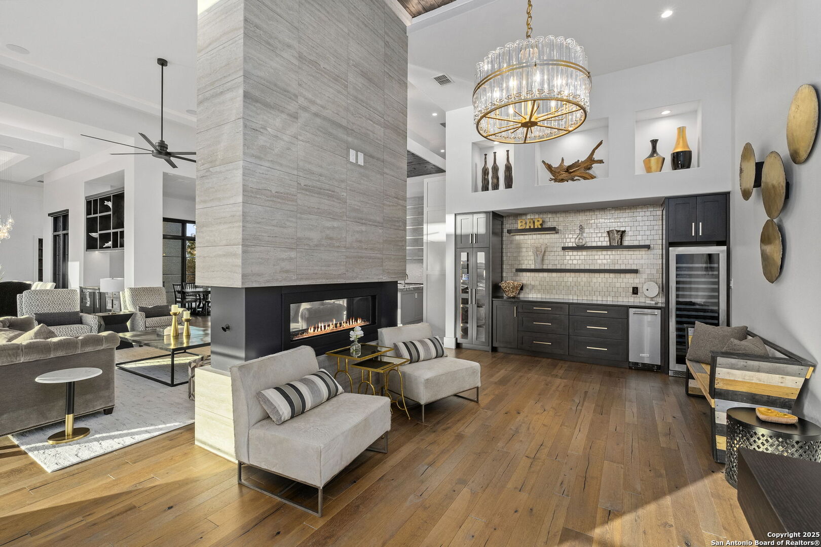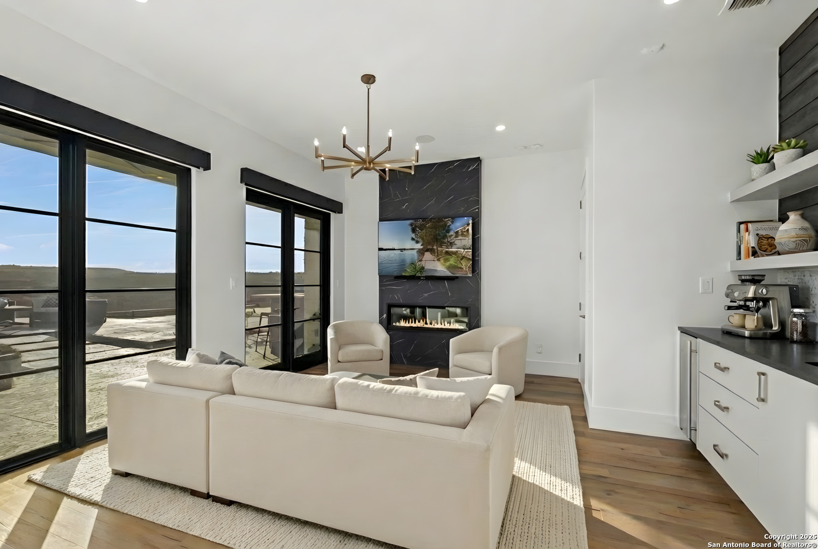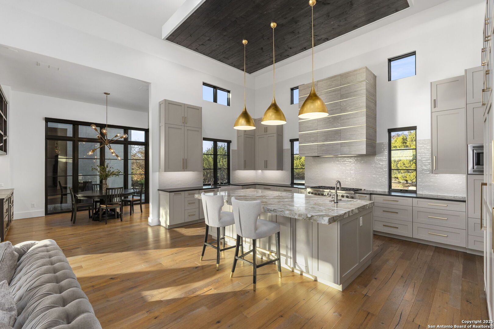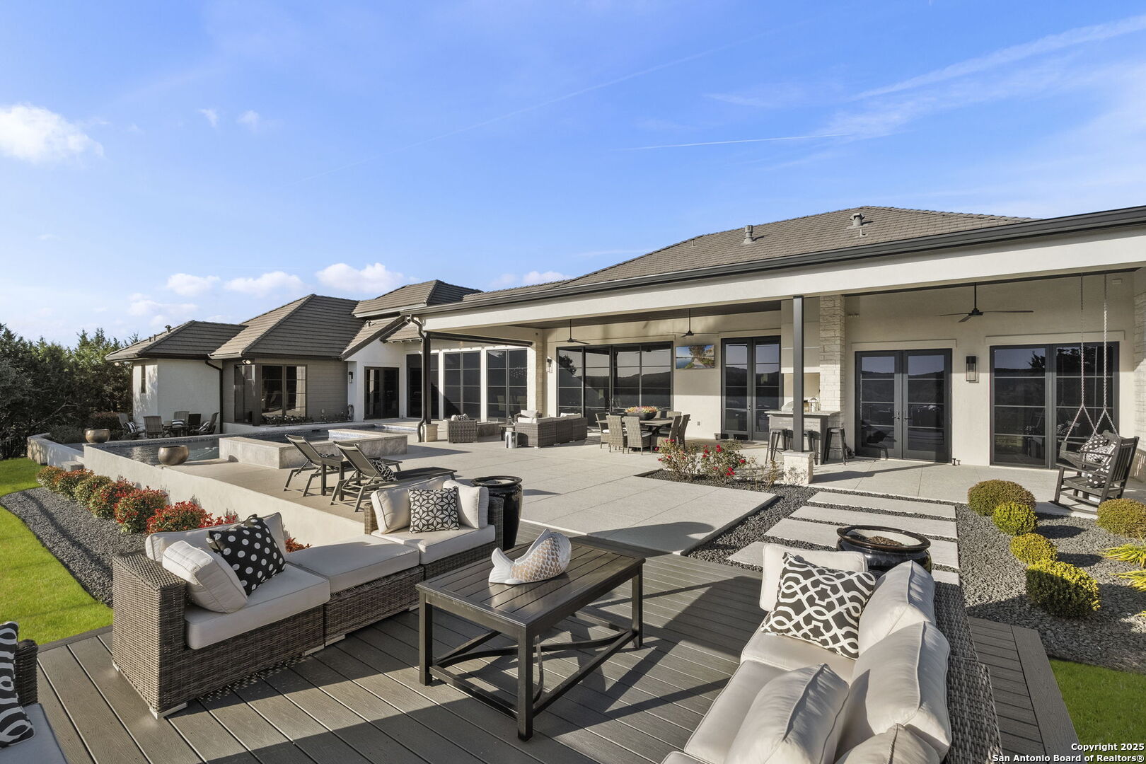 Tucked behind private gates in the prestigious Cordillera Ranch community, this extraordinary Hill Country estate is more than just a home, it's a lifestyle and the one you want. Designed and built by award-winning Garner Homes, every inch of this property was crafted to elevate your everyday experience with comfort, style, and sweeping views that remind you why you chose the Texas Hill Country. From the moment you enter the private gate and wind up the drive, the property greets you with warmth and grandeur. Inside, natural light floods through walls of windows, highlighting a thoughtfully designed open concept floor plan that effortlessly connects each space. At the heart of the home, a stunning double sided stone fireplace anchors the main living room and cozy sitting area, adjacent to a full entertainer's bar complete with custom cabinetry, granite countertops, wine fridge, and ice maker. The formal dining room connects seamlessly to the gourmet kitchen and is featuring Thermador appliances, double ovens, expansive center island, custom cabinetry, and a walk-in pantry with space for a second fridge. A built-in butler's pass through subtly separates the formal and casual dining areas, making hosting feel effortless. The spacious primary suite is your private retreat, complete with its own fireplace, sitting area, flex room (ideal for a home gym or office), and beverage bar. Dual walk-in closets connect conveniently to the main laundry room with custom cabinetry and workspace. The spa-inspired bath includes a large walk-in glass shower, soaking tub, and separate vanities. Across the home, a secondary living space ensures privacy for guests, flanked by three spacious bedrooms with en-suite baths and a second laundry area. Upstairs, a whimsical loft with built-in bunk beds and a half bath is the perfect hideaway for children or visiting grandchildren. Step outside to discover why this property is truly one of a kind: a sprawling covered patio with outdoor fireplace, grill, multiple dining and lounge spaces, and a dazzling infinity edge pool and spa. Every inch of the backyard overlooks the rolling Hill Country, offering a peaceful escape just minutes from Boerne and San Antonio. The details continue beyond the interior: 3 car garage with built-in workshop bay, Dog run with interior access via pet-friendly laundry setup, Smart layout for pet isolation without limiting yard access, Flexibility for multi-generational living, Fully furnished and designer-decorated so that you can move in and enjoy from Day One! Whether you're seeking a peaceful escape, a home to entertain, or a forever residence with room to grow, 121 Greystone Point delivers again and again. Home sale is being offered fully furnished.