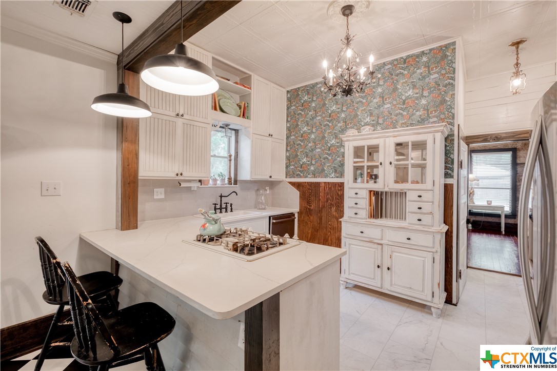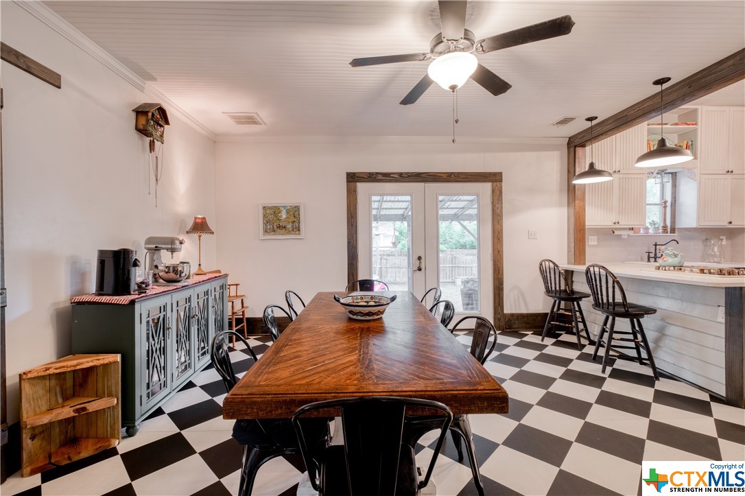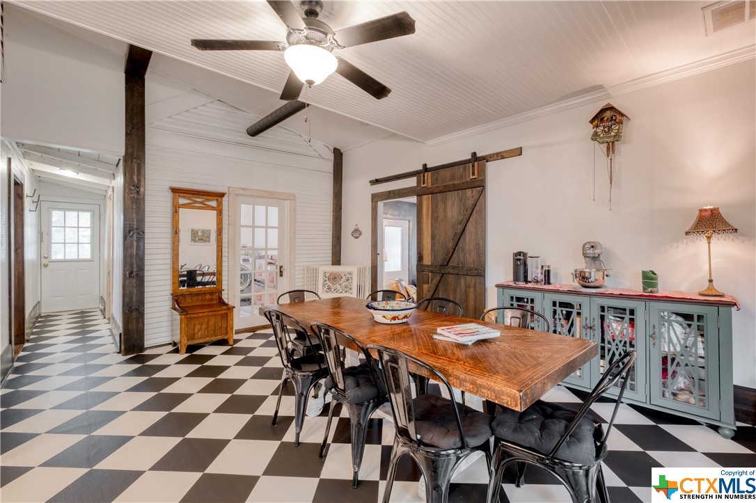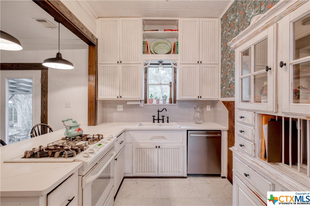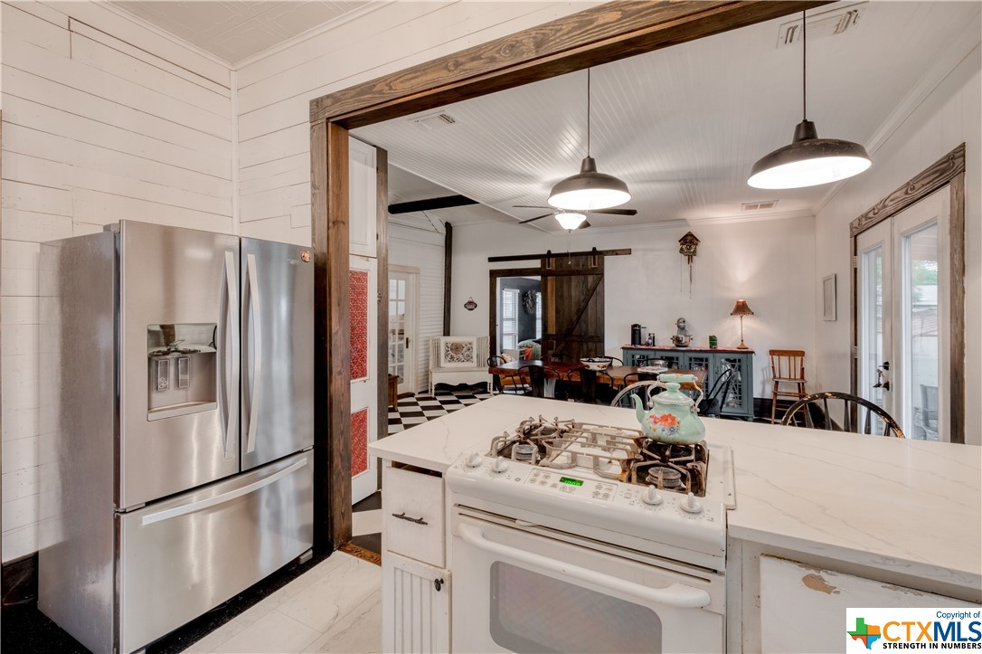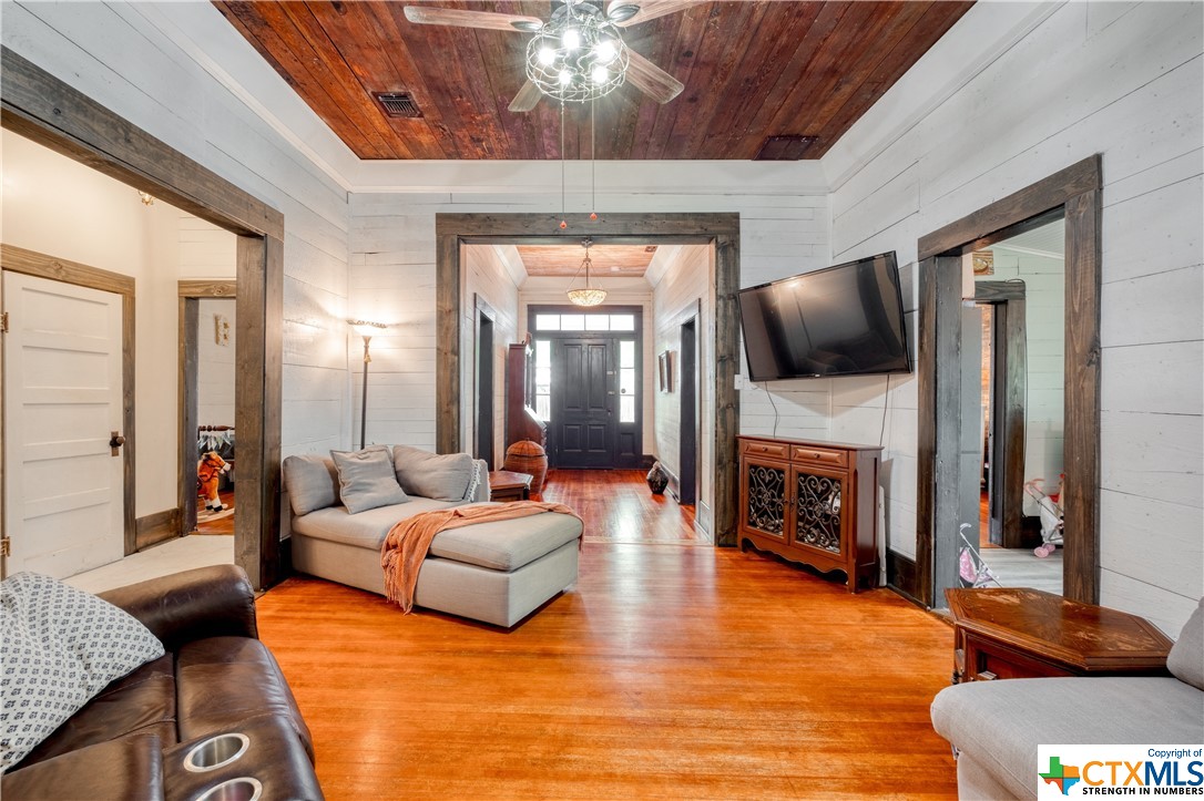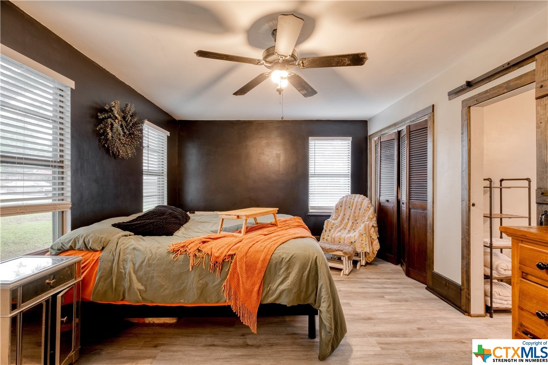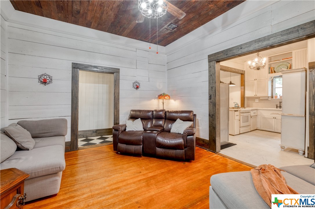 Restored home with Farmhouse charm! Original hardwood floors and shiplap walls throughout this home! Updated spacious kitchen that is open to dining. Gas cooktop! High ceilings and spacious rooms! Unique touches throughout. Beautiful walk in shower in primary bathroom. Clawfoot tub in guest bathroom! Custom barn doors! Four Bedrooms and 2 full baths! Spacious laundry room! Located on a large, corner lot which is .48 of an acre! Covered patio and detached carport! Privacy fenced back yard! Beautiful, mature pecan trees! Luling is a great commute to Austin or San Antonio!