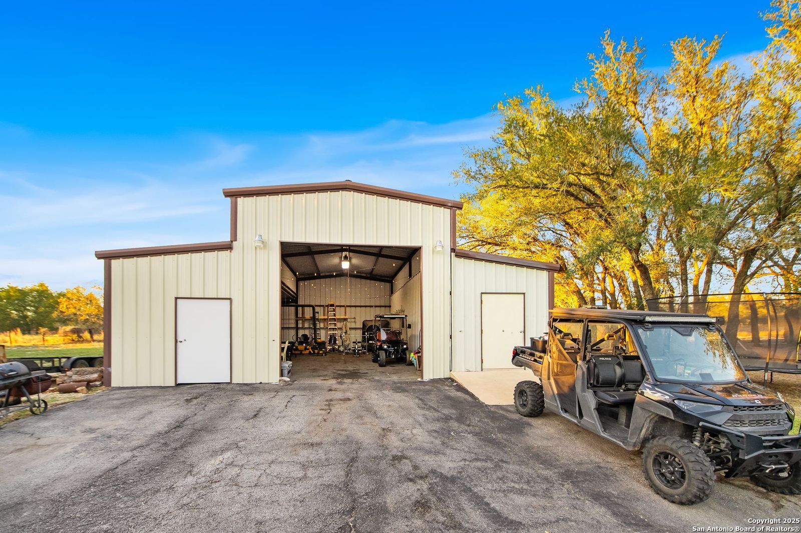 Enjoy peaceful country living on 2 acres in Floresville, TX. This well-maintained 3-bedroom, 2-bath home offers a split floorplan with the primary suite privately situated on one side of the home. The master retreat features a spacious walk-in closet and a full private bath. Two large secondary bedrooms sit on the opposite side, ideal for family, guests, or a home office setup. The home includes a bright breakfast nook, a dedicated dining room, and an inside laundry room with a walk-in pantry-providing excellent storage and everyday convenience. Outside, the property features an electric gated entry, paved driveway, asphalt parking, and covered porches in both the front and back. The backyard includes a sprinkler system for easy maintenance. A standout feature is the impressive 50x40 metal building, offering ample space for RVs, boats, or workshop activities and is climate-controlled with two mini-splits providing both heating and cooling. The shop includes a separate 12x40 storage area. Conveniently located just off Hwy 775 and 181.