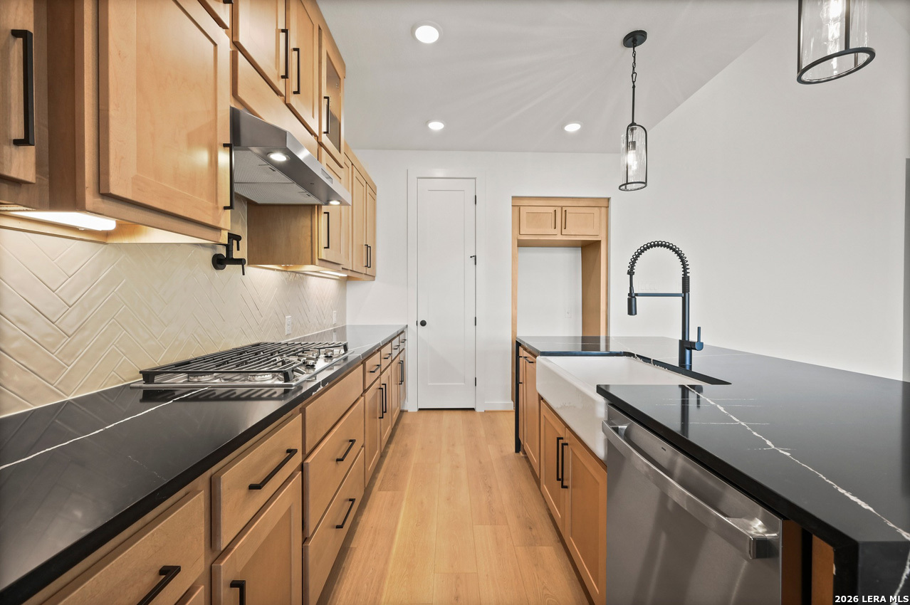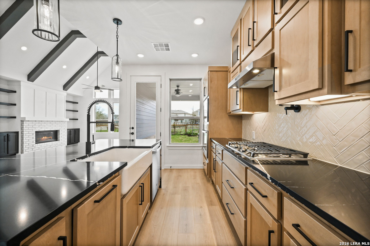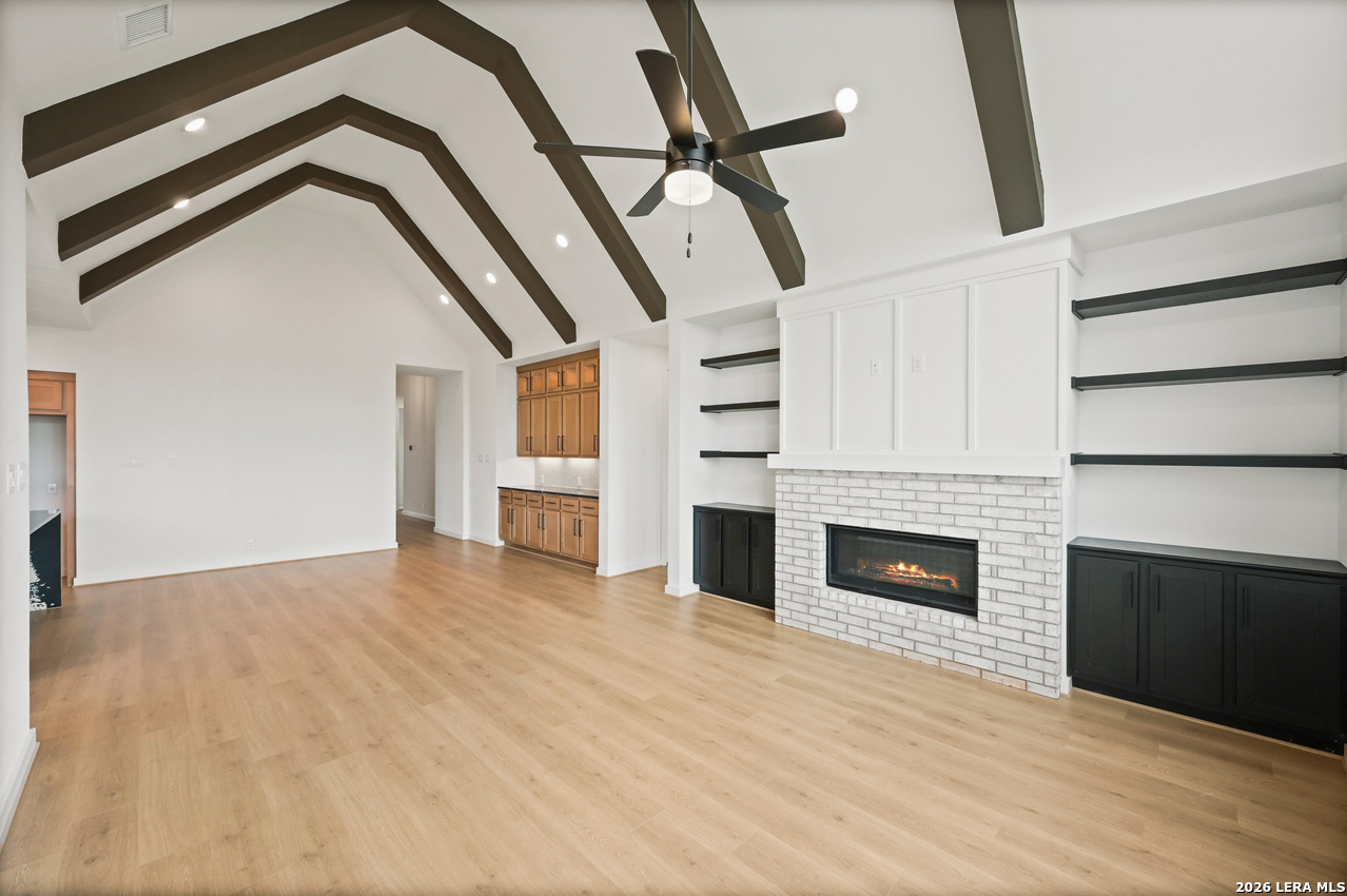 Single-story home featuring 3 bedrooms, 2.5 baths, gameroom/flex room and dedicated study. Vaulted ceilings with exposed beams, custom cabinetry throughout, and wood flooring. Backs to a permanent community greenbelts.