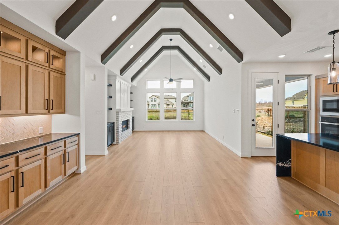 Single-story home featuring 3 bedrooms, 2.5 baths, gameroom/flex room and dedicated study. Vaulted ceilings with exposed beams, custom cabinetry throughout, and wood flooring. Backs to a permanent community greenbelts.