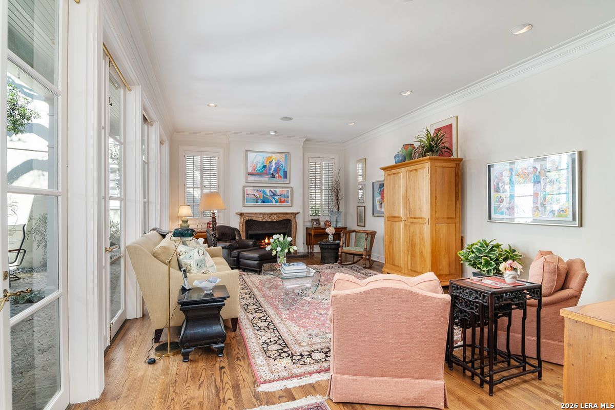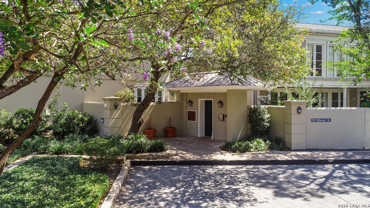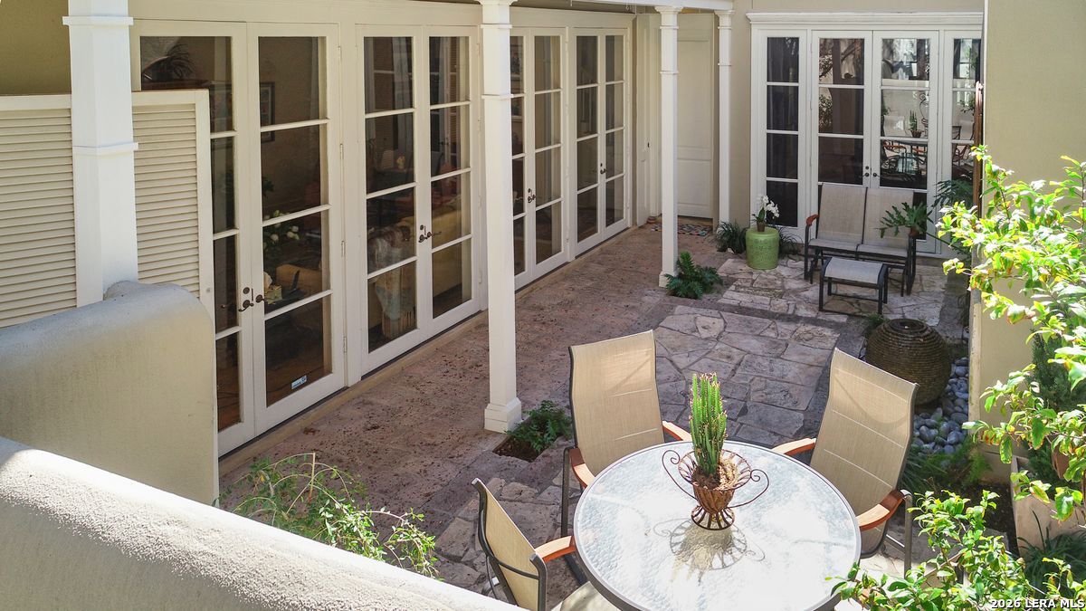 Rarely available and quietly tucked within an intimate enclave of just eight residences in the heart of Alamo Heights, this elegant condominium offers a level of charm and privacy seldom found in San Antonio. The boutique complex evokes the timeless ambiance of the French Quarter's Vieux Carre blended with the relaxed elegance of Bermuda, creating a setting that feels worlds away while remaining close to everything. Inside, soaring 14-foot ceilings with detailed mouldings create a dramatic sense of space throughout the main living areas. Custom French glass doors from both the living and dining rooms open to a private entry courtyard with a fountain, offering a beautiful indoor-outdoor flow and a serene backdrop for entertaining or unwinding at the end of the day. The owner's suite is designed as a true retreat, featuring its own private balcony along with generous his-and-her baths and spacious closets. A coffee bar and custom library shelving add thoughtful luxury touches that elevate daily living. Practical comforts are equally well considered, including a private two-car garage with direct access into the kitchen or entry for everyday ease. Residents also enjoy the tranquil complex pool set within the courtyard setting that gives this residence its distinctive character. With only eight homes in the community, opportunities to own in this charming enclave are exceptionally limited. For buyers seeking timeless design, privacy, and an effortless lock-and-leave lifestyle in coveted Alamo Heights, this is a rare offering.
