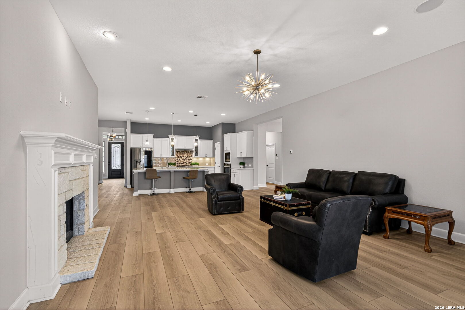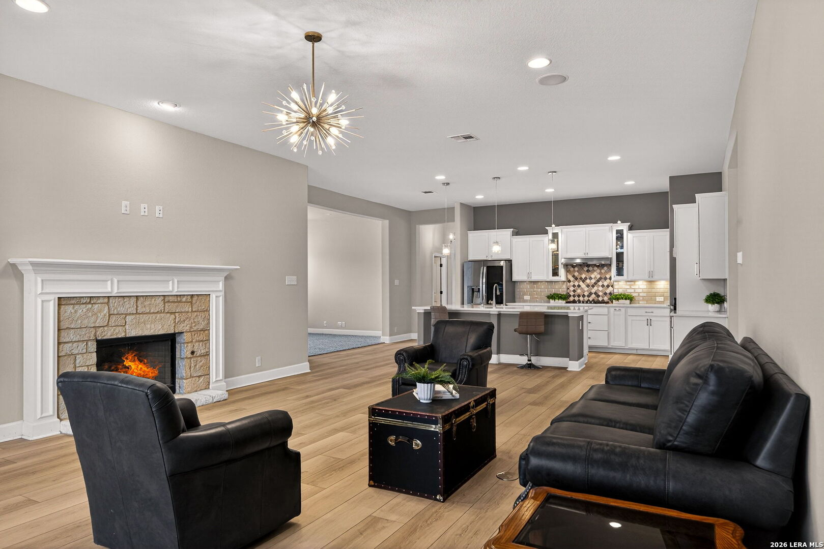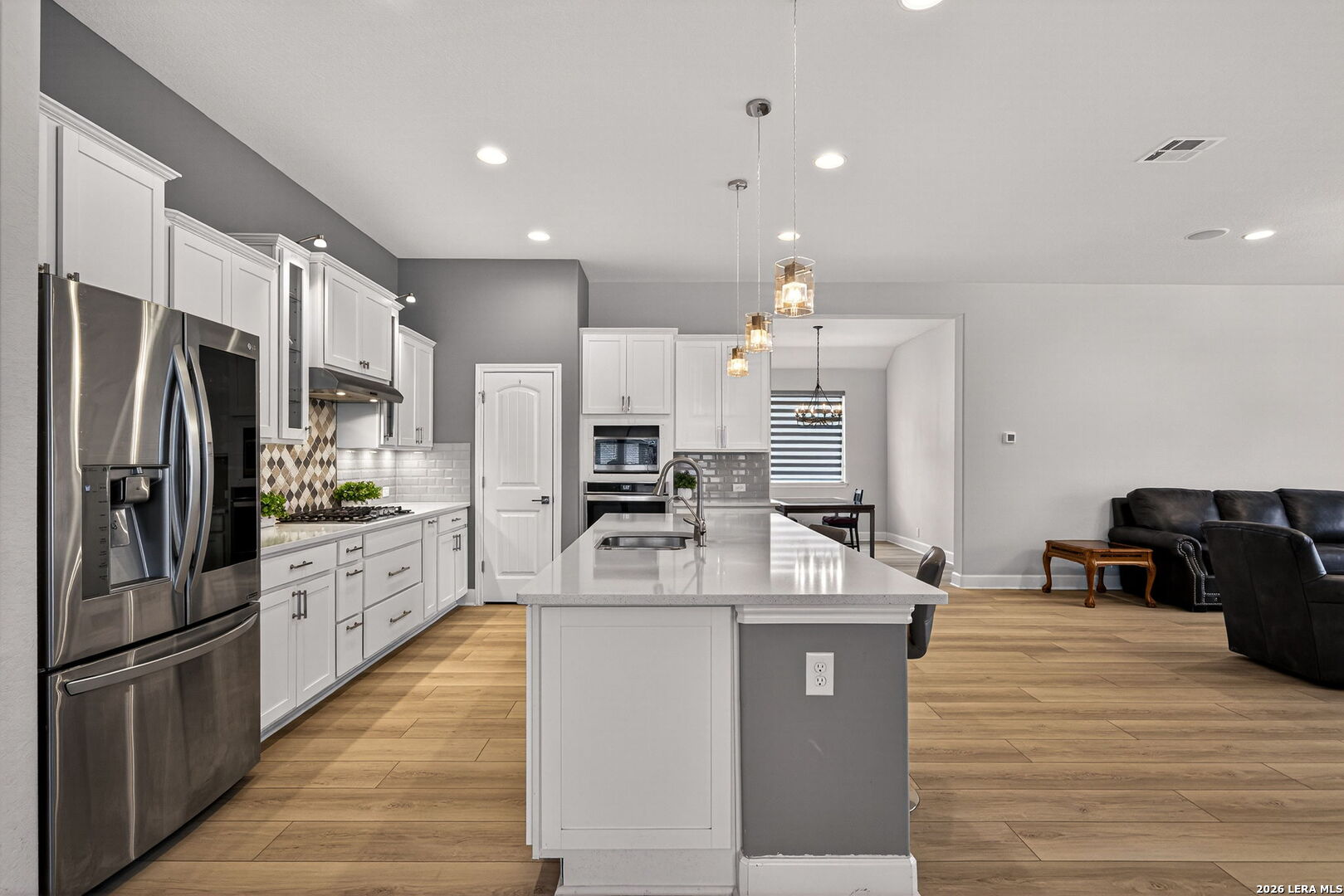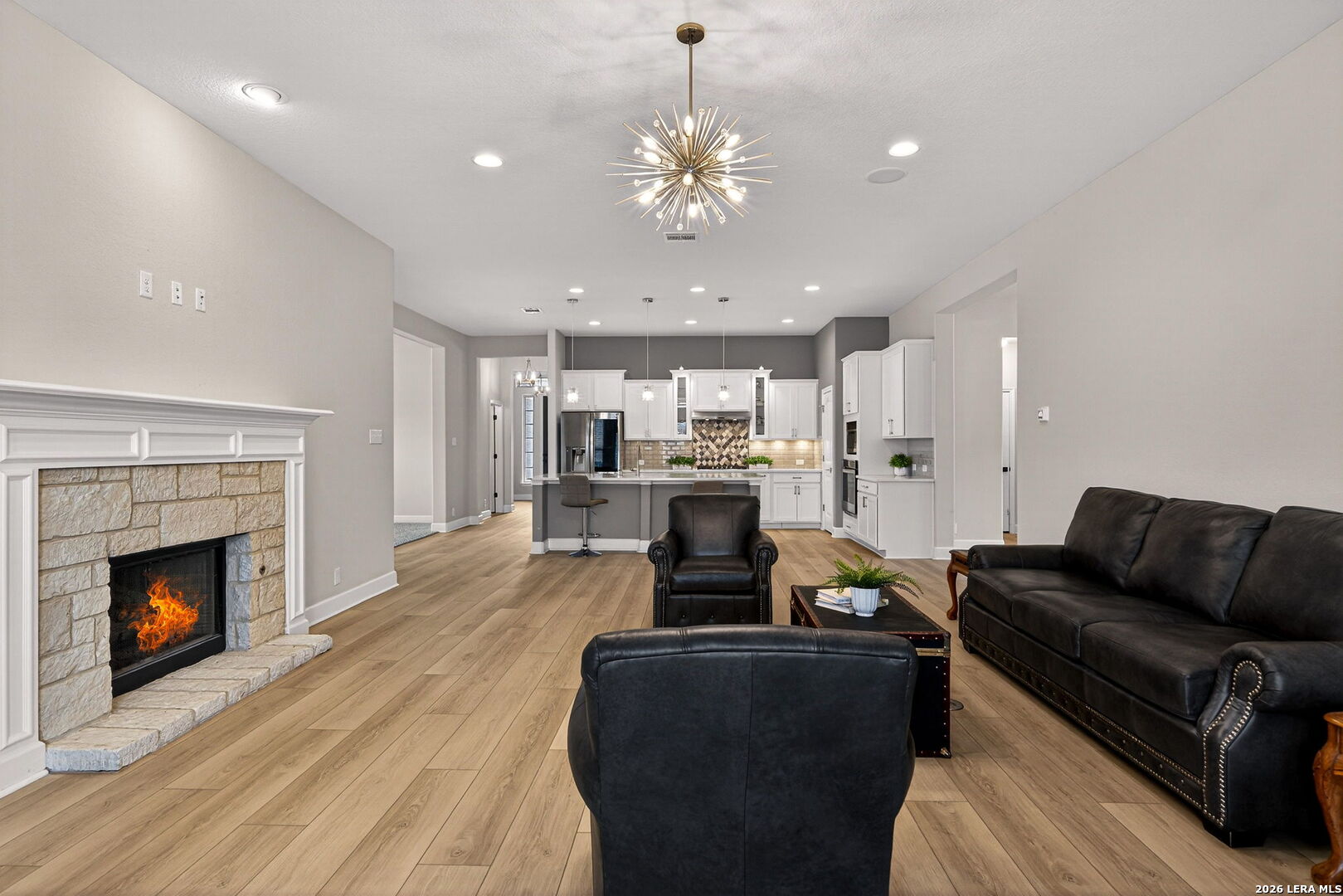 Welcome to 122 Noble Woods, an exquisitely upgraded Ashton Woods home nestled in a private, gated community within the award-winning Boerne ISD. Backing to a serene greenbelt, this stunning single-story residence offers the perfect blend of luxury, comfort, and functionality-all just minutes from the charm of historic Downtown Boerne and everyday conveniences along Highway 46. This thoughtfully designed home boasts an open-concept layout with wood-look tile flooring throughout, creating a seamless flow for everyday living and entertaining. The gourmet kitchen is a showstopper, featuring quartz countertops, under-cabinet lighting, reverse osmosis system, and sleek modern finishes. The spacious living area is pre-wired for 5.1 surround sound, and a flexible secondary living room-currently used as a media room-adds versatility to the space. With four bedrooms and three full baths, this home includes a desirable en suite guest bedroom, ideal for multi-generational living or hosting overnight visitors. The upgraded laundry room offers built-in cabinetry and a utility sink for added convenience. Step outside to a flat, generously sized backyard offering privacy and space-perfect for gatherings, play, or peaceful relaxation. Enjoy a covered patio, epoxy-finished garage floors, RV and generator outlets, and thoughtfully placed outdoor plugs for holiday lighting. Additional features include a Pelican whole-home water softening system, gutters, and full front and back irrigation system. Located just minutes from Boerne schools, H-E-B, shopping, and dining, this home offers both luxury and lifestyle in one of Boerne's most sought-after communities.