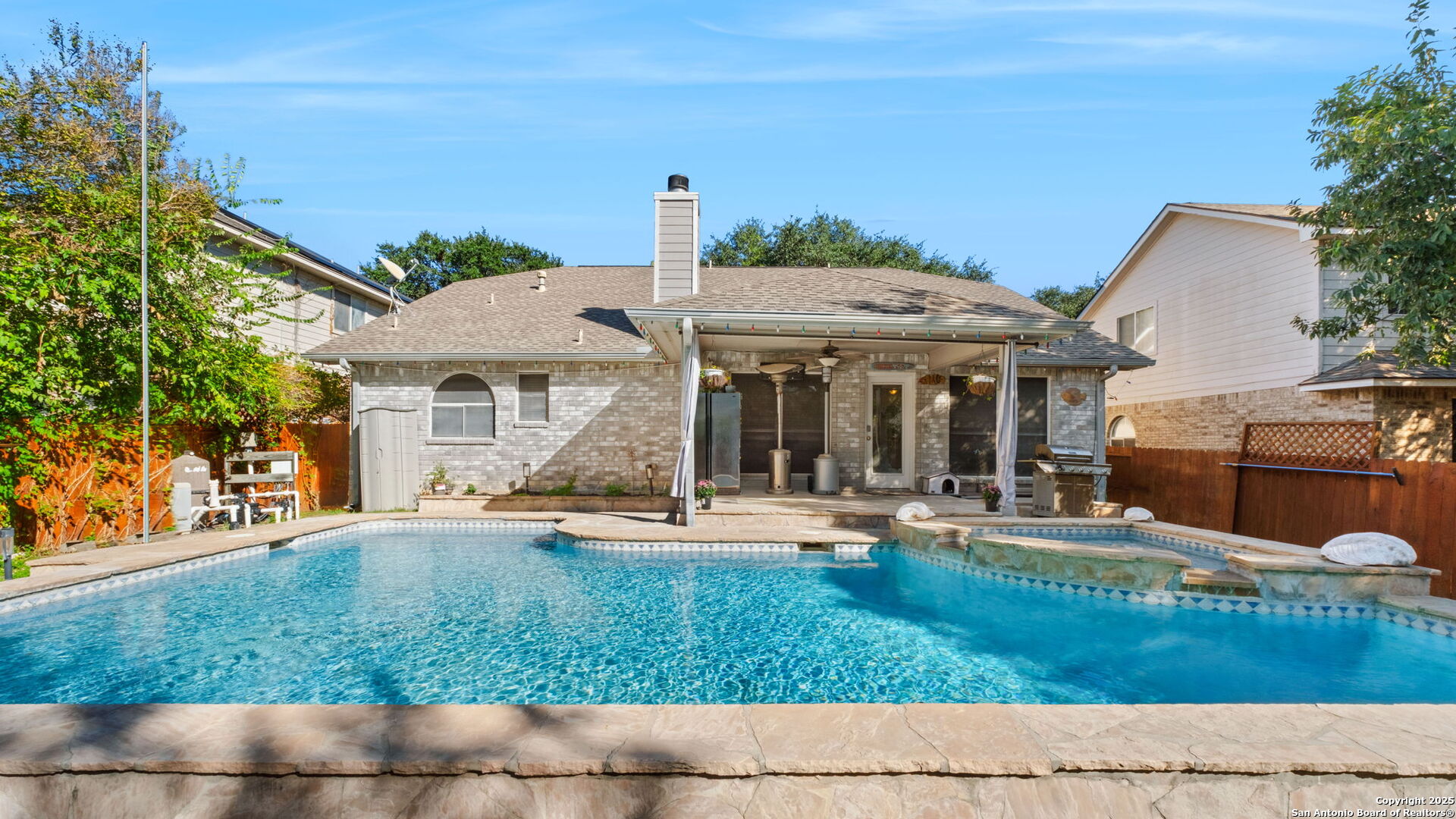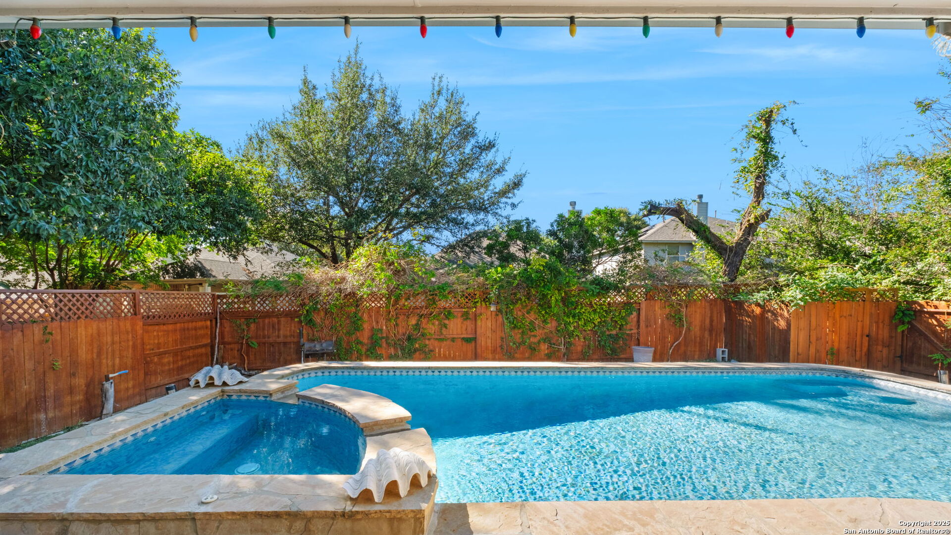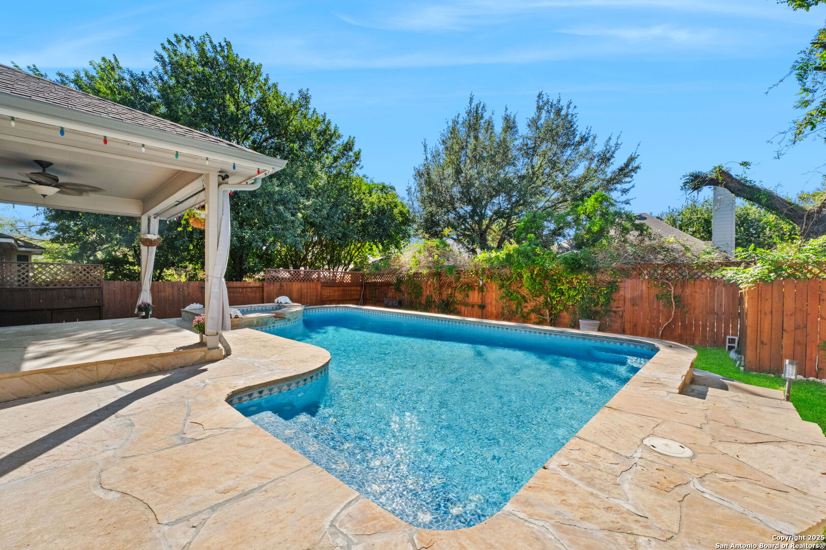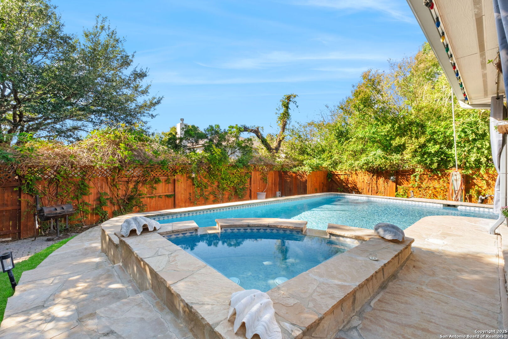 Located in the desirable Hart Ranch neighborhood, this well-maintained home features an open-concept floor plan with elegant design touches throughout. The spacious living room offers vaulted ceilings, a cozy fireplace, and architectural arch niches that add timeless character. The kitchen is equipped with quartz countertops, stainless steel appliances, and a breakfast bar that opens to the dining area, creating a seamless space for everyday living and entertaining. The primary suite is conveniently located downstairs and includes a walk-in closet, soaking tub, and separate shower. Upstairs offers a versatile loft area along with two additional bedrooms. Step outside to enjoy your private backyard retreat with a pool, hot tub, and covered stone patio surrounded by privacy walls. Additional highlights include a water softener, two-car garage, and downstairs laundry room. The neighborhood provides access to a community pool, basketball court, clubhouse, and playground, all within a community that features only one entrance and exit. Centrally located with easy access to I-10, this home offers a quick drive to the Medical Center, USAA, downtown San Antonio, and the La Cantera area.