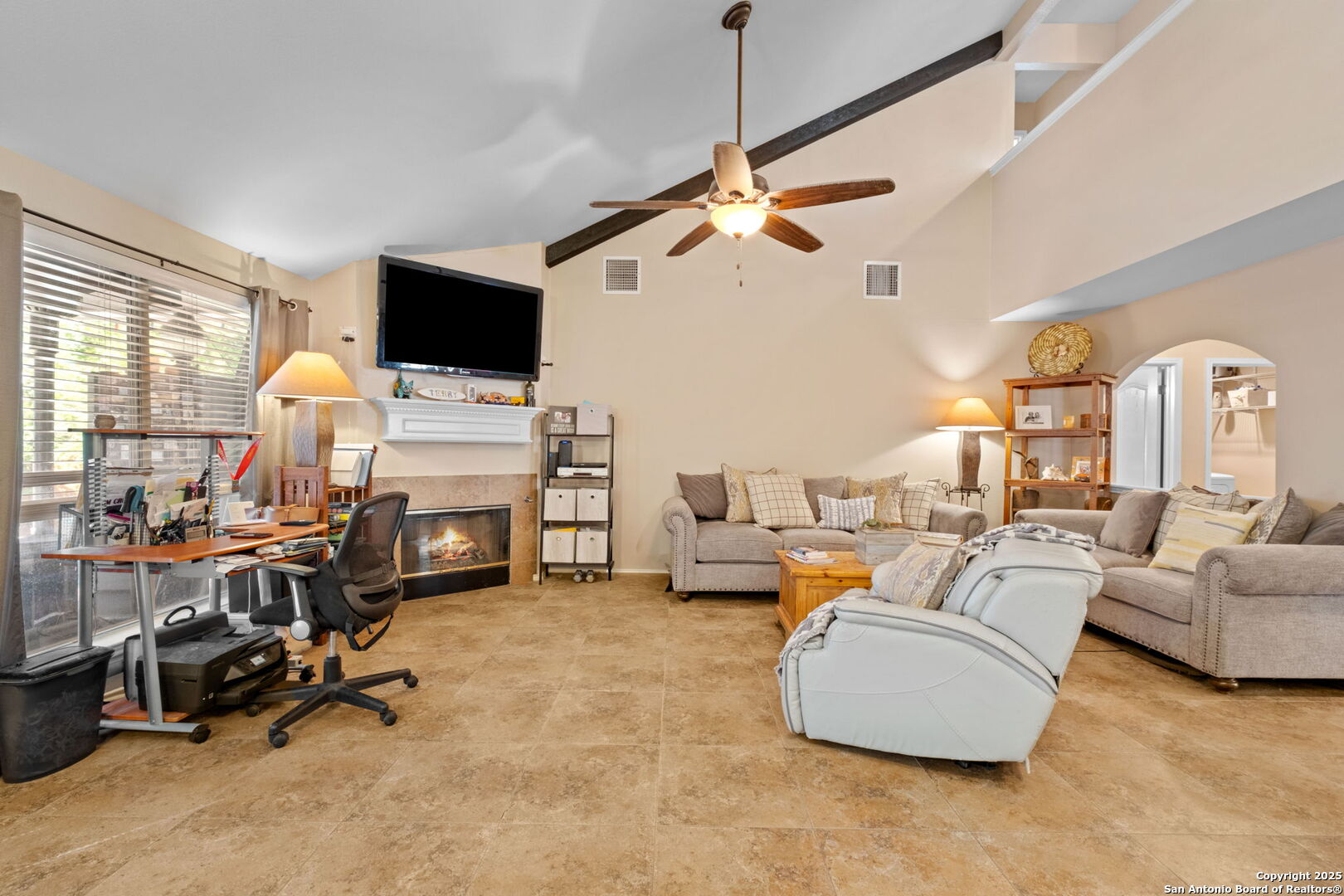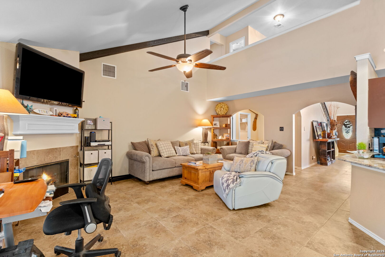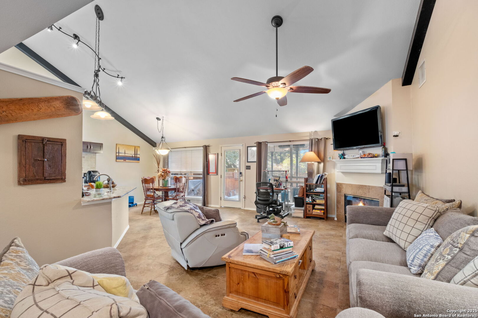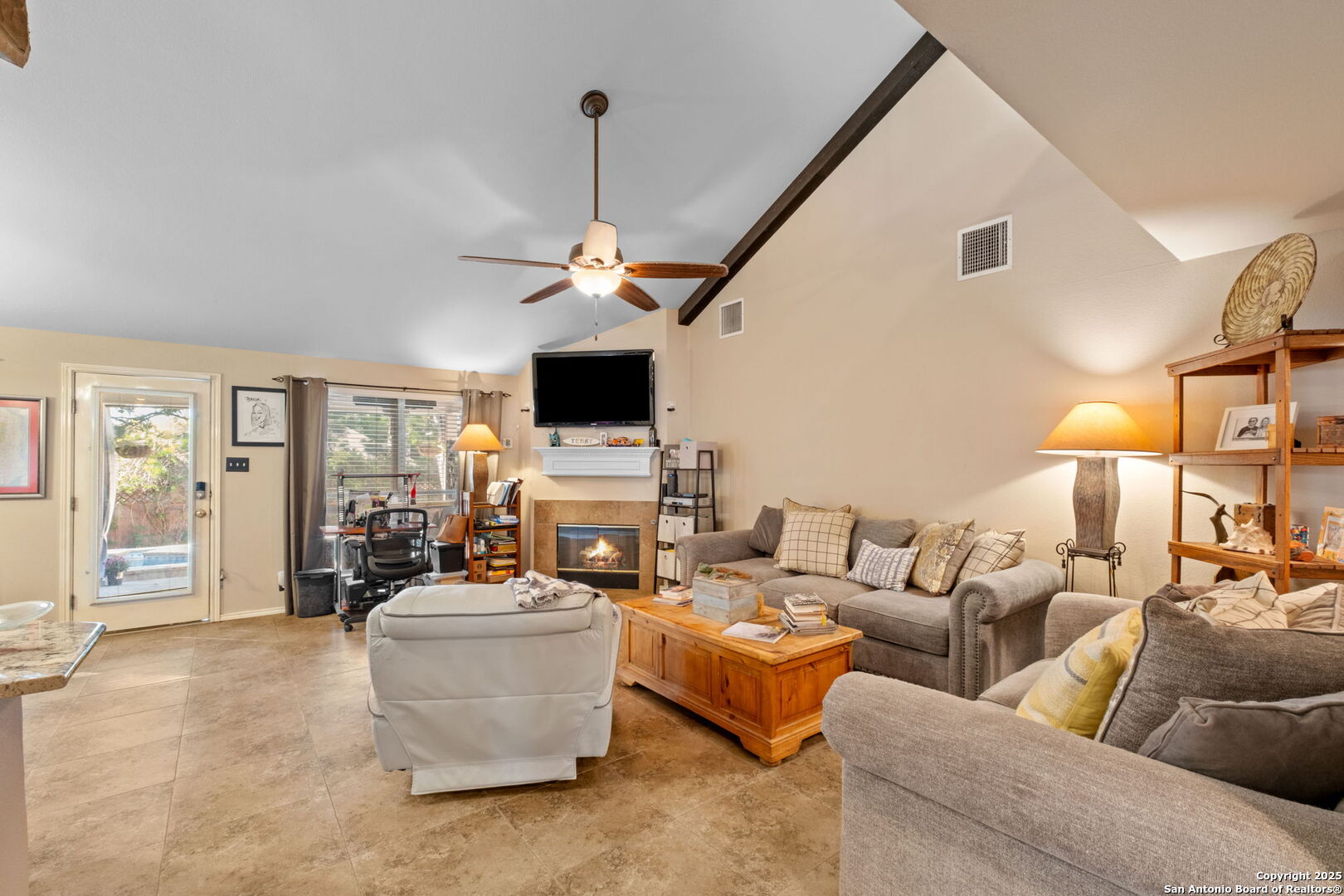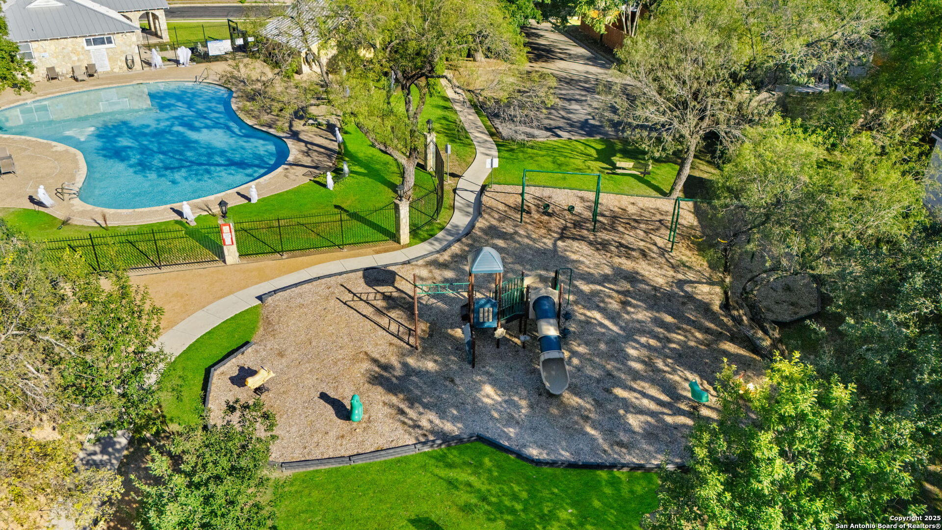 Located in the desirable Hart Ranch neighborhood, this well-maintained home features an open-concept floor plan with elegant design touches throughout. The spacious living room offers vaulted ceilings, a cozy fireplace, and architectural arch niches that add timeless character. The kitchen is equipped with quartz countertops, stainless steel appliances, and a breakfast bar that opens to the dining area, creating a seamless space for everyday living and entertaining. The primary suite is conveniently located downstairs and includes a walk-in closet, soaking tub, and separate shower. Upstairs offers a versatile loft area along with two additional bedrooms. Step outside to enjoy your private backyard retreat with a pool, hot tub, and covered stone patio surrounded by privacy walls. Additional highlights include a water softener, two-car garage, and downstairs laundry room. The neighborhood provides access to a community pool, basketball court, clubhouse, and playground, all within a community that features only one entrance and exit. Centrally located with easy access to I-10, this home offers a quick drive to the Medical Center, USAA, downtown San Antonio, and the La Cantera area.