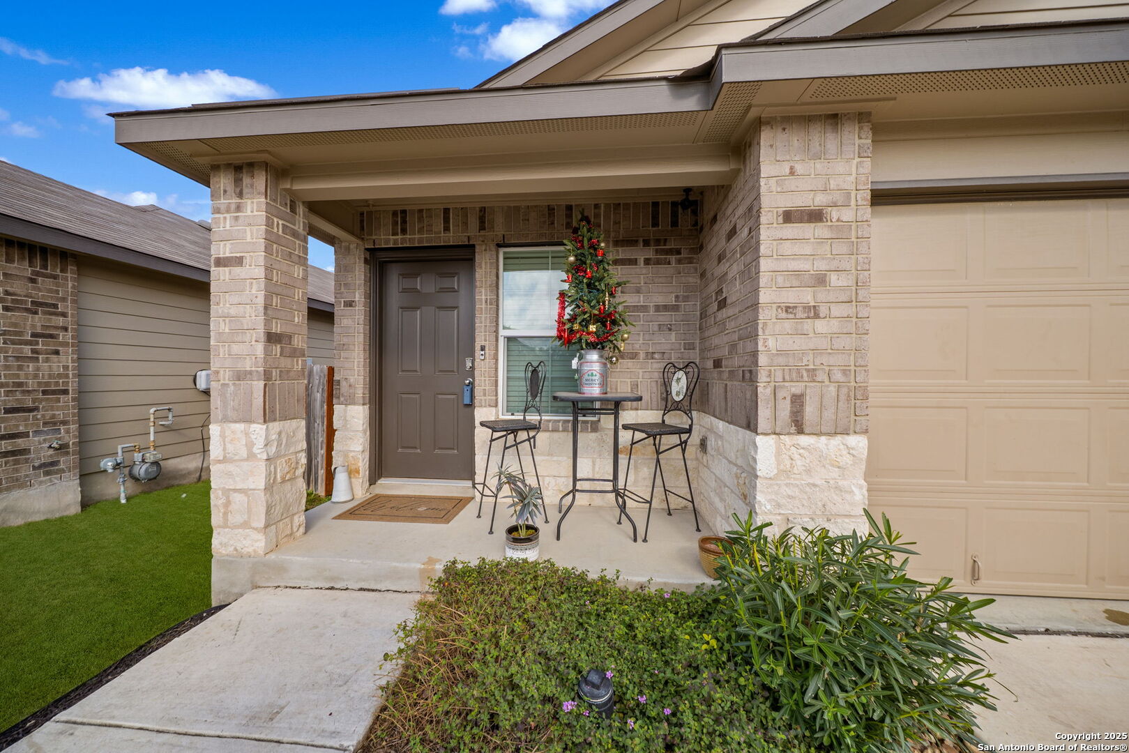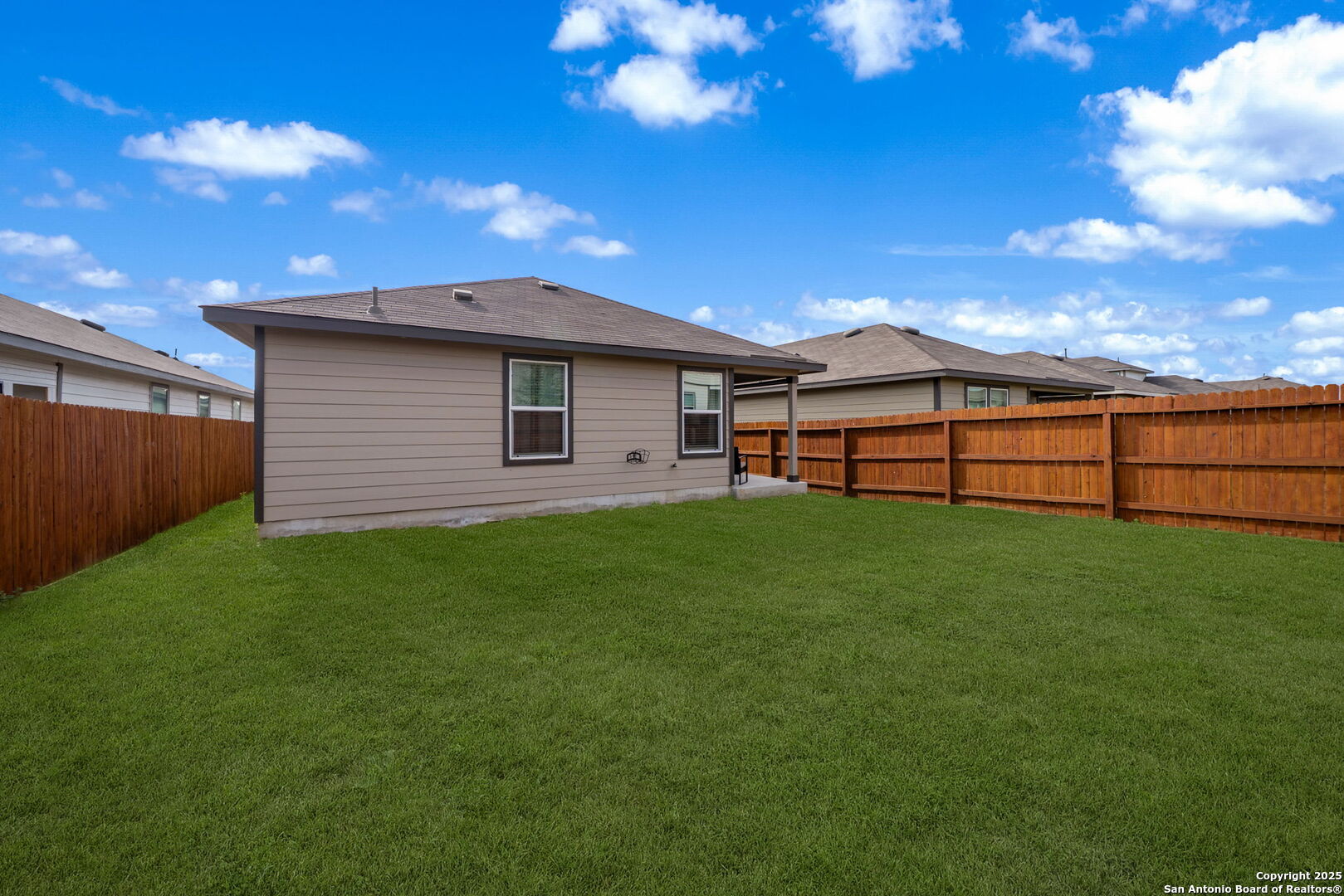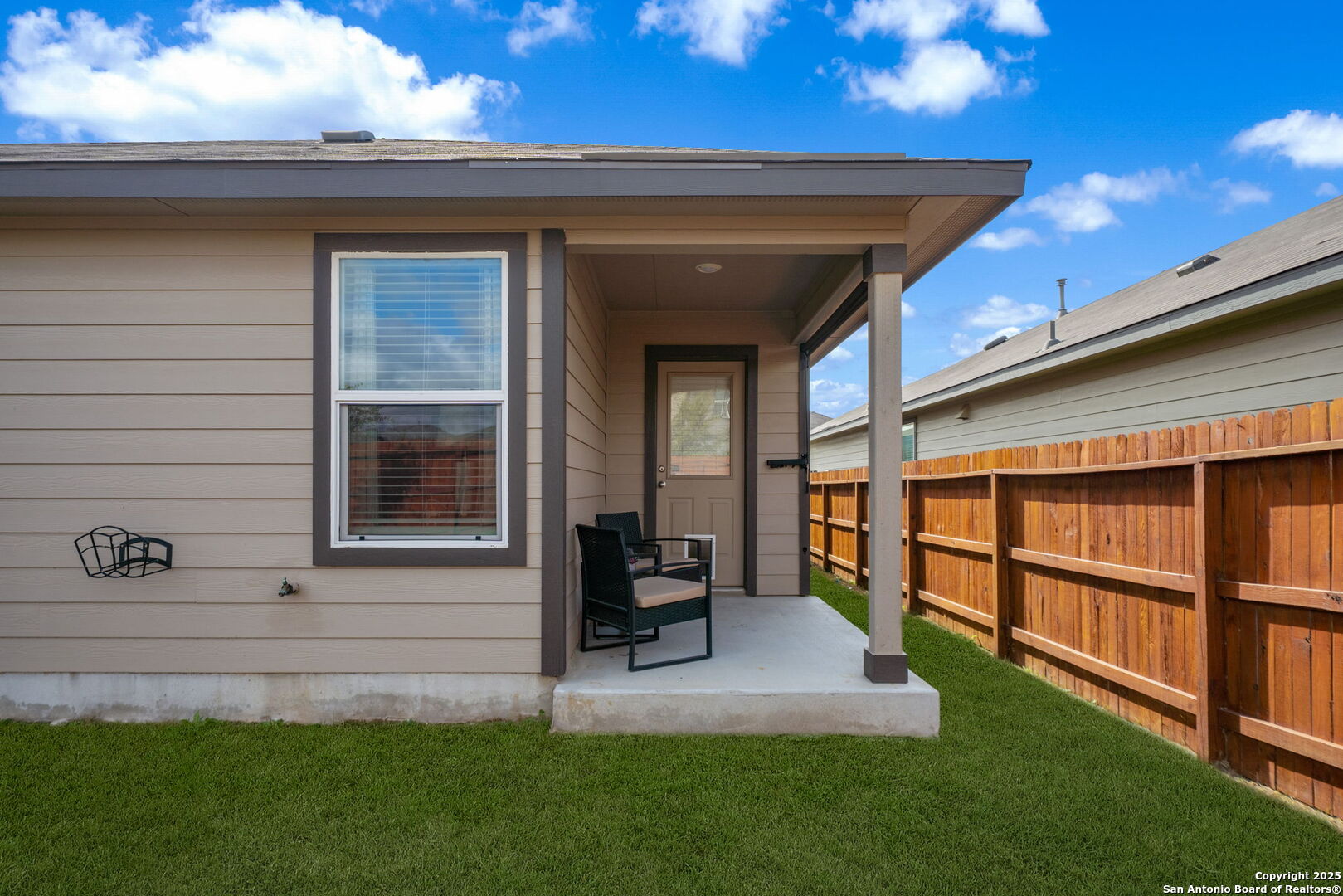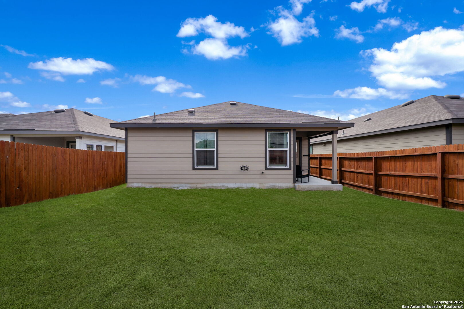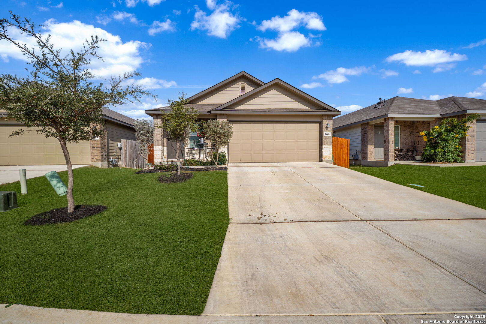 Welcome to this charming one-story home featuring 3 bedrooms, 2 baths, and a 2-car garage. A long foyer leads you past the utility room and into a spacious, open living and dining area that seamlessly flows into the stunning corner kitchen. The kitchen highlights include a breakfast bar with beautiful granite countertops, stainless steel appliances, and a convenient corner pantry-perfect for both everyday meals and entertaining. The primary bedroom is thoughtfully located just off the kitchen and offers a stylish ensuite with a separate water closet and a generous walk-in closet. Enjoy easy access to the covered patio from both the kitchen and the primary bedroom-an ideal spot to relax outdoors. Additional features include durable sheet vinyl flooring in the entry, living room, and all wet areas, granite bathroom countertops, full-yard landscaping with irrigation, and the Home Is Connected smart-home package. With one central hub, you can control the lights, thermostat, and locks right from your smartphone. This home also comes with valuable upgrades: a water softener, water purifier, garage door opener with two remotes, and a Samsung microwave. Located just minutes from Lackland AFB, H-E-B, SeaWorld, Walmart, Costco, and much more, with convenient access to Hwy 1604, Hwy 90, and Loop 410. This beautiful home offers exceptional value and convenience-truly a must-see!