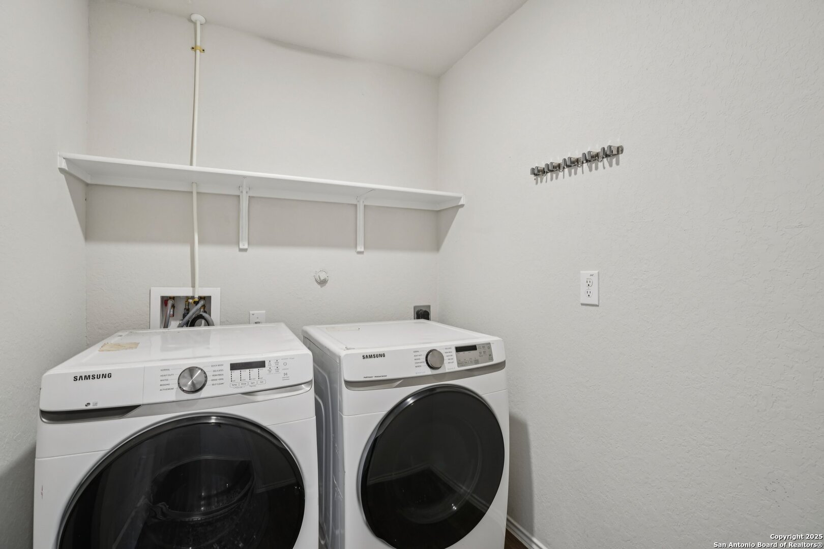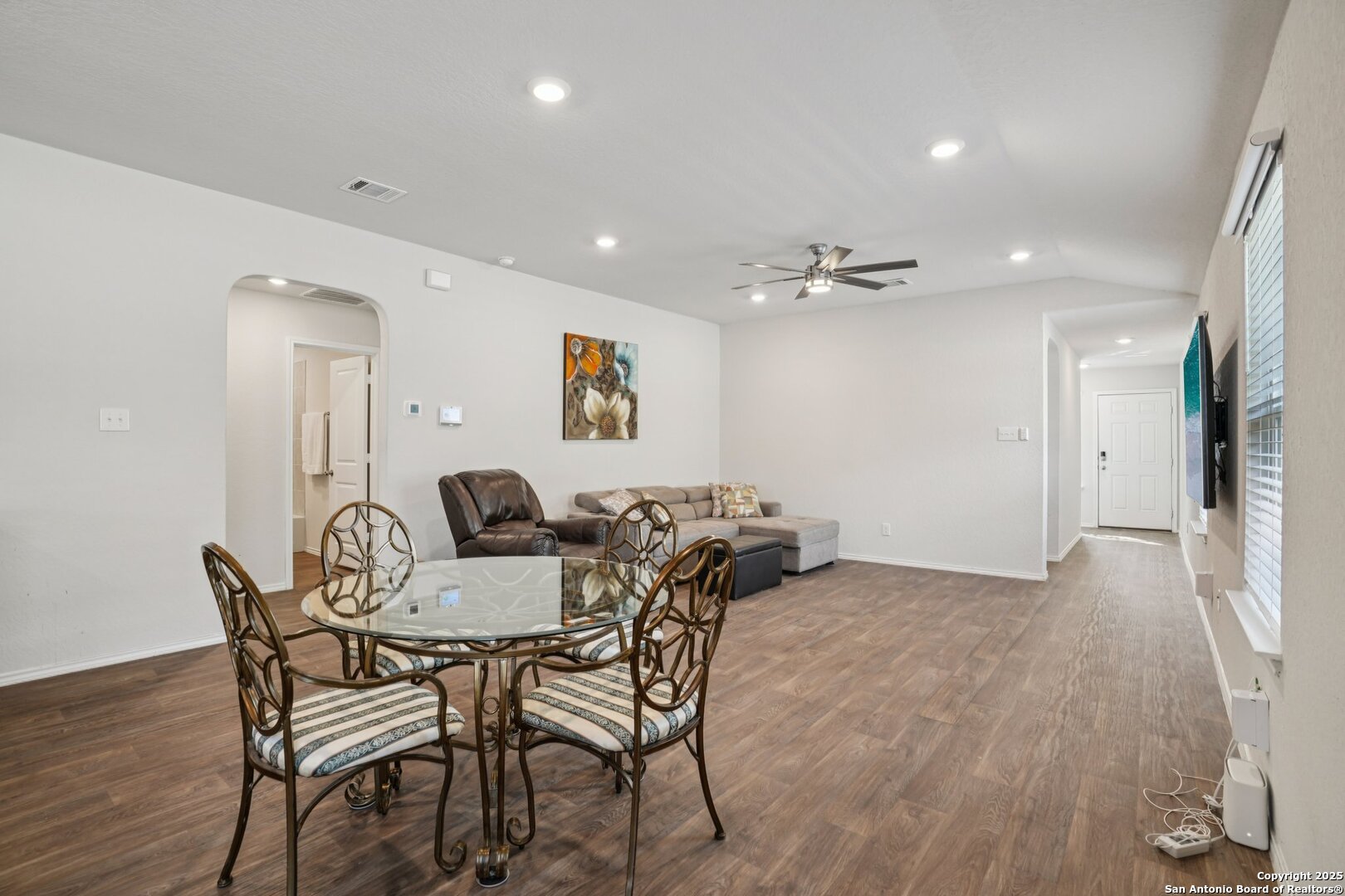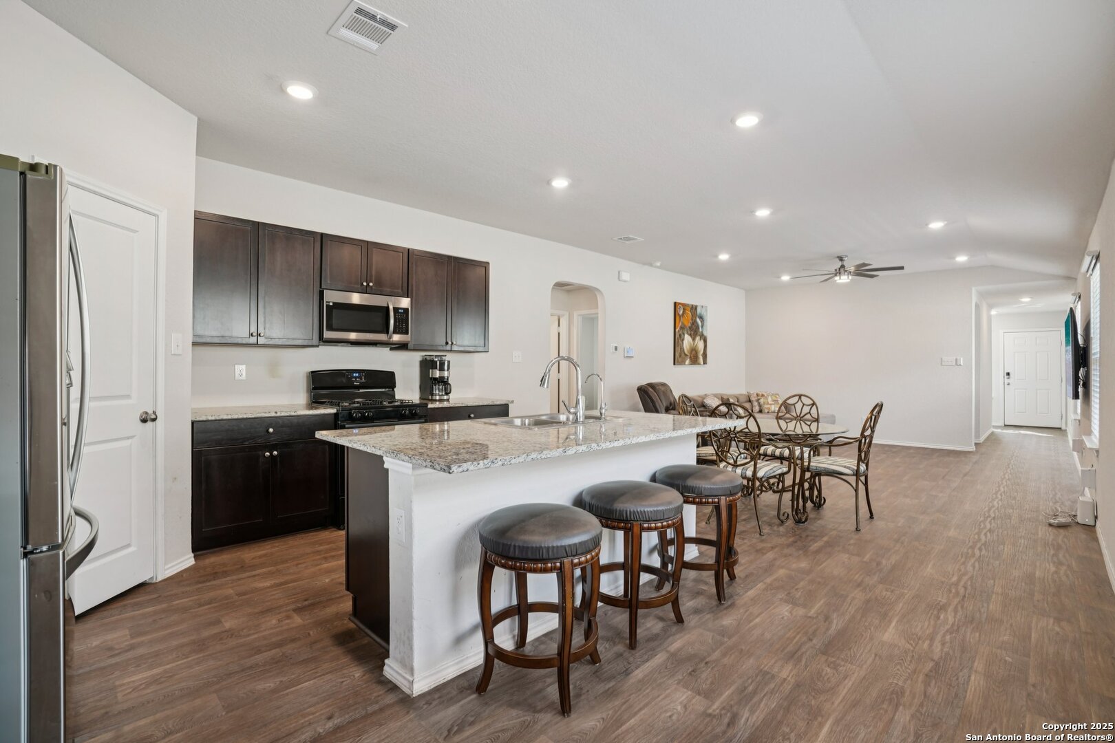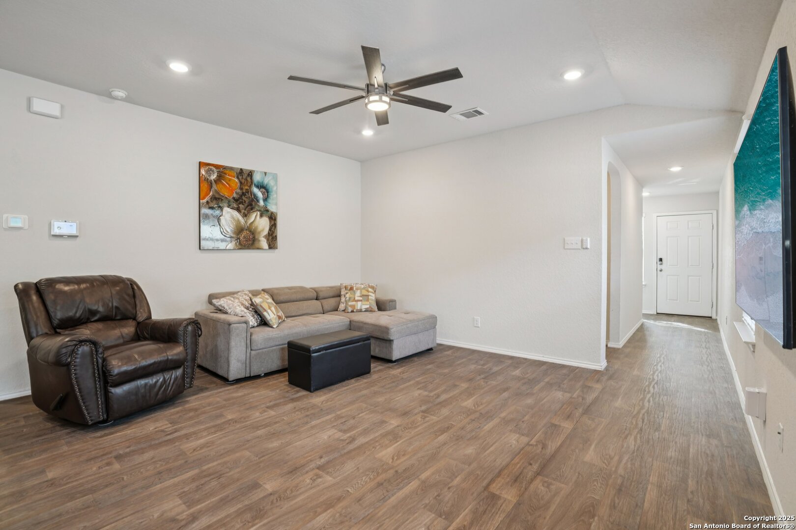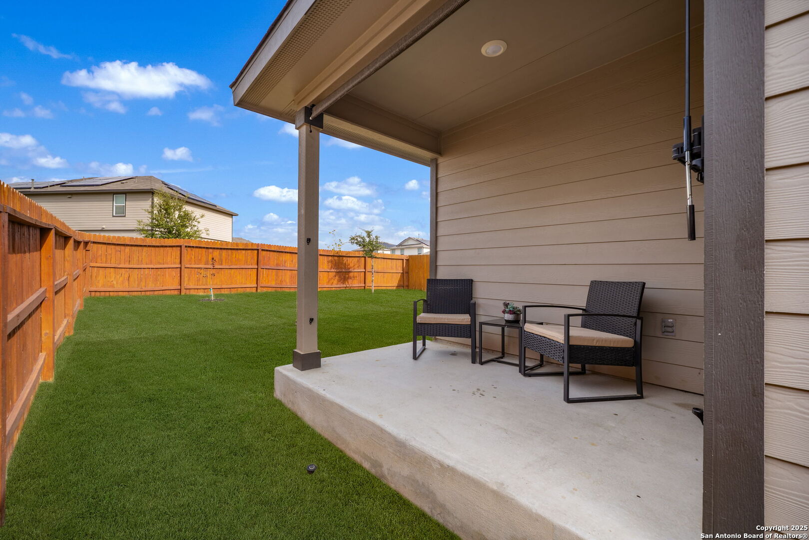 Welcome to this charming one-story home featuring 3 bedrooms, 2 baths, and a 2-car garage. A long foyer leads you past the utility room and into a spacious, open living and dining area that seamlessly flows into the stunning corner kitchen. The kitchen highlights include a breakfast bar with beautiful granite countertops, stainless steel appliances, and a convenient corner pantry-perfect for both everyday meals and entertaining. The primary bedroom is thoughtfully located just off the kitchen and offers a stylish ensuite with a separate water closet and a generous walk-in closet. Enjoy easy access to the covered patio from both the kitchen and the primary bedroom-an ideal spot to relax outdoors. Additional features include durable sheet vinyl flooring in the entry, living room, and all wet areas, granite bathroom countertops, full-yard landscaping with irrigation, and the Home Is Connected smart-home package. With one central hub, you can control the lights, thermostat, and locks right from your smartphone. This home also comes with valuable upgrades: a water softener, water purifier, garage door opener with two remotes, and a Samsung microwave. Located just minutes from Lackland AFB, H-E-B, SeaWorld, Walmart, Costco, and much more, with convenient access to Hwy 1604, Hwy 90, and Loop 410. This beautiful home offers exceptional value and convenience-truly a must-see!