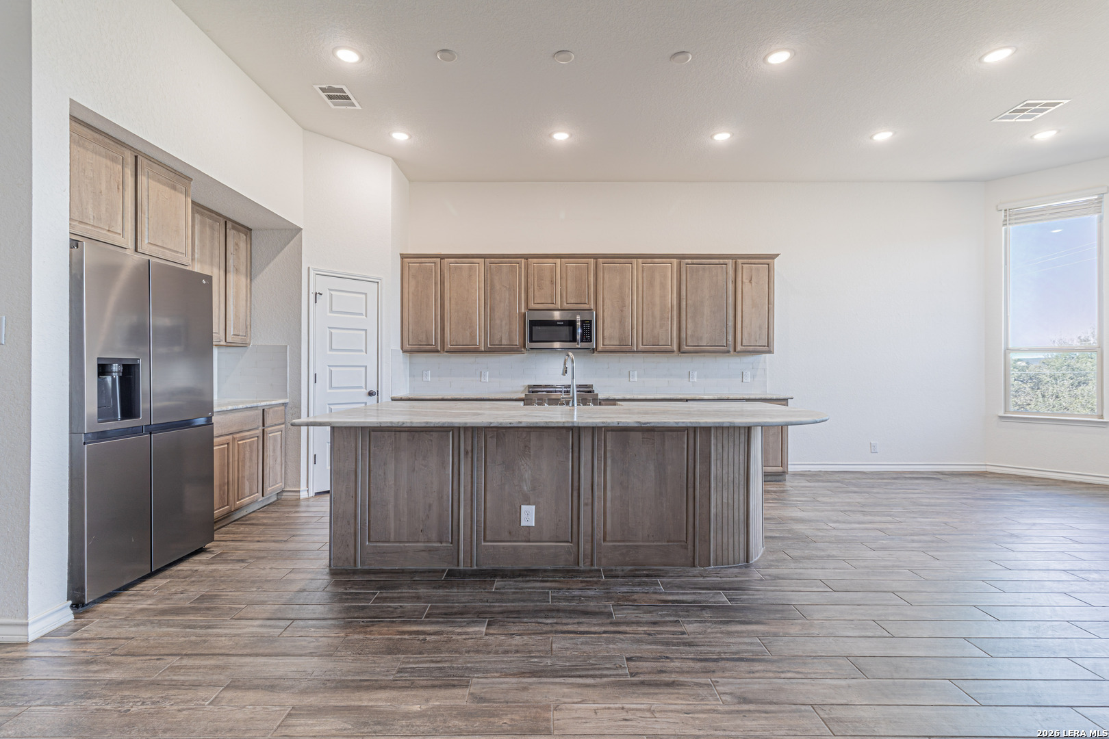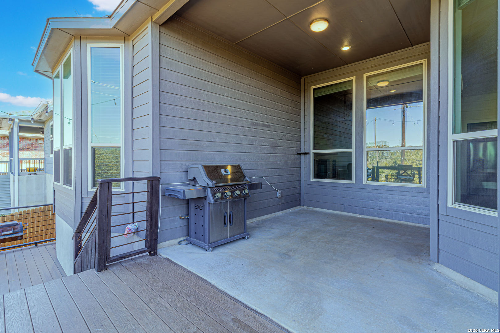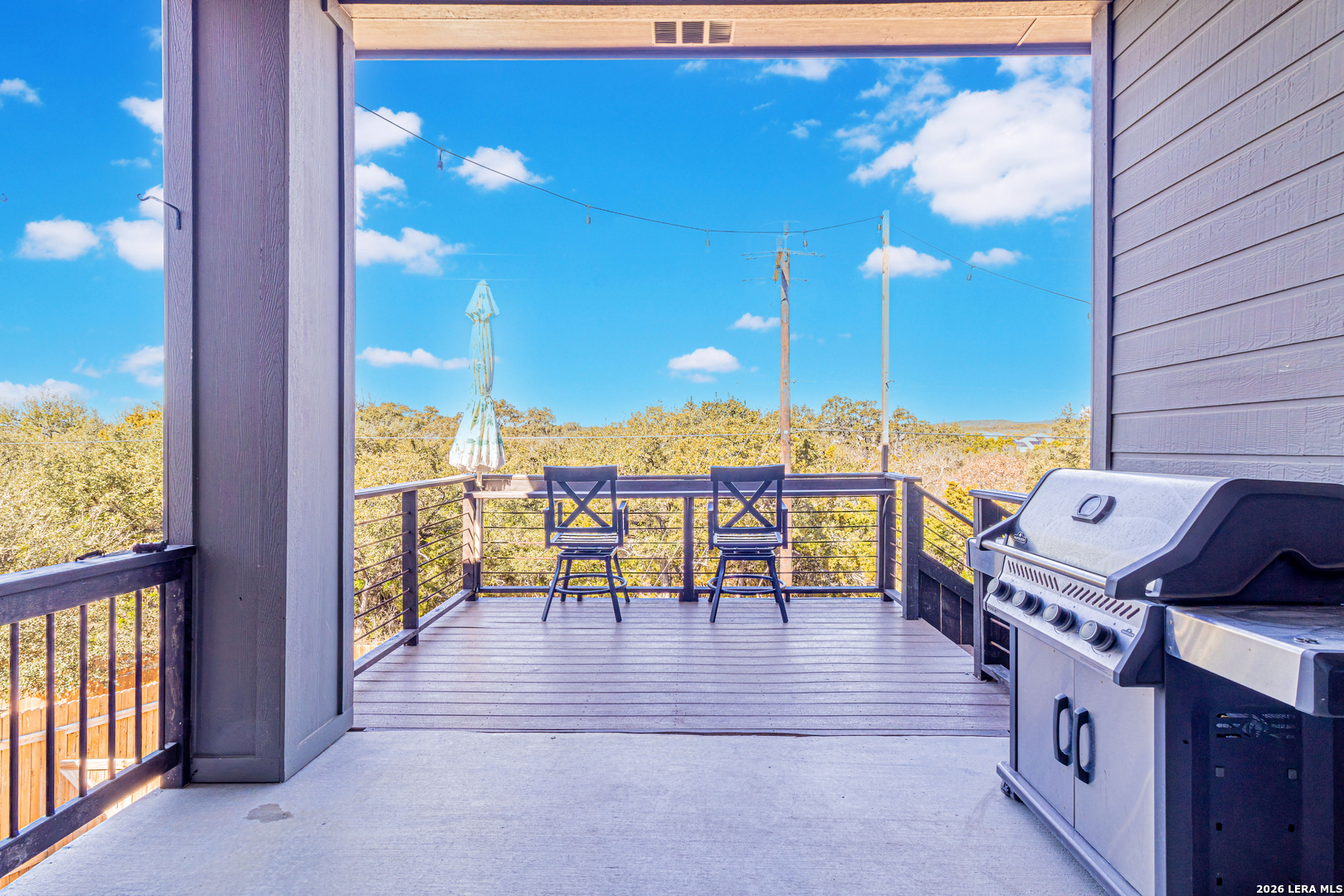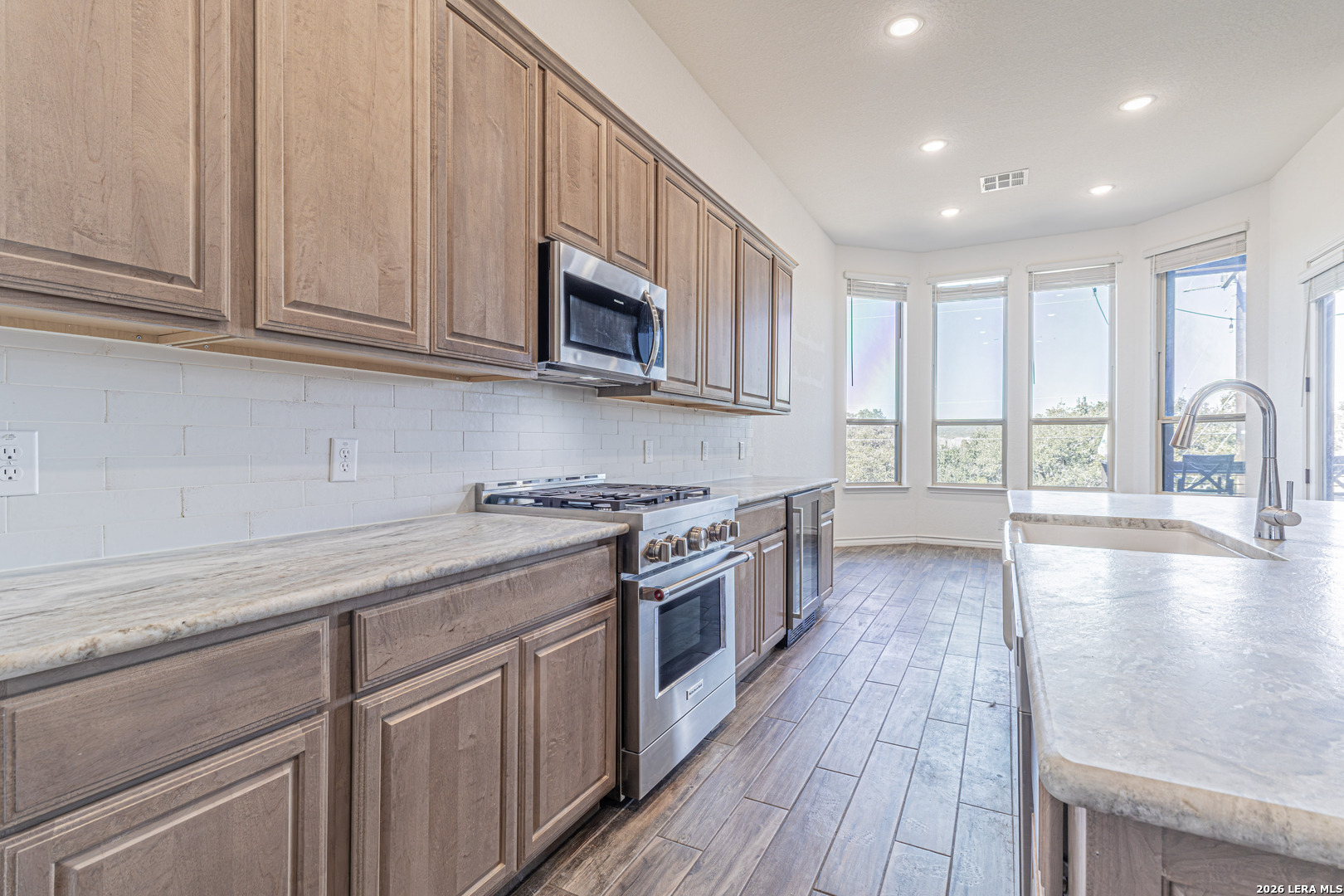 Built by Highland Homes - You will fall in love with this beautiful floorplan seated on a 50ft lot with open greenspace in the back. The treetop views from the primary bedroom and kitchen bay windows are unbeatable. This home features gorgeous granite countertops with a weathered-textured touch that makes this kitchen unique and timeless. The large, paneled island allows for ample seating and countertop space with a true farmhouse sink. Top of the line Kitchen aid gas stove, Wine refrigerator, Bosch Dishwasher, LG refrigerator, Custom built brick fireplace with Log storage. Wood tile throughout (no carpet in this home!) and black hardware throughout makes this home modern and versatile. Tankless water heater. Koi pond upfront. Two tier outside deck built with Trex decking. Built-in Gas grill hookup on patio. Backyard is perfect for low maintenance yet large enough for pets to run around. Do not miss these must-see views!