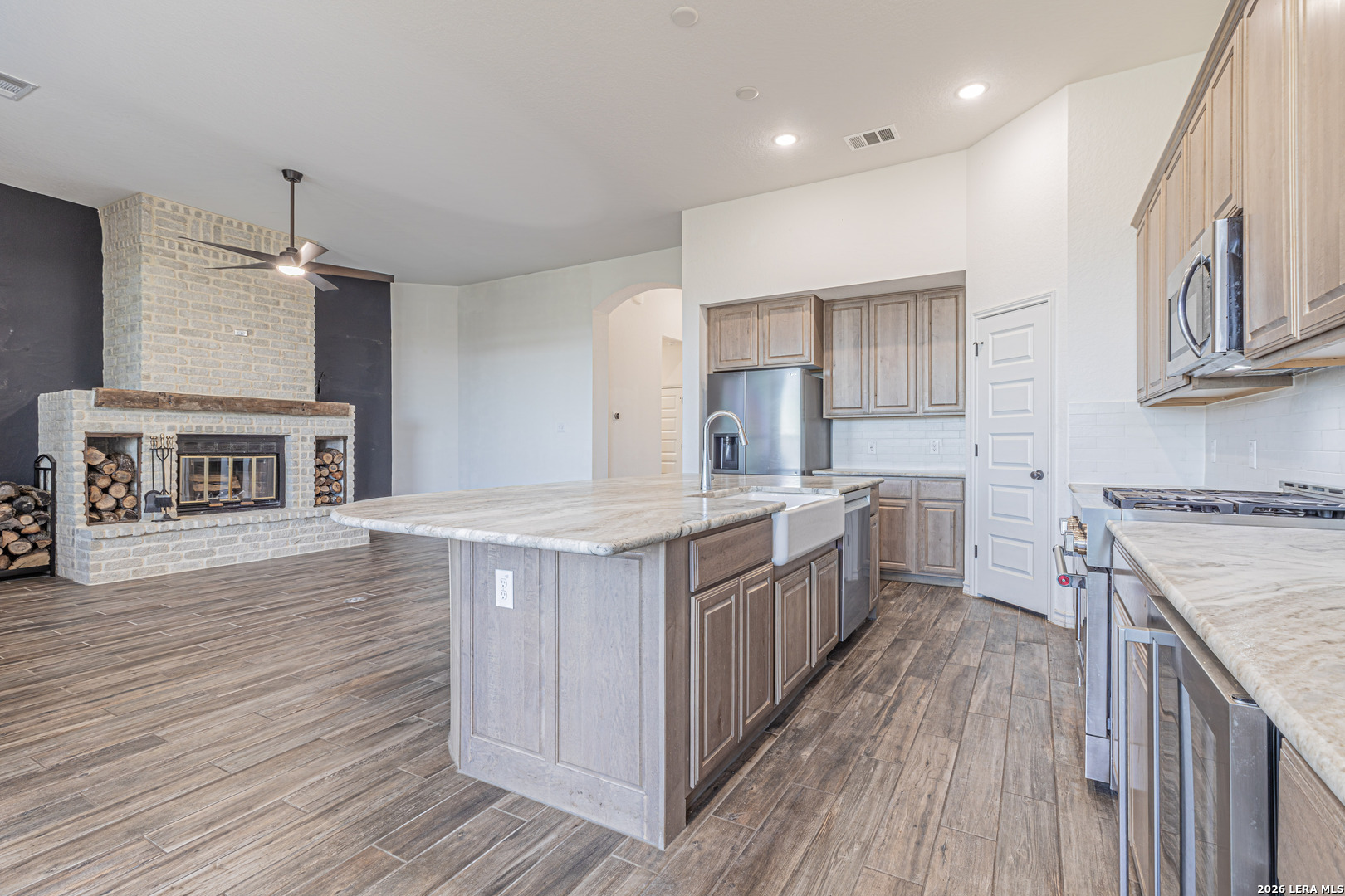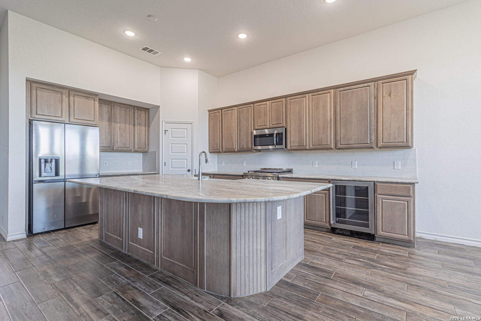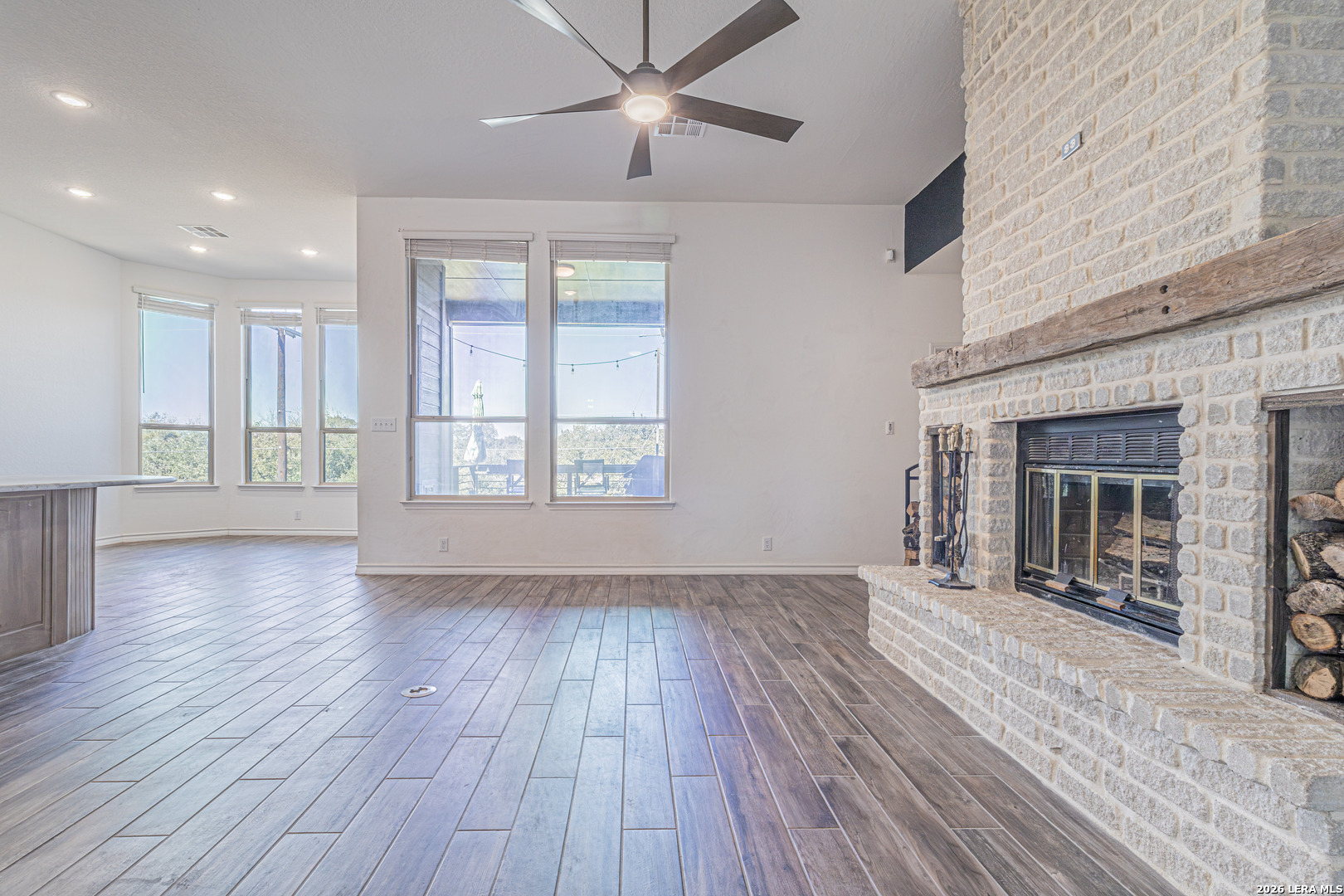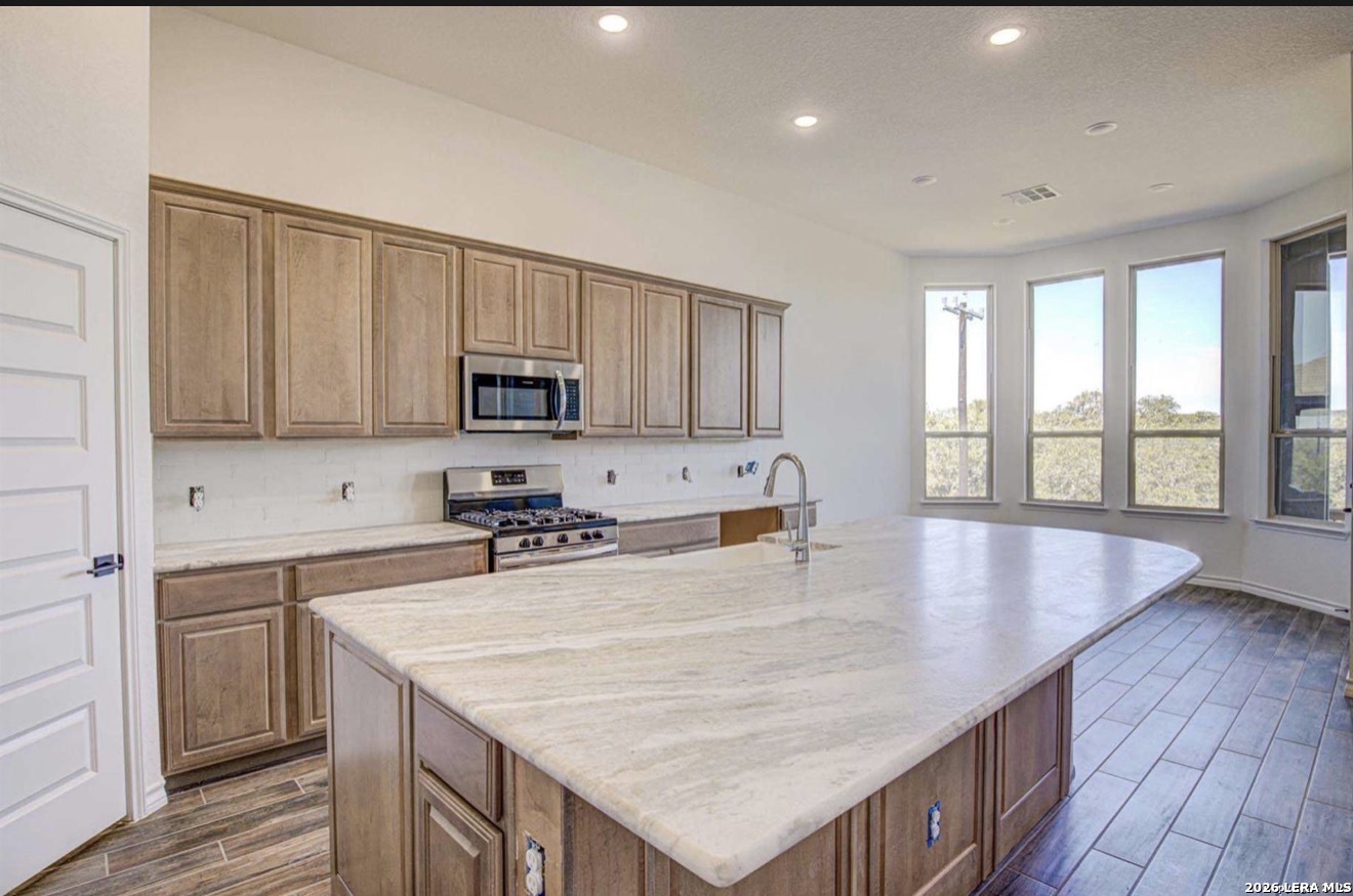 Built by Highland Homes - You will fall in love with this beautiful floorplan seated on a 50ft lot with open greenspace in the back. The treetop views from the primary bedroom and kitchen bay windows are unbeatable. This home features gorgeous granite countertops with a weathered-textured touch that makes this kitchen unique and timeless. The large, paneled island allows for ample seating and countertop space with a true farmhouse sink. Top of the line Kitchen aid gas stove, Wine refrigerator, Bosch Dishwasher, LG refrigerator, Custom built brick fireplace with Log storage. Wood tile throughout (no carpet in this home!) and black hardware throughout makes this home modern and versatile. Tankless water heater. Koi pond upfront. Two tier outside deck built with Trex decking. Built-in Gas grill hookup on patio. Backyard is perfect for low maintenance yet large enough for pets to run around. Do not miss these must-see views!