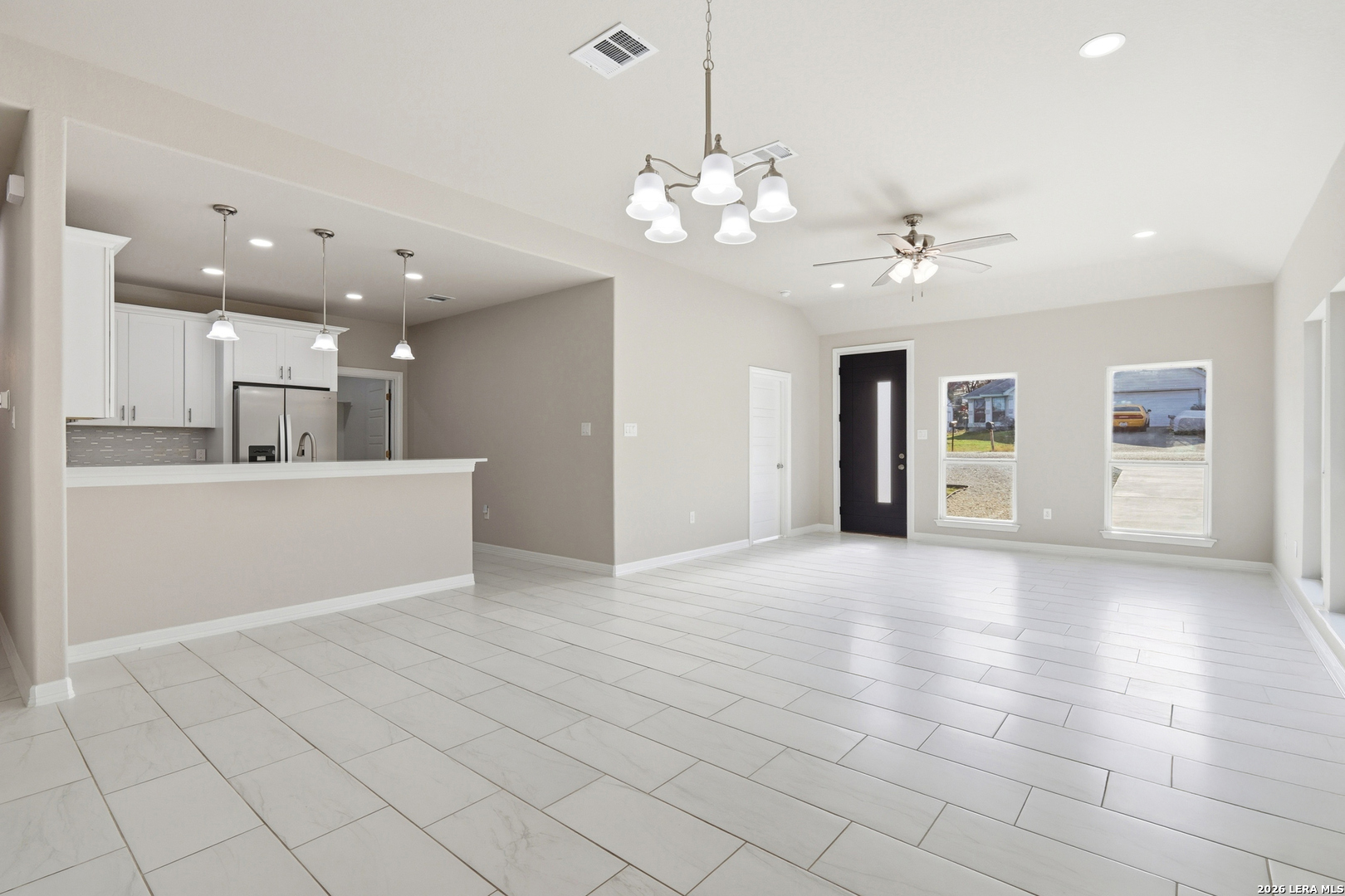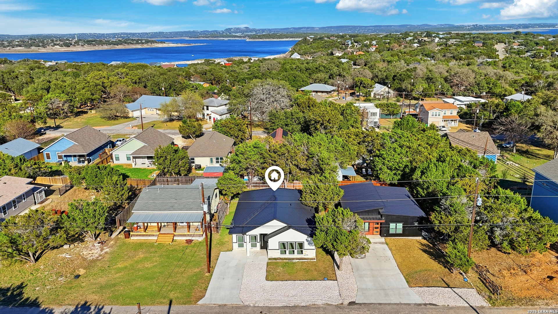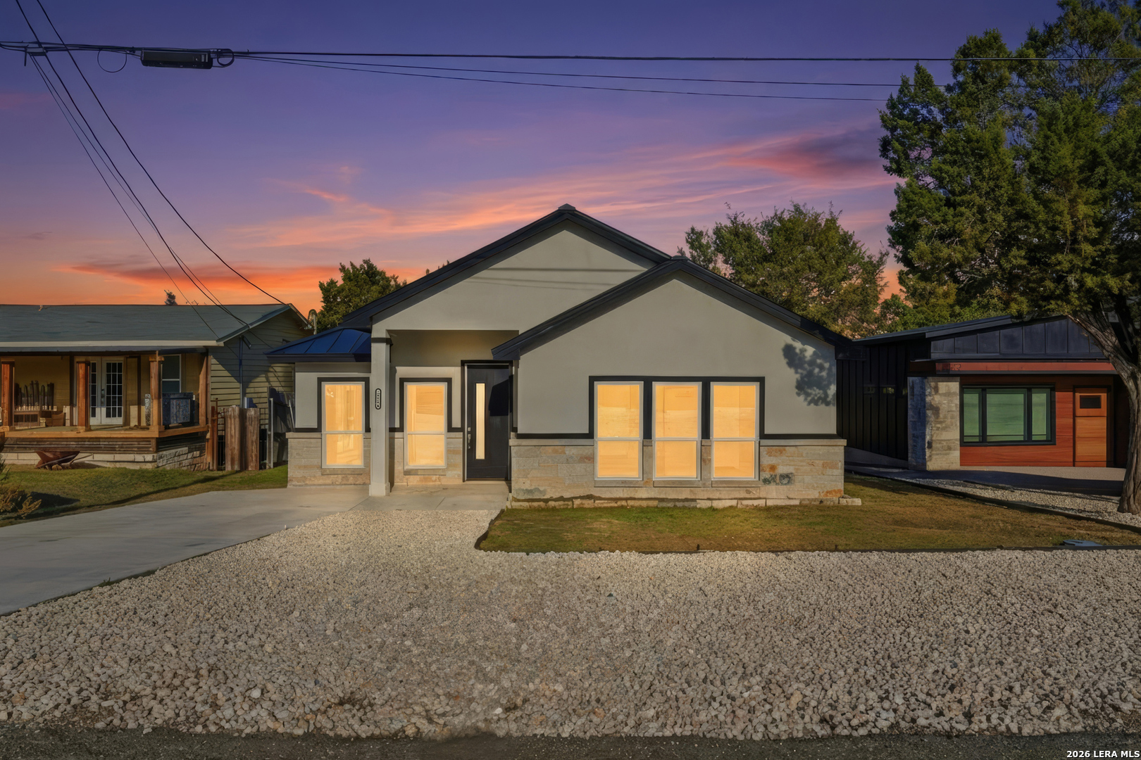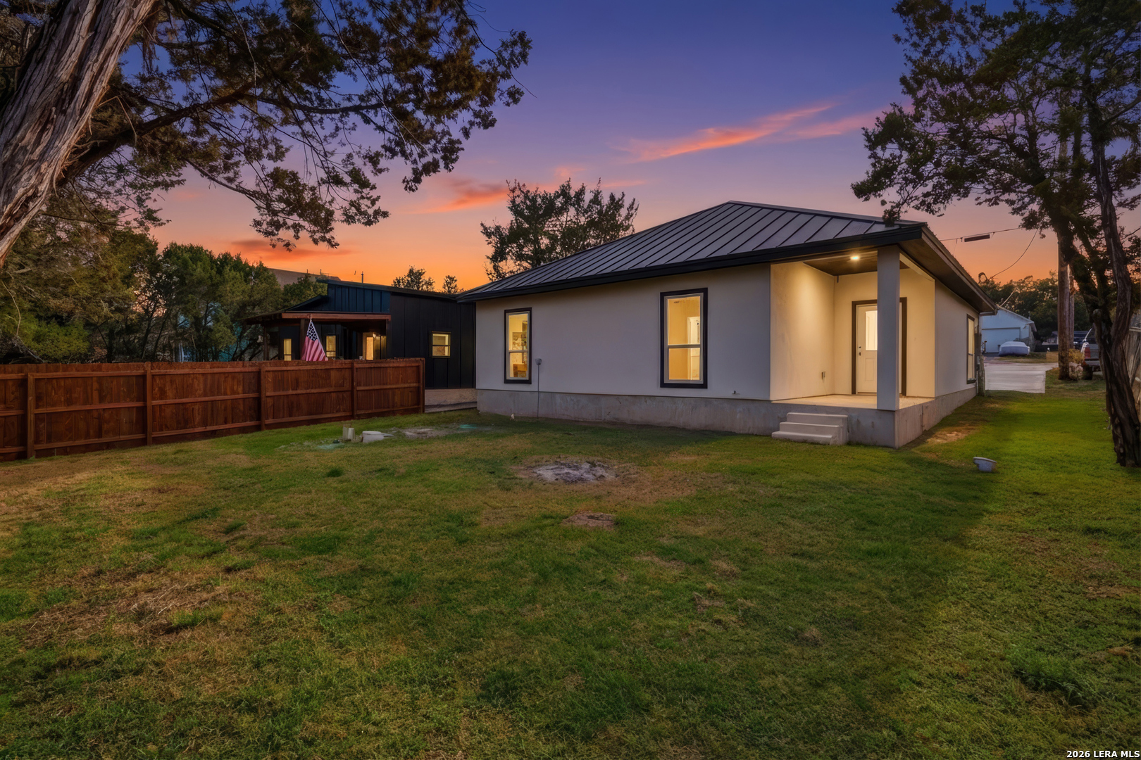 Single-story modern home in Canyon Lake featuring an open floor plan with recessed lighting throughout and abundant windows allowing natural light to fill the space. The kitchen showcases stainless steel appliances, a stylish tile backsplash, and a convenient breakfast bar. The primary bathroom offers a double vanity and a beautifully tiled shower. This home is designed with a metal roof, double-pane windows, and a programmable thermostat for comfort and efficiency. Enjoy country living just minutes from Canyon Lake with easy access to nearby boat ramps 6 and 7, plus many additional amenities. Flooring throughout is low-maintenance, with no carpet, providing a clean and modern feel.