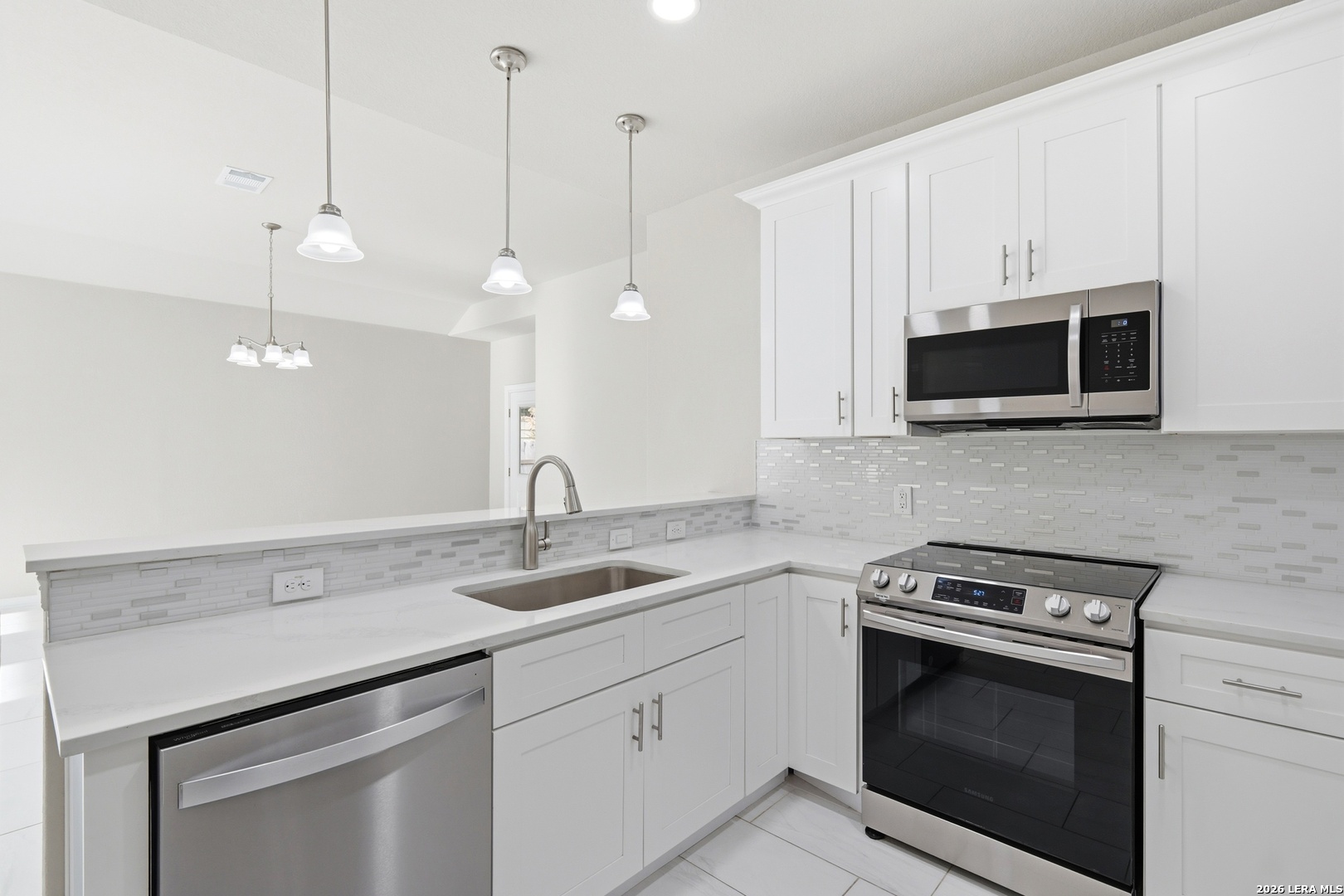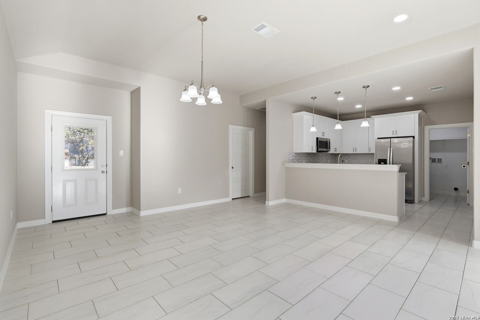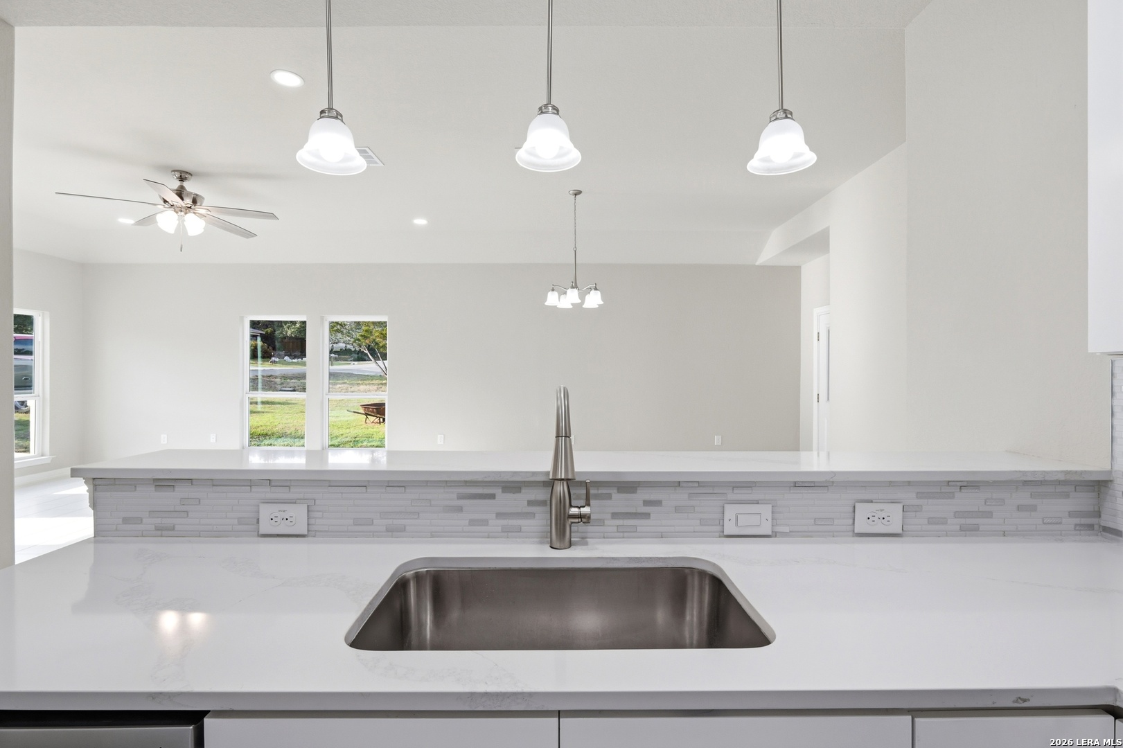 Single-story modern home in Canyon Lake featuring an open floor plan with recessed lighting throughout and abundant windows allowing natural light to fill the space. The kitchen showcases stainless steel appliances, a stylish tile backsplash, and a convenient breakfast bar. The primary bathroom offers a double vanity and a beautifully tiled shower. This home is designed with a metal roof, double-pane windows, and a programmable thermostat for comfort and efficiency. Enjoy country living just minutes from Canyon Lake with easy access to nearby boat ramps 6 and 7, plus many additional amenities. Flooring throughout is low-maintenance, with no carpet, providing a clean and modern feel.