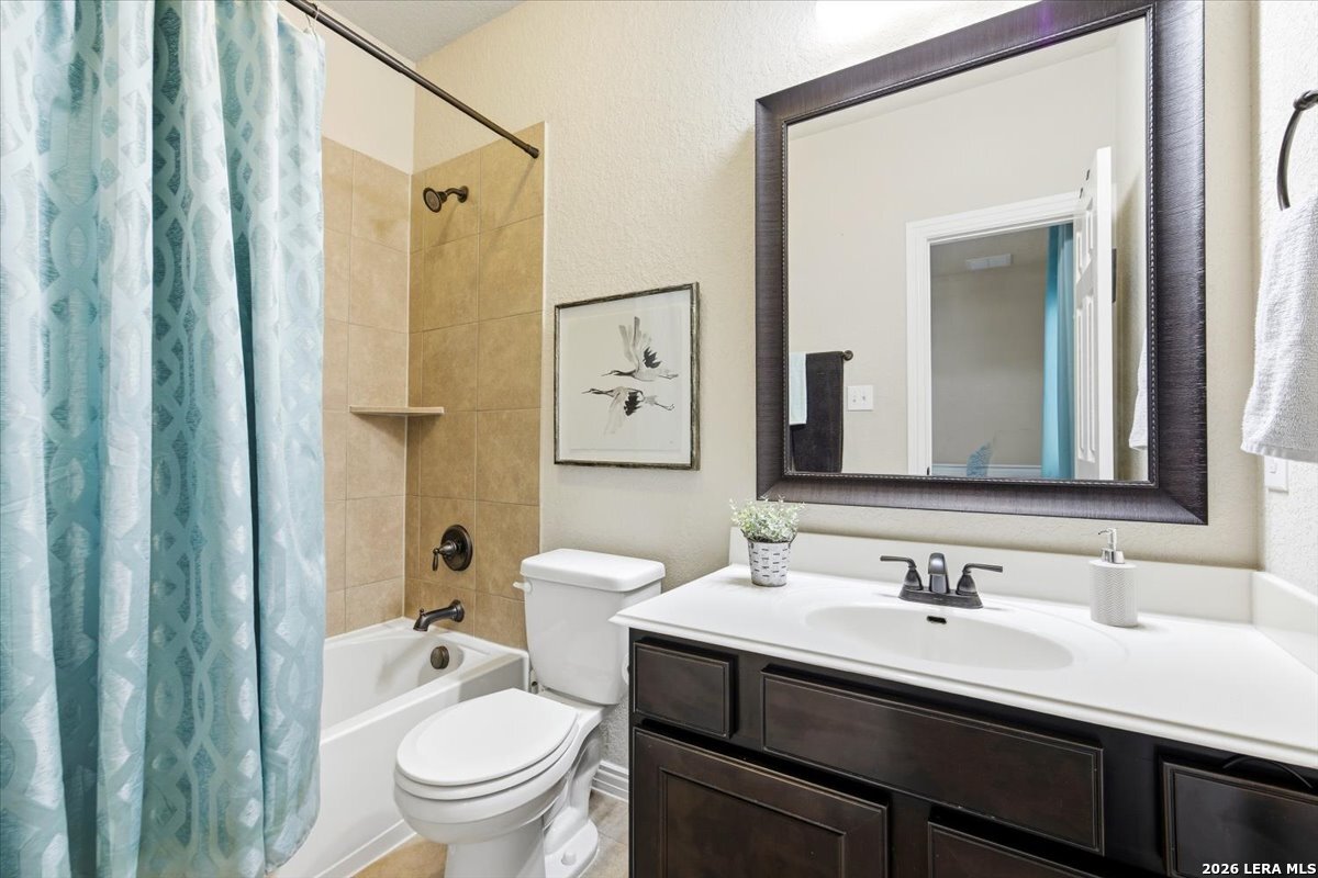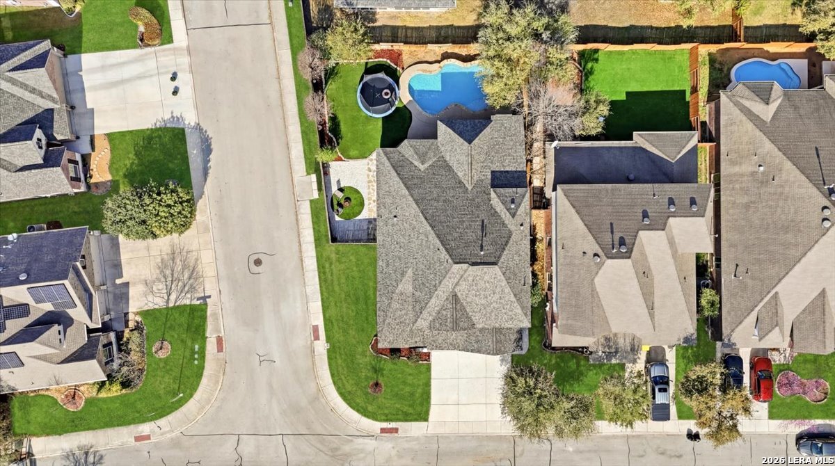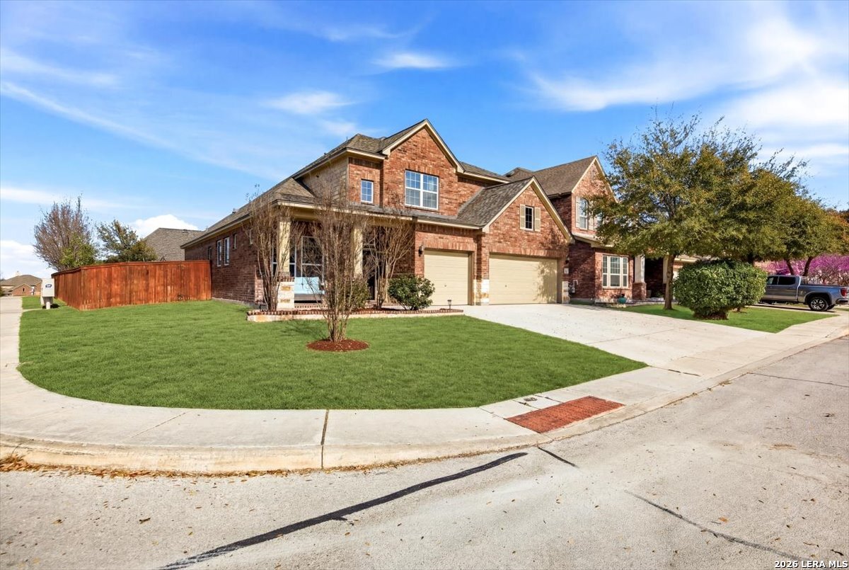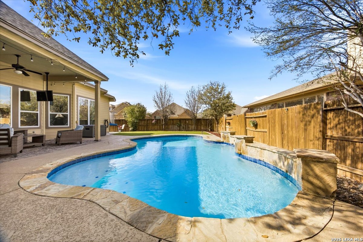 Welcome to your private outdoor oasis in a desirable gated community, offering space, upgrades, and an unbeatable location with easy commute to Lackland Air Force Base, downtown or any of the area activities. This move-in ready home sits on a HUGE lot with endless possibilities-plenty of room for pets, kids, a fire pit, trampoline, or even future additions. The backyard is designed for relaxation and entertaining, featuring a stunning 3-6 ft pool with waterfalls and tanning ledges, a covered patio, mature shade trees, and low-maintenance artificial turf for year-round beauty without the upkeep. Exterior security cameras add an extra layer of peace of mind. Inside, you'll love the open floor plan with soaring ceilings and abundant natural light. Just off the entry is a designated office with elegant glass French doors, perfect for working from home in style and privacy, along with a formal dining room ideal for hosting holidays and special gatherings. The oversized kitchen is truly the heart of the home, showcasing granite countertops, a massive island, walk-in pantry, and spacious eat-in dining area-perfect for everyday living and entertaining alike. The primary suite offers a private retreat with a spa-inspired ensuite bath including dual vanities, a walk-in shower, soaking tub, and a dream-sized walk-in closet. Upstairs, enjoy a fun and flexible second living space plus generously sized secondary bedrooms with neutral paint throughout. The 3-car epoxied garage includes a Tesla Wall Charger and extended length to accommodate larger trucks. Major updates provide peace of mind, including a new roof (1/26), reverse osmosis system serviced (9/25), AC compressor replacement in 2021 and professional maintenance by RopeSA LLC, and water heater flushed (8/25). Thoughtful upgrades like a butcher block counter and additional storage in the spacious laundry room, and motion sensor lighting in the bathrooms make everyday living easy. Meticulously maintained and thoughtfully upgraded, this home blends comfort, efficiency, and style in a prime location close to shopping, dining, and entertainment. If you're looking for space, function, and a resort-style backyard-all in a secure community-this is the one to call home.