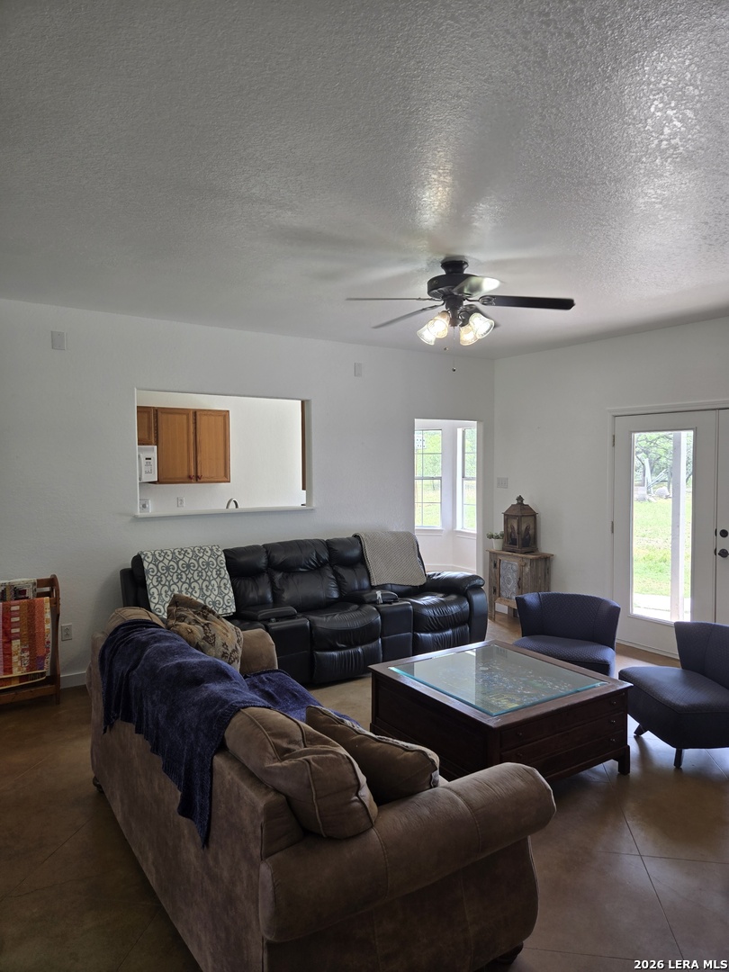 Private 5-Acre Masonry Estate: Modern Ranch Living Experience ultimate privacy on 5.02 lush acres featuring a seasonal creek and a stunning all-masonry ranch-style home. This carpet-free sanctuary boasts 9-foot ceilings and sleek, stained-etched concrete floors throughout. The heart of the home is an expansive open floor plan anchored by a cozy wood-burning stove, two distinct dining areas, and elegant bay windows that flood the space with light. Entertain with ease in a living room pre-wired for surround sound or transition through French doors to dual oversized patios. Built with a comprehensive energy-efficient package, the property also includes a private water well with a softener system. This is the perfect blend of rugged Texas privacy and refined modern comfort.