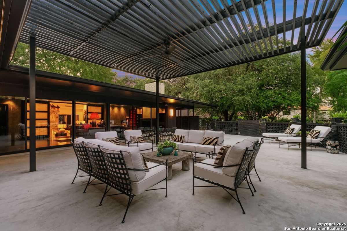 Dramatic one story contemporary styling offers oversized rooms, fabulous flow and a split bedroom arrangement that adapts to many needs. Terrazo at the entrance leads into an ultra high ceiling in the great room. Two steps up is the huge dining room with parquet flooring of all different woods. A nice sized family room with a fireplace and wet bar have an expanse of windows looking out to a gorgeous patio! The master suite and large study are on one side of the home and another large bedroom is behind the totally remodeled island kitchen. Down the hallway is another en-suite bedroom. Large 3 car garage! Fabulous storage through out. Large, Outdoor covered patio great for entertaining.
