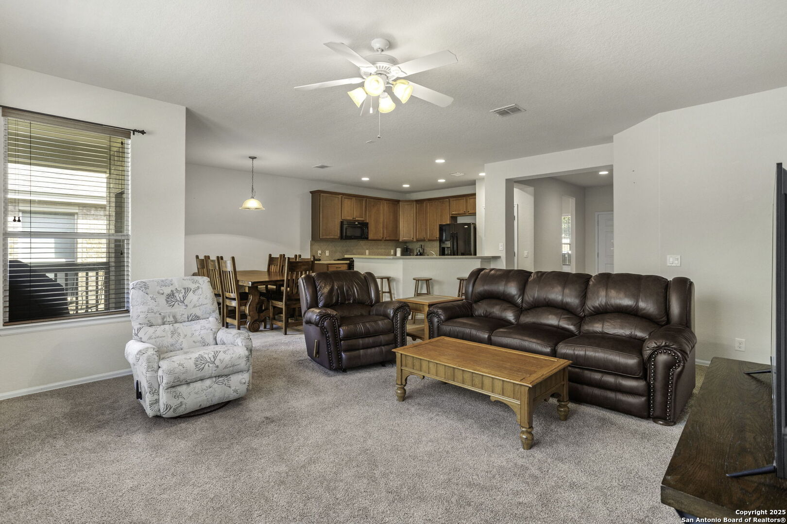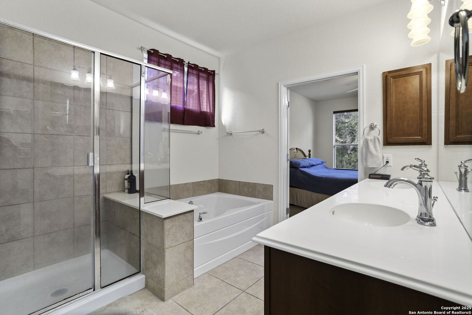 Reduced $10,000! Situated in the remarkable Hill Country Retreat community, this charming home backs to a greenbelt for privacy! The pleasant front porch beckons you inside the 100% brick & stone residence, to experience bright open living spaces. The kitchen features abundant cabinetry, gas cooktop, and Corian-style counters w/integrated sink for easy cleaning. Enjoy a spacious master retreat w/expansive windows & luxury bath affording a double vanity, 2 sinks, separate soaking tub & walk-in shower, and a generous closet! The second bedroom is also roomy, plus a study/office offers a great spot for hobbies & work alike. Don't miss the laundry room w/sink! Enjoy the covered back patio as you overlook the lawn w/irrigation system and appreciate natural views of the greenbelt. Discover the incredible amenities of this Resort Style 55+ neighborhood, including pickleball & tennis courts, Bocce ball, fitness center, indoor & outdoor pools, trails, clubs, and a library, all located within a peaceful community that affords convenient access to fine shopping, dining, and other San Antonio attractions!
