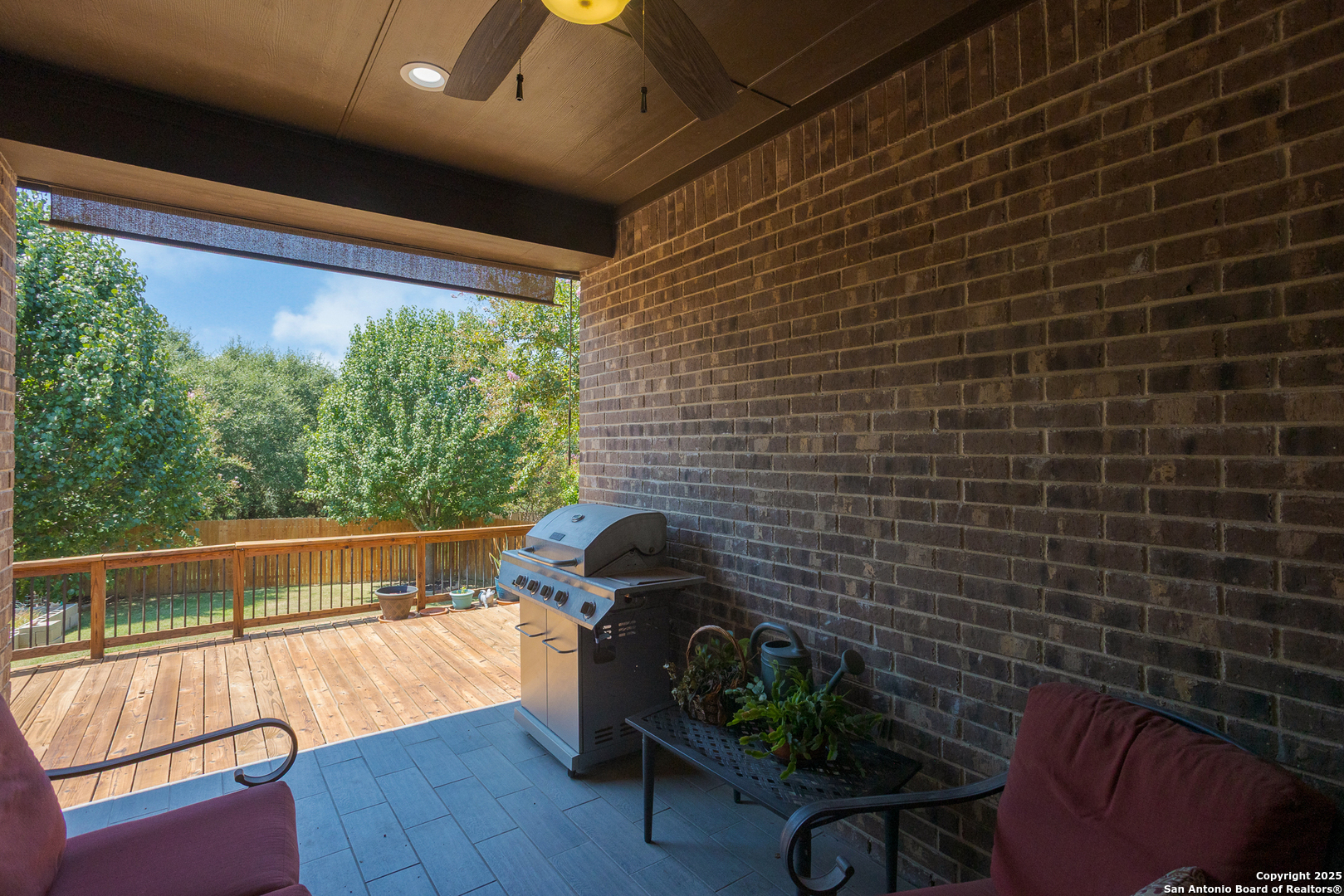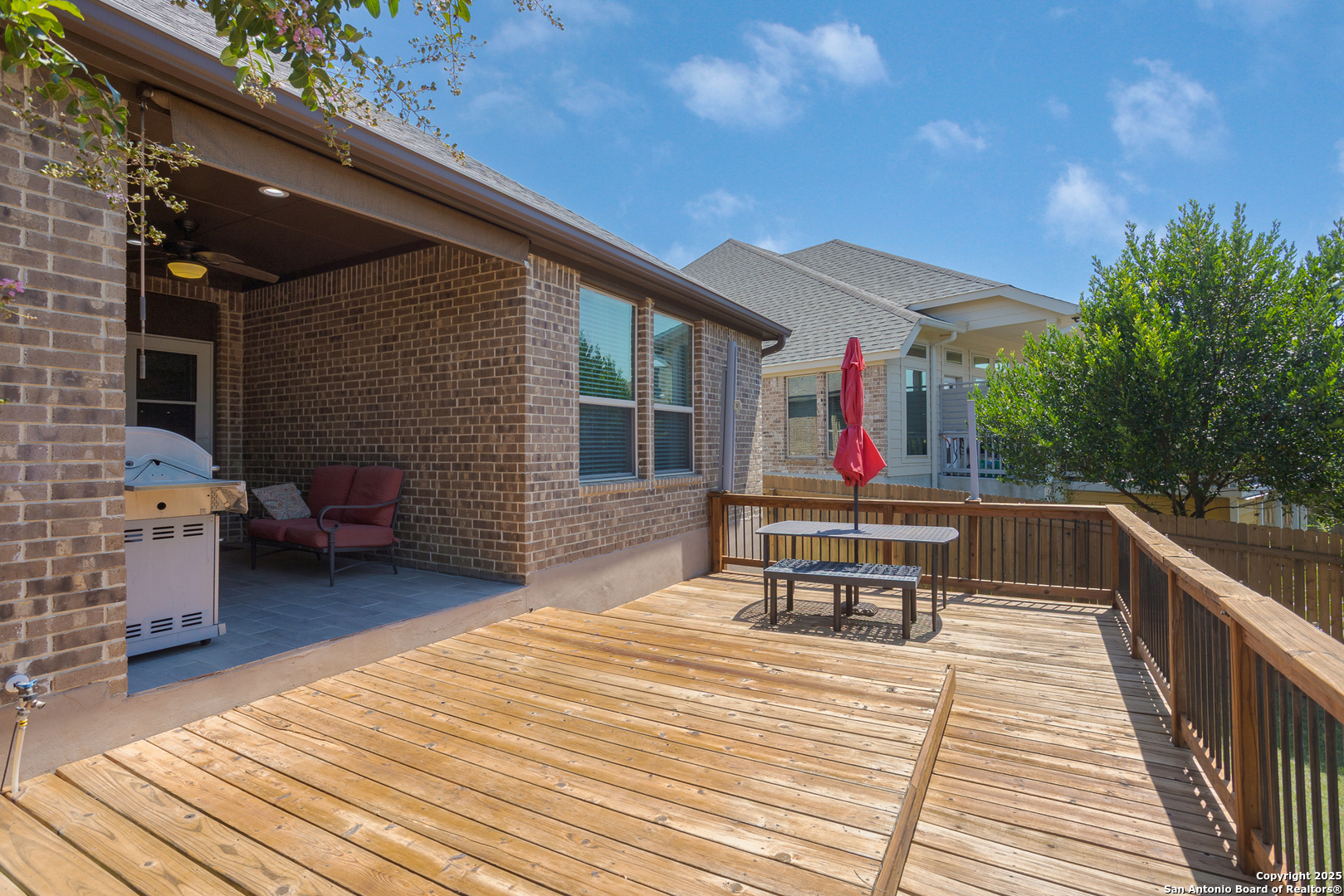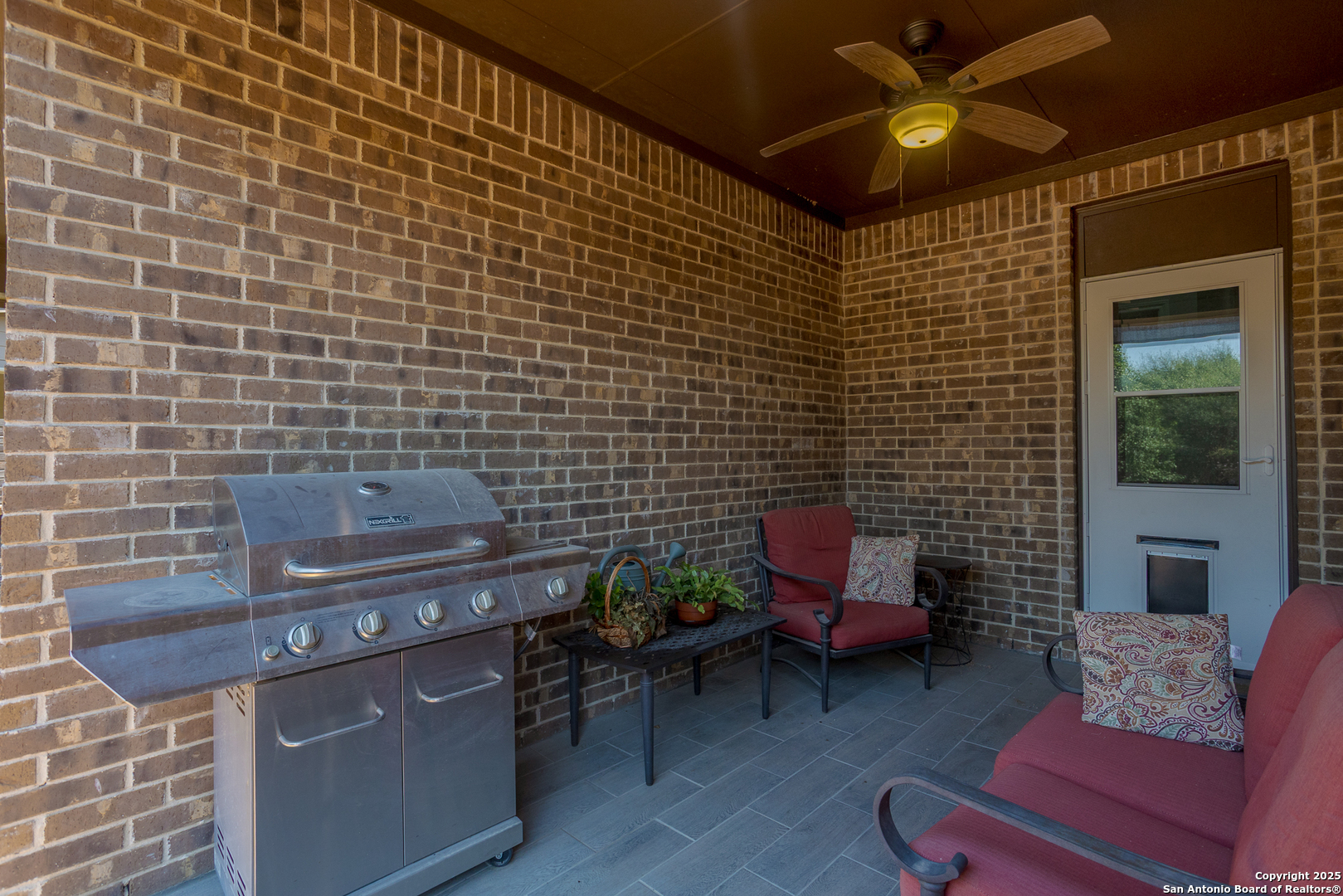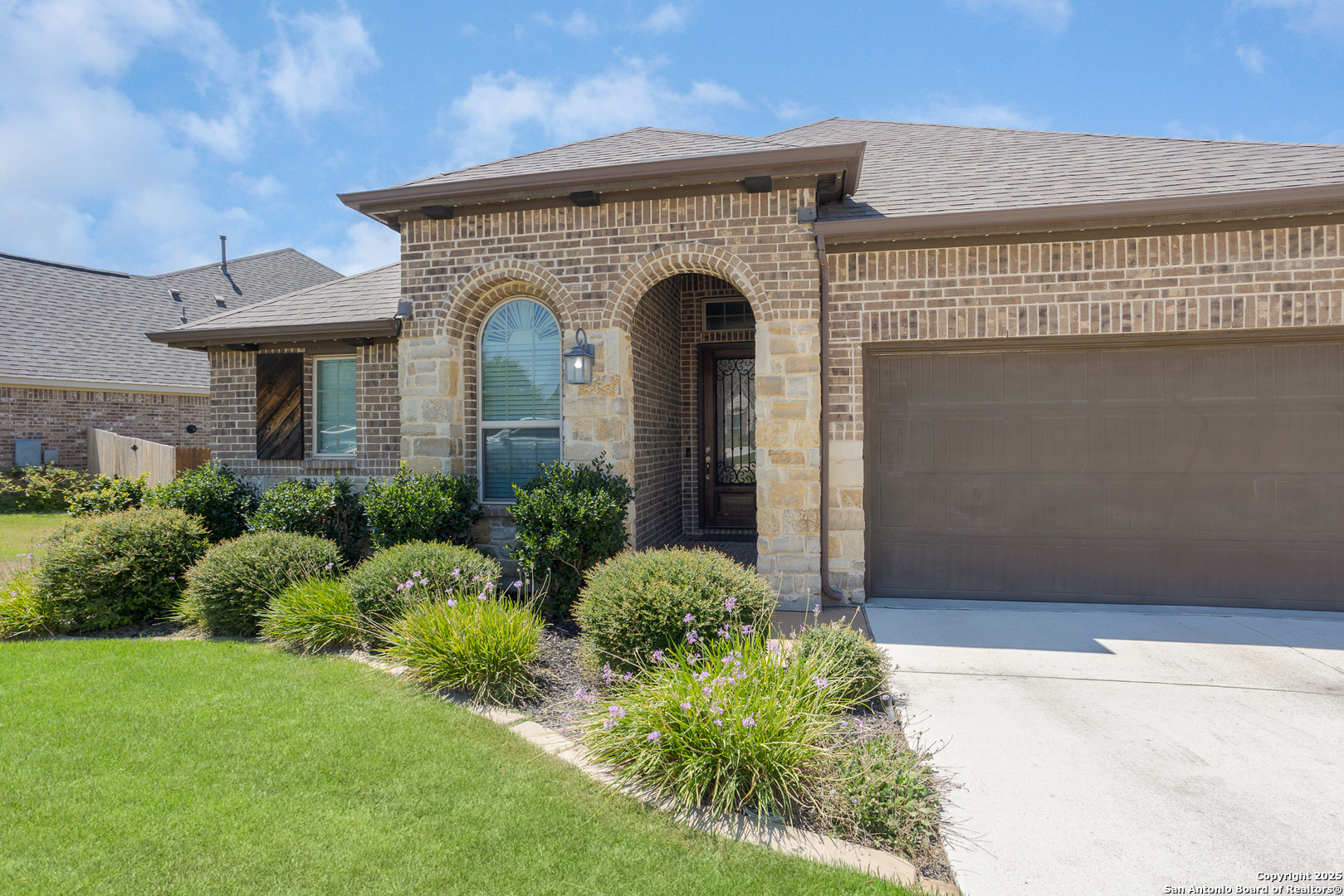 Welcome to 125 Cimarron Creek, nestled in the sought-after gated Ranches at Creekside community in Boerne. This stunning Highland-built one-story home offers 4 bedrooms, 3 bathrooms, and a spacious 3-car garage on nearly a quarter-acre private lot with no back neighbors. Inside, soaring ceilings and an open-concept floor plan showcase a chef-inspired kitchen with stainless steel appliances, gas cooking, under-cabinet lighting, and a large granite island that's perfect for entertaining. The fourth bedroom is an ideal guest suite, as it connects directly to the third full bathroom-offering privacy and comfort for visitors. The primary suite features elegant bay windows and a spa-inspired bathroom with a garden tub and separate shower as the centerpiece. Step outside to your true Texas living space with an extended covered patio featuring retractable shades for added privacy. The deck is more than just a deck-it's designed with storage underneath to neatly stow away your outdoor items, making your backyard oasis as functional as it is relaxing. Permanent Gemstone lighting under the soffits elevates the home's curb appeal and makes holiday lighting a breeze to enjoy year-round. As a resident, you'll also enjoy exceptional HOA amenities including a community swimming pool, jogging trails, a workout facility, and a playground-all within the safety of a gated neighborhood. All of this just minutes from downtown Boerne's shops, dining, and parks, and within the highly rated Boerne ISD.