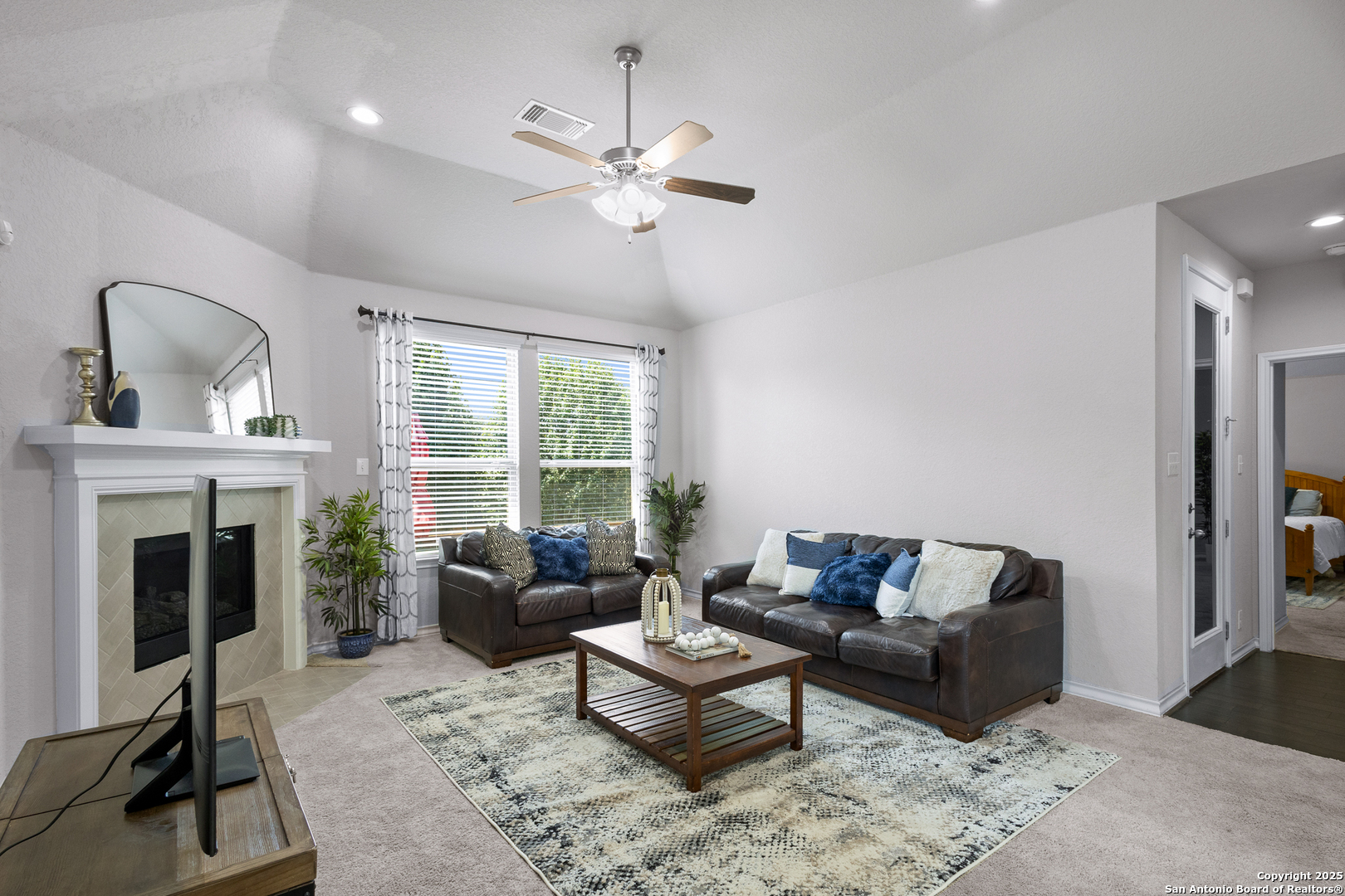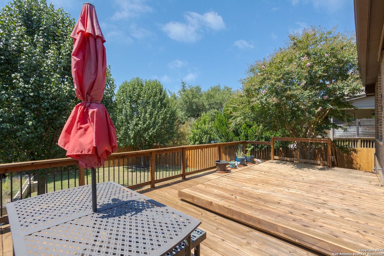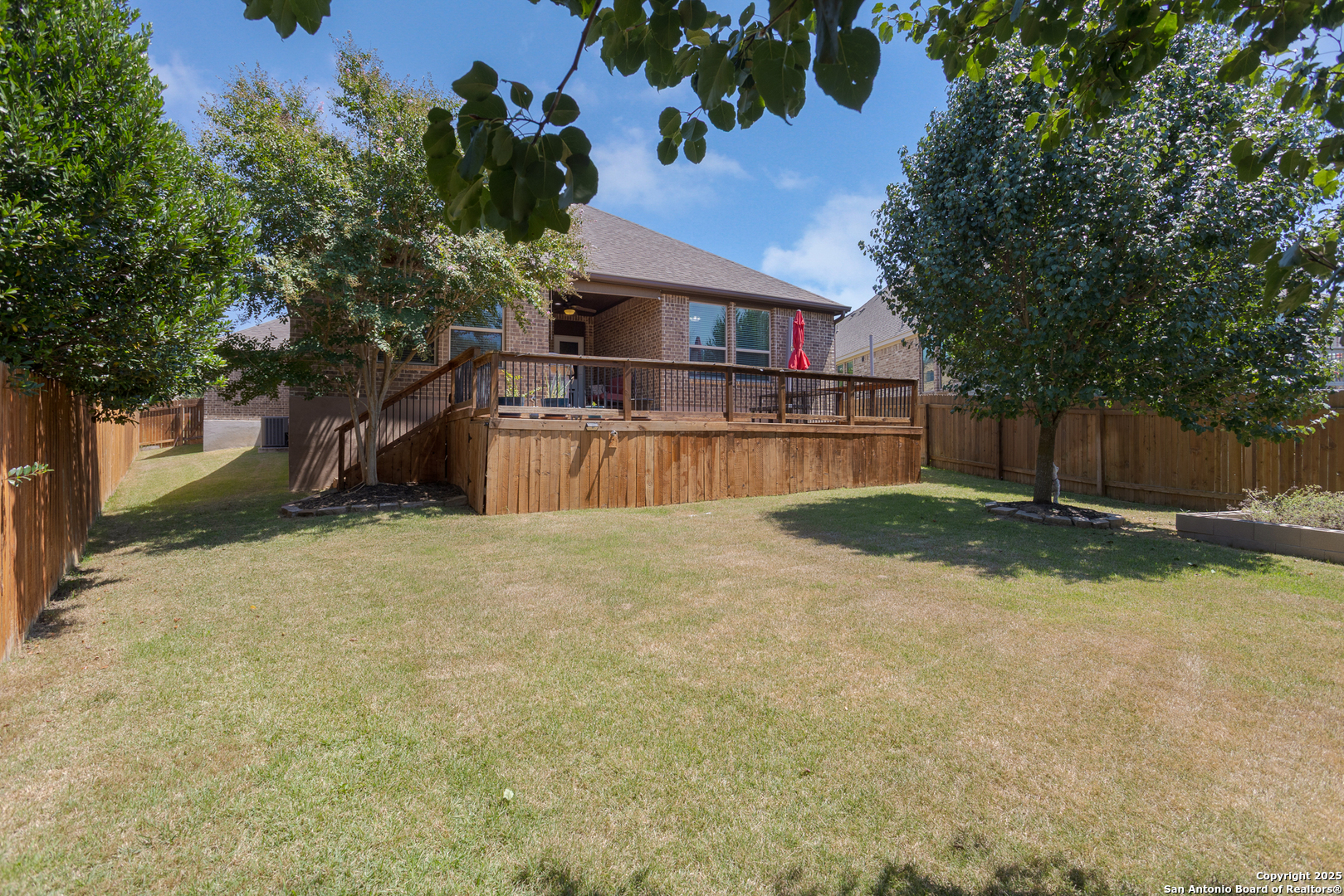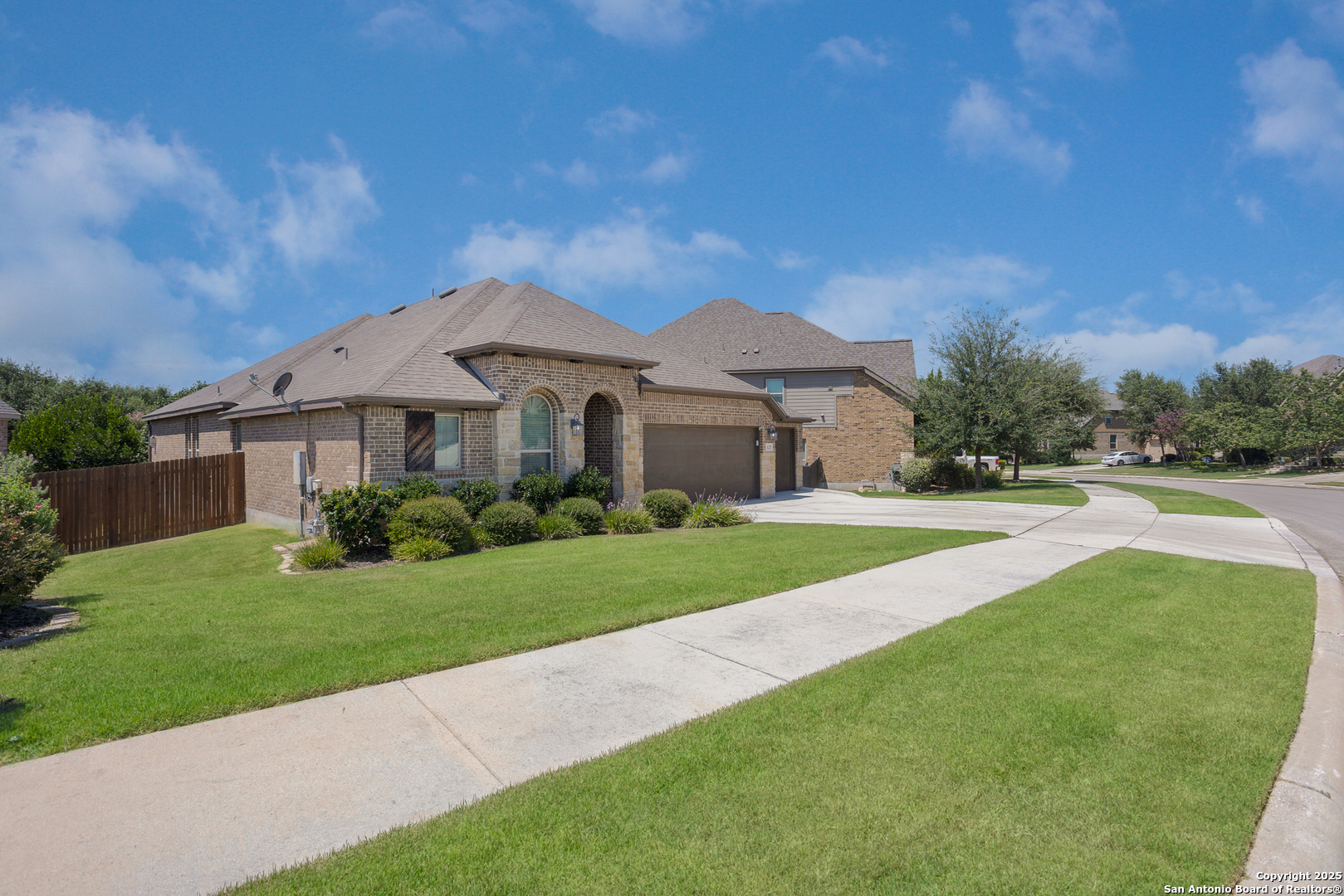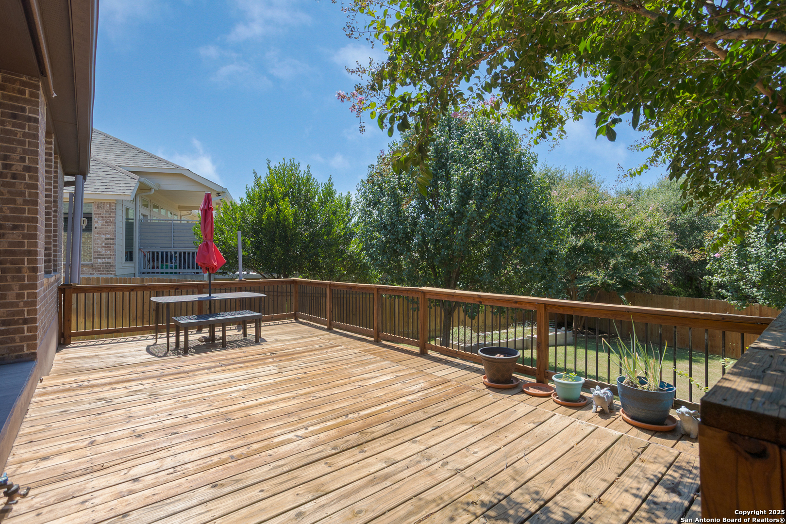 Welcome to 125 Cimarron Creek, nestled in the sought-after gated Ranches at Creekside community in Boerne. This stunning Highland-built one-story home offers 4 bedrooms, 3 bathrooms, and a spacious 3-car garage on nearly a quarter-acre private lot with no back neighbors. Inside, soaring ceilings and an open-concept floor plan showcase a chef-inspired kitchen with stainless steel appliances, gas cooking, under-cabinet lighting, and a large granite island that's perfect for entertaining. The fourth bedroom is an ideal guest suite, as it connects directly to the third full bathroom-offering privacy and comfort for visitors. The primary suite features elegant bay windows and a spa-inspired bathroom with a garden tub and separate shower as the centerpiece. Step outside to your true Texas living space with an extended covered patio featuring retractable shades for added privacy. The deck is more than just a deck-it's designed with storage underneath to neatly stow away your outdoor items, making your backyard oasis as functional as it is relaxing. Permanent Gemstone lighting under the soffits elevates the home's curb appeal and makes holiday lighting a breeze to enjoy year-round. As a resident, you'll also enjoy exceptional HOA amenities including a community swimming pool, jogging trails, a workout facility, and a playground-all within the safety of a gated neighborhood. All of this just minutes from downtown Boerne's shops, dining, and parks, and within the highly rated Boerne ISD.