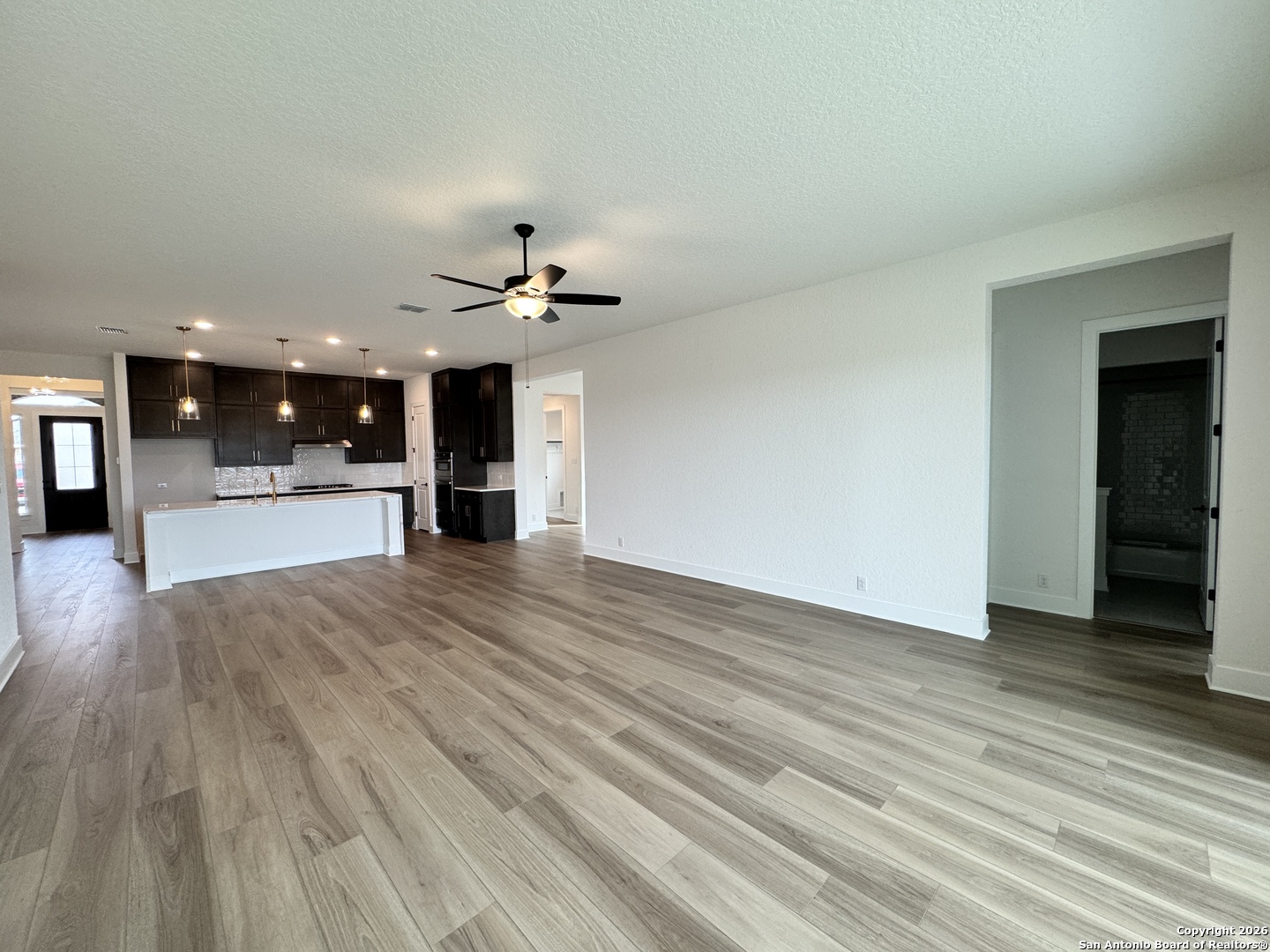 This stunning single-story home is designed for comfortable living with elevated features throughout. A gourmet kitchen anchors the layout, offering an island, built-in and self-cleaning ovens, double ovens, gas cooking, pendant lighting, and a walk-in pantry, making it ideal for everyday meals and entertaining alike. The open living and dining areas connect seamlessly, while sliding stacked rear doors open to an oversized backyard, extending your living space outdoors. With four bedrooms and three baths, including a private primary suite downstairs with a freestanding tub, mud-set shower, double vanity, and walk-in closet, the home offers both space and privacy. A game room adds flexibility for entertaining or relaxing, while ceiling fans, wood shelving, and modern conveniences like in-wall pest control, a security system, and plumbing for a water softener enhance daily living. A covered patio, privacy fence, sprinkler system, and three-car garage complete this well-appointed home. This home features design selections carefully curated by our studio team. Every finish, from flooring and cabinetry to countertops and details, is chosen to create a cohesive, stylish, and welcoming space that feels beautifully balanced from the moment you step inside. This home is in Megan's Landing, a family-friendly community in the Texas Hill Country. Enjoy nearby shopping, dining, outdoor escapes, and top Medina Valley ISD schools.