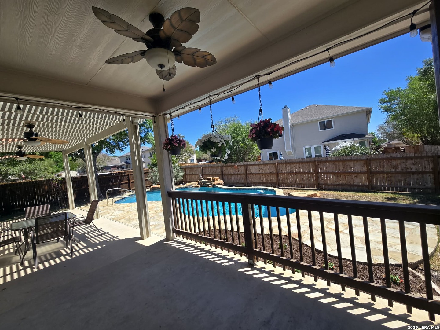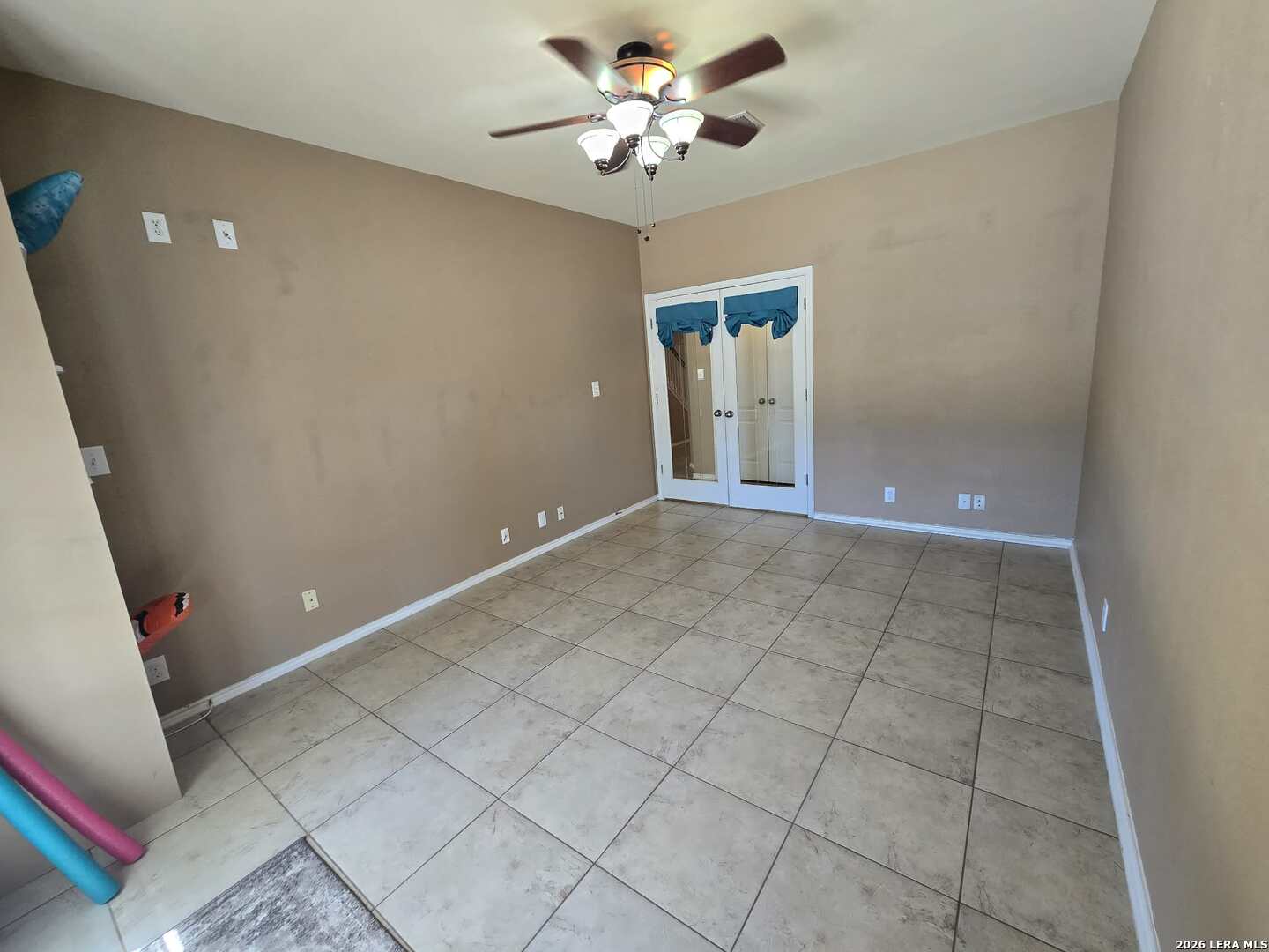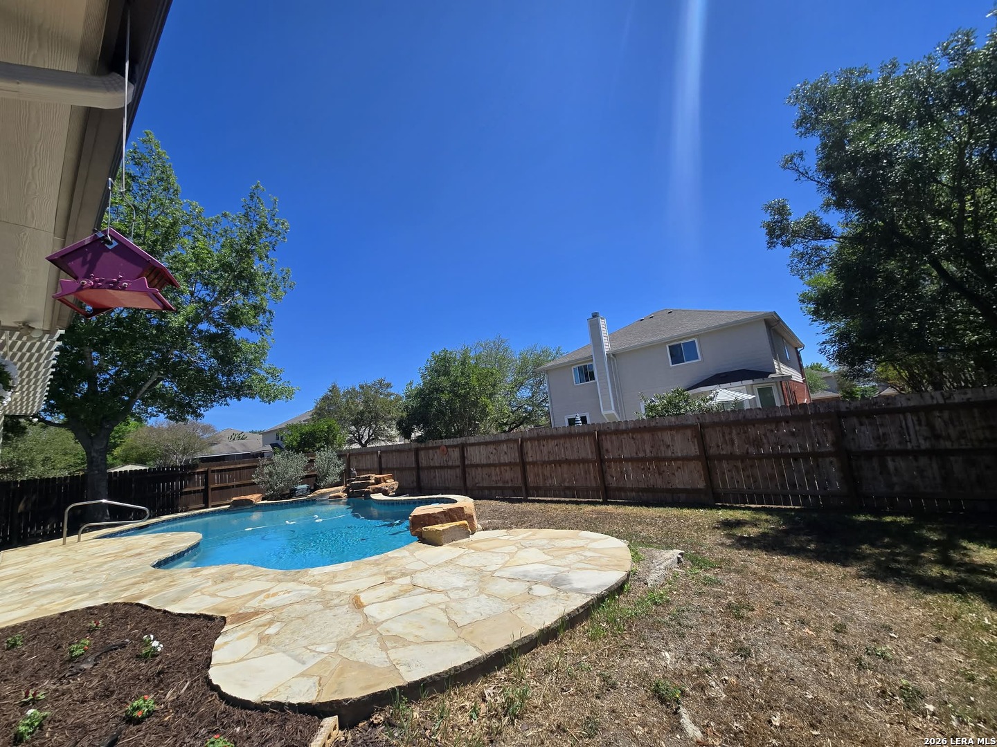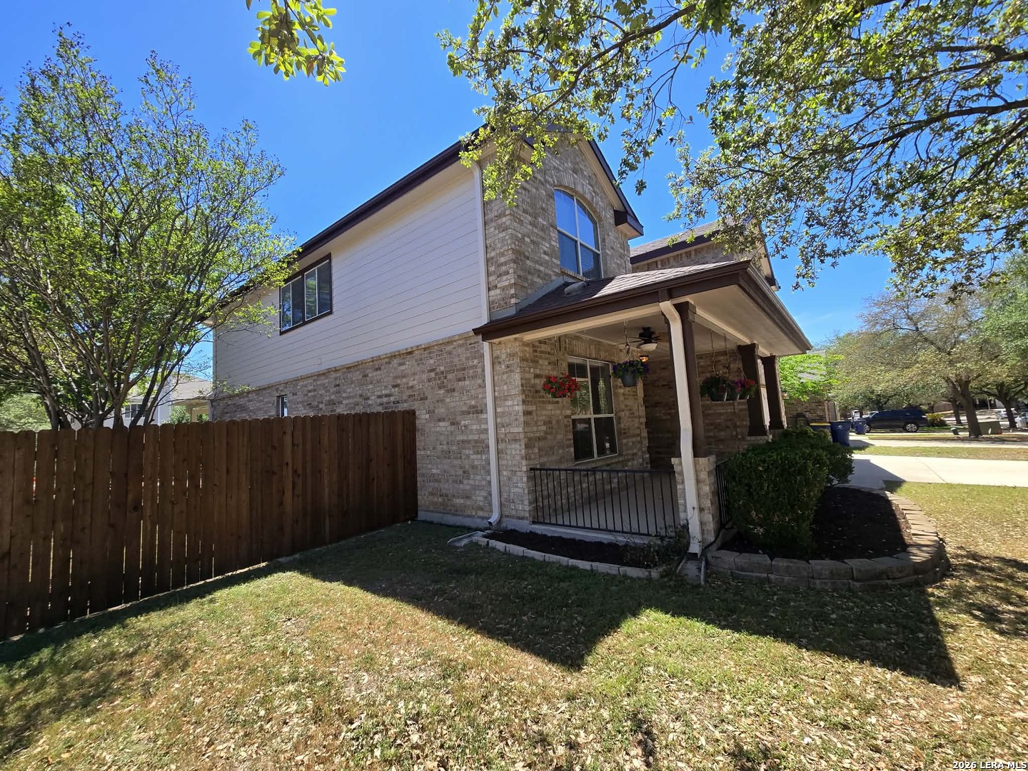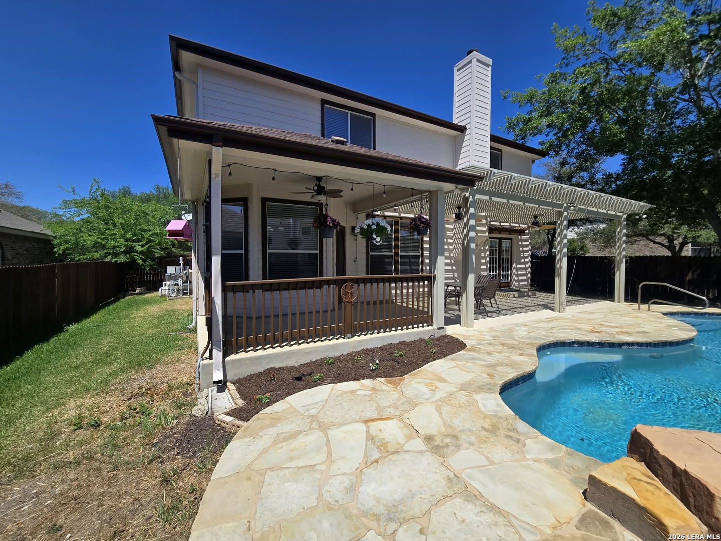Welcome to this beautifully maintained 4-bedroom, 2.5-bath home with a dedicated study, located in the desirable Falcon Ridge community. This spacious, open floor plan offers multiple living areas, including two separate living spaces and an upstairs game room-ideal for both everyday living and entertaining. The kitchen features a custom-built granite center island, stainless steel appliances, granite countertops, glass tile backsplash, and a walk-in pantry. Tile flooring runs through the main living areas, and the home is filled with natural light throughout. The private study includes exterior access, offering flexibility for a home office or workspace. Step outside to enjoy the oversized covered patio, pergola, and in-ground pool-perfect for outdoor gatherings. Additional exterior features include a sprinkler system, water softener, misting system on the patio, side gates on both sides, and an extra-wide gate with street access. The corner lot provides added space and privacy. Conveniently located near schools, shopping, and Randolph AFB. Move-in ready and designed for comfortable indoor and outdoor living.