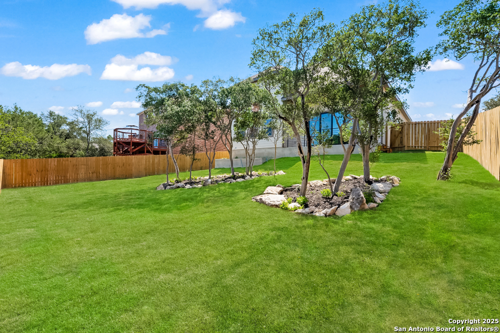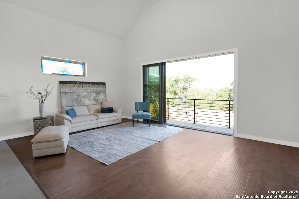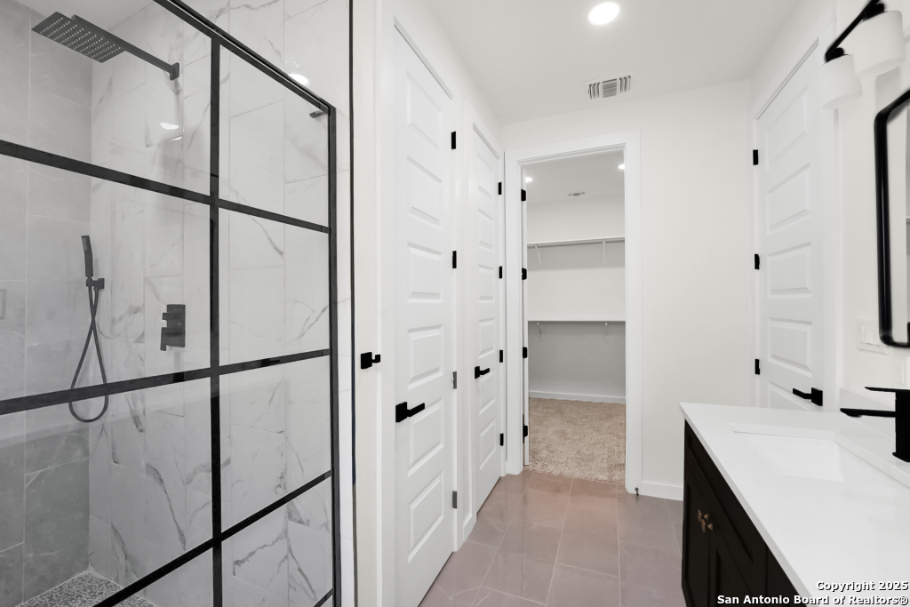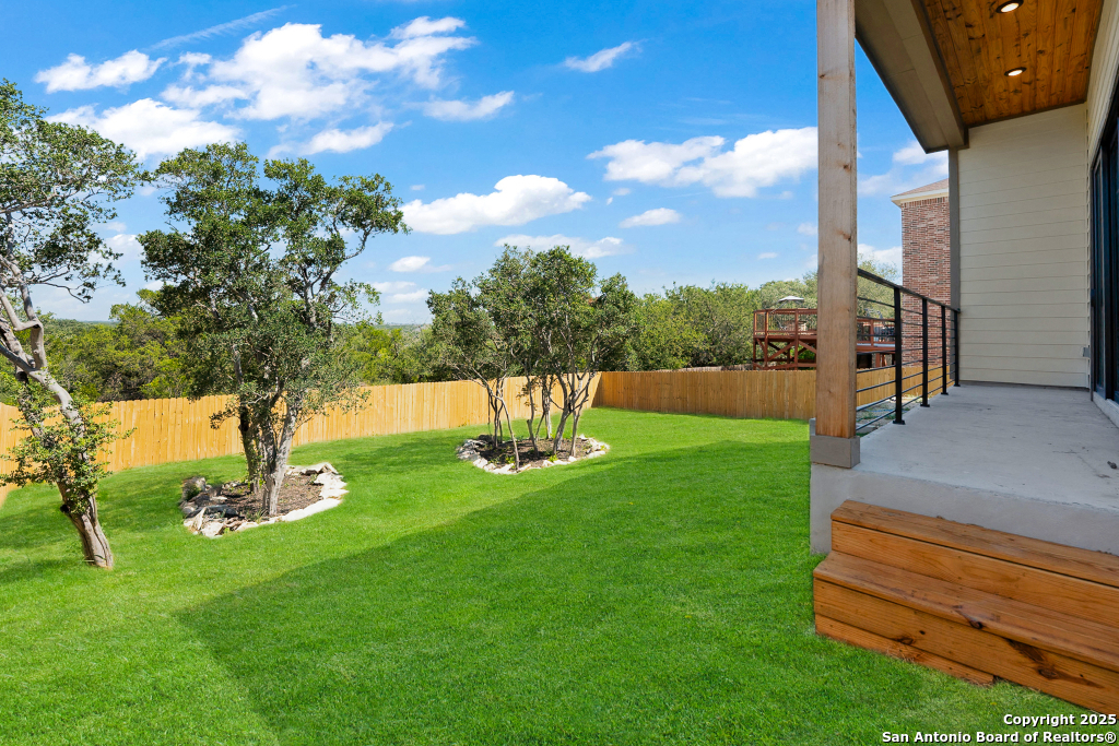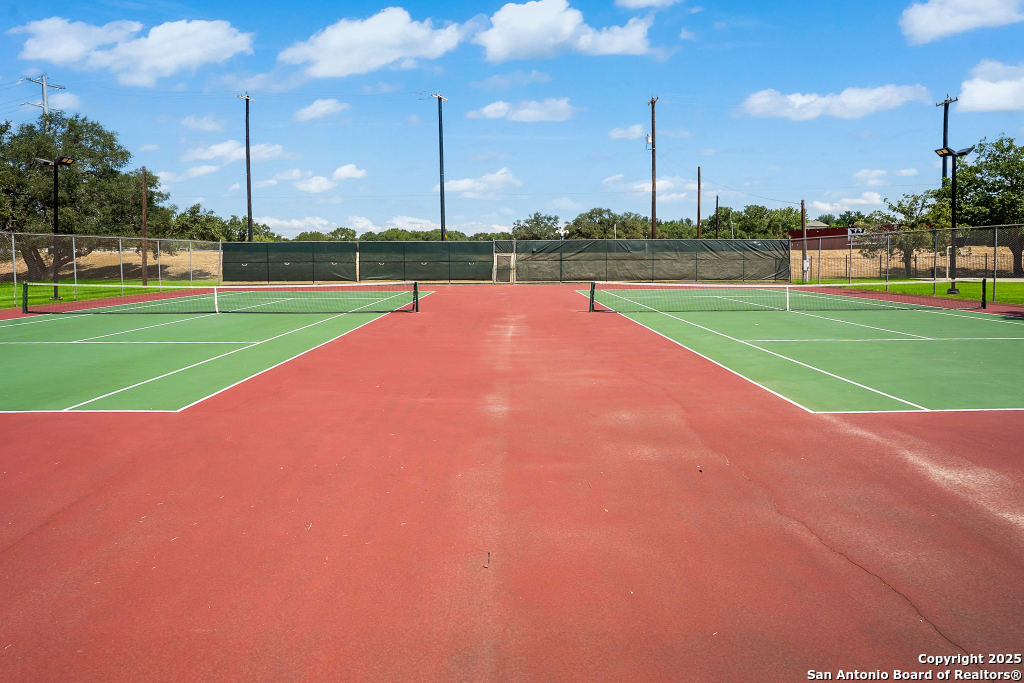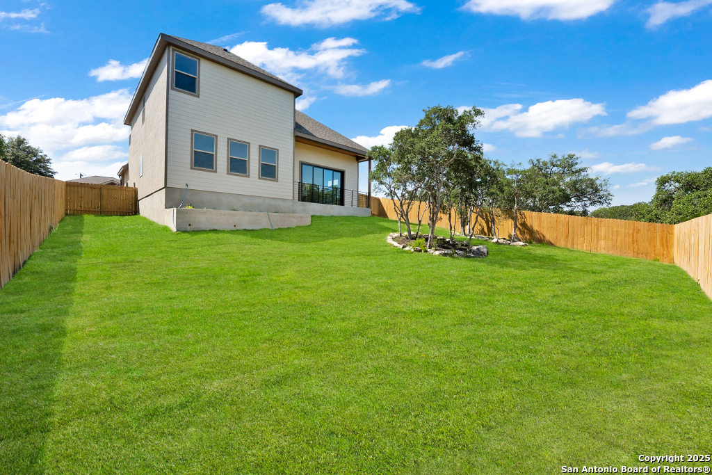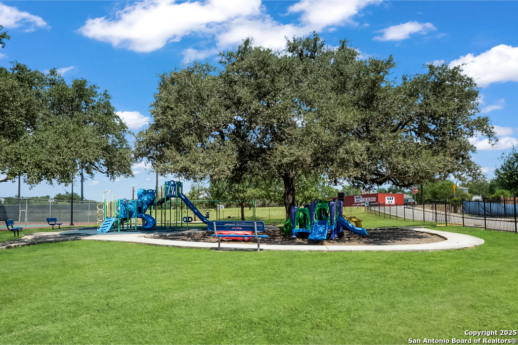 Stunning Home with greenbelt, Hill Country views, and upgraded interior design. Welcome to a beautifully appointed residence that offers both tranquility and privacy, thanks to its dazzling greenbelt backdrop. This home captivates from the curb with its stylish stone and stucco facade, creative landscaping, and an inviting 8-foot wood and iron front door. Step inside to discover sleek 12x24 modern tile and elegant engineered wood flooring that provide a sophisticated foundation throughout the main living areas. The soaring 19-foot ceiling in the living room, paired with expansive windows and a massive 12-foot glass accordion/sliding door, floods the space with natural light and creates a grand, open atmosphere. At the heart of the home is a chef's dream kitchen, featuring custom-designed cabinetry with abundant storage and stunning quartz countertops that elevate both form and function. The main level includes the luxurious primary suite and a secondary bedroom-perfect for guests or a home office-along with a conveniently located laundry room. The primary bathroom is a true retreat, showcasing a large glass-enclosed shower, matte black finishes, and a dual vanity. Upstairs, two additional bedrooms each feature their own full bath and open to a spacious second living area-ideal for a media room, playroom, or teen retreat. Enjoy serene backyard views and take advantage of the vibrant Westcreek community amenities, including a clubhouse, tennis courts, playground, jogging trails, BBQ area, basketball court, and year-round HOA-hosted events. Perfectly situated just minutes from Loop 1604, Hwy 90, Hwy 151, Lackland AFB (15 minutes), SeaWorld (10 minutes), and a variety of shopping, dining, and entertainment options.. Home provides the convenience of an EV charger and a garage door opener.