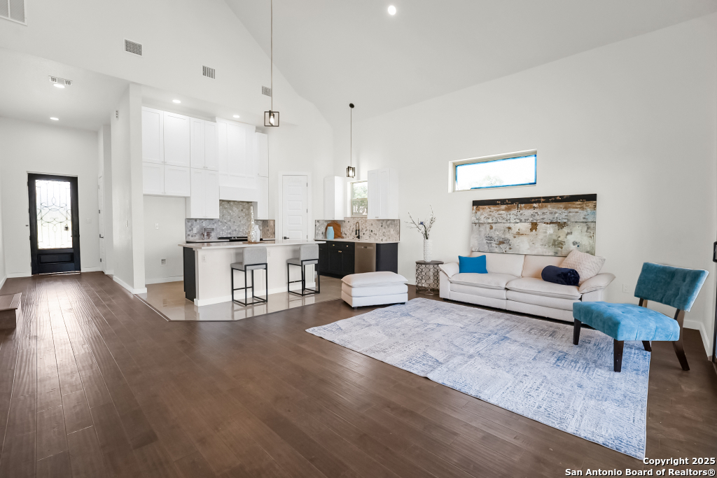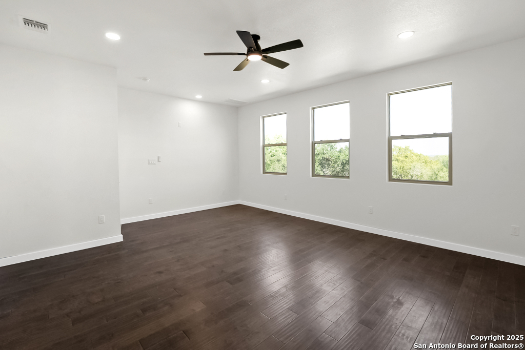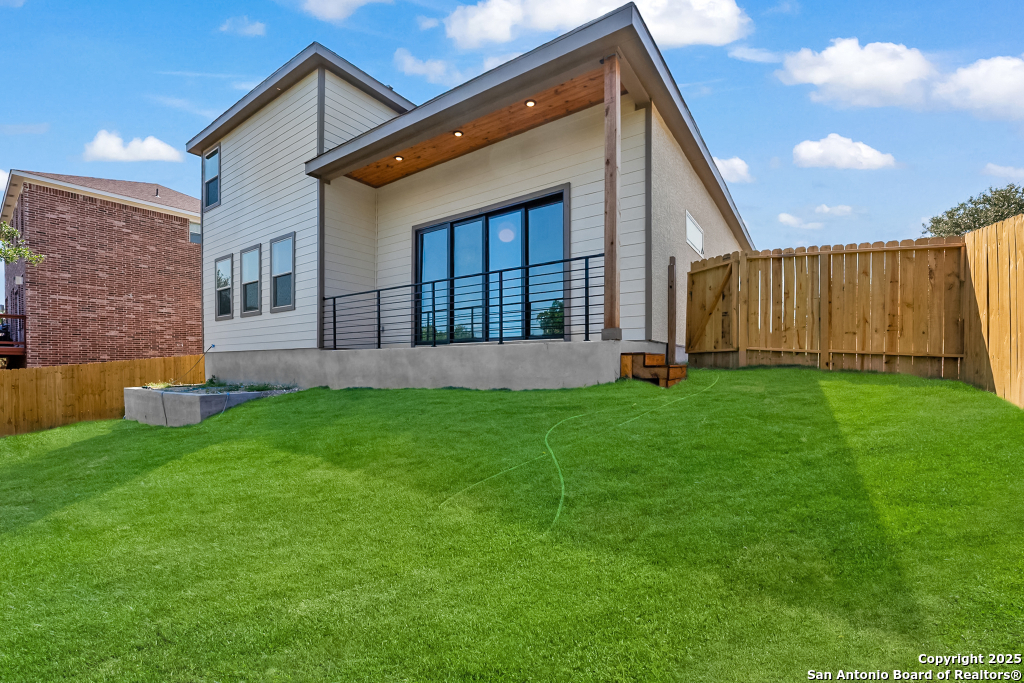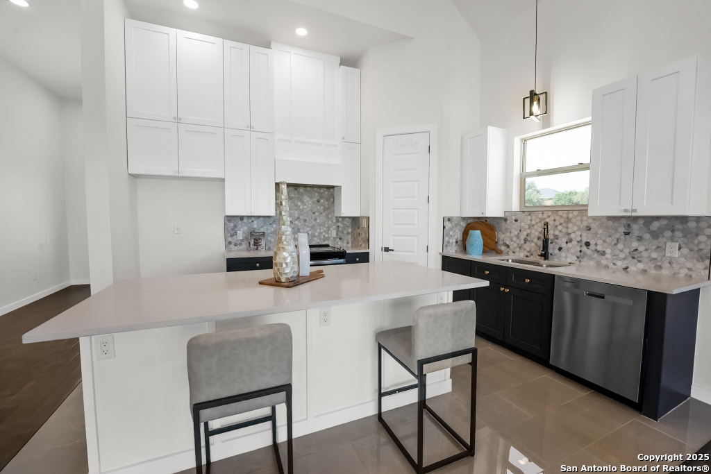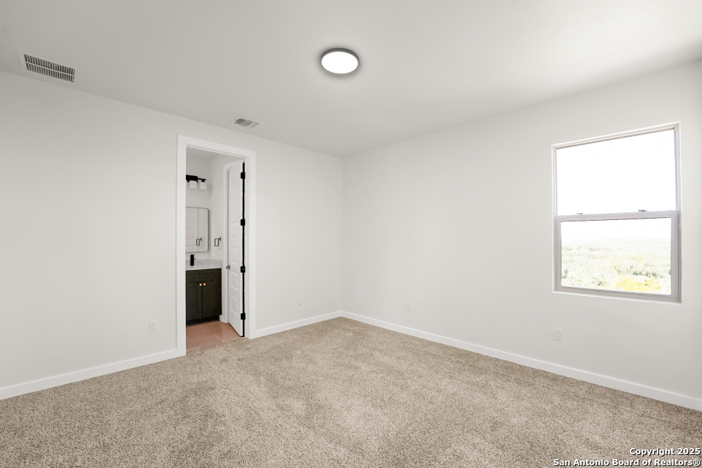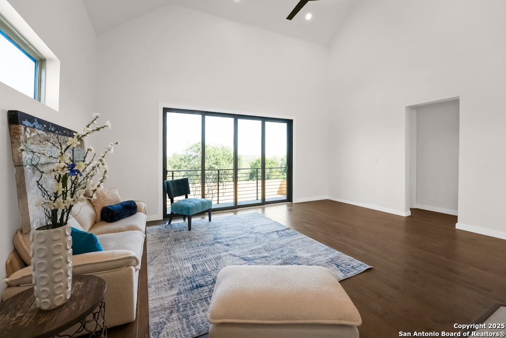 Stunning Home with greenbelt, Hill Country views, and upgraded interior design. Welcome to a beautifully appointed residence that offers both tranquility and privacy, thanks to its dazzling greenbelt backdrop. This home captivates from the curb with its stylish stone and stucco facade, creative landscaping, and an inviting 8-foot wood and iron front door. Step inside to discover sleek 12x24 modern tile and elegant engineered wood flooring that provide a sophisticated foundation throughout the main living areas. The soaring 19-foot ceiling in the living room, paired with expansive windows and a massive 12-foot glass accordion/sliding door, floods the space with natural light and creates a grand, open atmosphere. At the heart of the home is a chef's dream kitchen, featuring custom-designed cabinetry with abundant storage and stunning quartz countertops that elevate both form and function. The main level includes the luxurious primary suite and a secondary bedroom-perfect for guests or a home office-along with a conveniently located laundry room. The primary bathroom is a true retreat, showcasing a large glass-enclosed shower, matte black finishes, and a dual vanity. Upstairs, two additional bedrooms each feature their own full bath and open to a spacious second living area-ideal for a media room, playroom, or teen retreat. Enjoy serene backyard views and take advantage of the vibrant Westcreek community amenities, including a clubhouse, tennis courts, playground, jogging trails, BBQ area, basketball court, and year-round HOA-hosted events. Perfectly situated just minutes from Loop 1604, Hwy 90, Hwy 151, Lackland AFB (15 minutes), SeaWorld (10 minutes), and a variety of shopping, dining, and entertainment options.. Home provides the convenience of an EV charger and a garage door opener.