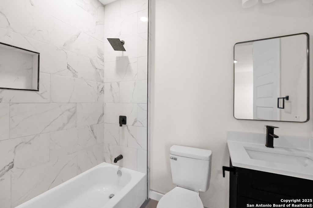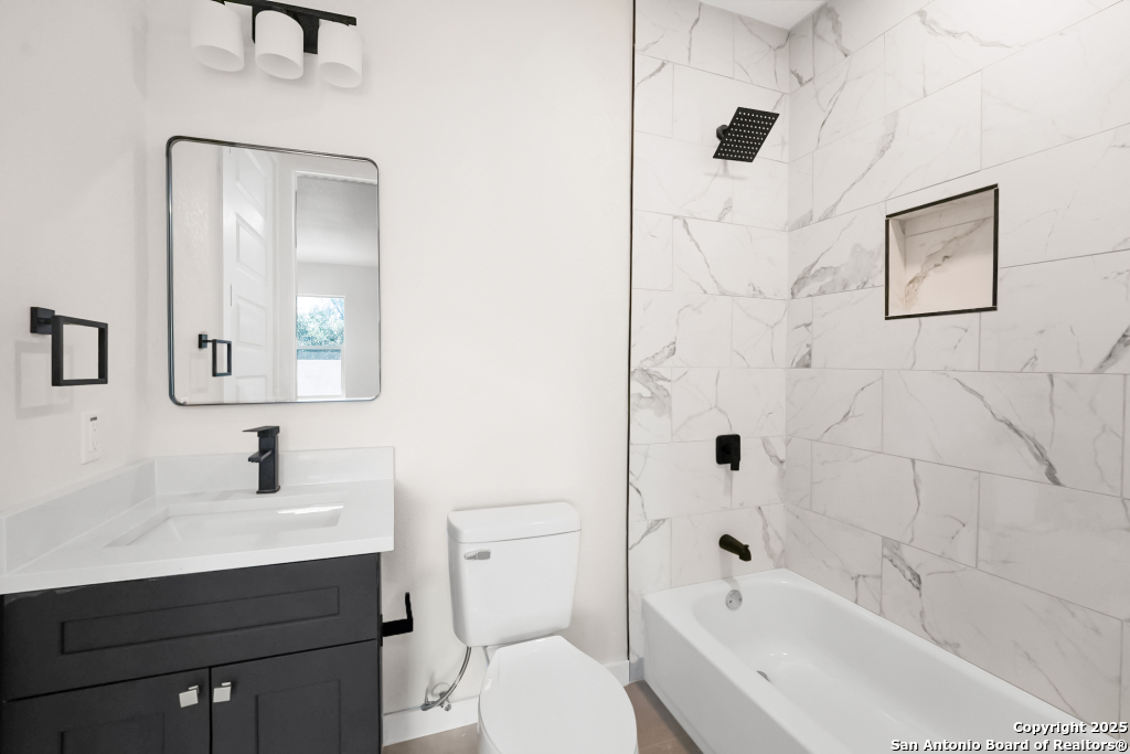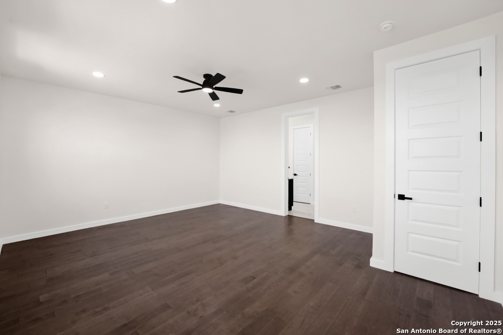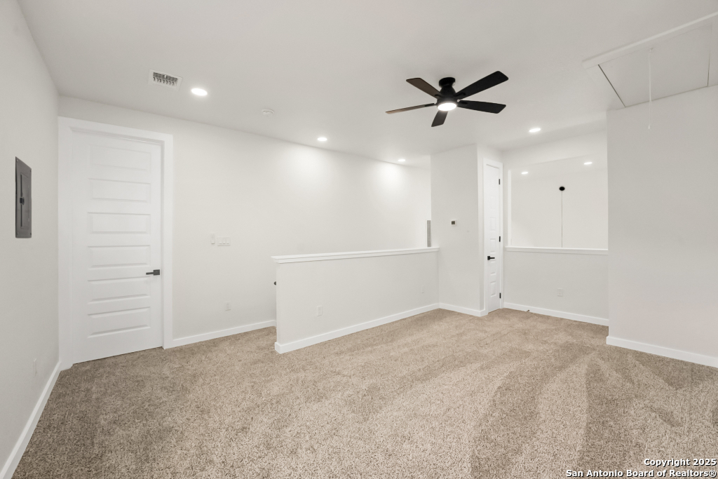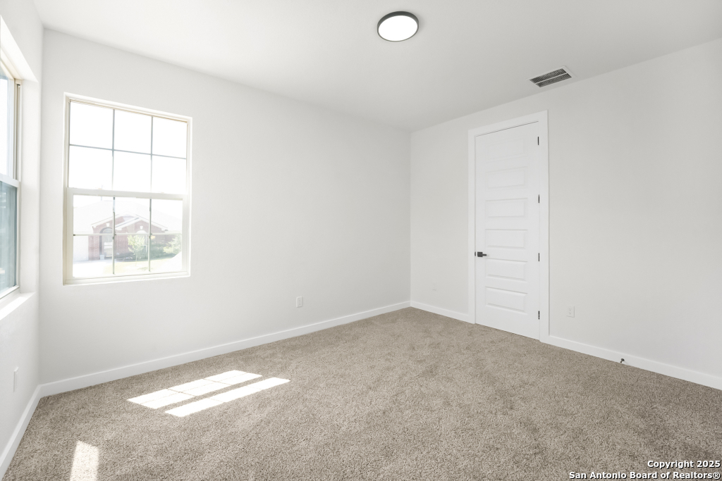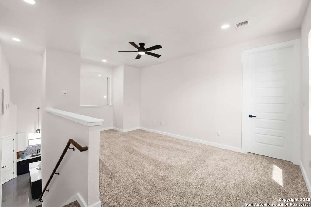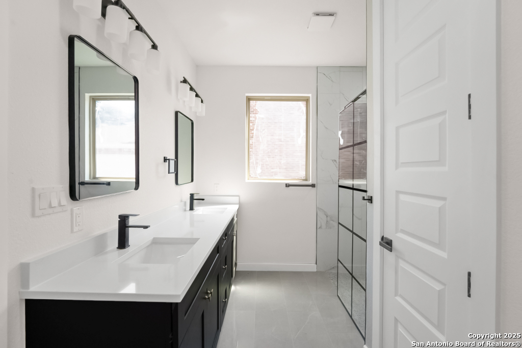 Stunning Home with greenbelt, Hill Country views, and upgraded interior design. Welcome to a beautifully appointed residence that offers both tranquility and privacy, thanks to its dazzling greenbelt backdrop. This home captivates from the curb with its stylish stone and stucco facade, creative landscaping, and an inviting 8-foot wood and iron front door. Step inside to discover sleek 12x24 modern tile and elegant engineered wood flooring that provide a sophisticated foundation throughout the main living areas. The soaring 19-foot ceiling in the living room, paired with expansive windows and a massive 12-foot glass accordion/sliding door, floods the space with natural light and creates a grand, open atmosphere. At the heart of the home is a chef's dream kitchen, featuring custom-designed cabinetry with abundant storage and stunning quartz countertops that elevate both form and function. The main level includes the luxurious primary suite and a secondary bedroom-perfect for guests or a home office-along with a conveniently located laundry room. The primary bathroom is a true retreat, showcasing a large glass-enclosed shower, matte black finishes, and a dual vanity. Upstairs, two additional bedrooms each feature their own full bath and open to a spacious second living area-ideal for a media room, playroom, or teen retreat. Enjoy serene backyard views and take advantage of the vibrant Westcreek community amenities, including a clubhouse, tennis courts, playground, jogging trails, BBQ area, basketball court, and year-round HOA-hosted events. Perfectly situated just minutes from Loop 1604, Hwy 90, Hwy 151, Lackland AFB (15 minutes), SeaWorld (10 minutes), and a variety of shopping, dining, and entertainment options.. Home provides the convenience of an EV charger and a garage door opener.
