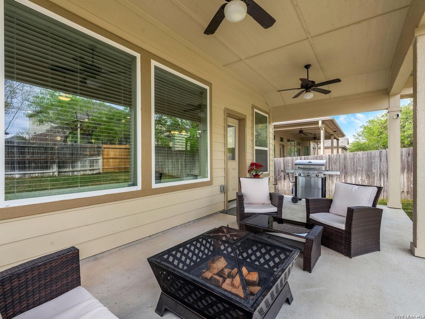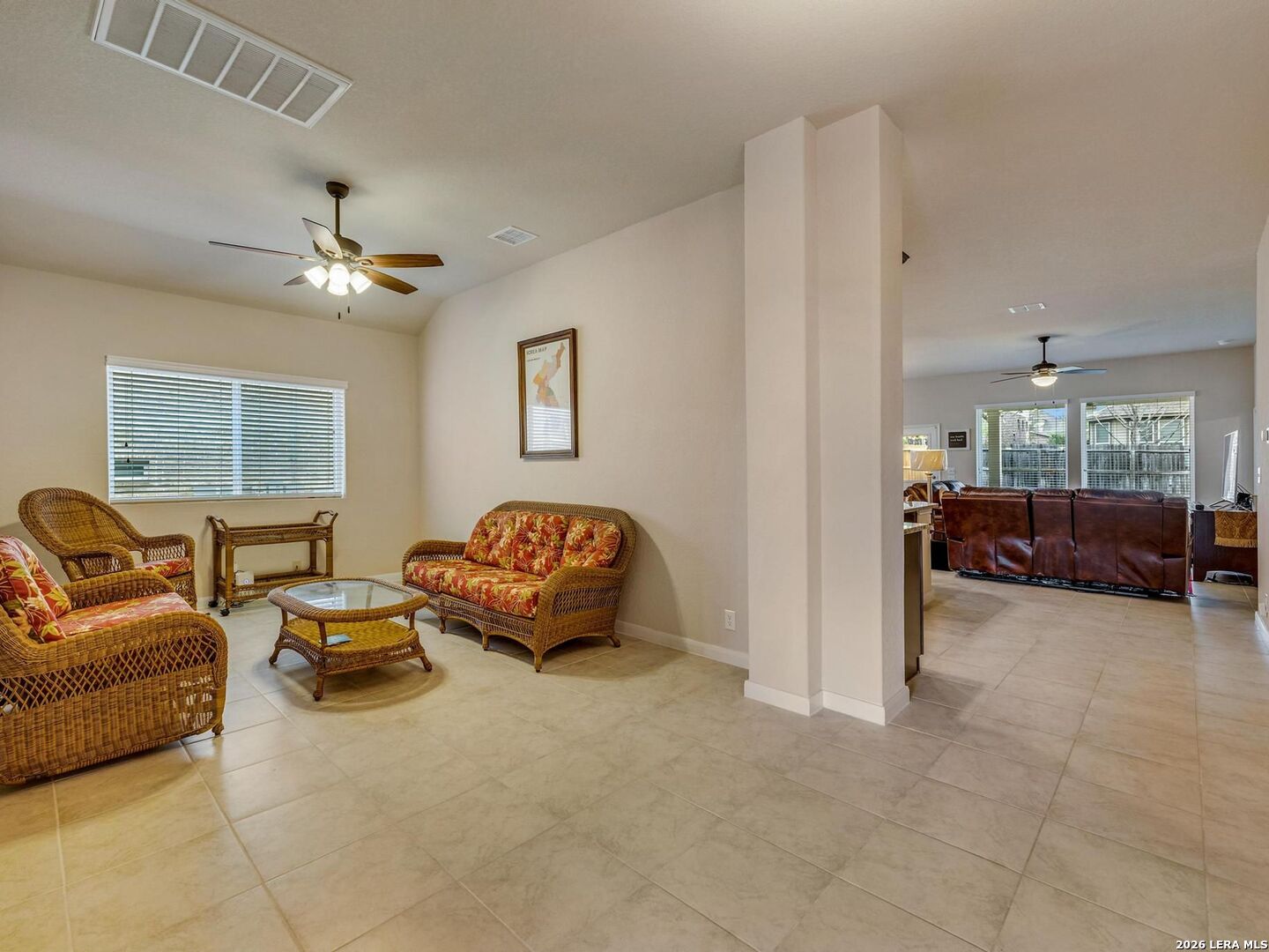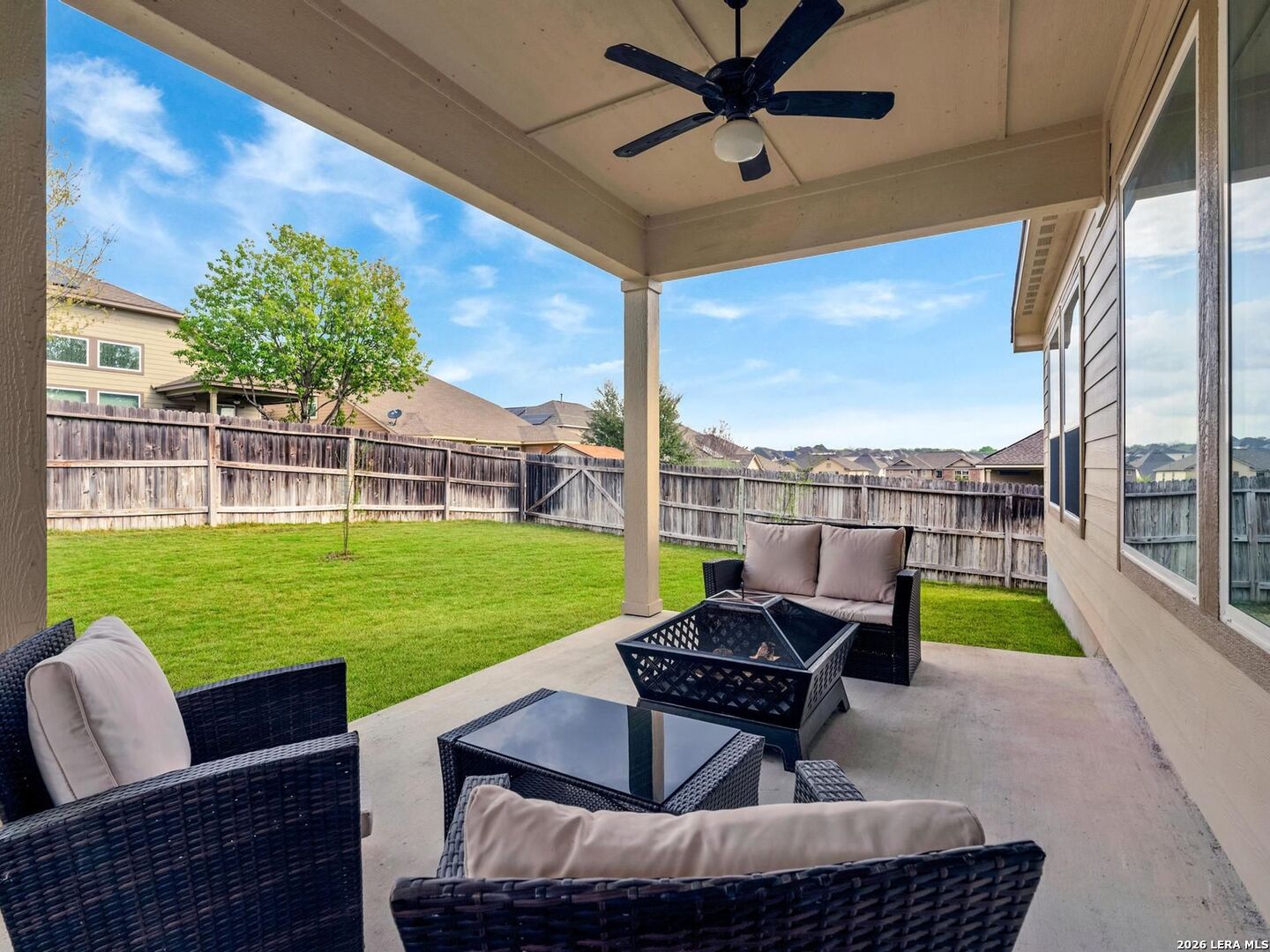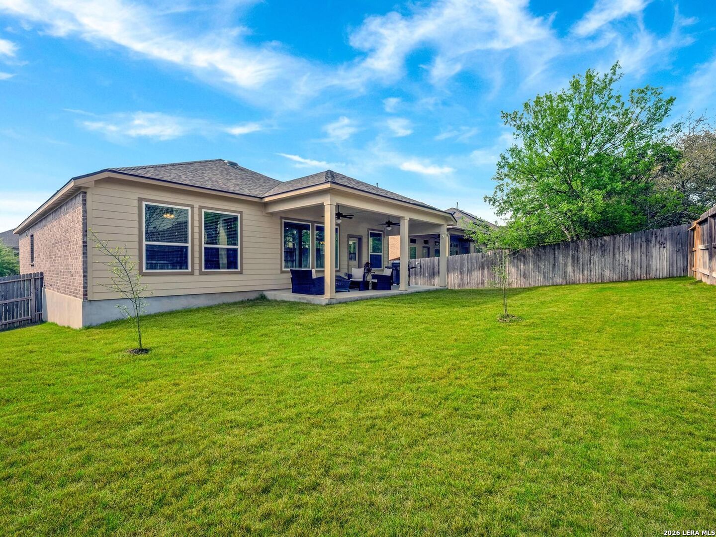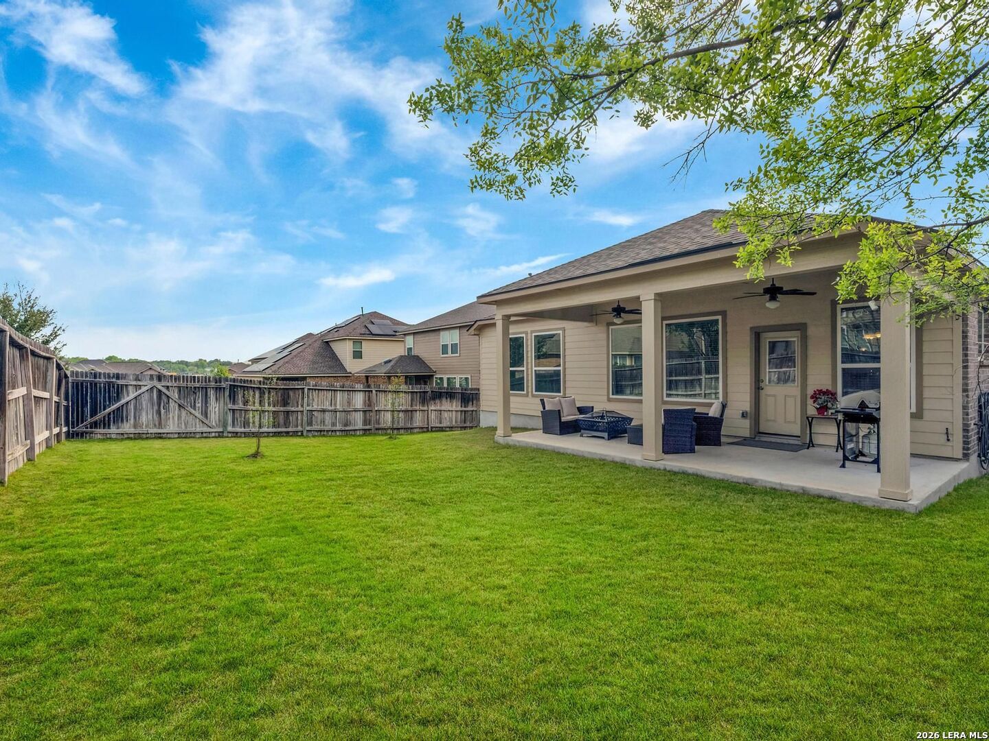 Located in the desirable Weston Oaks community, this beautifully maintained one-story David Weekley home feels like new. Offering 3 bedrooms and 2 full baths, the thoughtfully designed layout combines functionality with modern style. A welcoming front entry opens to a spacious foyer, with secondary bedrooms and a full bath positioned at the front of the home along with additional storage closets. A versatile dining space provides flexibility for entertaining, or can easily function as a home office, second living area, or playroom. The open-concept kitchen is designed for both everyday living and entertaining, featuring a gas cooktop, stainless steel appliances, upgraded cabinetry, and an oversized granite island that flows seamlessly into the living and breakfast areas. Large windows fill the space with natural light and overlook the expansive covered patio. Privately situated at the rear of the home, the primary suite offers a peaceful retreat with views of the fenced backyard. The ensuite bath includes a spacious walk-in shower, dual vanities with granite countertops, and a large walk-in closet. Enjoy outdoor living on the oversized covered patio with a gas hookup-perfect for grilling or relaxing. The extended garage includes a sprinkler system and water softener for added convenience. Ideally located for easy access to Lackland AFB, shopping, dining, and major highways. Residents of Weston Oaks enjoy fantastic amenities, including a community pool and playground.