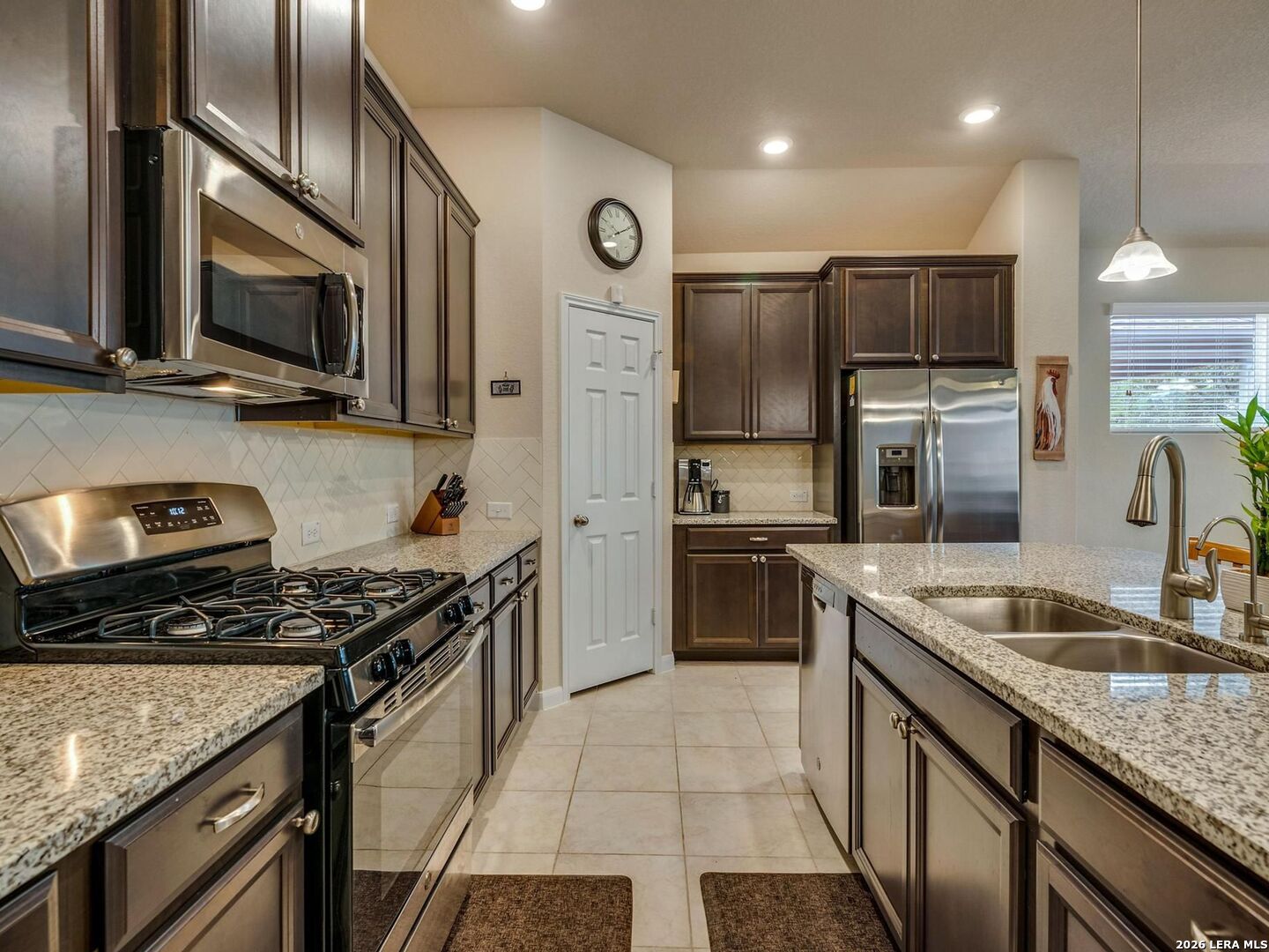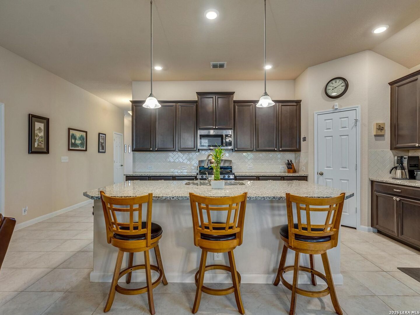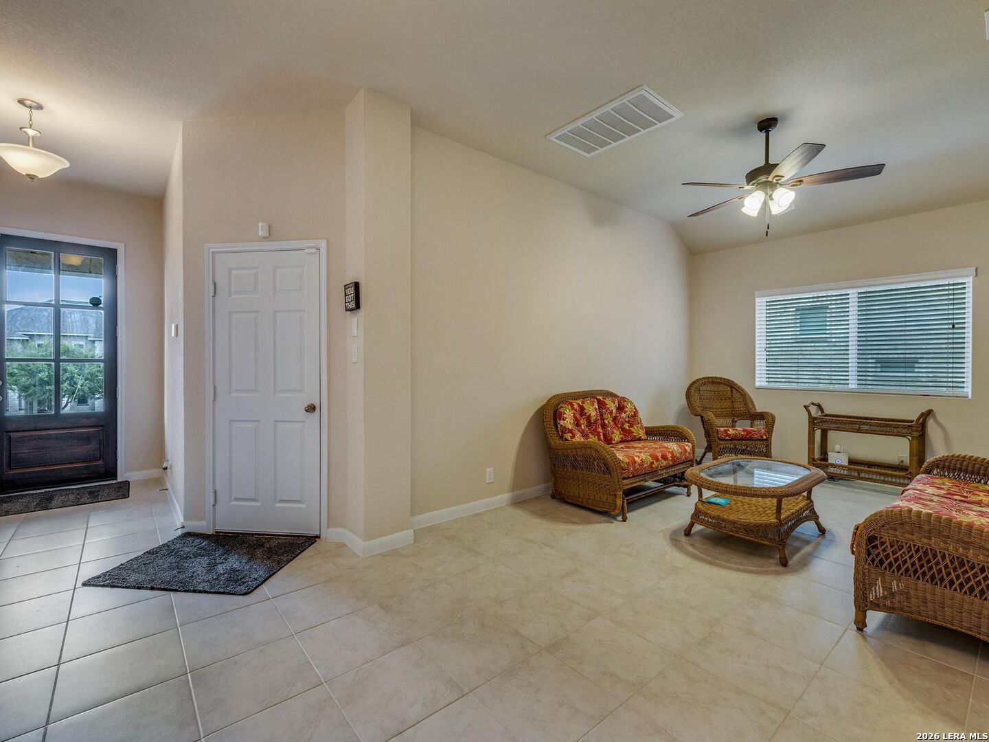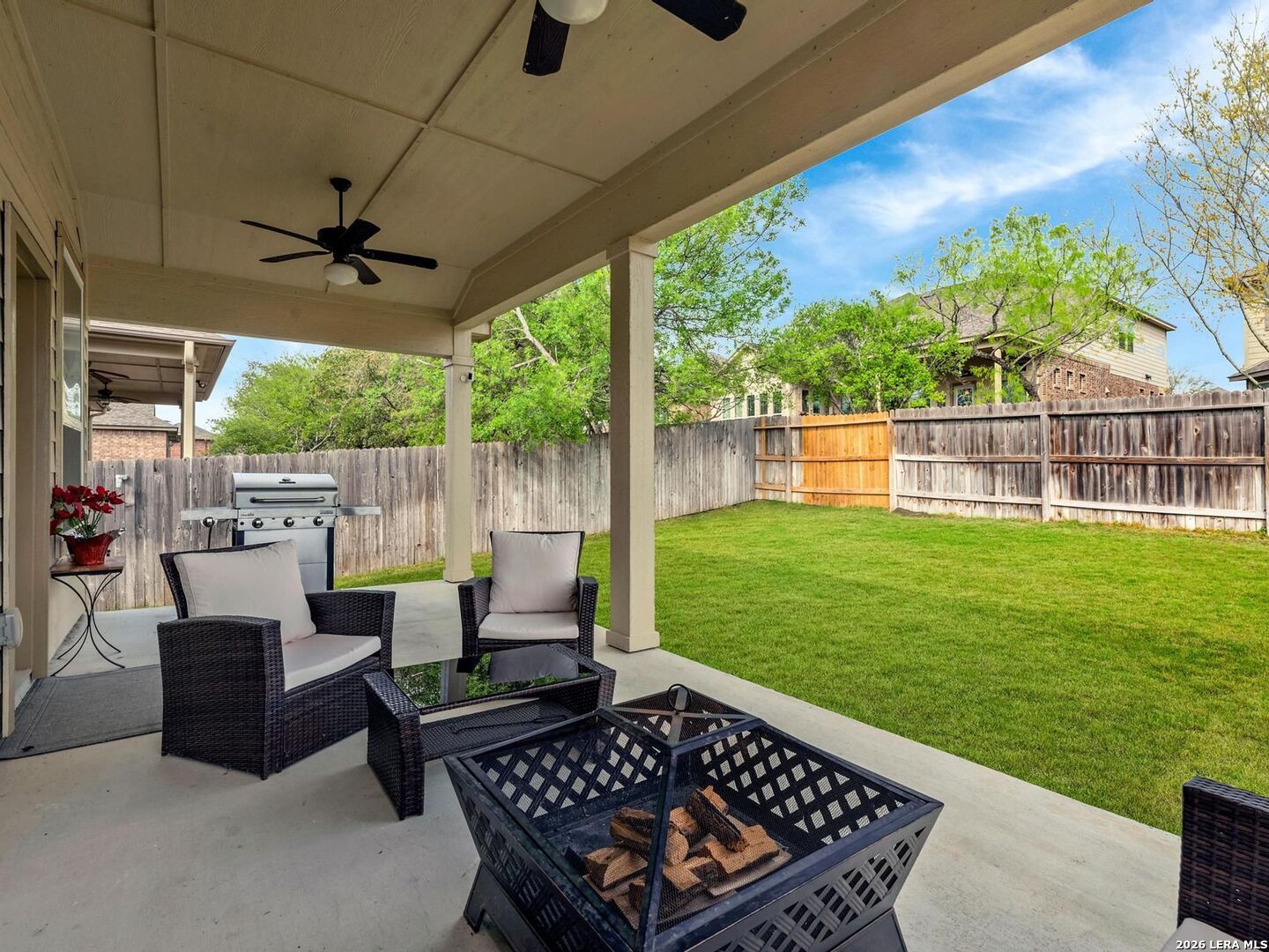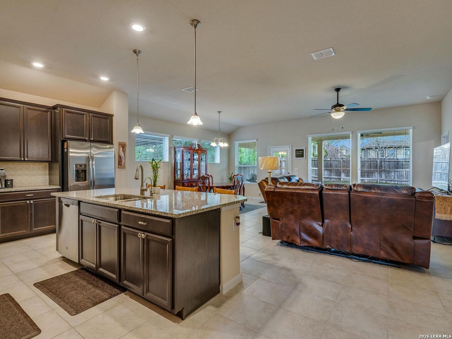 Located in the desirable Weston Oaks community, this beautifully maintained one-story David Weekley home feels like new. Offering 3 bedrooms and 2 full baths, the thoughtfully designed layout combines functionality with modern style. A welcoming front entry opens to a spacious foyer, with secondary bedrooms and a full bath positioned at the front of the home along with additional storage closets. A versatile dining space provides flexibility for entertaining, or can easily function as a home office, second living area, or playroom. The open-concept kitchen is designed for both everyday living and entertaining, featuring a gas cooktop, stainless steel appliances, upgraded cabinetry, and an oversized granite island that flows seamlessly into the living and breakfast areas. Large windows fill the space with natural light and overlook the expansive covered patio. Privately situated at the rear of the home, the primary suite offers a peaceful retreat with views of the fenced backyard. The ensuite bath includes a spacious walk-in shower, dual vanities with granite countertops, and a large walk-in closet. Enjoy outdoor living on the oversized covered patio with a gas hookup-perfect for grilling or relaxing. The extended garage includes a sprinkler system and water softener for added convenience. Ideally located for easy access to Lackland AFB, shopping, dining, and major highways. Residents of Weston Oaks enjoy fantastic amenities, including a community pool and playground.