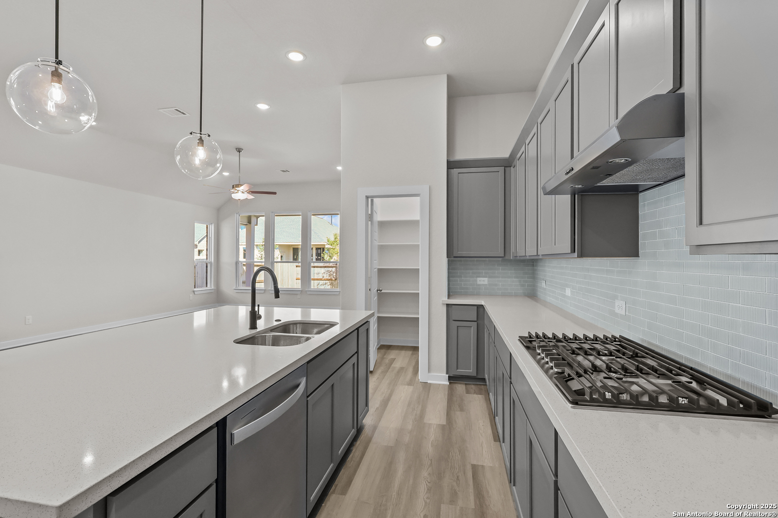 This stunning single-story, 4-bedroom, 3-bathroom Gaines floorplan spans over 2,200 sq. ft. and boasts 11-foot ceilings and strategically placed energy-efficient windows throughout. The spacious kitchen, featuring an island, stainless steel appliances, and gas cooktop, seamlessly flows into the dining area, creating an ideal space for entertaining. The primary suite, with a beautiful bay window, bathes the room in natural light and provides extra sitting space for relaxation. Bedroom 4, with its own private bathroom, serves as a perfect secondary suite for guests or family. With a 3-side brick exterior and an upgraded elevation, this home offers both elegance and functionality. Don't miss the opportunity to experience this exceptional property-schedule your tour today!