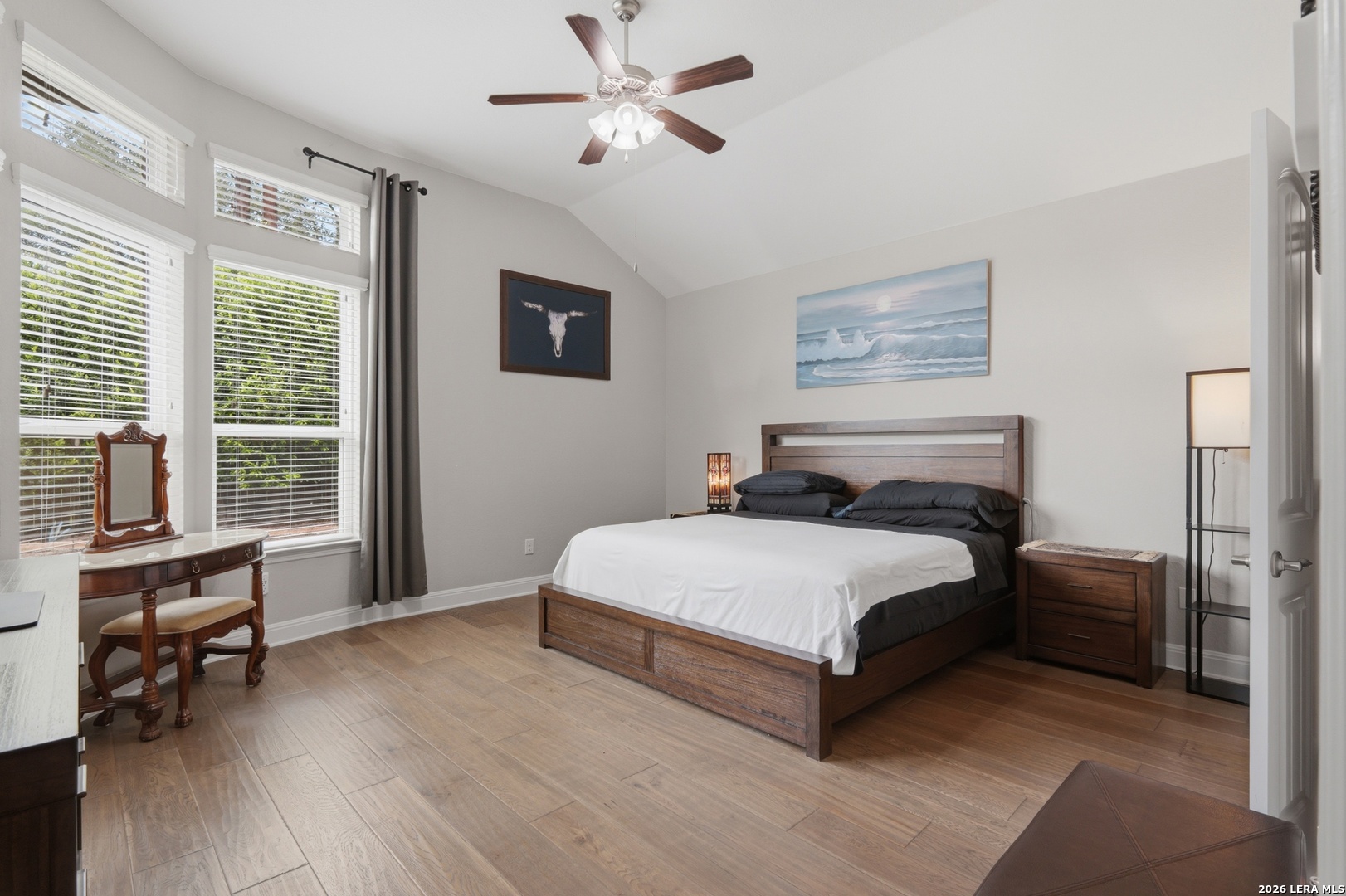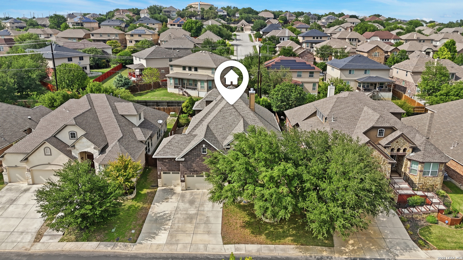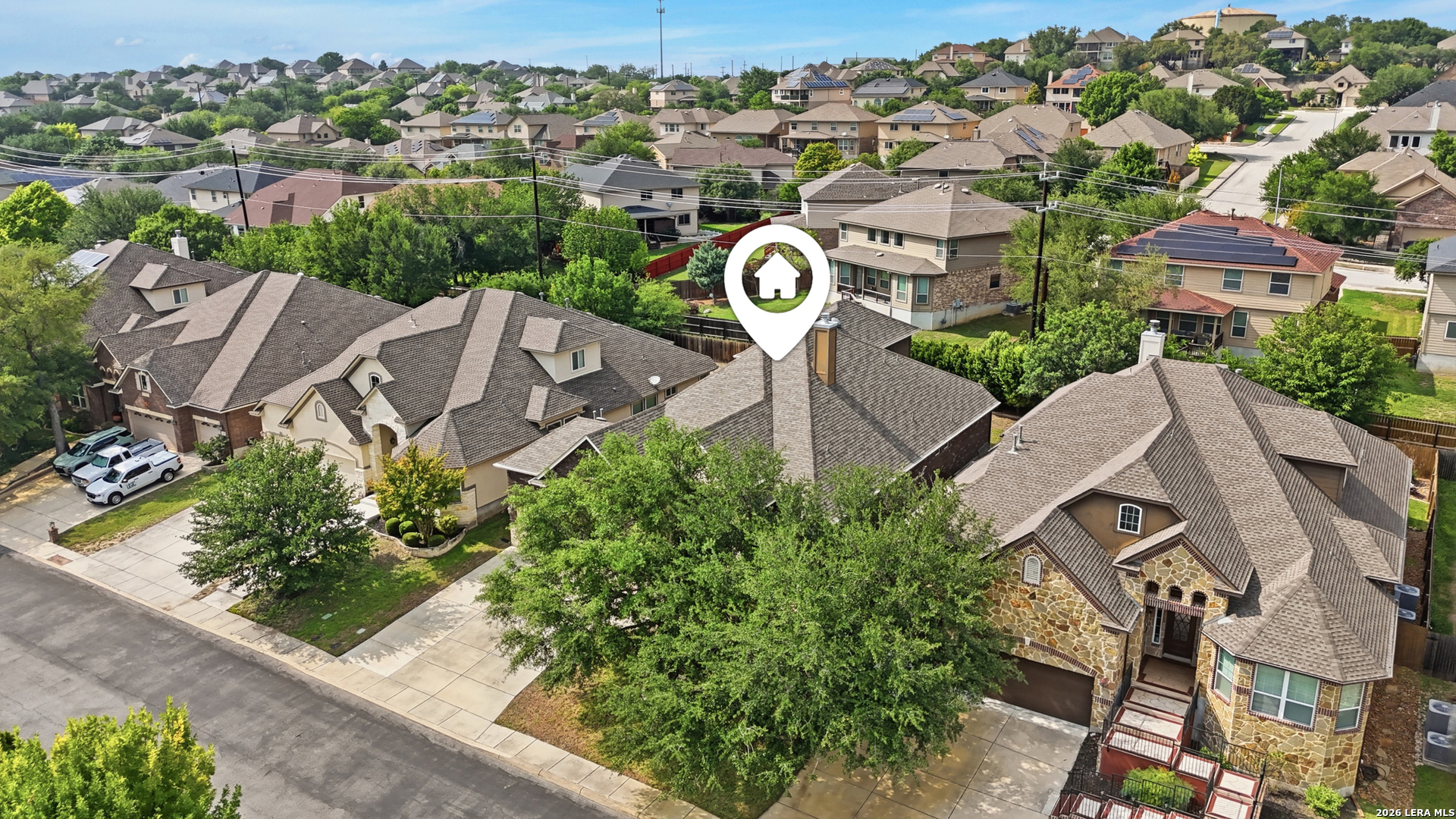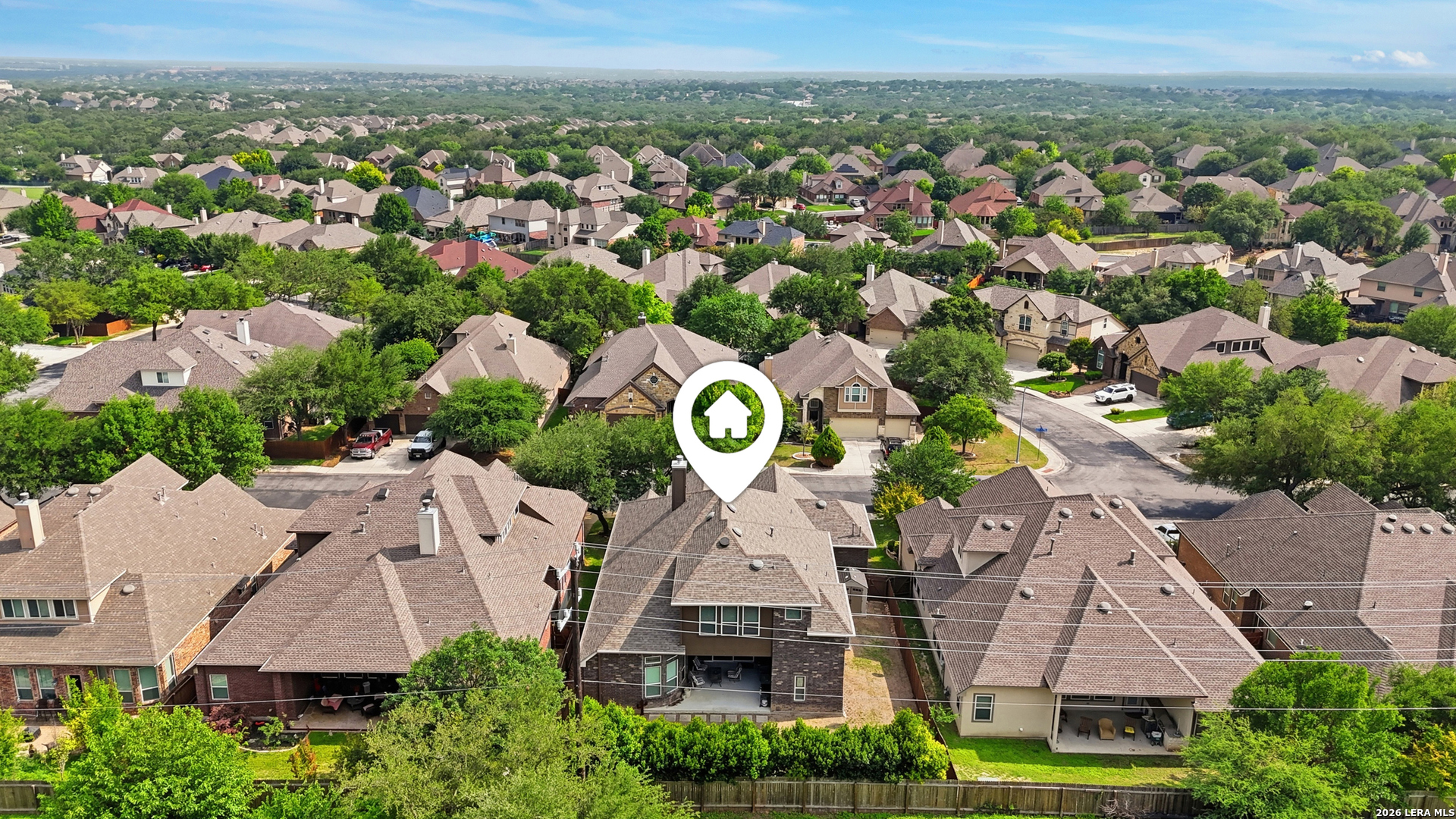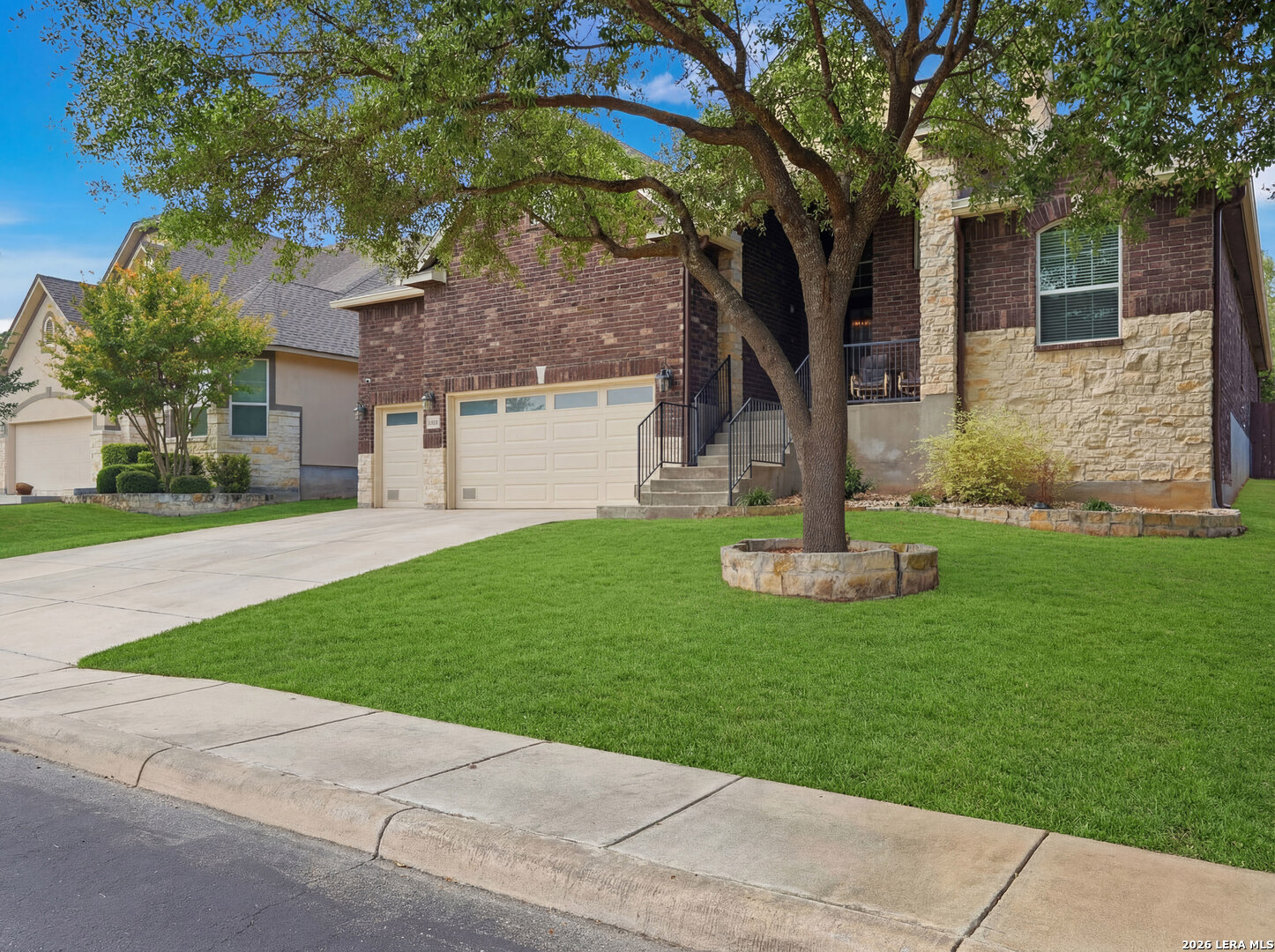 Nestled in the highly desirable gated community of Summit at Alamo Ranch, this exceptional property offers the ideal blend of comfort, style, and convenience. Located just minutes from HEB Plus, Loop 1604, and a wide variety of shopping and dining, everyday living is effortless. From the moment you arrive, the curb appeal makes a lasting impression. This four-sided masonry home showcases a beautiful blend of brick and stone, a spacious three-car garage, and an extended driveway with ample parking. A charming front patio invites you to enjoy peaceful mornings or relaxing evenings. Step inside to soaring 12-foot ceilings that set the tone for the open and airy layout. Natural light pours in through expansive windows and panoramic sliding glass doors that fully open, creating a seamless indoor-outdoor experience. French oak flooring flows throughout the main living areas, with luxury vinyl plank in the guest bedrooms, offering a completely carpet-free home. The living room is both spacious and inviting, featuring a modern gas fireplace accented by a stunning wood beam. Just off the living area, the formal dining room offers flexibility as a home office and is complemented by a bright breakfast nook nearby. The kitchen is truly a chef's dream, complete with an oversized island, granite countertops, soft-close custom cabinetry, and built-in appliances. A five-burner gas cooktop anchors the space, while a walk-in pantry leads to a generously sized laundry room with additional storage and a second refrigerator. Even better, all appliances convey with the home. This thoughtfully designed 1.5-story layout features three bedrooms on the main floor, including a private primary suite tucked away on one side of the home. The primary retreat offers high ceilings, abundant natural light, and a luxurious ensuite with dual vanities, a walk-in shower, and a spacious walk-in closet. Two secondary bedrooms are located on the opposite side, each with walk-in closets and access to a full bathroom with double sinks and a walk-in shower. A conveniently located half bath near the entry is perfect for guests. Upstairs, a large fourth bedroom with its own ensuite bathroom and walk-in closet provides incredible flexibility. With its generous size, it can easily function as a second primary suite, guest quarters, or a multi-generational living space. The three-car garage features high ceilings, overhead storage racks, a cooling fan system, and new garage doors installed in 2019. Step outside to an extended covered patio, ideal for entertaining, along with a spacious backyard featuring mature landscaping, a full sprinkler system, and an additional storage shed that will convey. Recent updates add even more value, including a roof replaced just three years ago, newer gutters, a water softener installed in 2022, a reverse osmosis water filtration system, and two water heaters replaced in 2023. The panoramic sliding doors are also equipped with automatic blinds for added convenience. Residents of Summit at Alamo Ranch enjoy access to fantastic community amenities, including a pool, playground, tennis courts, and basketball courts, all within a gated neighborhood zoned to top-rated schools. Come experience everything this incredible home has to offer and make it your own!