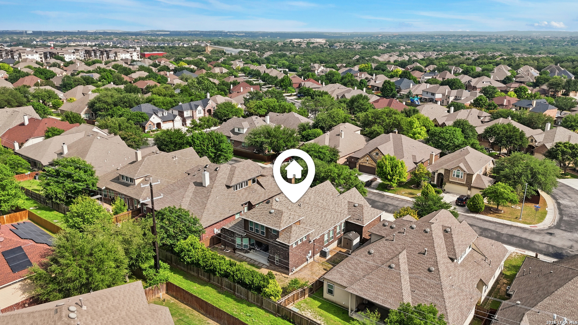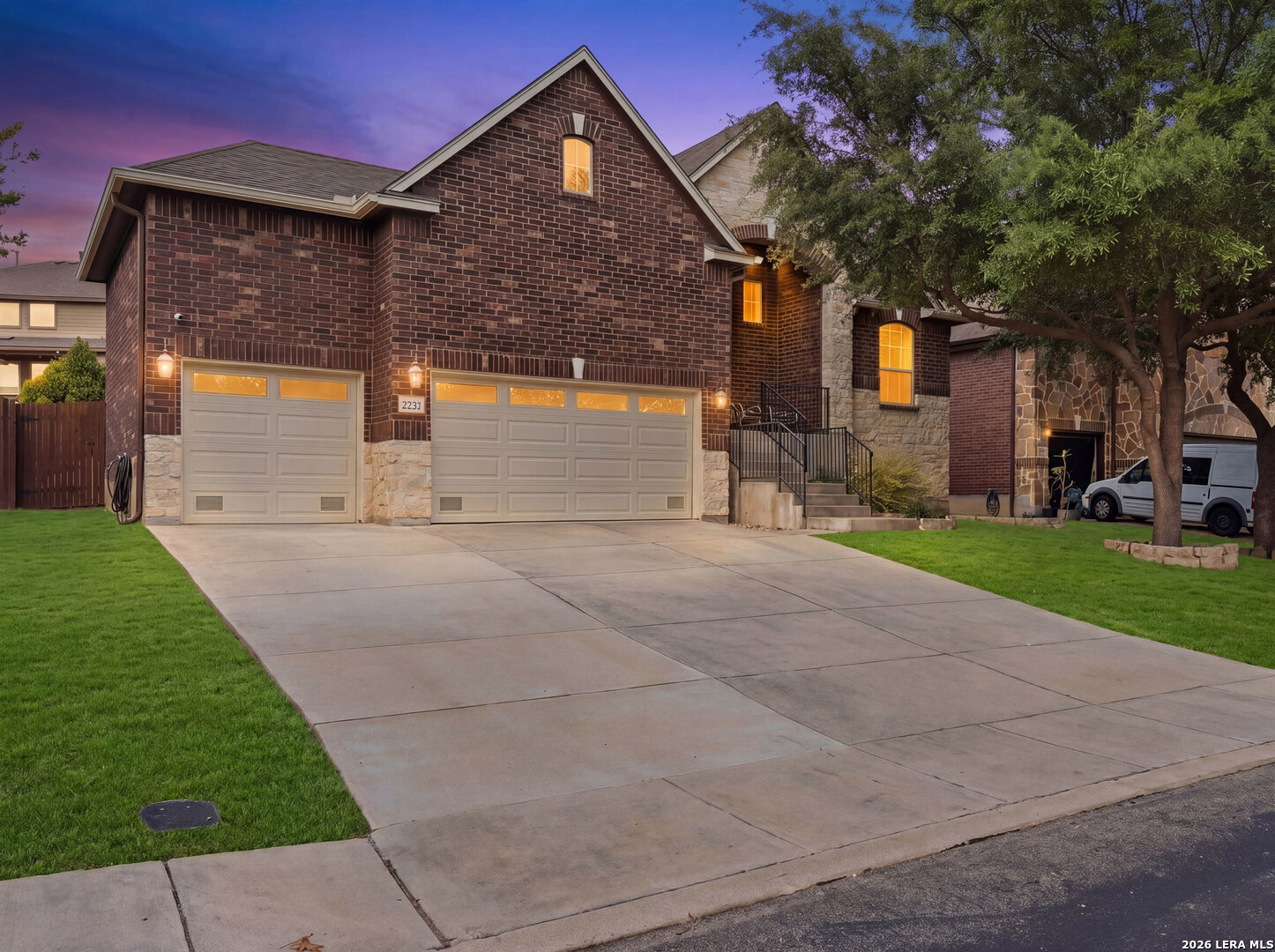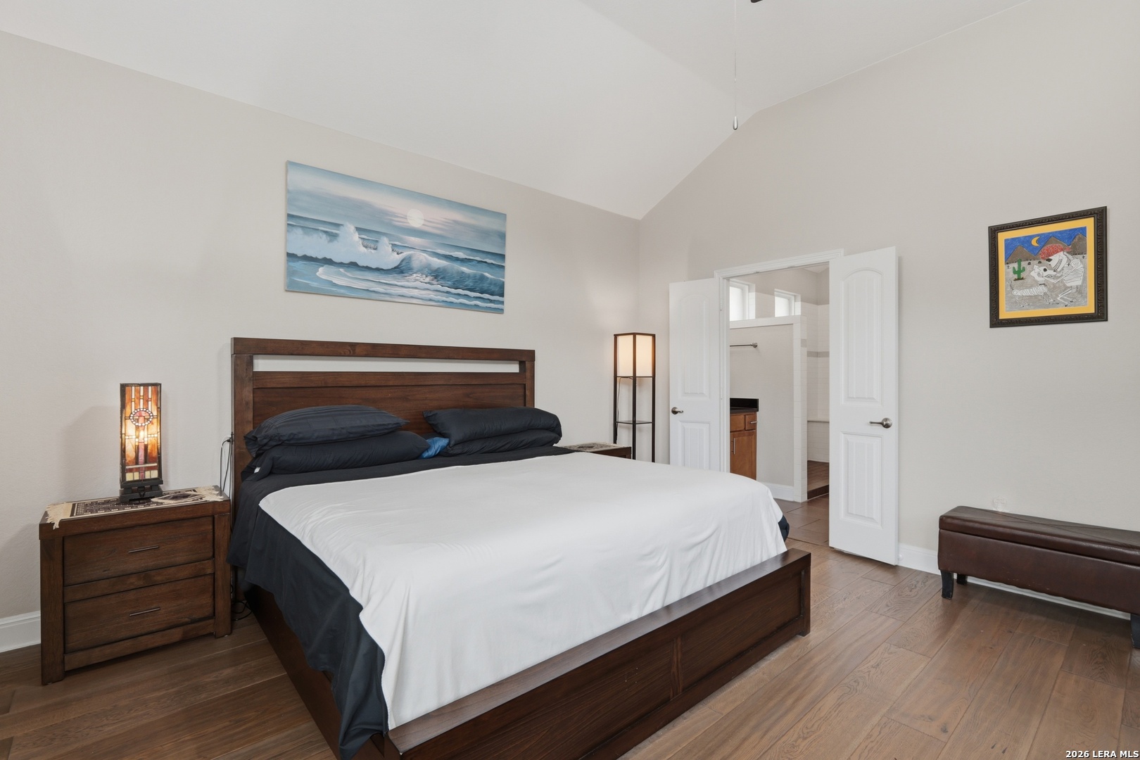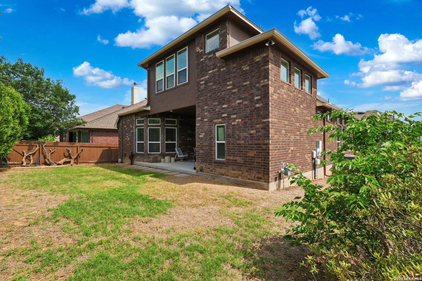 Nestled in the highly desirable gated community of Summit at Alamo Ranch, this exceptional property offers the ideal blend of comfort, style, and convenience. Located just minutes from HEB Plus, Loop 1604, and a wide variety of shopping and dining, everyday living is effortless. From the moment you arrive, the curb appeal makes a lasting impression. This four-sided masonry home showcases a beautiful blend of brick and stone, a spacious three-car garage, and an extended driveway with ample parking. A charming front patio invites you to enjoy peaceful mornings or relaxing evenings. Step inside to soaring 12-foot ceilings that set the tone for the open and airy layout. Natural light pours in through expansive windows and panoramic sliding glass doors that fully open, creating a seamless indoor-outdoor experience. French oak flooring flows throughout the main living areas, with luxury vinyl plank in the guest bedrooms, offering a completely carpet-free home. The living room is both spacious and inviting, featuring a modern gas fireplace accented by a stunning wood beam. Just off the living area, the formal dining room offers flexibility as a home office and is complemented by a bright breakfast nook nearby. The kitchen is truly a chef's dream, complete with an oversized island, granite countertops, soft-close custom cabinetry, and built-in appliances. A five-burner gas cooktop anchors the space, while a walk-in pantry leads to a generously sized laundry room with additional storage and a second refrigerator. Even better, all appliances convey with the home. This thoughtfully designed 1.5-story layout features three bedrooms on the main floor, including a private primary suite tucked away on one side of the home. The primary retreat offers high ceilings, abundant natural light, and a luxurious ensuite with dual vanities, a walk-in shower, and a spacious walk-in closet. Two secondary bedrooms are located on the opposite side, each with walk-in closets and access to a full bathroom with double sinks and a walk-in shower. A conveniently located half bath near the entry is perfect for guests. Upstairs, a large fourth bedroom with its own ensuite bathroom and walk-in closet provides incredible flexibility. With its generous size, it can easily function as a second primary suite, guest quarters, or a multi-generational living space. The three-car garage features high ceilings, overhead storage racks, a cooling fan system, and new garage doors installed in 2019. Step outside to an extended covered patio, ideal for entertaining, along with a spacious backyard featuring mature landscaping, a full sprinkler system, and an additional storage shed that will convey. Recent updates add even more value, including a roof replaced just three years ago, newer gutters, a water softener installed in 2022, a reverse osmosis water filtration system, and two water heaters replaced in 2023. The panoramic sliding doors are also equipped with automatic blinds for added convenience. Residents of Summit at Alamo Ranch enjoy access to fantastic community amenities, including a pool, playground, tennis courts, and basketball courts, all within a gated neighborhood zoned to top-rated schools. Come experience everything this incredible home has to offer and make it your own!