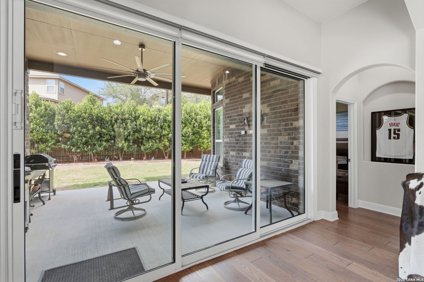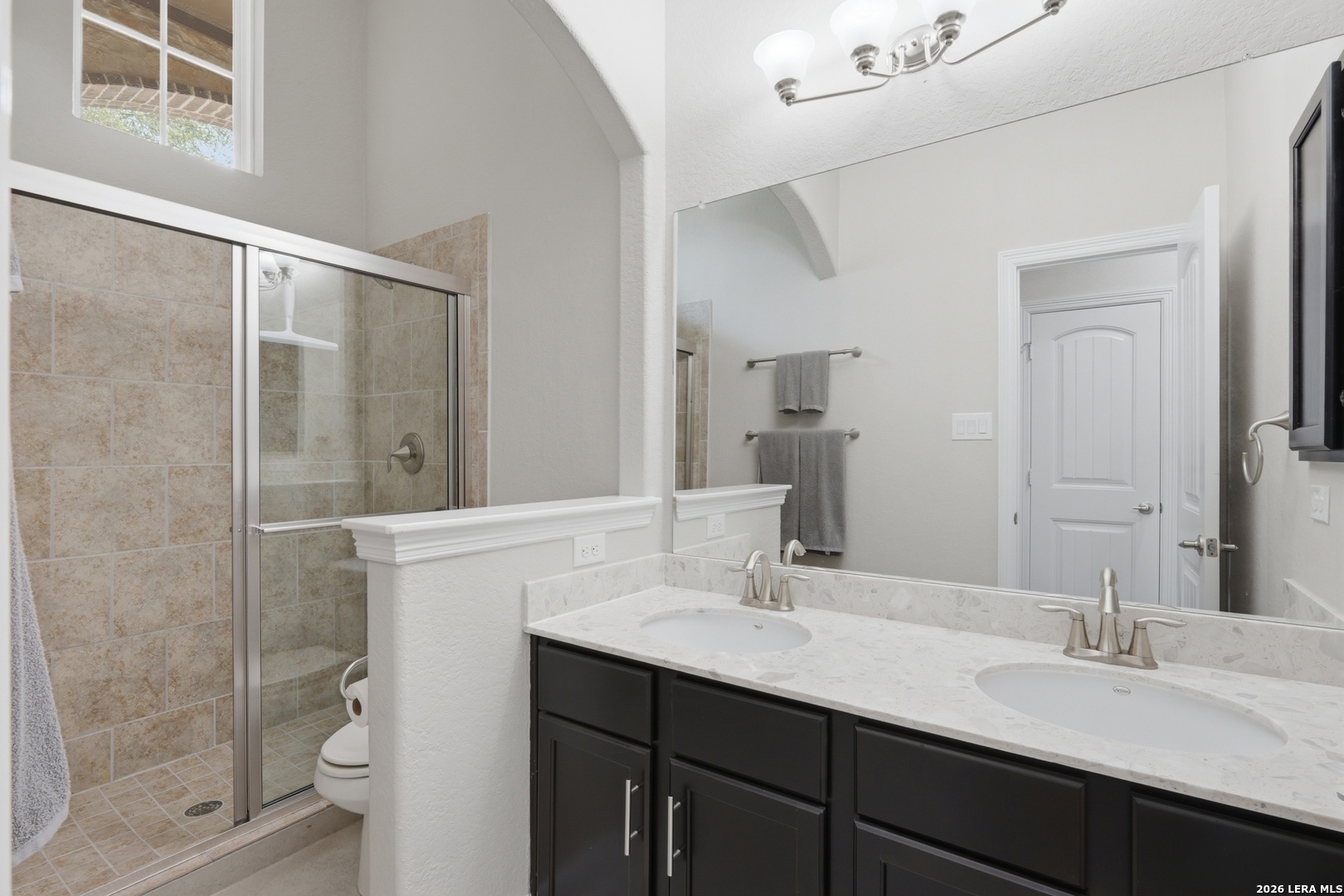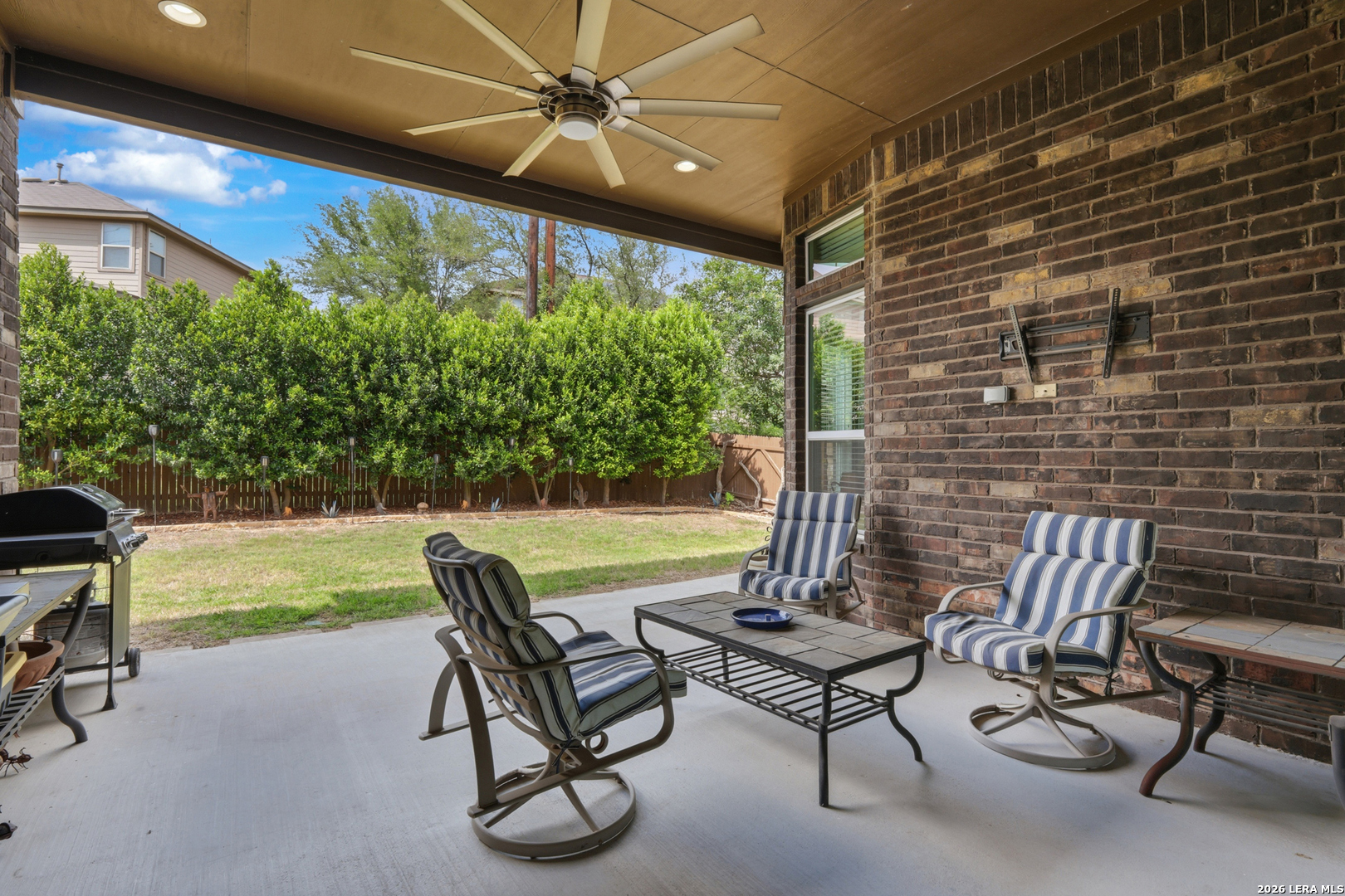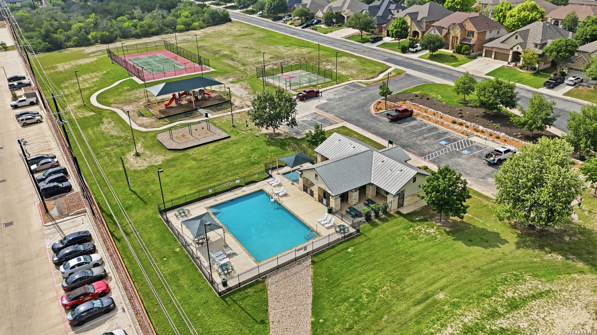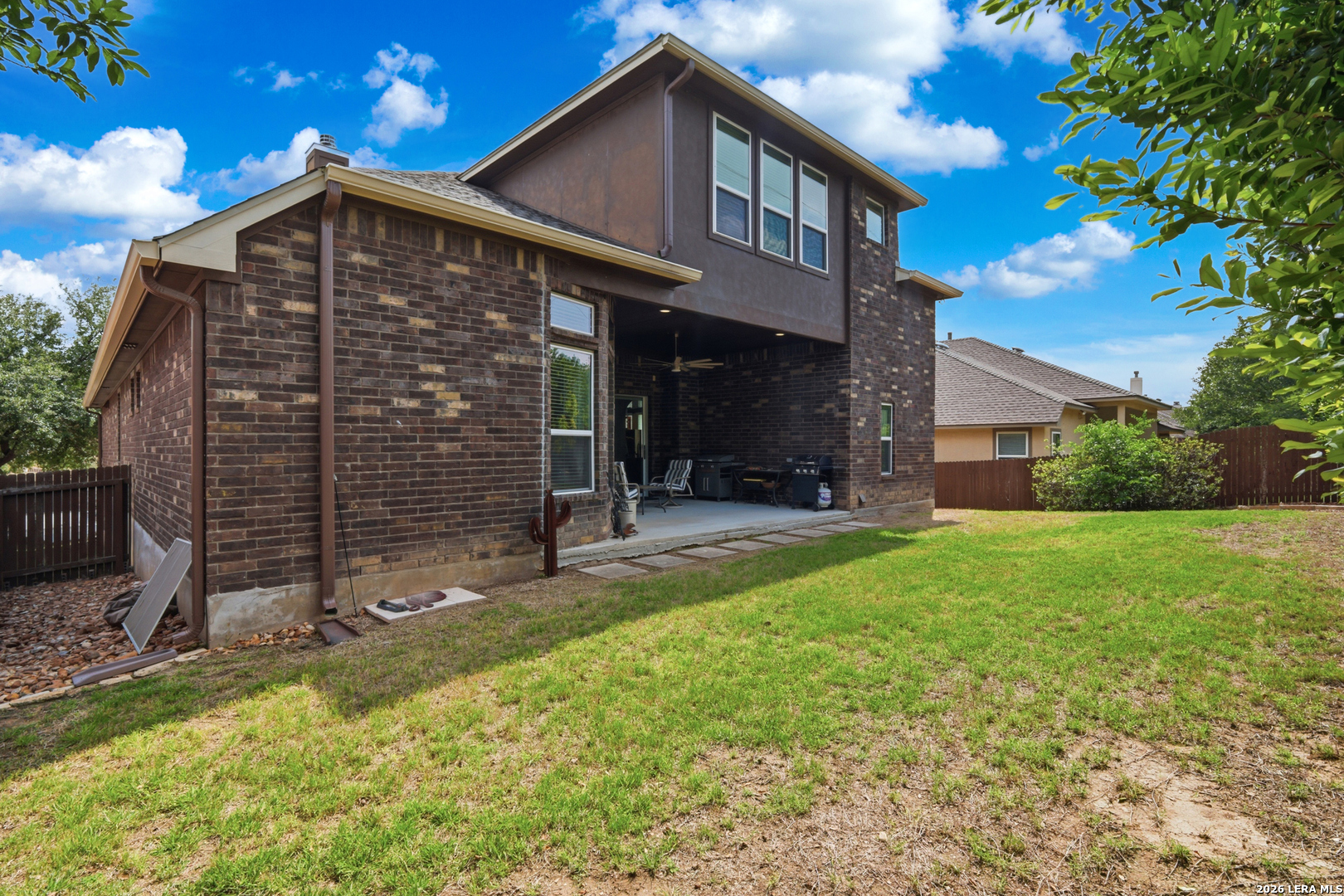 Nestled in the highly desirable gated community of Summit at Alamo Ranch, this exceptional property offers the ideal blend of comfort, style, and convenience. Located just minutes from HEB Plus, Loop 1604, and a wide variety of shopping and dining, everyday living is effortless. From the moment you arrive, the curb appeal makes a lasting impression. This four-sided masonry home showcases a beautiful blend of brick and stone, a spacious three-car garage, and an extended driveway with ample parking. A charming front patio invites you to enjoy peaceful mornings or relaxing evenings. Step inside to soaring 12-foot ceilings that set the tone for the open and airy layout. Natural light pours in through expansive windows and panoramic sliding glass doors that fully open, creating a seamless indoor-outdoor experience. French oak flooring flows throughout the main living areas, with luxury vinyl plank in the guest bedrooms, offering a completely carpet-free home. The living room is both spacious and inviting, featuring a modern gas fireplace accented by a stunning wood beam. Just off the living area, the formal dining room offers flexibility as a home office and is complemented by a bright breakfast nook nearby. The kitchen is truly a chef's dream, complete with an oversized island, granite countertops, soft-close custom cabinetry, and built-in appliances. A five-burner gas cooktop anchors the space, while a walk-in pantry leads to a generously sized laundry room with additional storage and a second refrigerator. Even better, all appliances convey with the home. This thoughtfully designed 1.5-story layout features three bedrooms on the main floor, including a private primary suite tucked away on one side of the home. The primary retreat offers high ceilings, abundant natural light, and a luxurious ensuite with dual vanities, a walk-in shower, and a spacious walk-in closet. Two secondary bedrooms are located on the opposite side, each with walk-in closets and access to a full bathroom with double sinks and a walk-in shower. A conveniently located half bath near the entry is perfect for guests. Upstairs, a large fourth bedroom with its own ensuite bathroom and walk-in closet provides incredible flexibility. With its generous size, it can easily function as a second primary suite, guest quarters, or a multi-generational living space. The three-car garage features high ceilings, overhead storage racks, a cooling fan system, and new garage doors installed in 2019. Step outside to an extended covered patio, ideal for entertaining, along with a spacious backyard featuring mature landscaping, a full sprinkler system, and an additional storage shed that will convey. Recent updates add even more value, including a roof replaced just three years ago, newer gutters, a water softener installed in 2022, a reverse osmosis water filtration system, and two water heaters replaced in 2023. The panoramic sliding doors are also equipped with automatic blinds for added convenience. Residents of Summit at Alamo Ranch enjoy access to fantastic community amenities, including a pool, playground, tennis courts, and basketball courts, all within a gated neighborhood zoned to top-rated schools. Come experience everything this incredible home has to offer and make it your own!