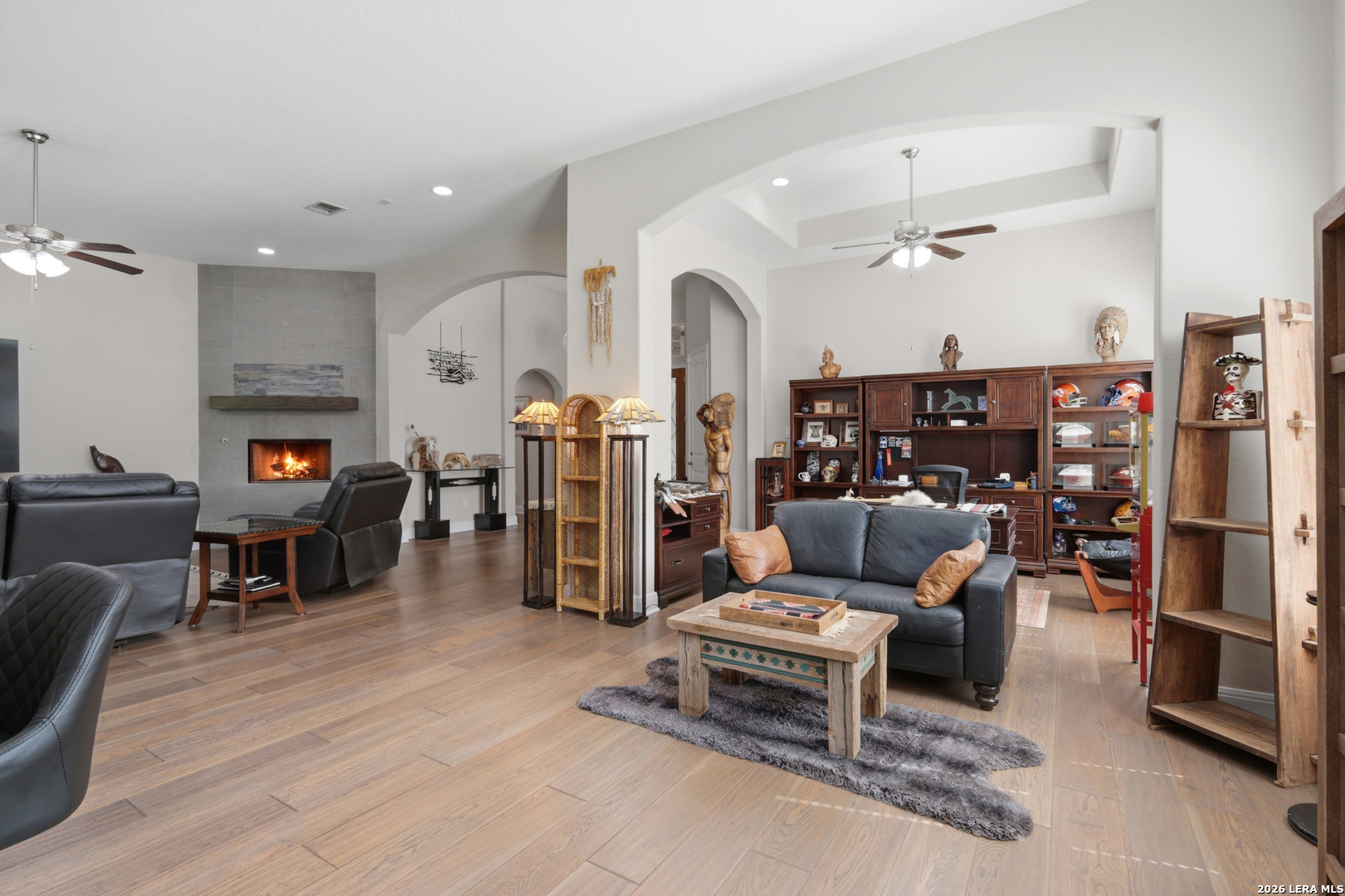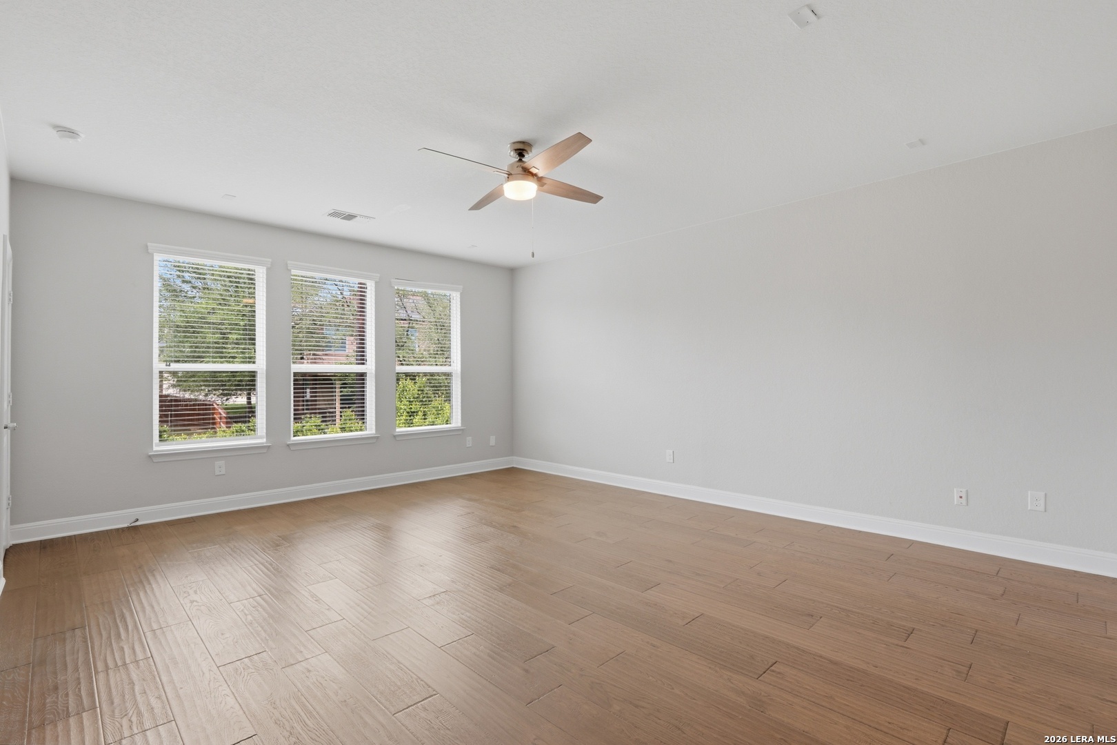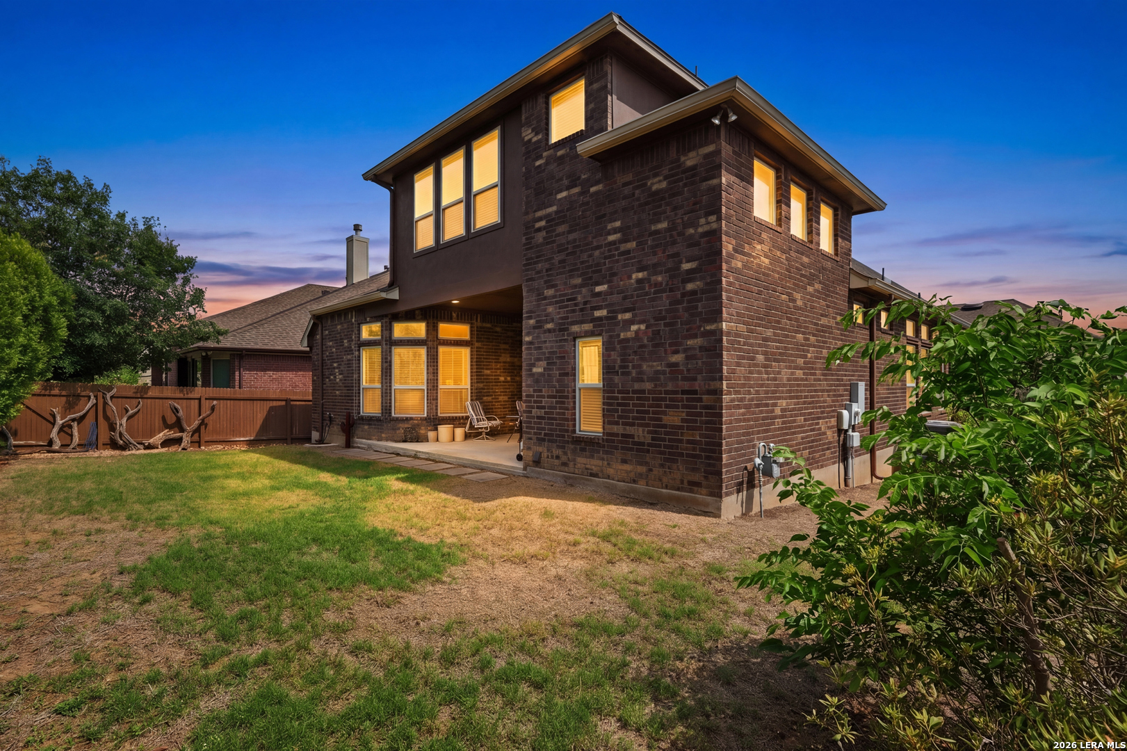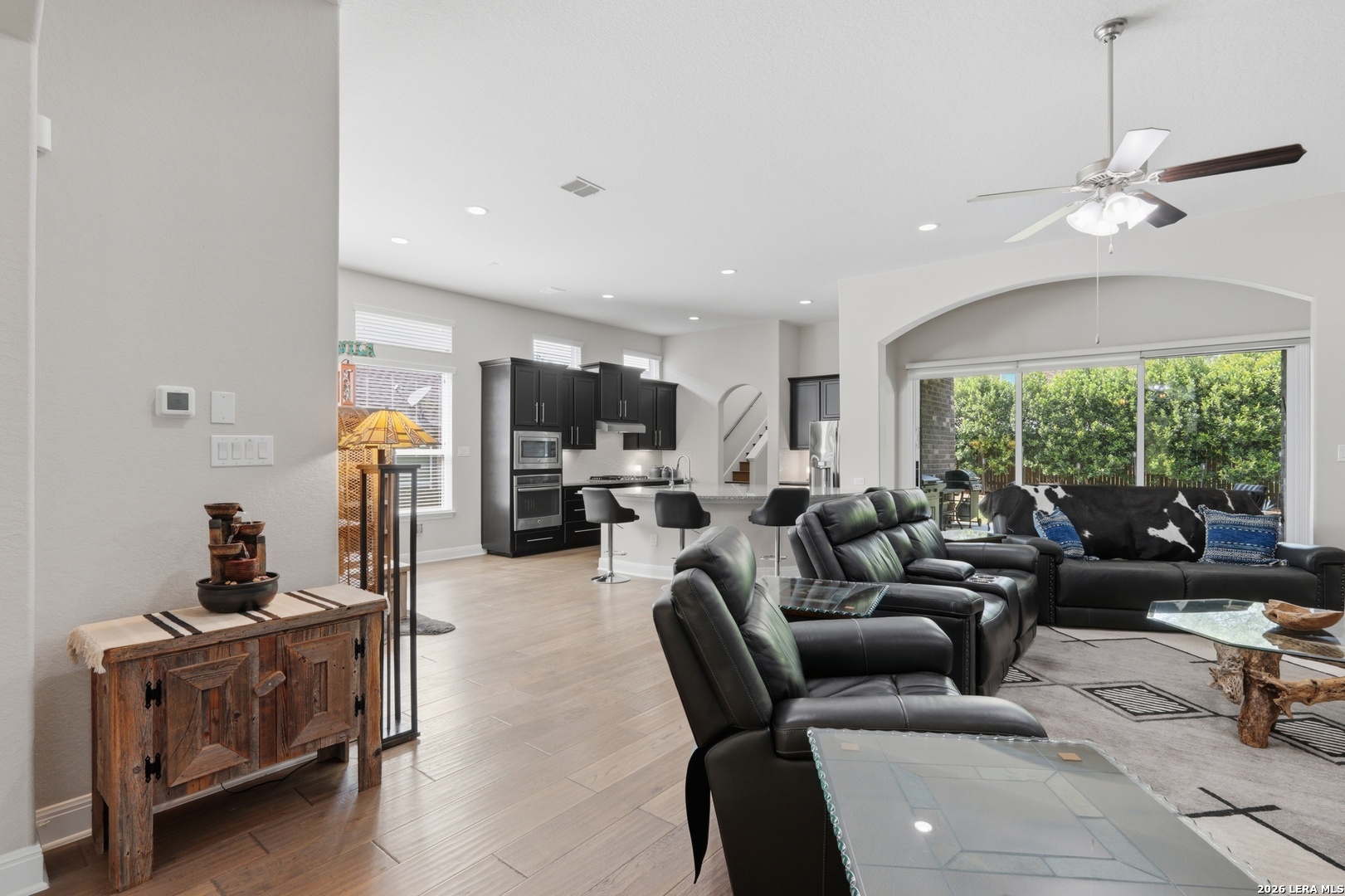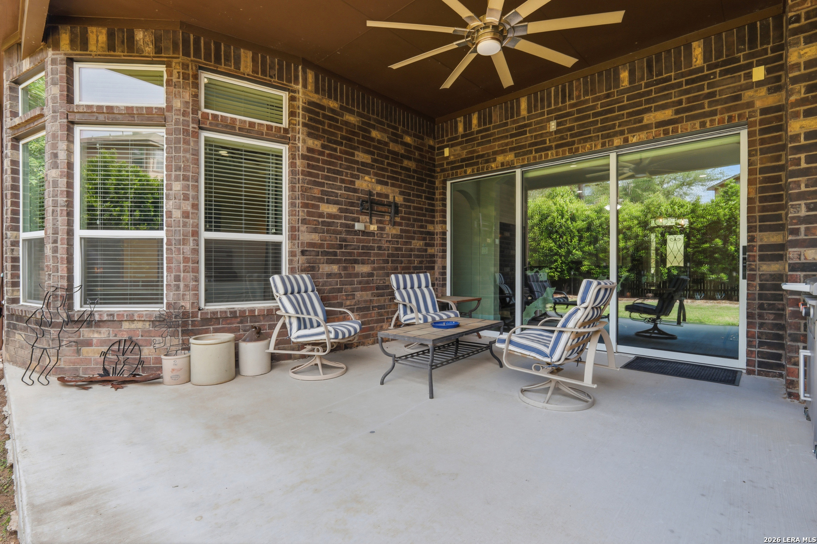 Nestled in the highly desirable gated community of Summit at Alamo Ranch, this exceptional property offers the ideal blend of comfort, style, and convenience. Located just minutes from HEB Plus, Loop 1604, and a wide variety of shopping and dining, everyday living is effortless. From the moment you arrive, the curb appeal makes a lasting impression. This four-sided masonry home showcases a beautiful blend of brick and stone, a spacious three-car garage, and an extended driveway with ample parking. A charming front patio invites you to enjoy peaceful mornings or relaxing evenings. Step inside to soaring 12-foot ceilings that set the tone for the open and airy layout. Natural light pours in through expansive windows and panoramic sliding glass doors that fully open, creating a seamless indoor-outdoor experience. French oak flooring flows throughout the main living areas, with luxury vinyl plank in the guest bedrooms, offering a completely carpet-free home. The living room is both spacious and inviting, featuring a modern gas fireplace accented by a stunning wood beam. Just off the living area, the formal dining room offers flexibility as a home office and is complemented by a bright breakfast nook nearby. The kitchen is truly a chef's dream, complete with an oversized island, granite countertops, soft-close custom cabinetry, and built-in appliances. A five-burner gas cooktop anchors the space, while a walk-in pantry leads to a generously sized laundry room with additional storage and a second refrigerator. Even better, all appliances convey with the home. This thoughtfully designed 1.5-story layout features three bedrooms on the main floor, including a private primary suite tucked away on one side of the home. The primary retreat offers high ceilings, abundant natural light, and a luxurious ensuite with dual vanities, a walk-in shower, and a spacious walk-in closet. Two secondary bedrooms are located on the opposite side, each with walk-in closets and access to a full bathroom with double sinks and a walk-in shower. A conveniently located half bath near the entry is perfect for guests. Upstairs, a large fourth bedroom with its own ensuite bathroom and walk-in closet provides incredible flexibility. With its generous size, it can easily function as a second primary suite, guest quarters, or a multi-generational living space. The three-car garage features high ceilings, overhead storage racks, a cooling fan system, and new garage doors installed in 2019. Step outside to an extended covered patio, ideal for entertaining, along with a spacious backyard featuring mature landscaping, a full sprinkler system, and an additional storage shed that will convey. Recent updates add even more value, including a roof replaced just three years ago, newer gutters, a water softener installed in 2022, a reverse osmosis water filtration system, and two water heaters replaced in 2023. The panoramic sliding doors are also equipped with automatic blinds for added convenience. Residents of Summit at Alamo Ranch enjoy access to fantastic community amenities, including a pool, playground, tennis courts, and basketball courts, all within a gated neighborhood zoned to top-rated schools. Come experience everything this incredible home has to offer and make it your own!