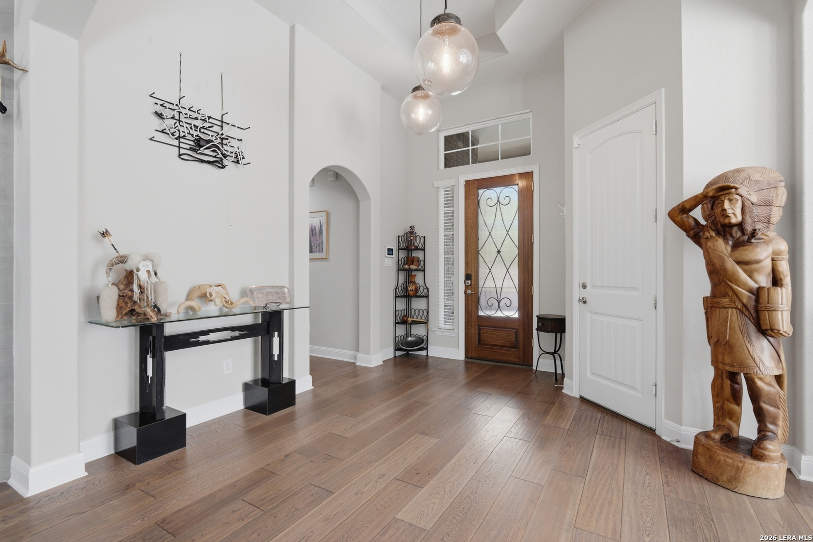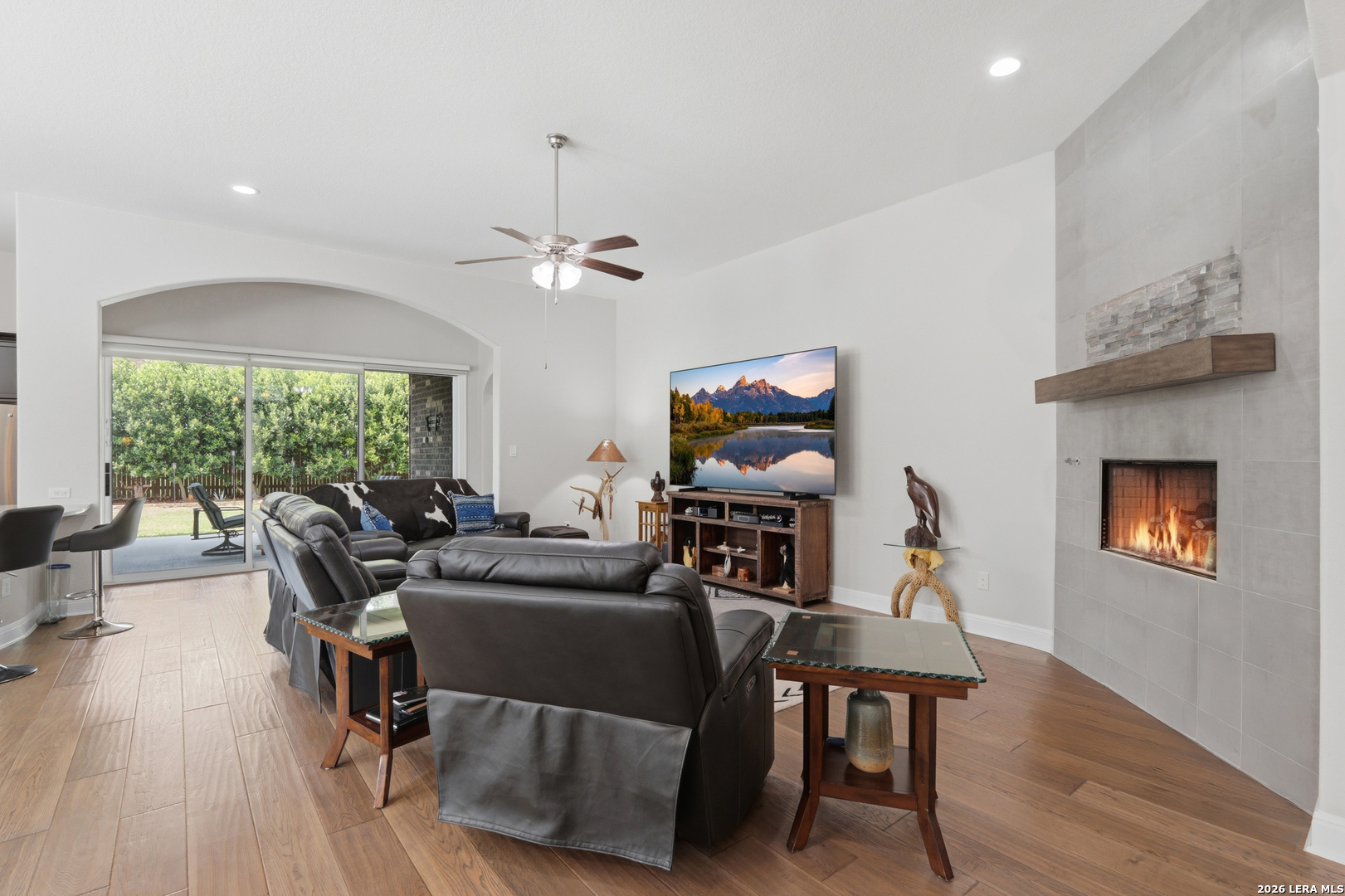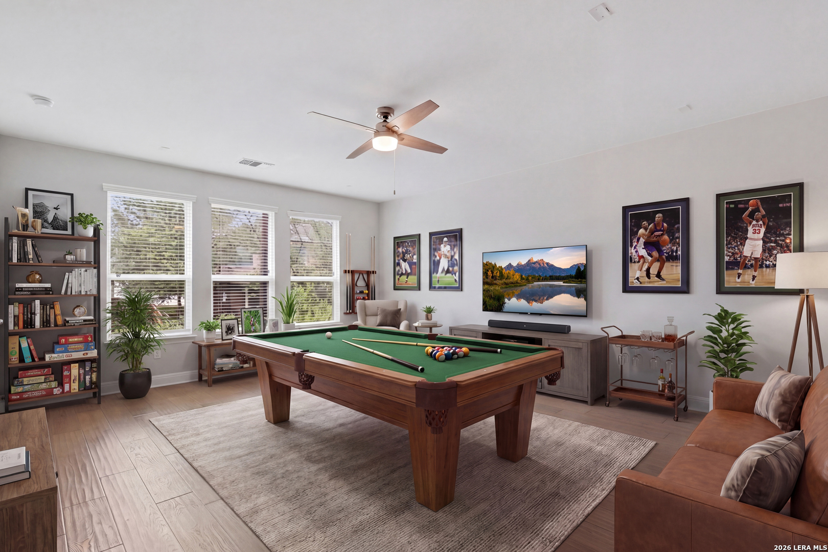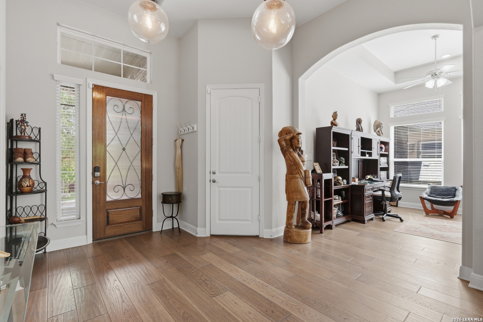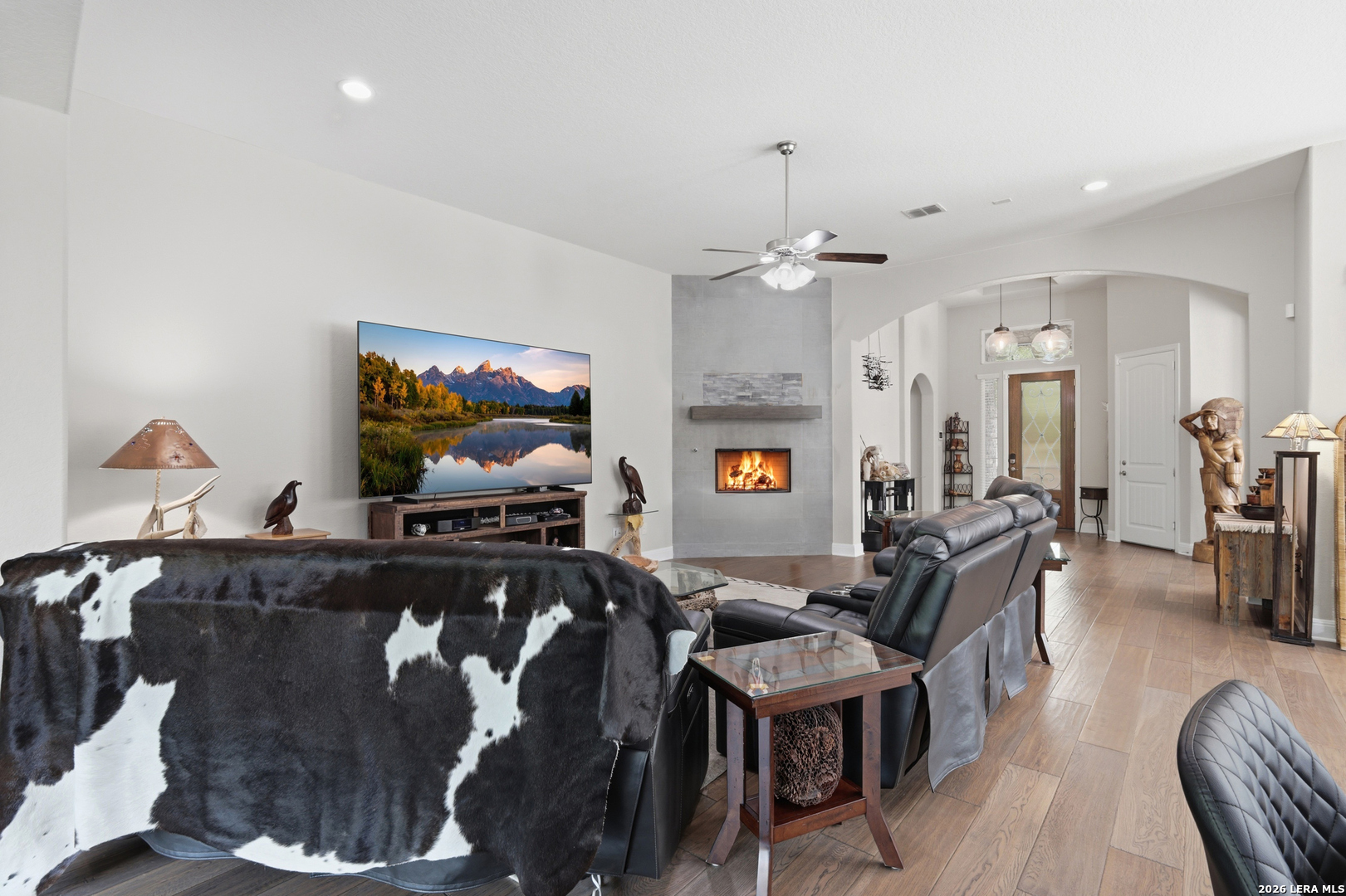 Nestled in the highly desirable gated community of Summit at Alamo Ranch, this exceptional property offers the ideal blend of comfort, style, and convenience. Located just minutes from HEB Plus, Loop 1604, and a wide variety of shopping and dining, everyday living is effortless. From the moment you arrive, the curb appeal makes a lasting impression. This four-sided masonry home showcases a beautiful blend of brick and stone, a spacious three-car garage, and an extended driveway with ample parking. A charming front patio invites you to enjoy peaceful mornings or relaxing evenings. Step inside to soaring 12-foot ceilings that set the tone for the open and airy layout. Natural light pours in through expansive windows and panoramic sliding glass doors that fully open, creating a seamless indoor-outdoor experience. French oak flooring flows throughout the main living areas, with luxury vinyl plank in the guest bedrooms, offering a completely carpet-free home. The living room is both spacious and inviting, featuring a modern gas fireplace accented by a stunning wood beam. Just off the living area, the formal dining room offers flexibility as a home office and is complemented by a bright breakfast nook nearby. The kitchen is truly a chef's dream, complete with an oversized island, granite countertops, soft-close custom cabinetry, and built-in appliances. A five-burner gas cooktop anchors the space, while a walk-in pantry leads to a generously sized laundry room with additional storage and a second refrigerator. Even better, all appliances convey with the home. This thoughtfully designed 1.5-story layout features three bedrooms on the main floor, including a private primary suite tucked away on one side of the home. The primary retreat offers high ceilings, abundant natural light, and a luxurious ensuite with dual vanities, a walk-in shower, and a spacious walk-in closet. Two secondary bedrooms are located on the opposite side, each with walk-in closets and access to a full bathroom with double sinks and a walk-in shower. A conveniently located half bath near the entry is perfect for guests. Upstairs, a large fourth bedroom with its own ensuite bathroom and walk-in closet provides incredible flexibility. With its generous size, it can easily function as a second primary suite, guest quarters, or a multi-generational living space. The three-car garage features high ceilings, overhead storage racks, a cooling fan system, and new garage doors installed in 2019. Step outside to an extended covered patio, ideal for entertaining, along with a spacious backyard featuring mature landscaping, a full sprinkler system, and an additional storage shed that will convey. Recent updates add even more value, including a roof replaced just three years ago, newer gutters, a water softener installed in 2022, a reverse osmosis water filtration system, and two water heaters replaced in 2023. The panoramic sliding doors are also equipped with automatic blinds for added convenience. Residents of Summit at Alamo Ranch enjoy access to fantastic community amenities, including a pool, playground, tennis courts, and basketball courts, all within a gated neighborhood zoned to top-rated schools. Come experience everything this incredible home has to offer and make it your own!